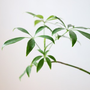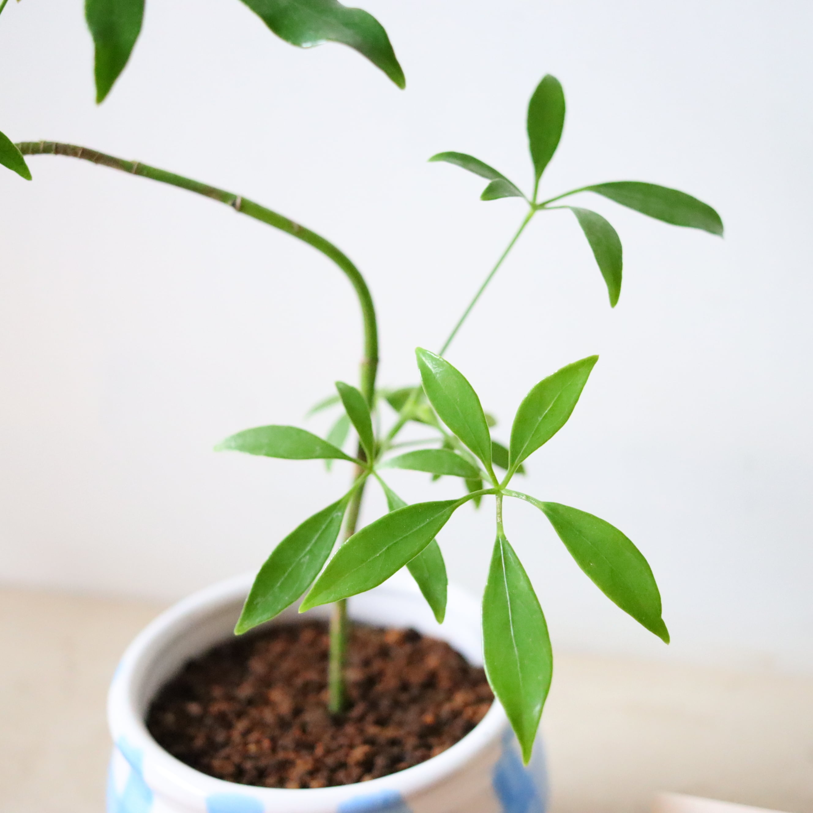 手のひらを広げたような葉っぱがかわいいシェフレラ。面白いシルエットの幹に葉ぶりが可愛らしく、小さな木みたいです。