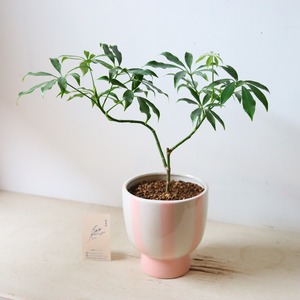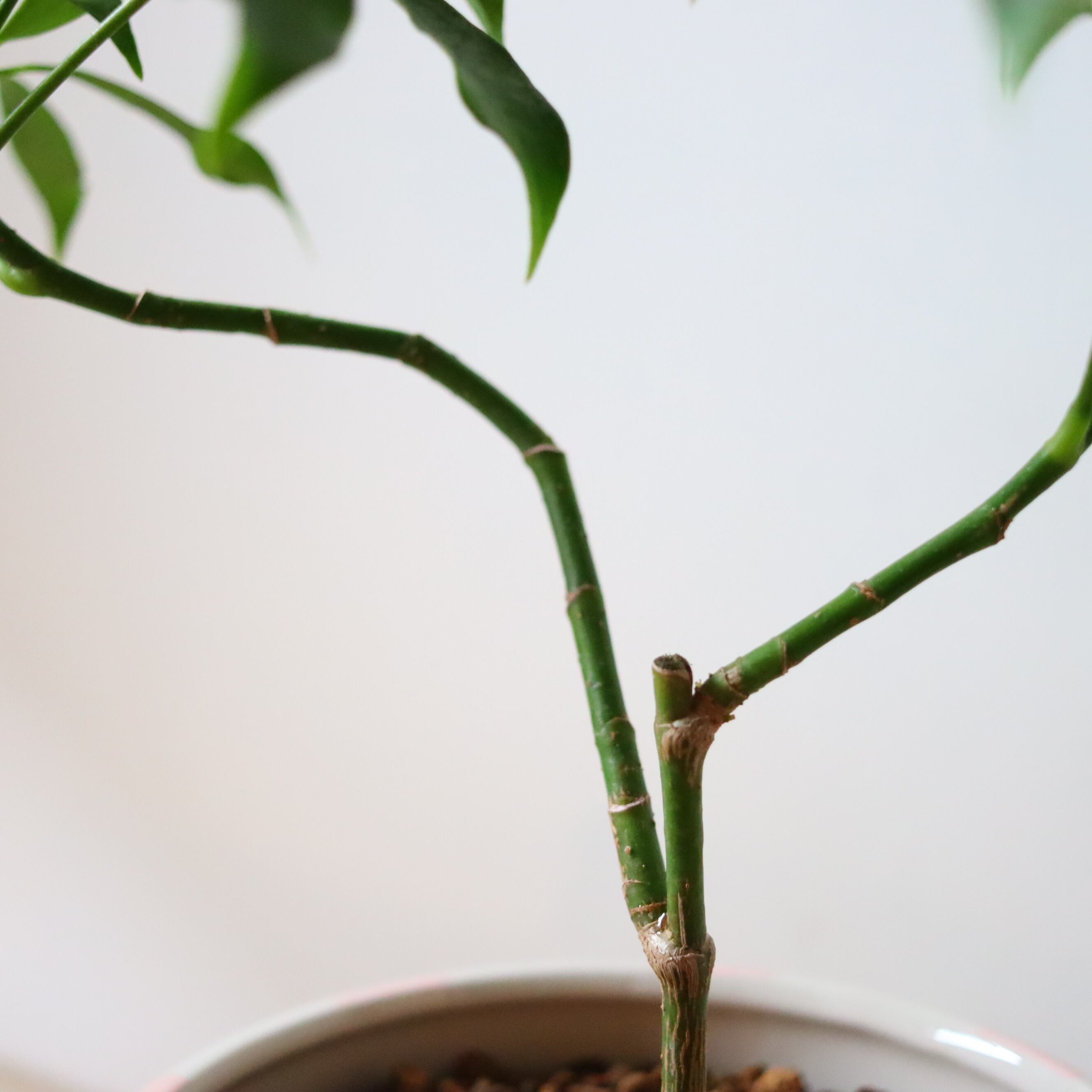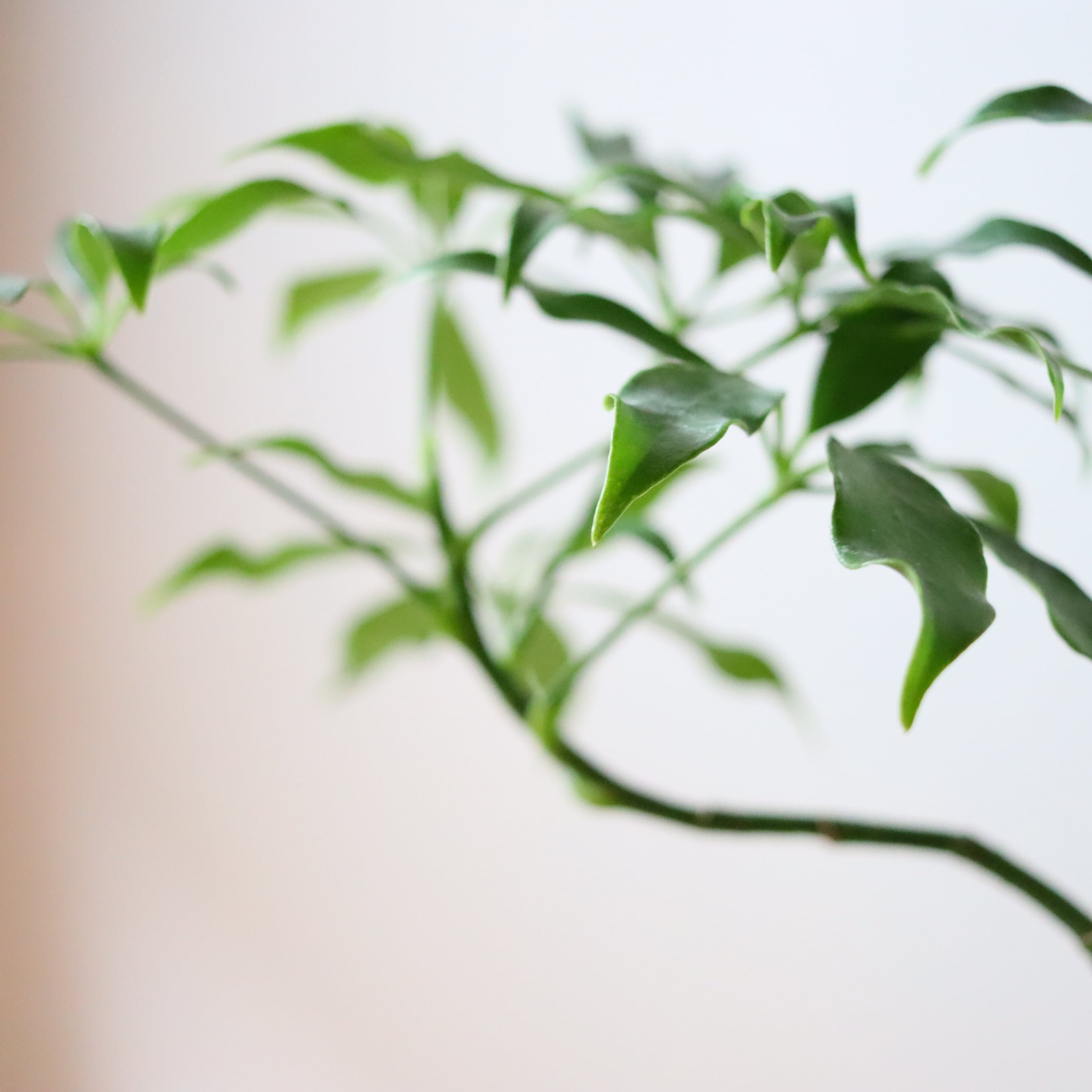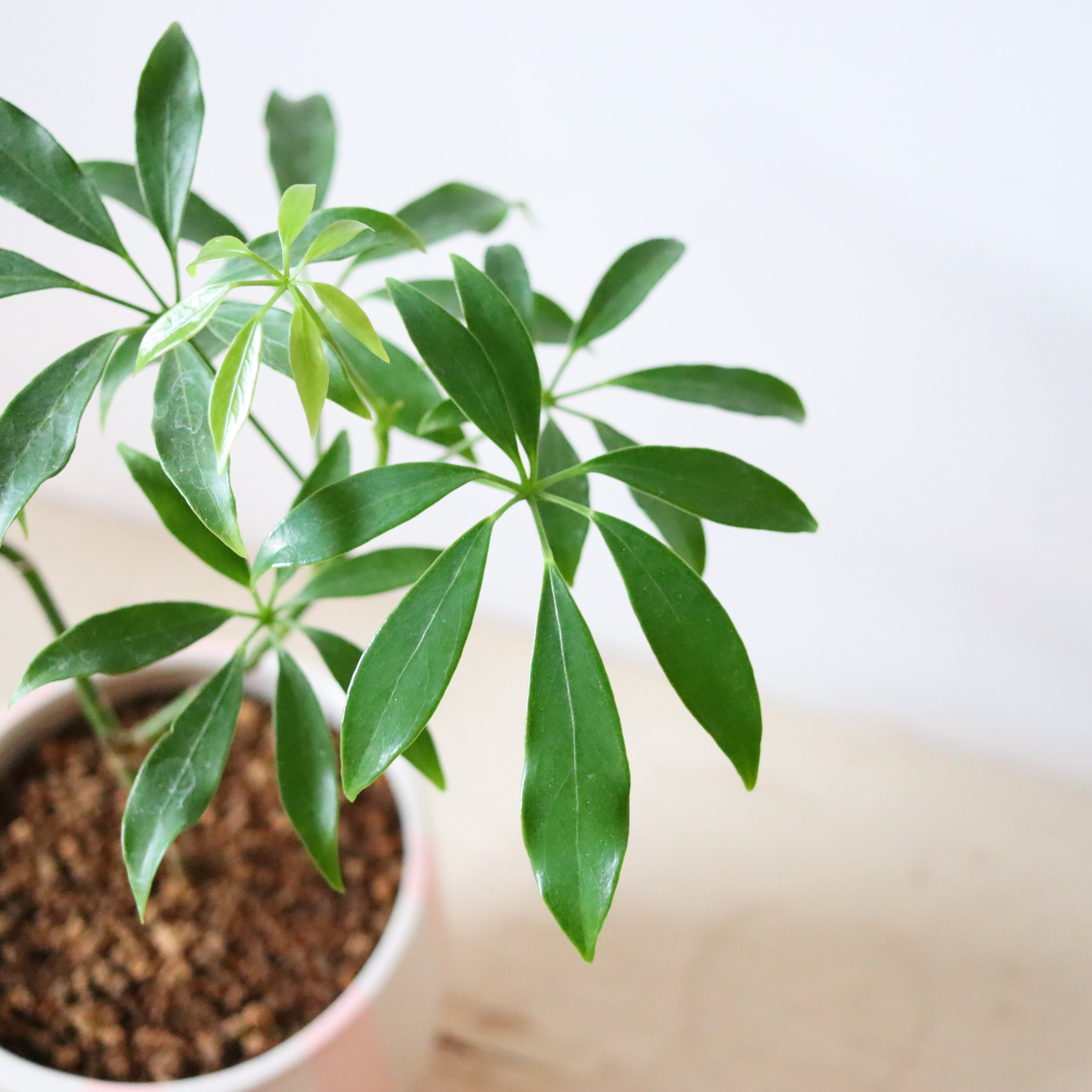 手のひらを広げたような葉っぱがかわいいシェフレラ。面白いシルエットの幹に葉ぶりが可愛らしく、小さな木みたいです。