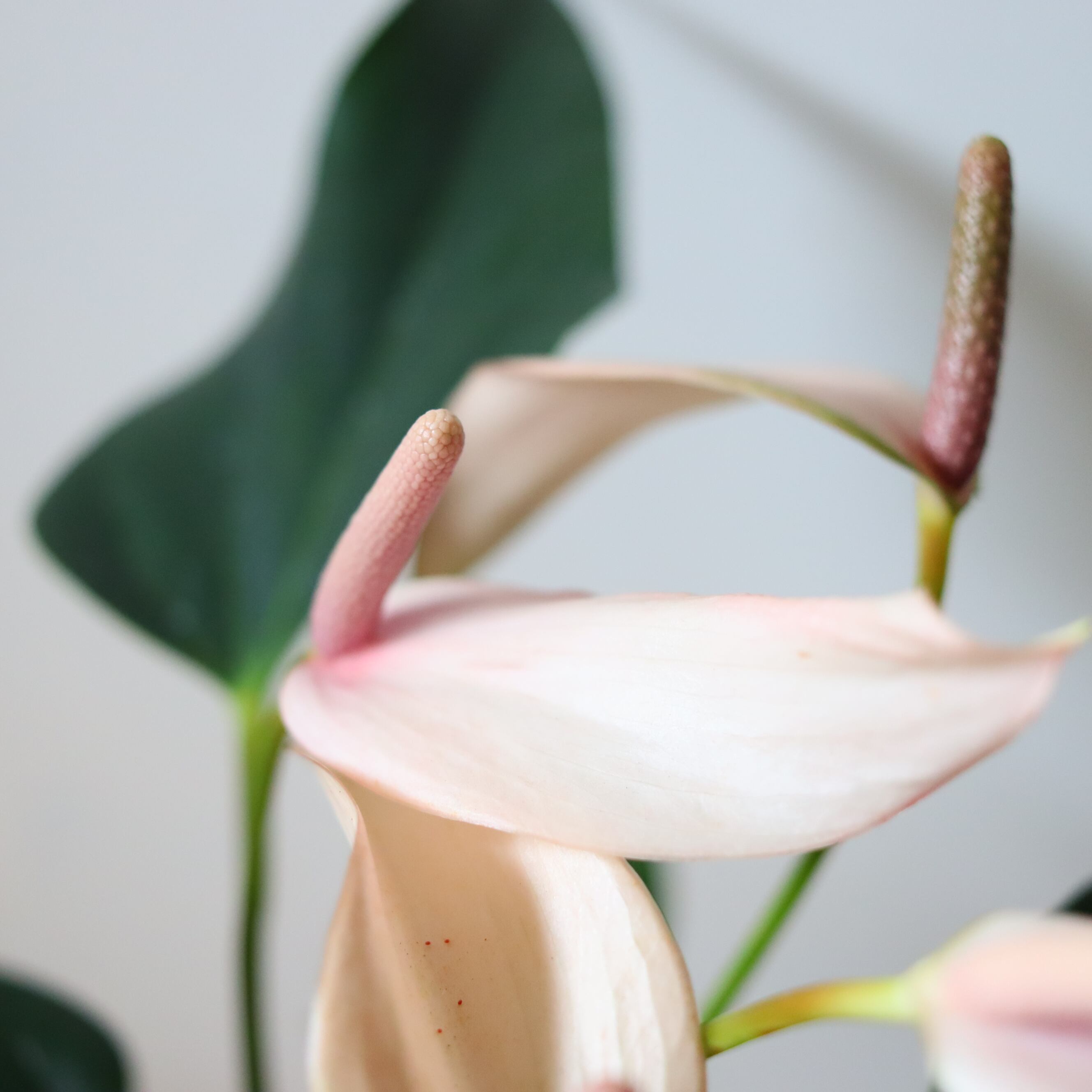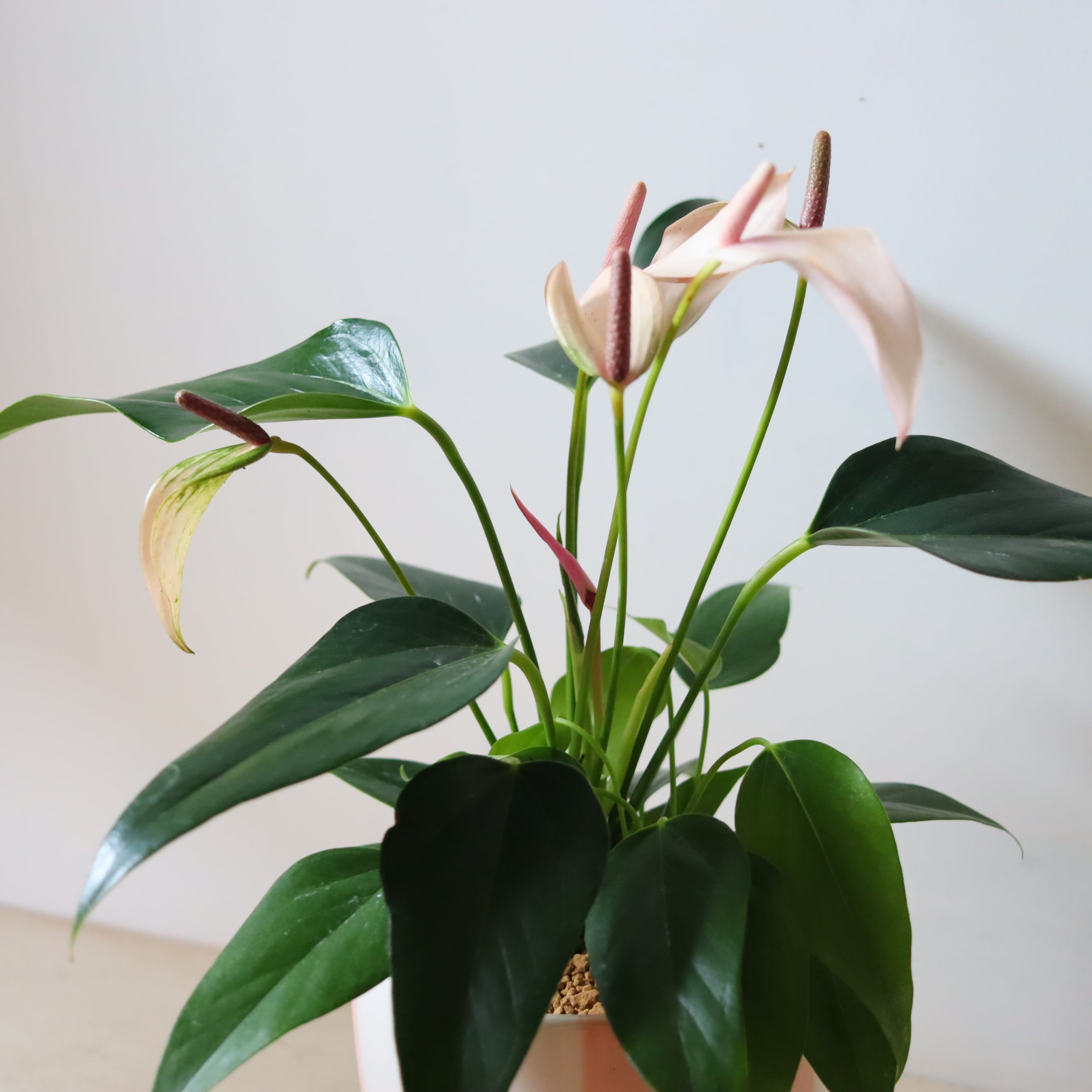 美しいお花を咲かせるアンスリウムです。薄桃色のお花がかわいいです。お部屋の中でも日当たりがある程度あれば定期的にお花を咲かせてくれます。丈夫で育てやすく、お世話が苦手な方にもおすすめです。