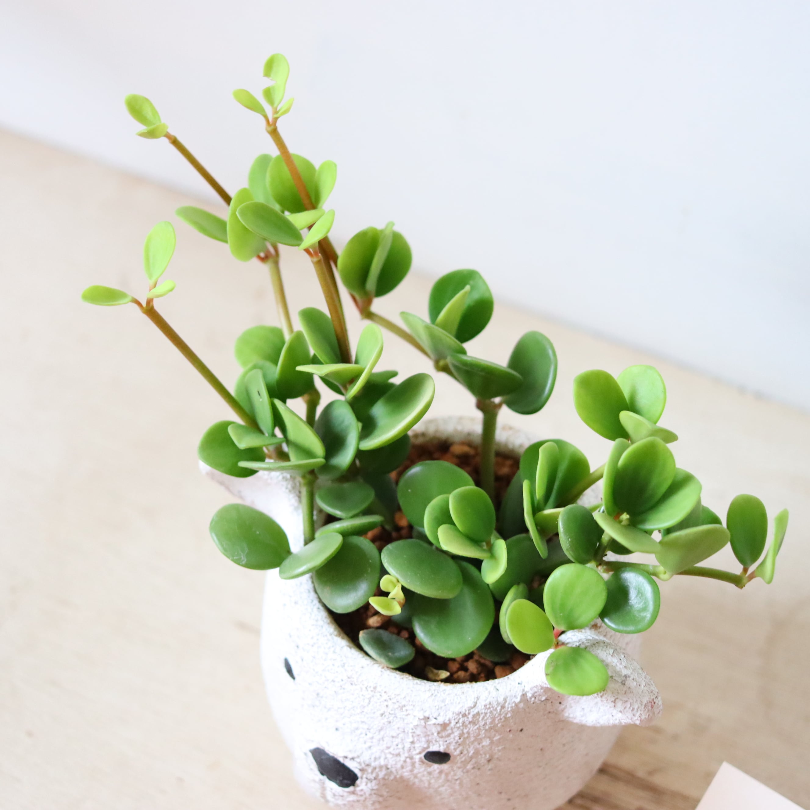 まるっとした葉っぱがかわいい植物です。伸びていくと重みで下に垂れ下がっていく姿がかわいいです。もうこれ以上伸びてほしくない時は切ってあげて大丈夫です。