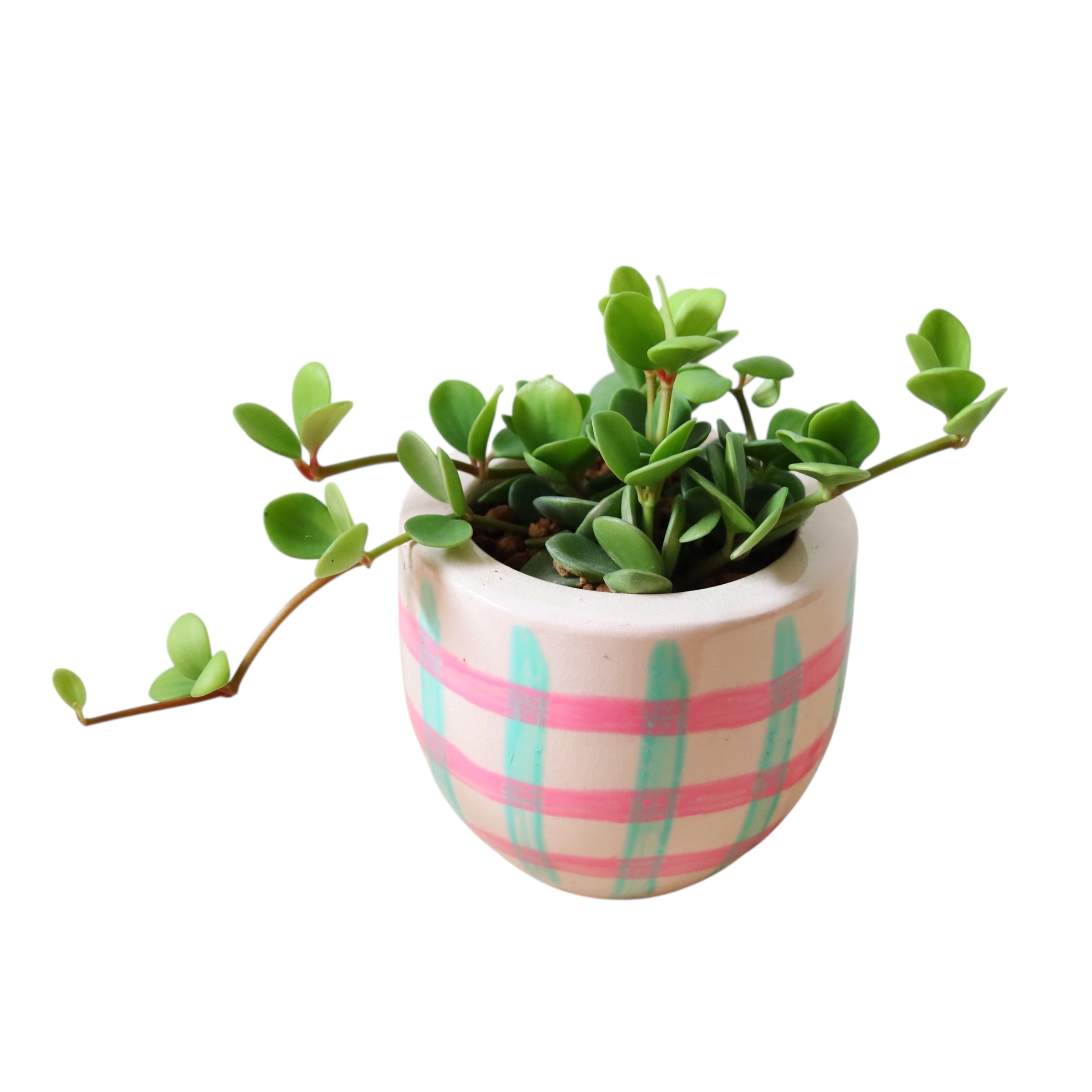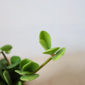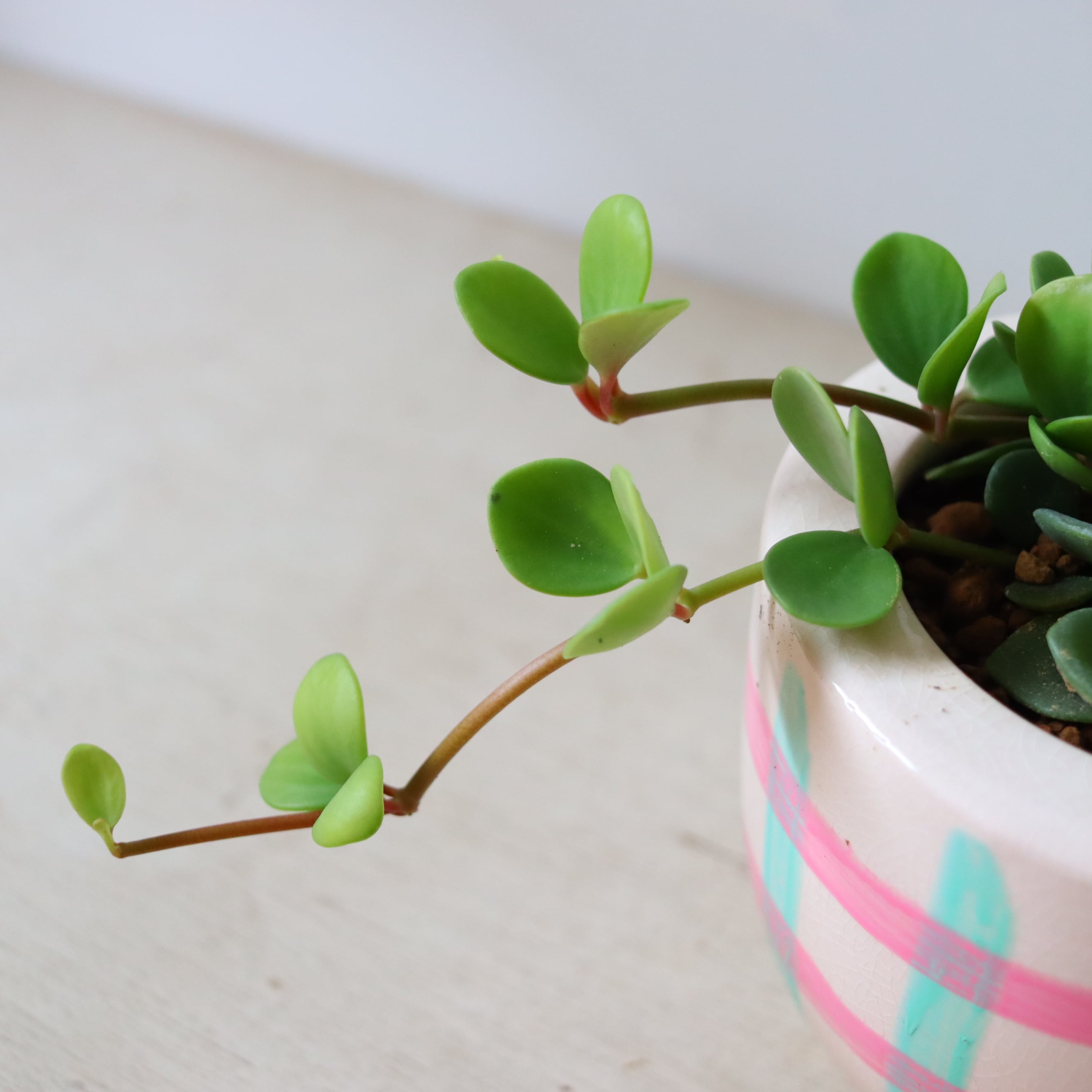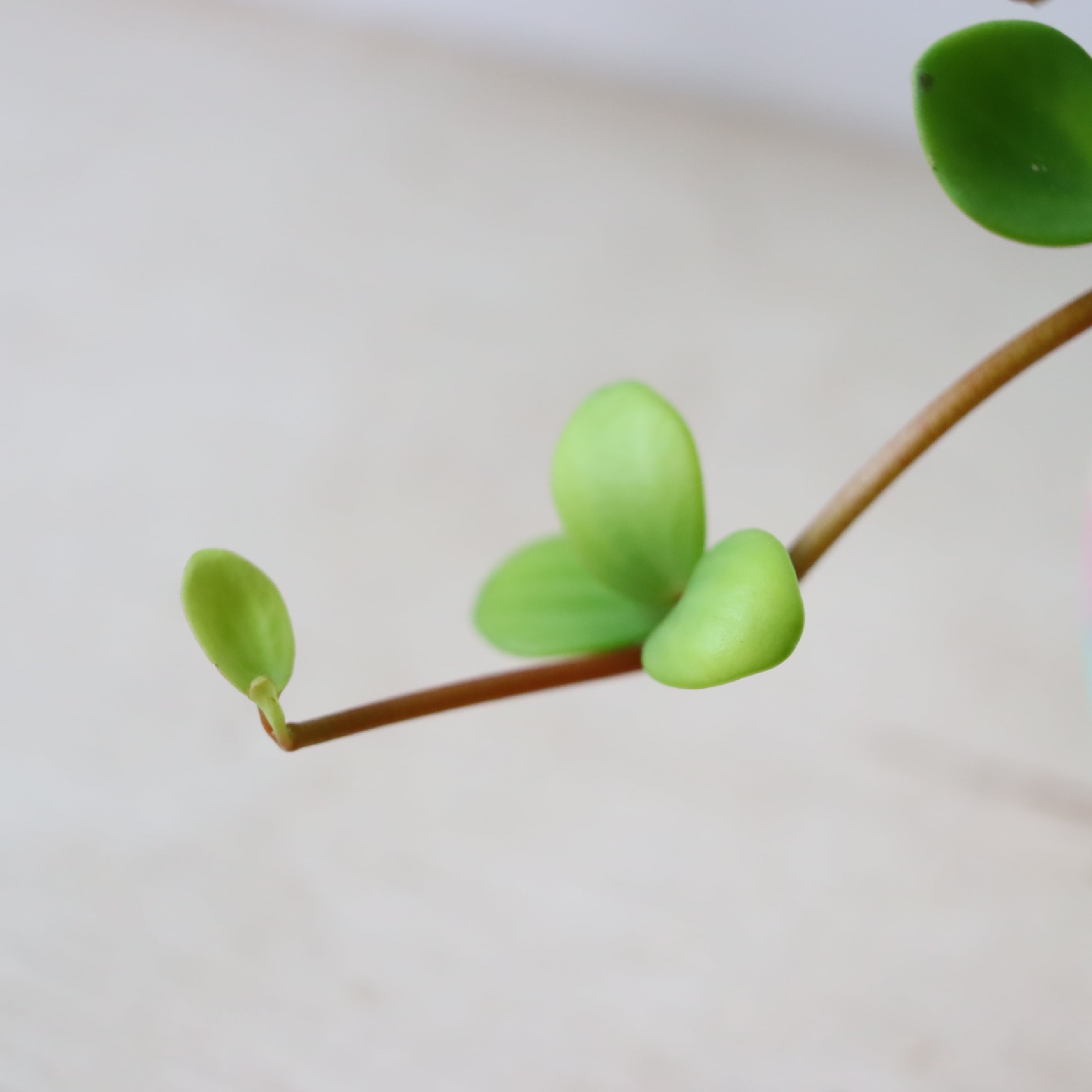 まるっとした葉っぱがかわいい植物です。伸びていくと重みで下に垂れ下がっていく姿がかわいいです。もうこれ以上伸びてほしくない時は切ってあげて大丈夫です。