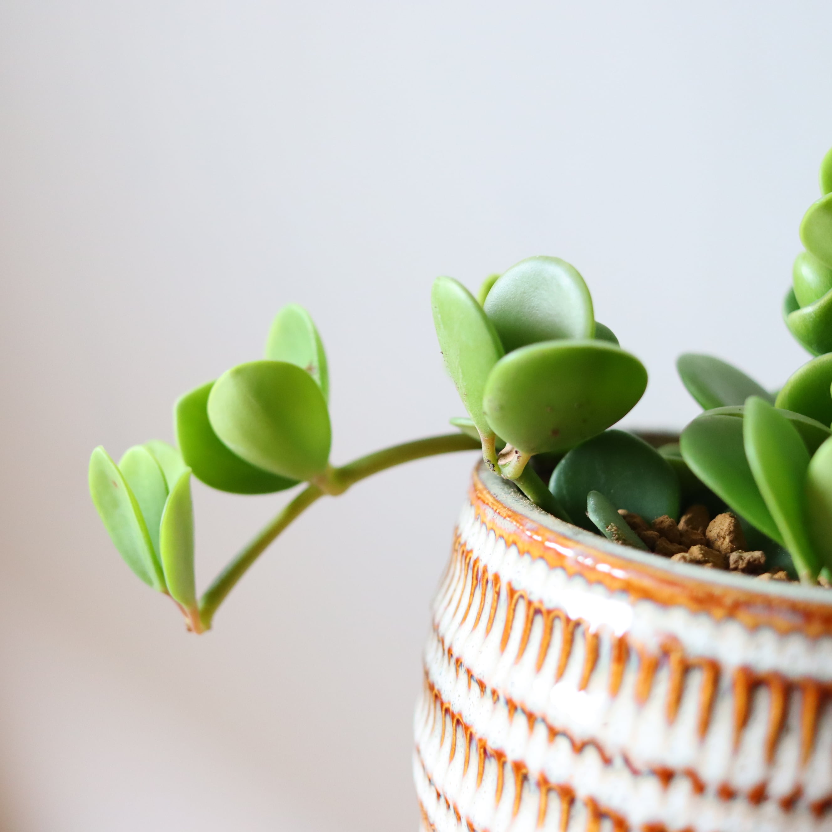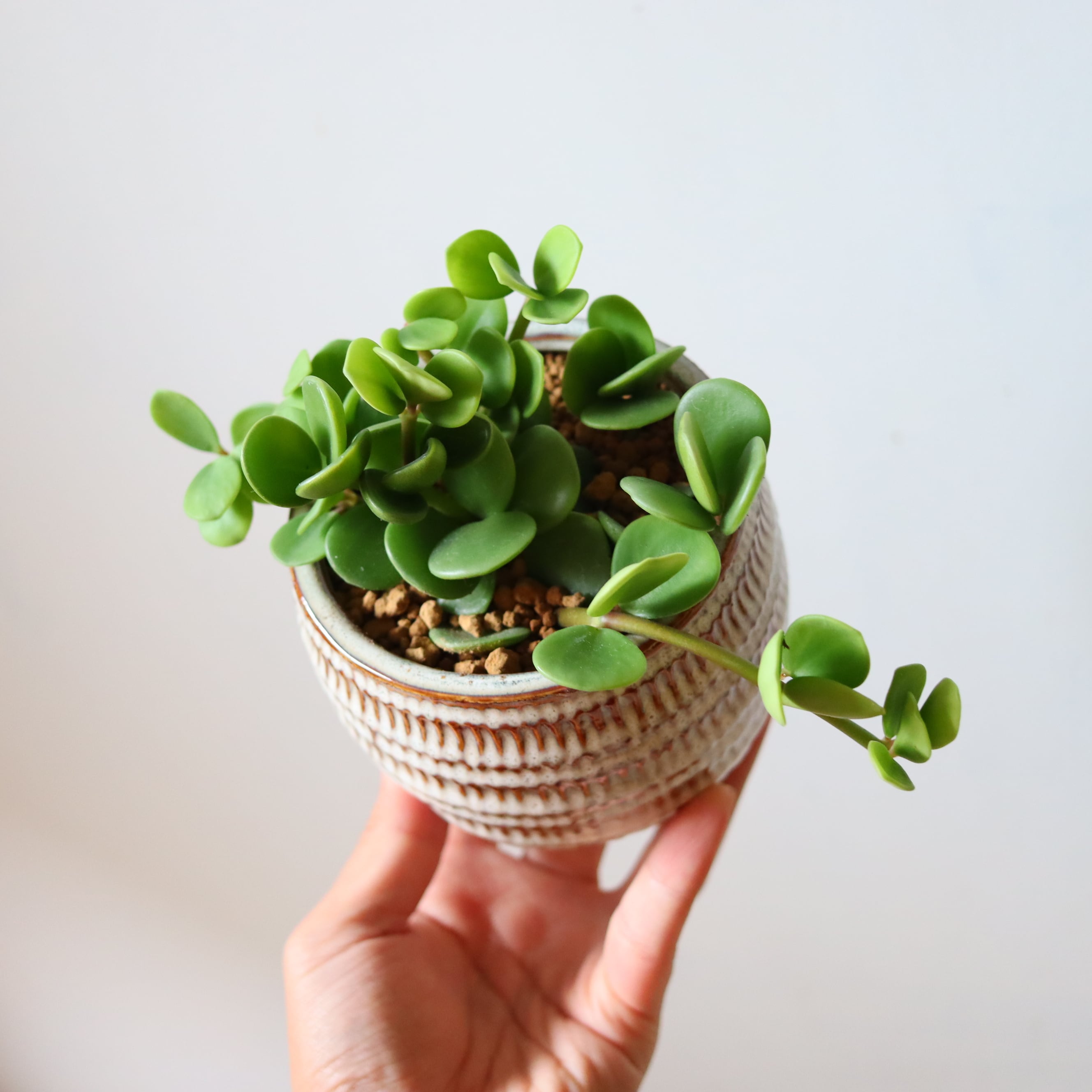 まるっとした葉っぱがかわいい植物です。伸びていくと重みで下に垂れ下がっていく姿がかわいいです。もうこれ以上伸びてほしくない時は切ってあげて大丈夫です。