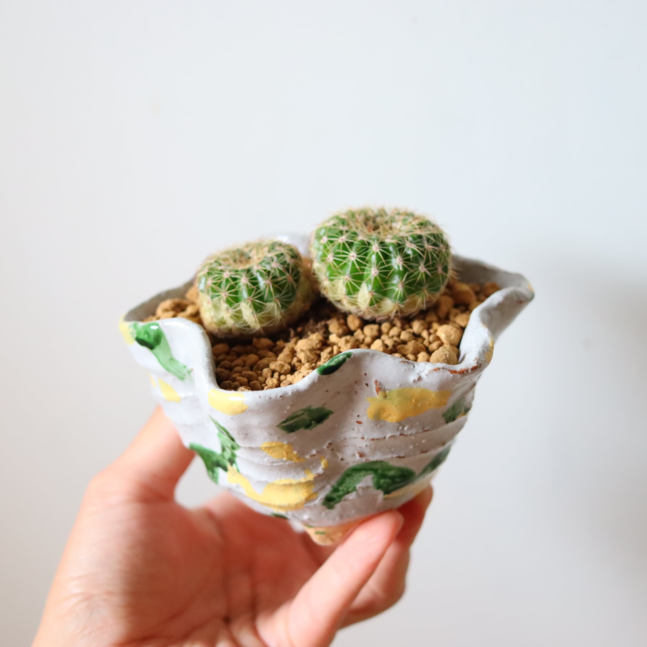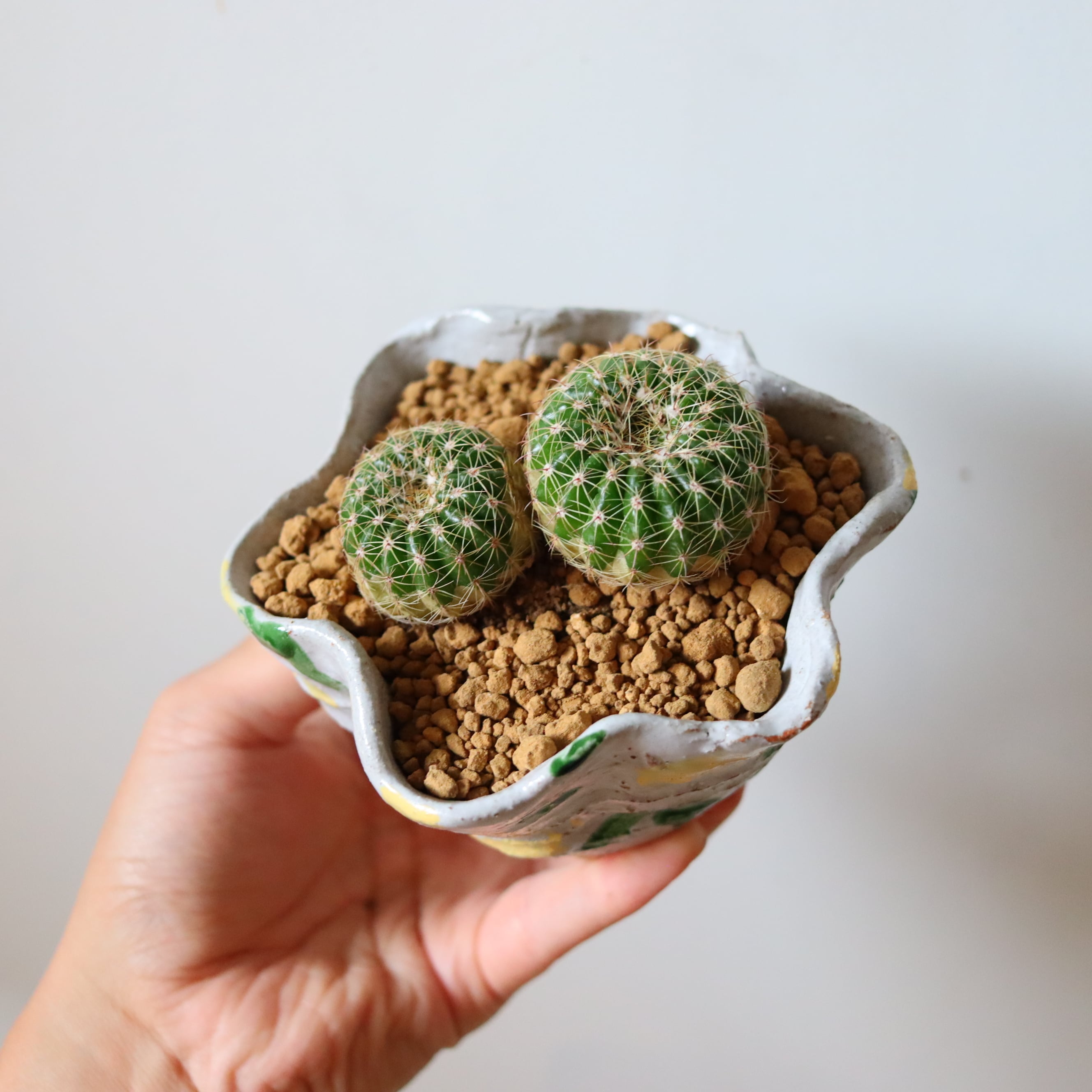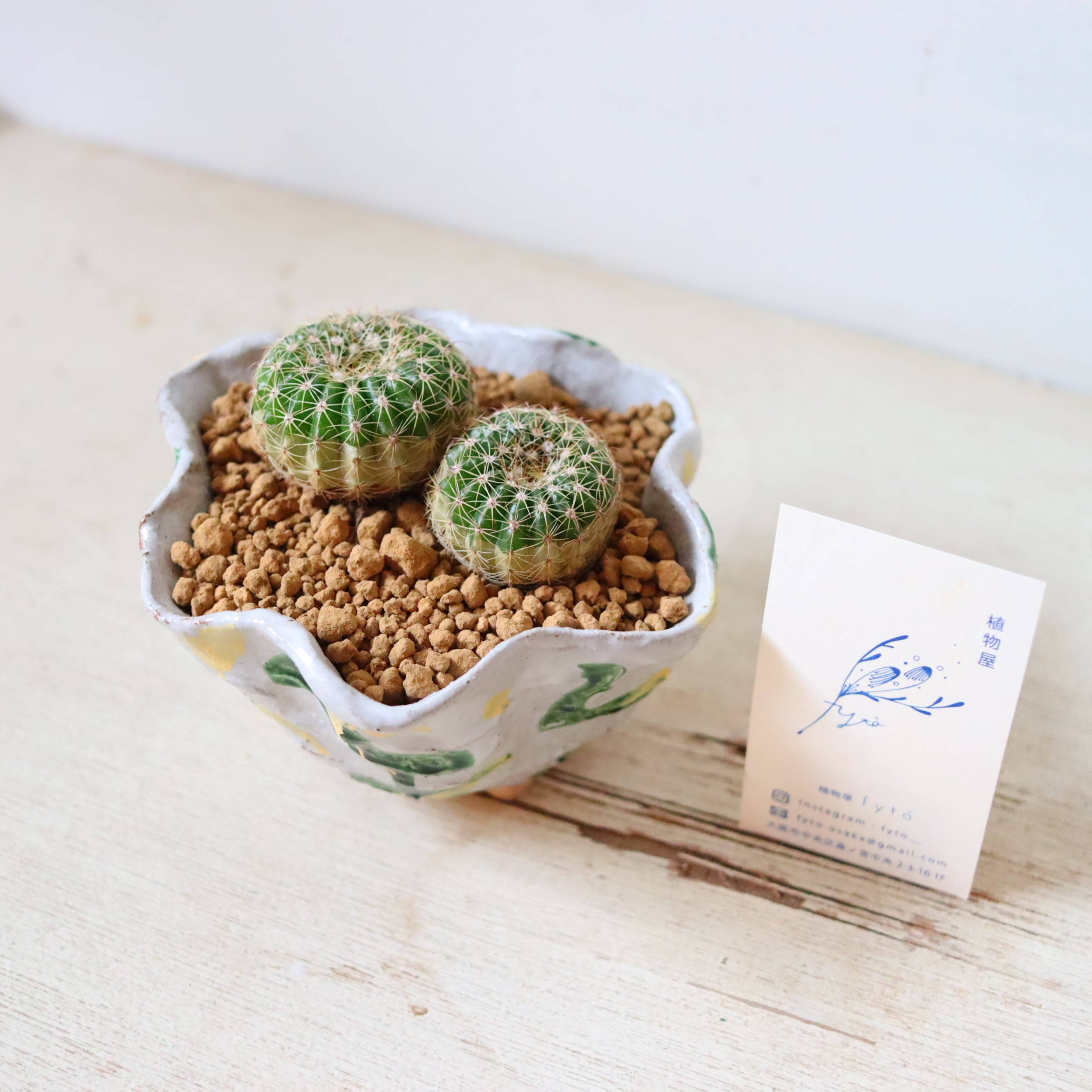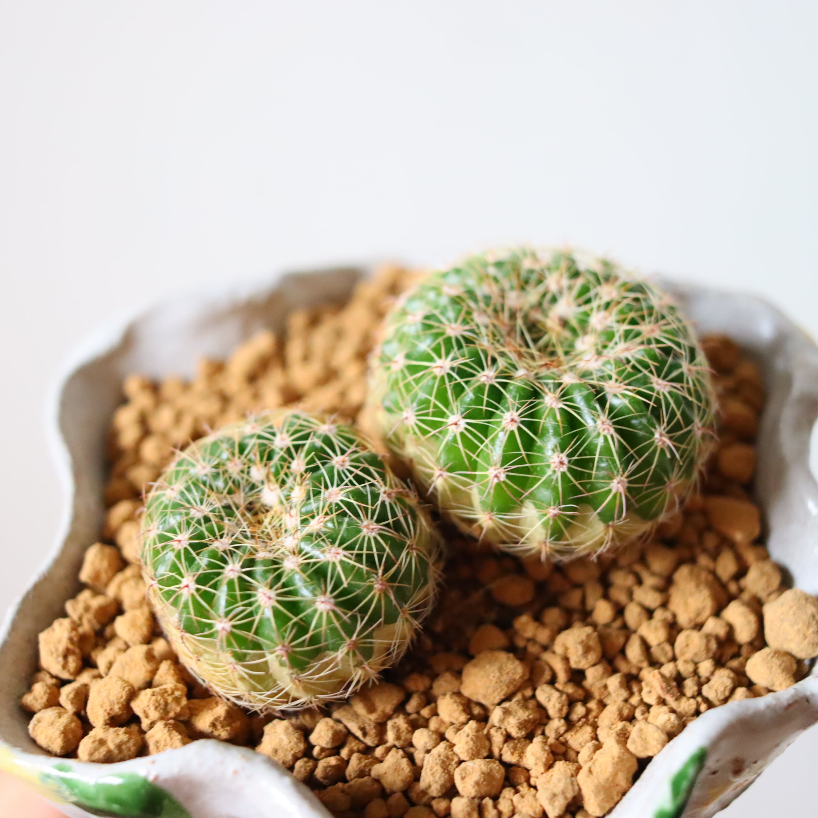 ぺたんとしたシルエットがおもしろいノトカクタスです。2人並んでる姿がかわいらしいですね。お水もほとんどいらずお世話も楽です。