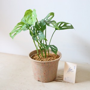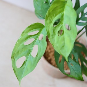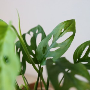 葉っぱに窓がある、マドカズラです。個性的でかわいらしい、モンステラの仲間です。丈夫で育てやすいのでおすすめです。くるくると巻いた状態の新芽がどんどんと出てくる様子も見ていて元気がもらえます。