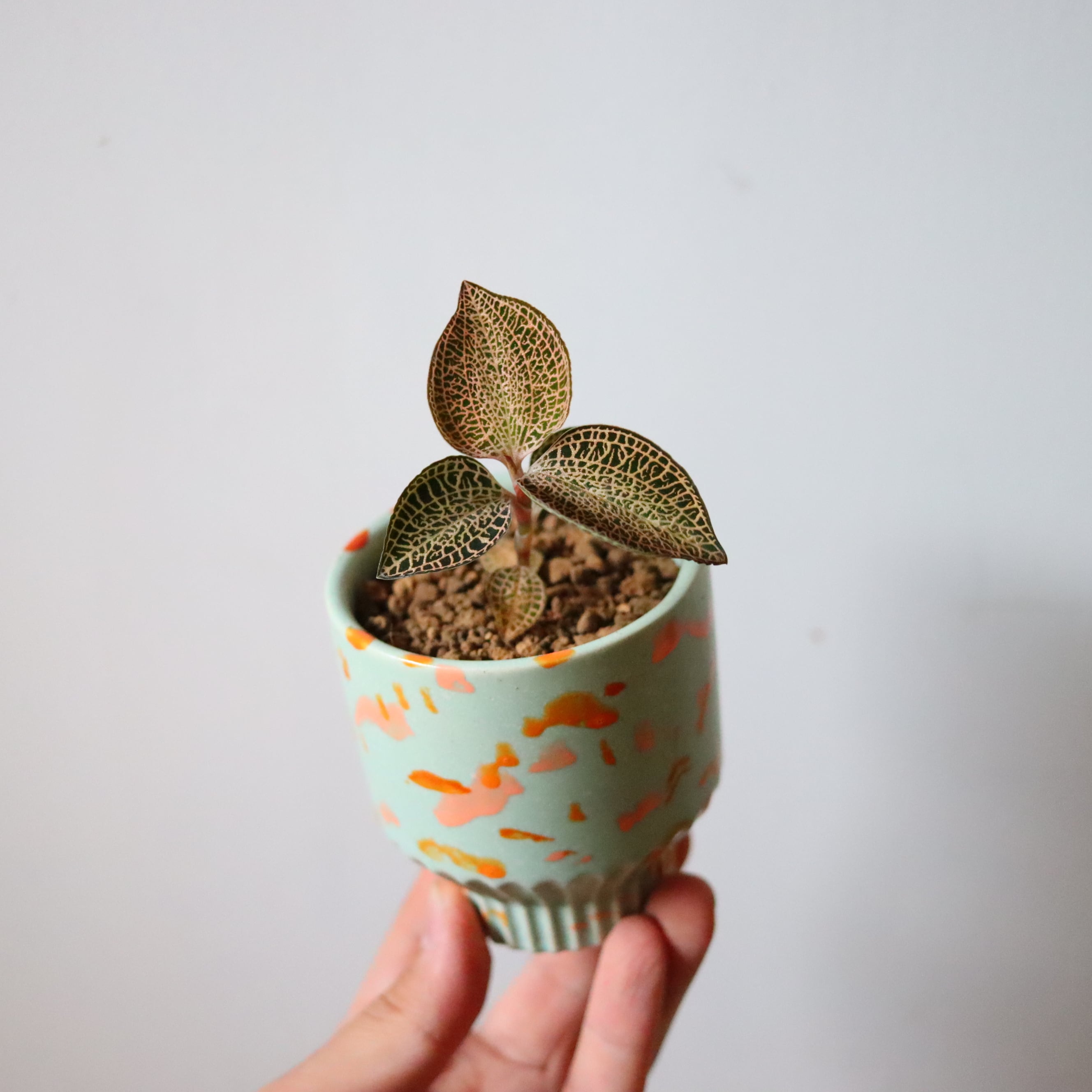 名前のとおり宝石みたいな植物です。葉脈が金色に光っていて、目を疑うような美しいデザインです。定期的に霧吹きもしてあげ、多湿気味にお世話してあげてください。