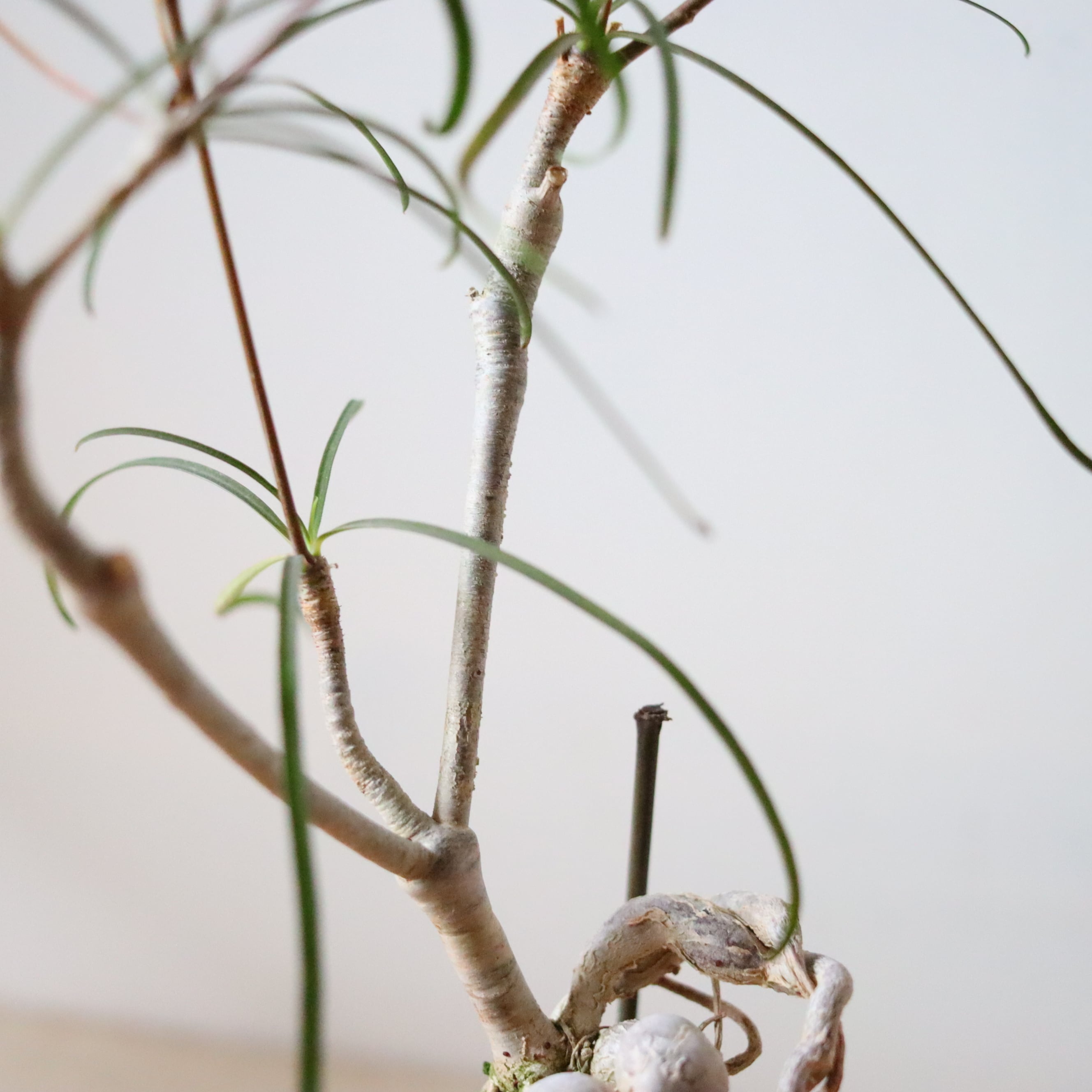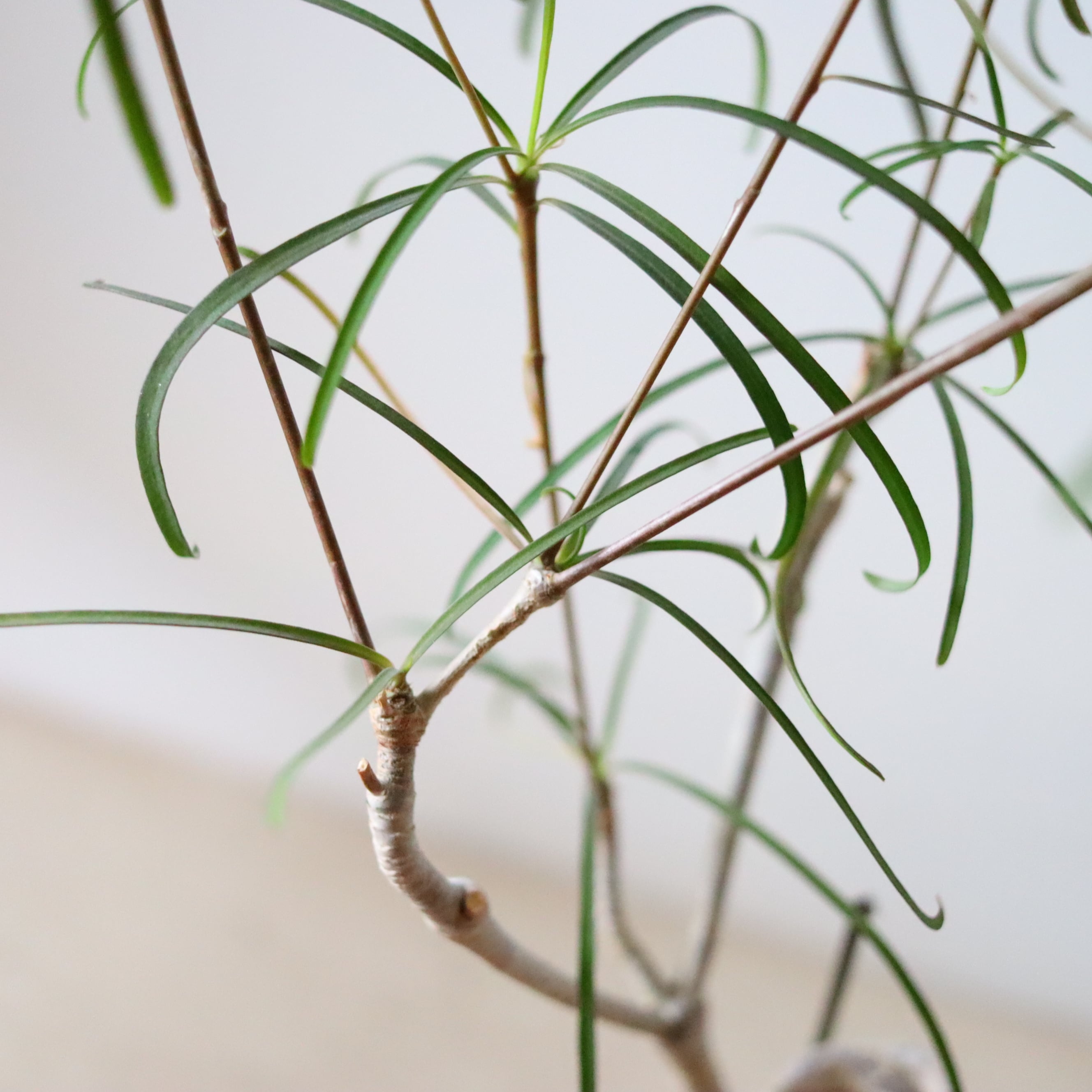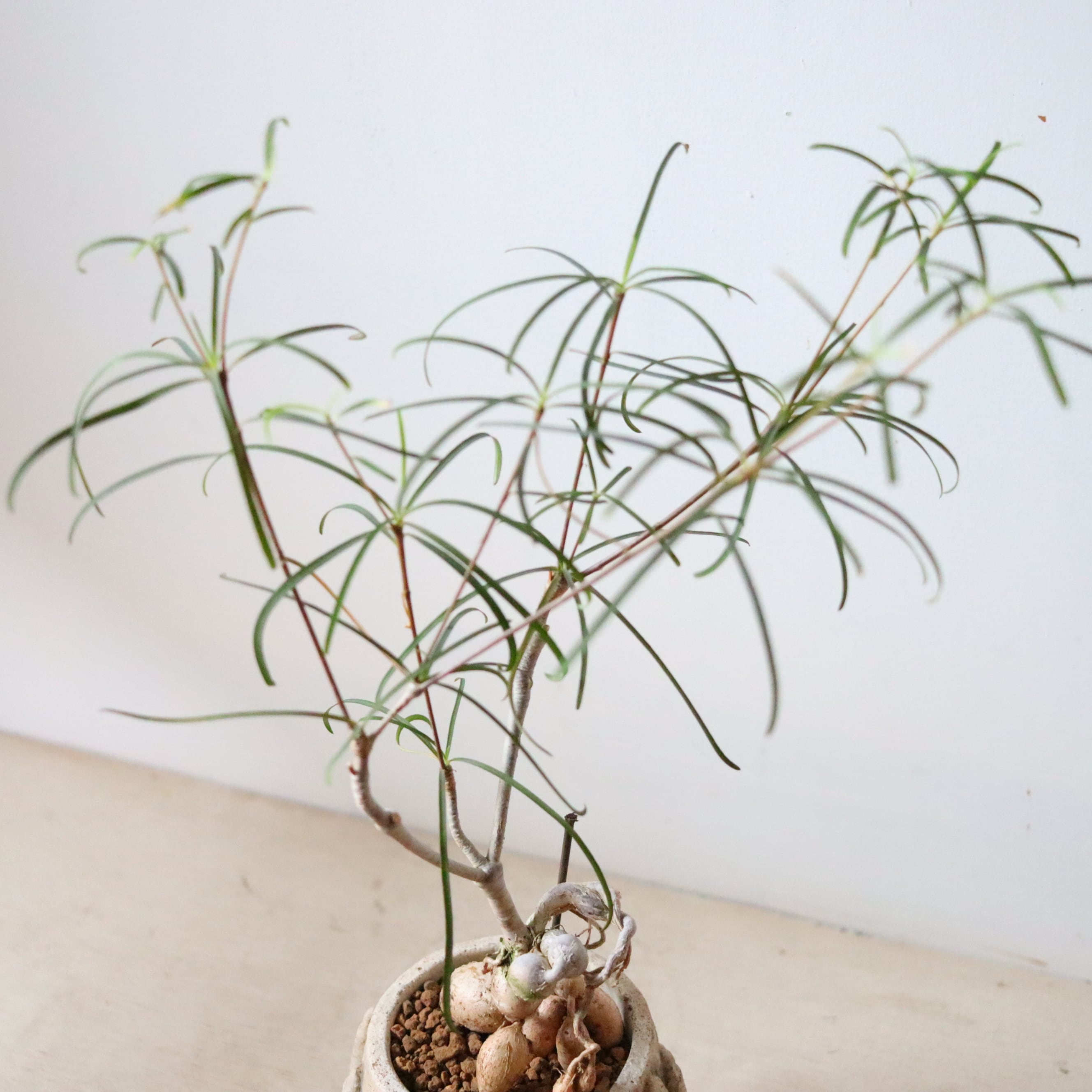 なんて美しい塊根植物…!細長い葉っぱはクルンと巻いていてとてもエレガント。白くてツヤッとした塊根の木肌も、全体のシルエットも本当にビューティフルです。