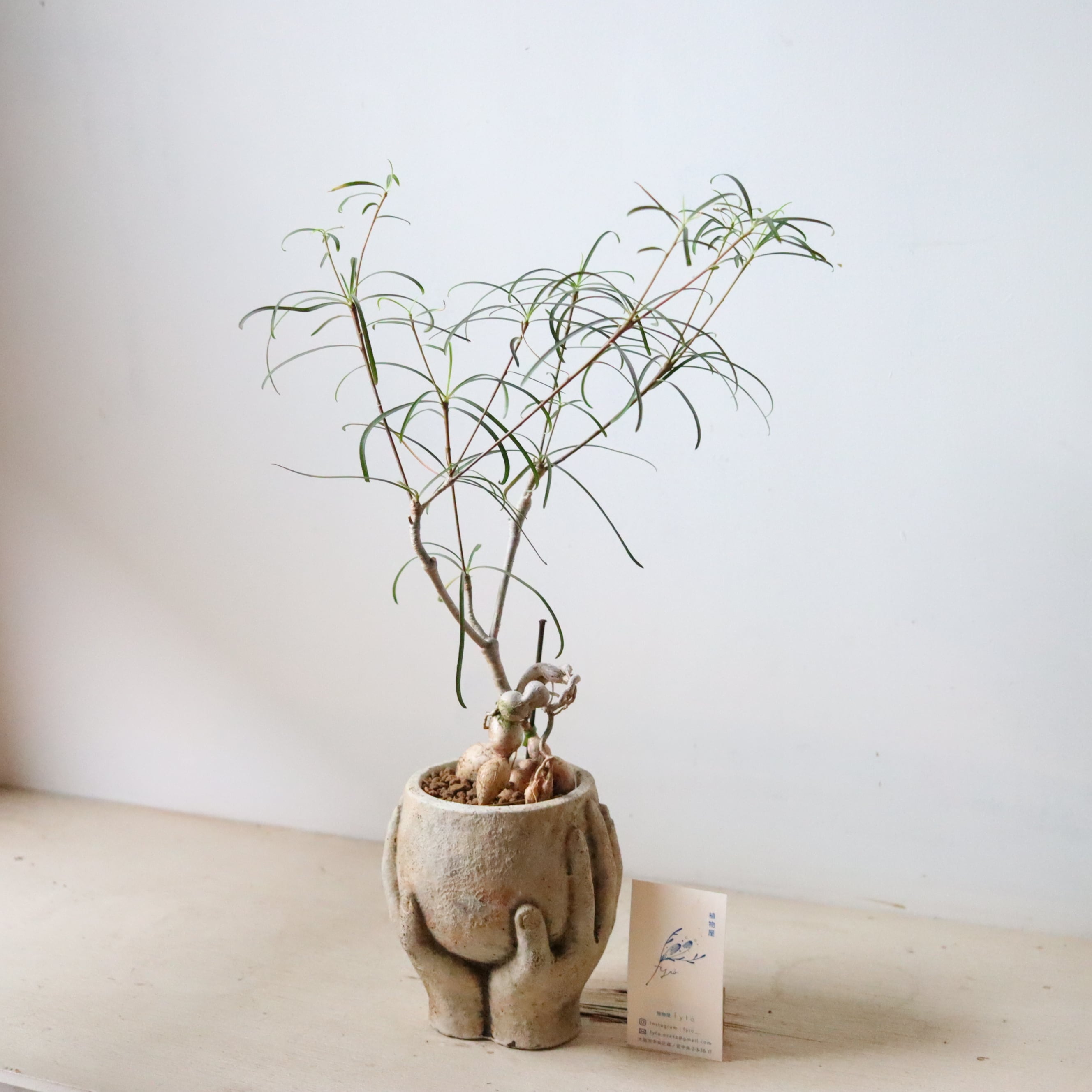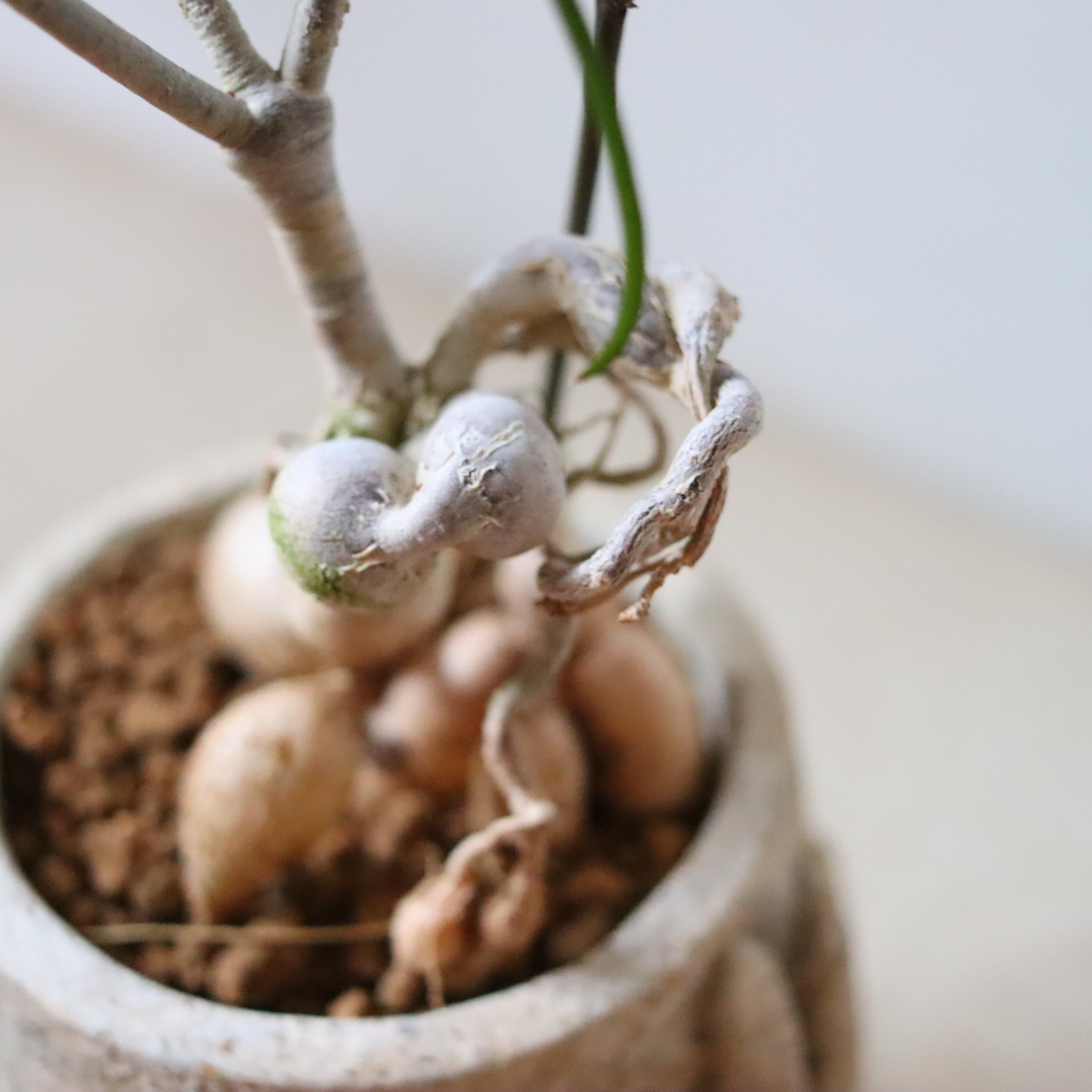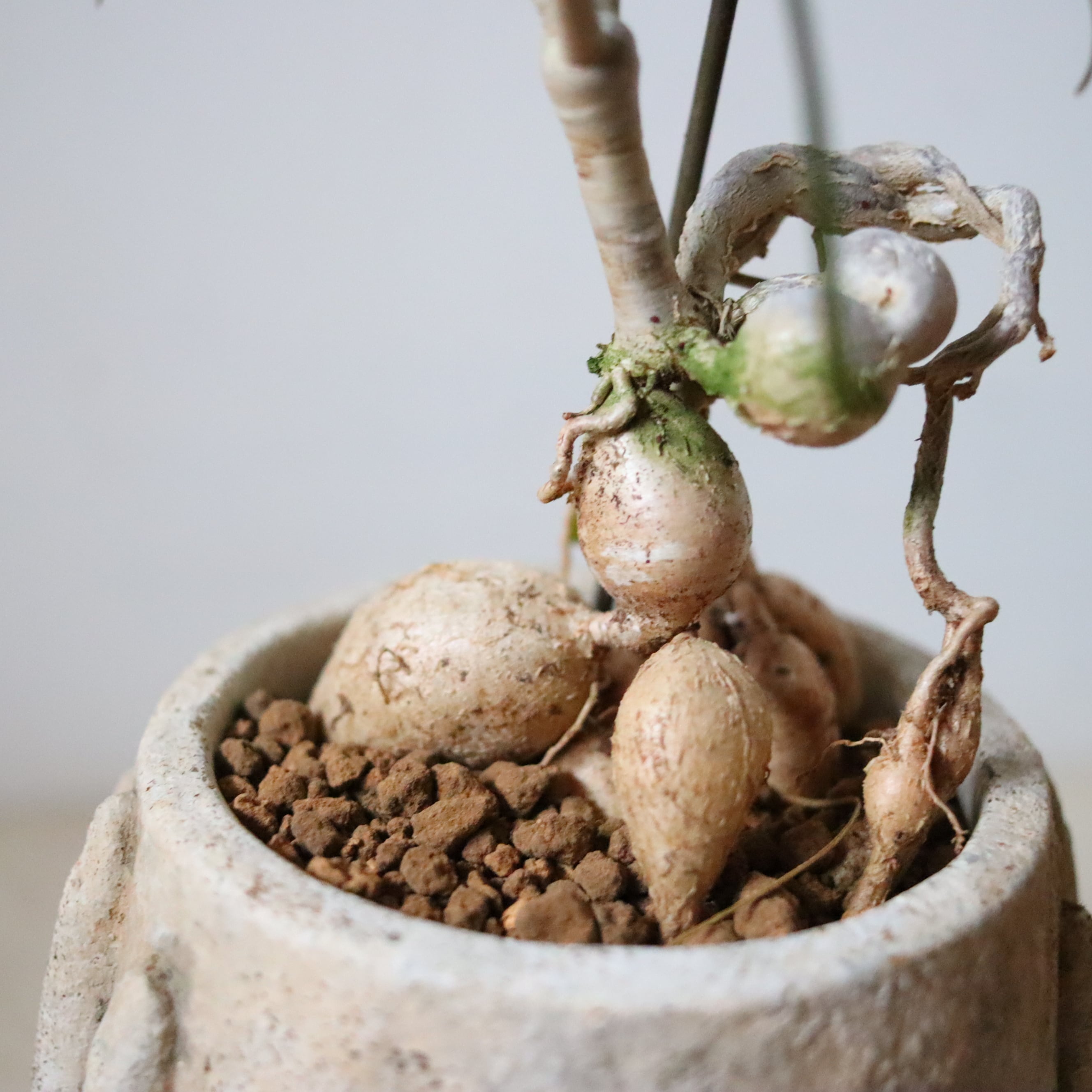 なんて美しい塊根植物…!細長い葉っぱはクルンと巻いていてとてもエレガント。白くてツヤッとした塊根の木肌も、全体のシルエットも本当にビューティフルです。