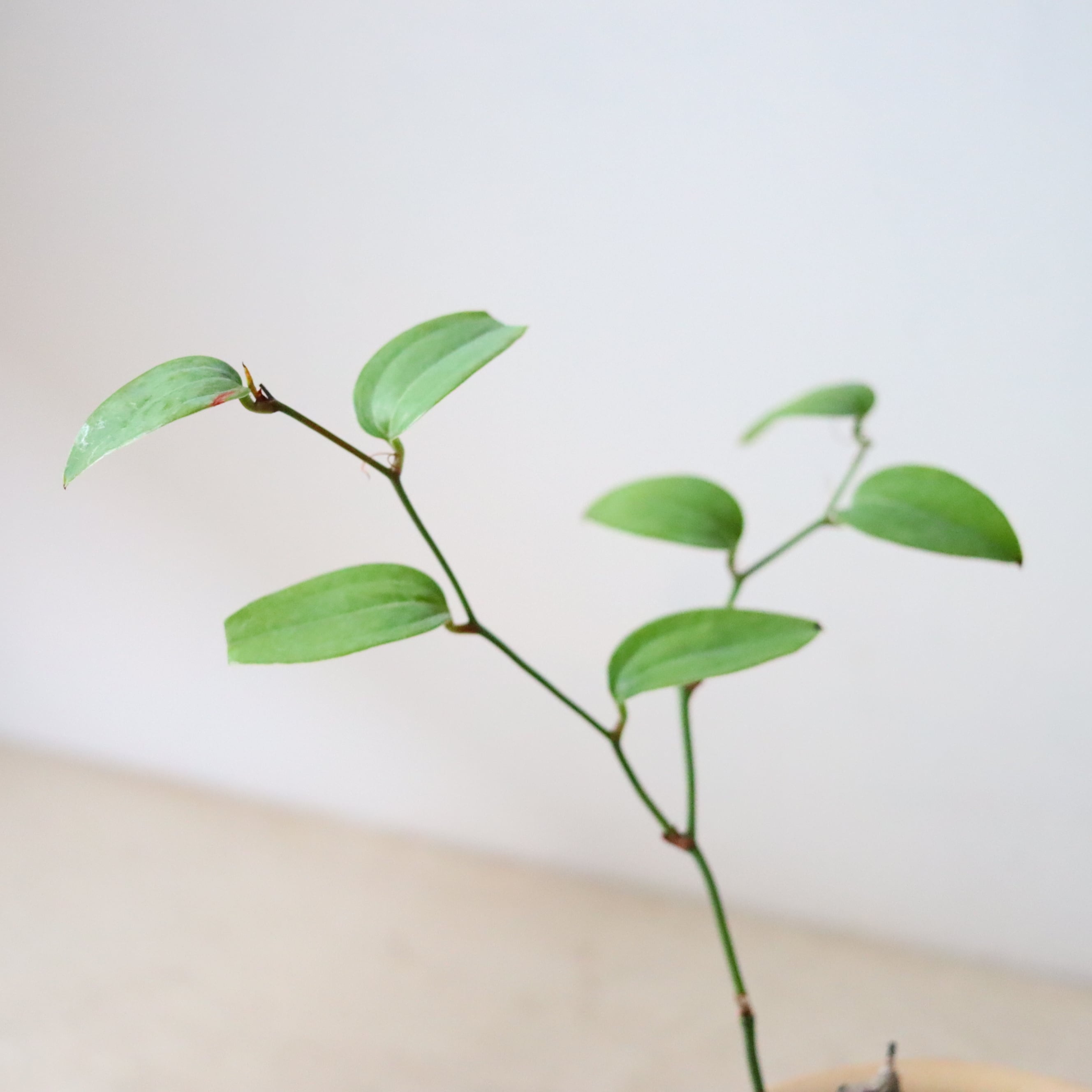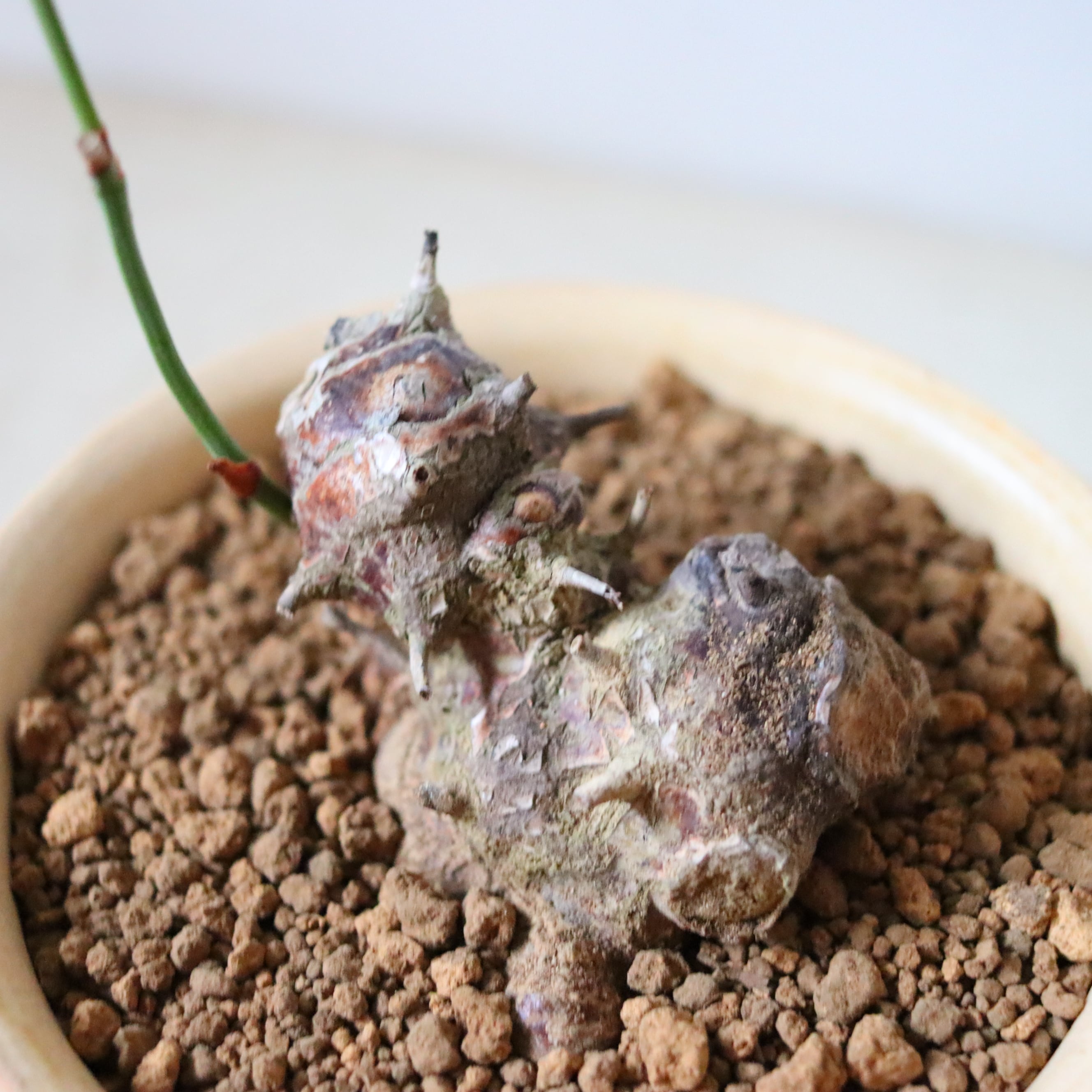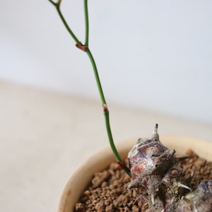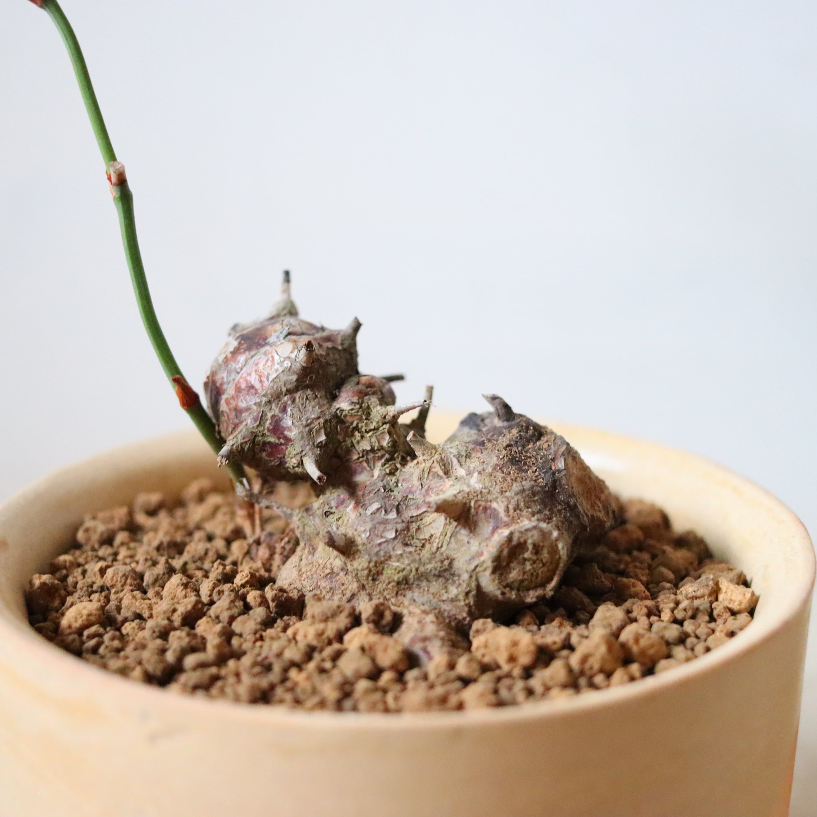いかつい塊根がクールなサルトリイバラです。本来山の中などで自生している赤い身をつけるサルトリイバラ。こんなふうに鉢上げをするとかっこいい姿になるんですね。