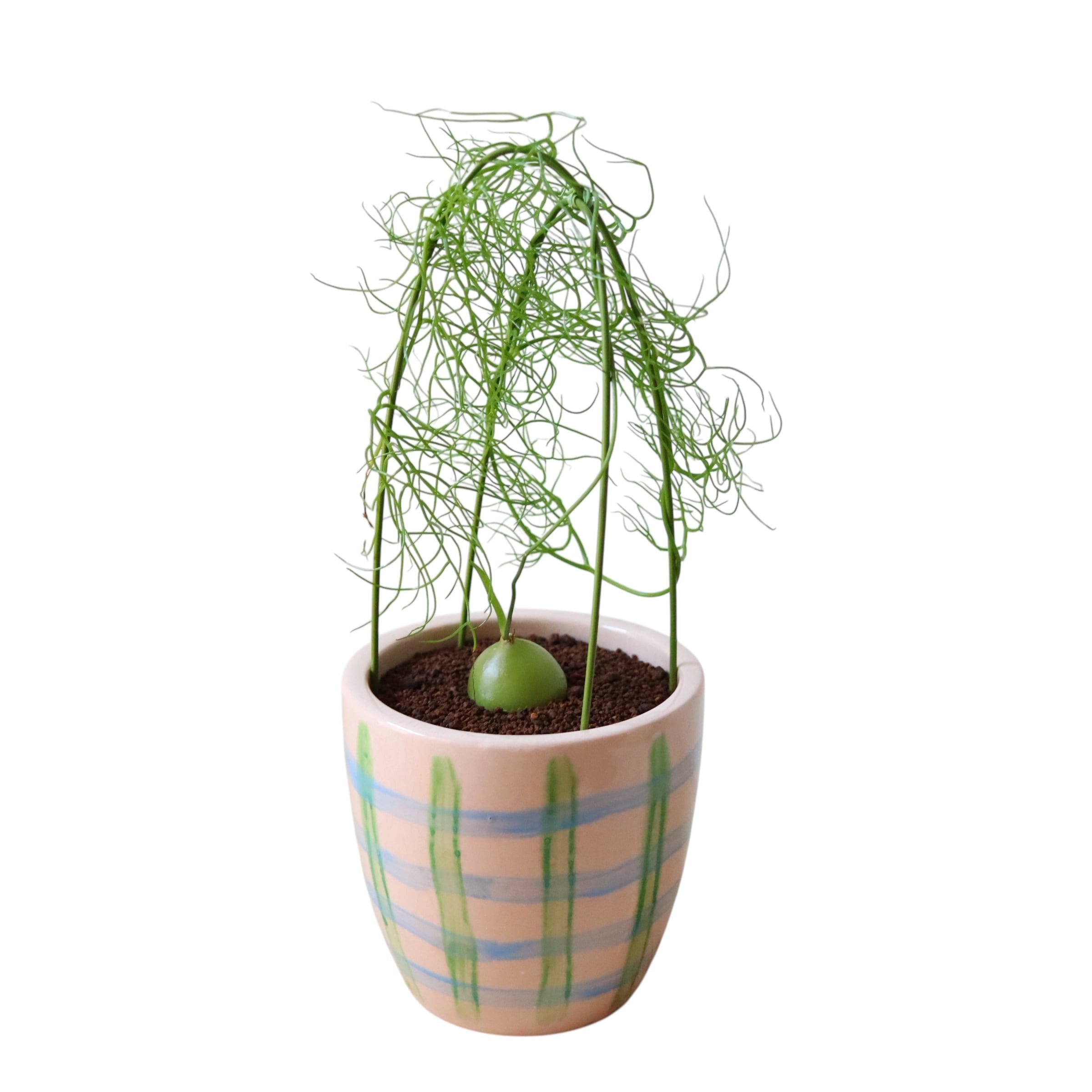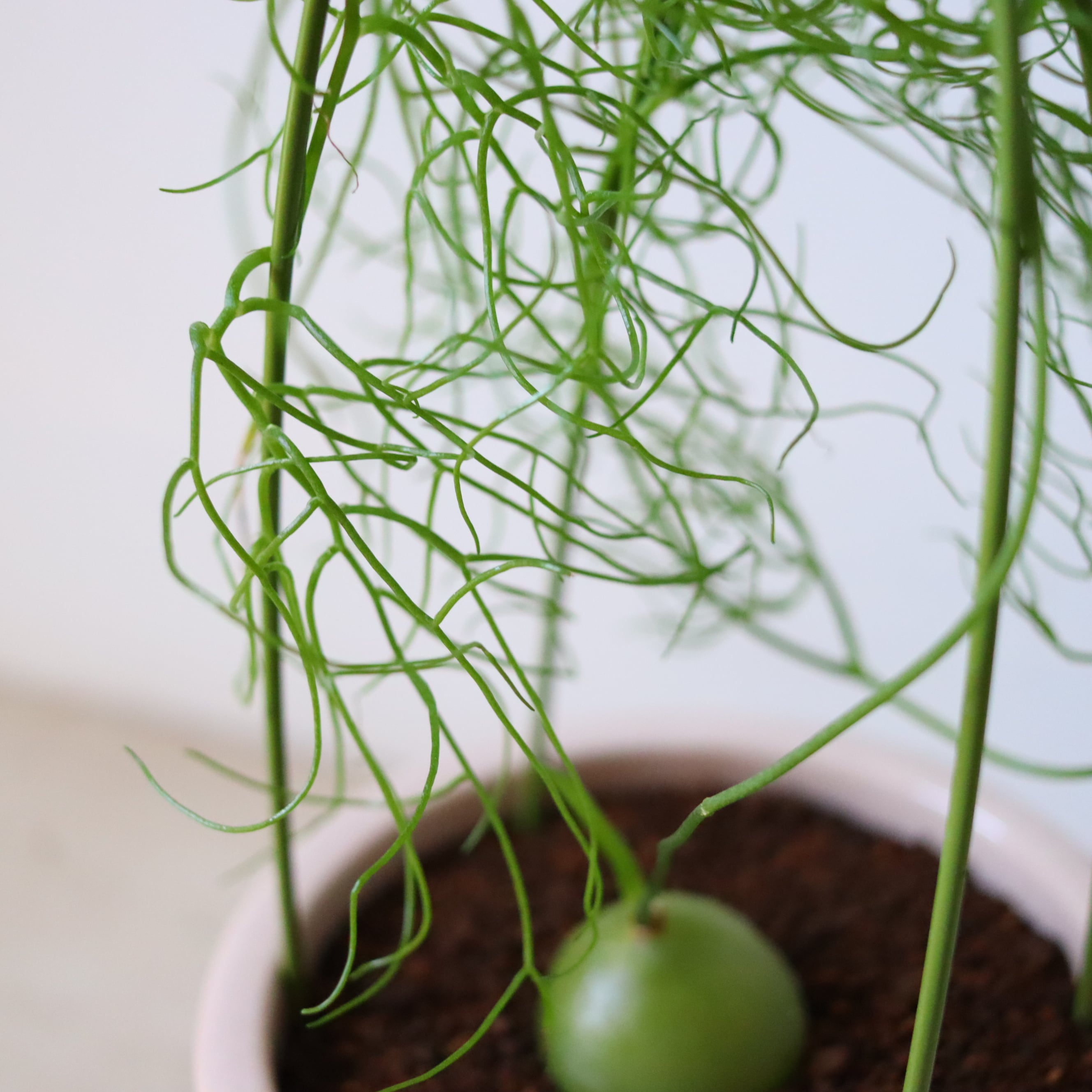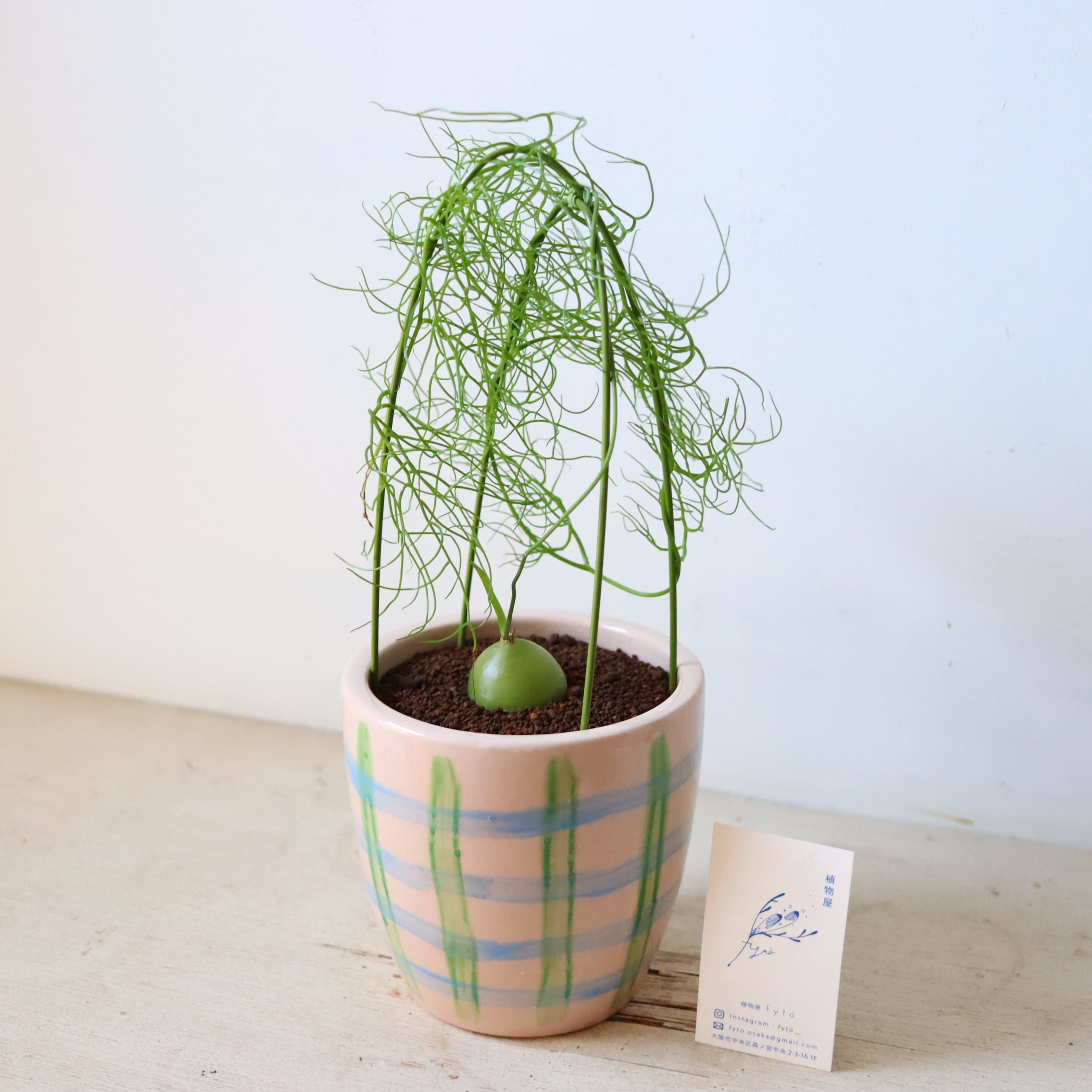 美しい翡翠色の球根植物です。ツヤツヤとした蔓を上へ上へと旺盛に伸ばしていく、かなり個性的な植物です。こう見えて丈夫でお世話も簡単なので変わった植物が欲しい方におすすめです。
