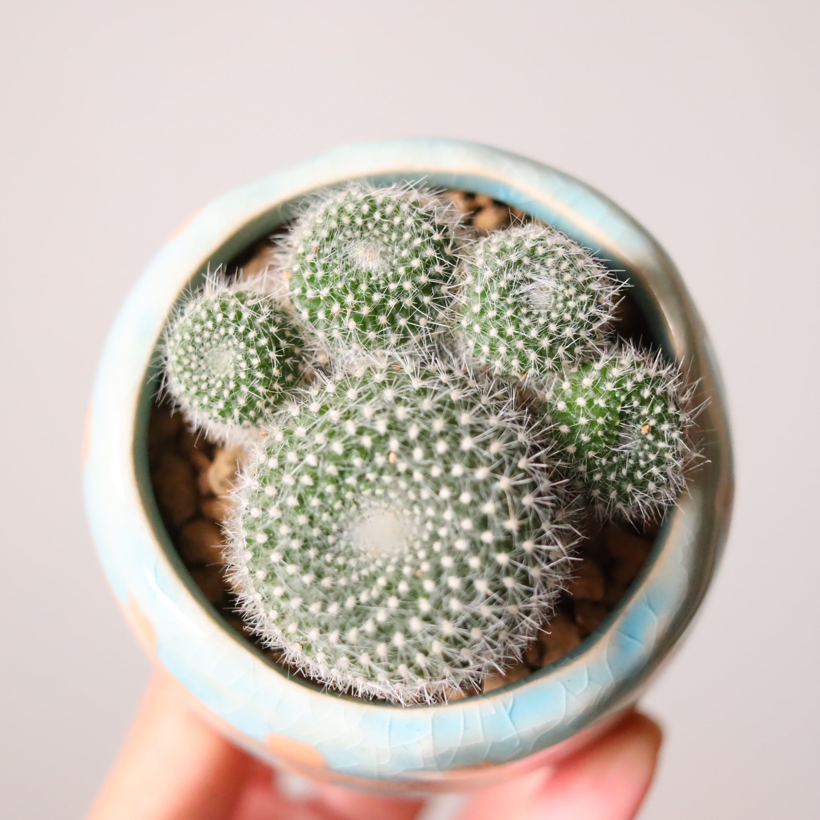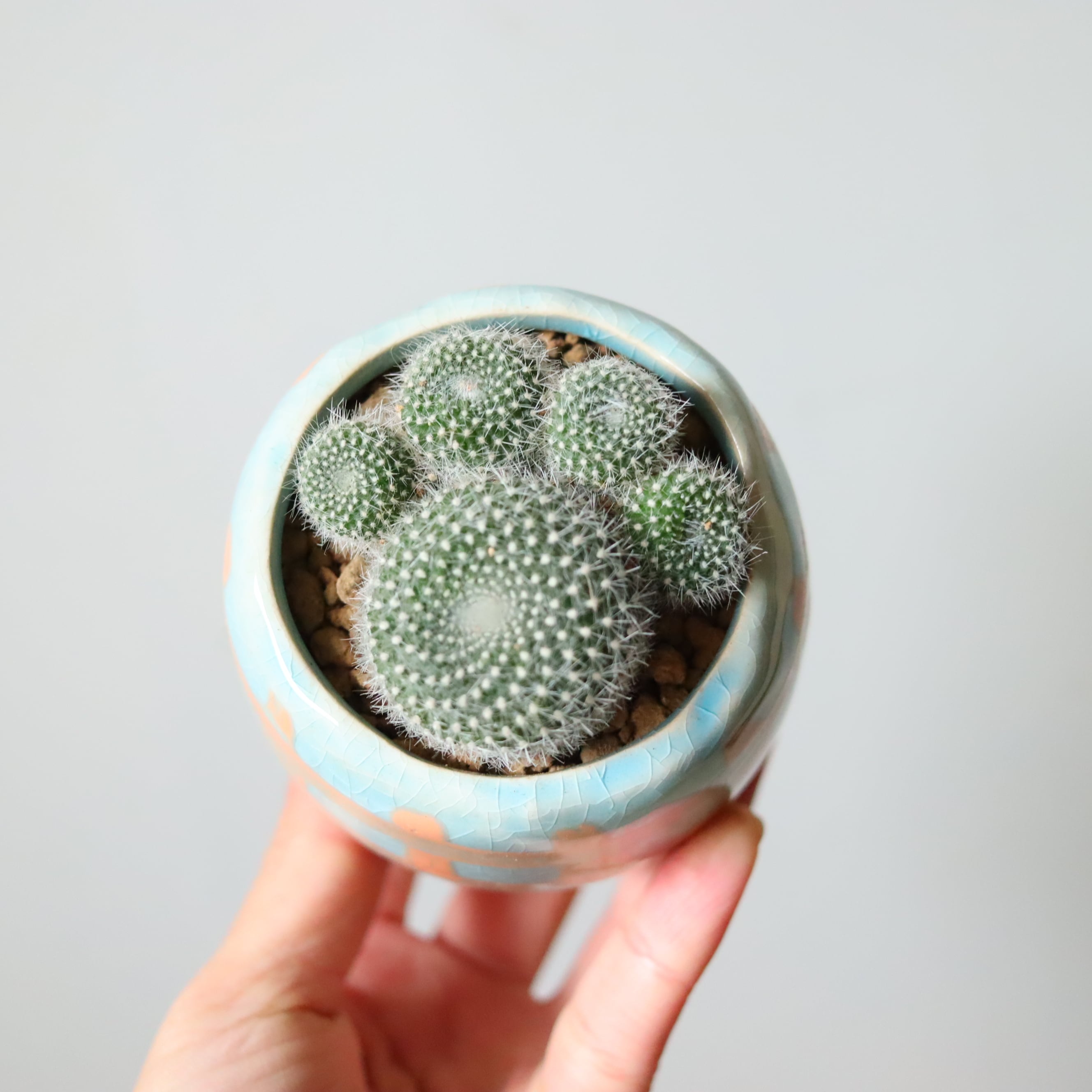 肉球のように仕立てられたかわいいサボテン。にくきゅうという名前で仕入れましたが、おそらく雪晃だとおもいます。サボテンのこの絶妙な凹み具合、撫でたくなりますね。トゲがやわらかいので撫でても大丈夫です。赤い立派なお花を咲かせてくれます。