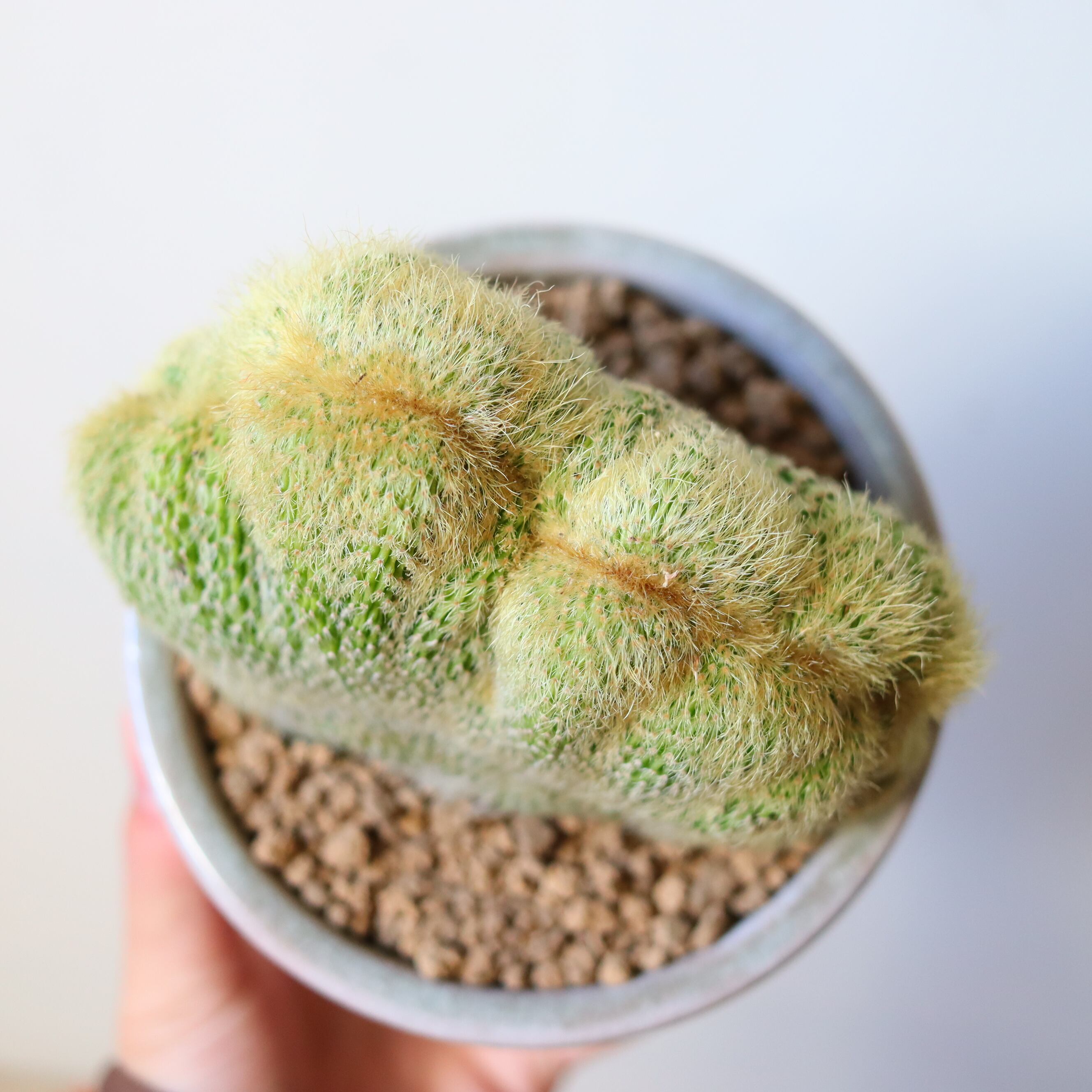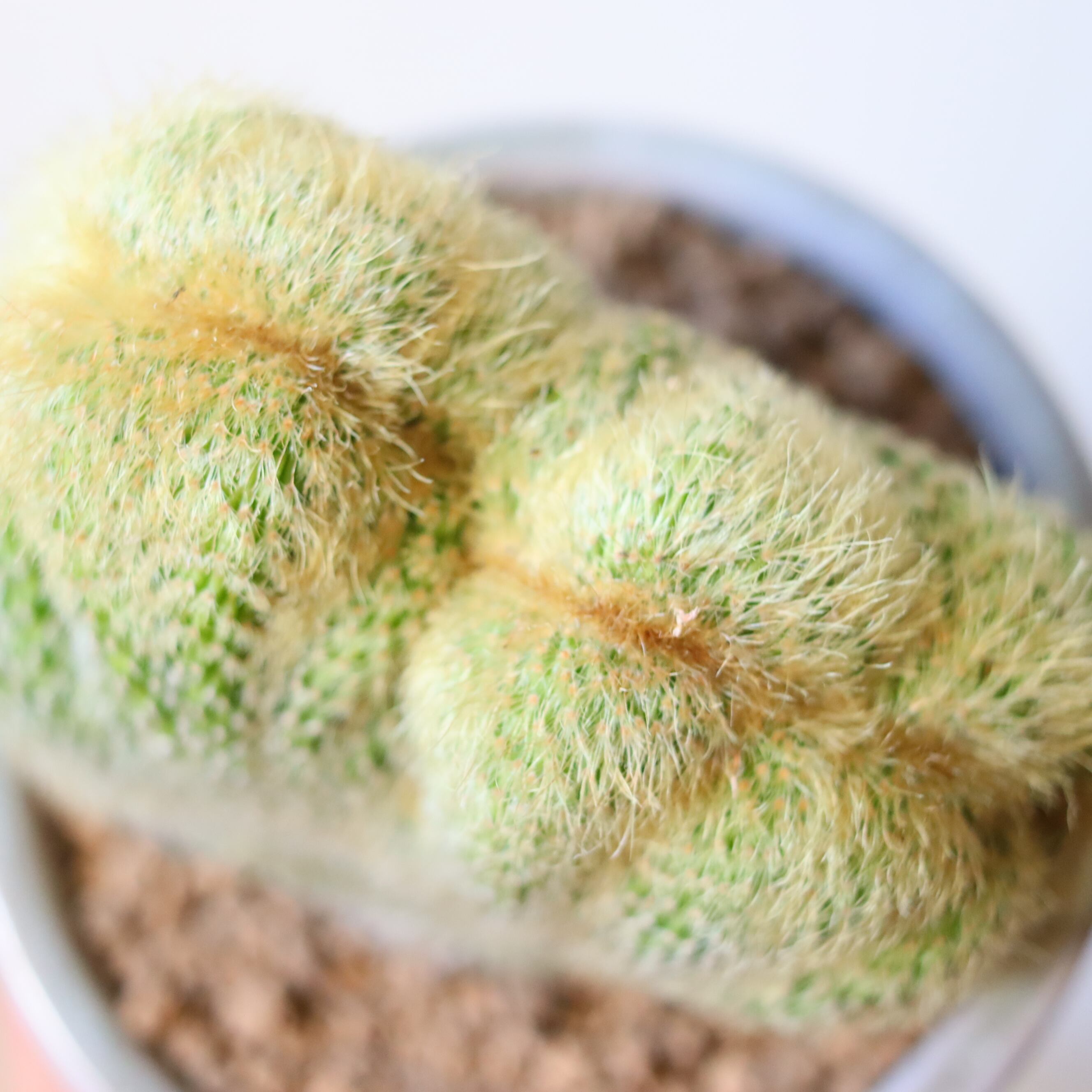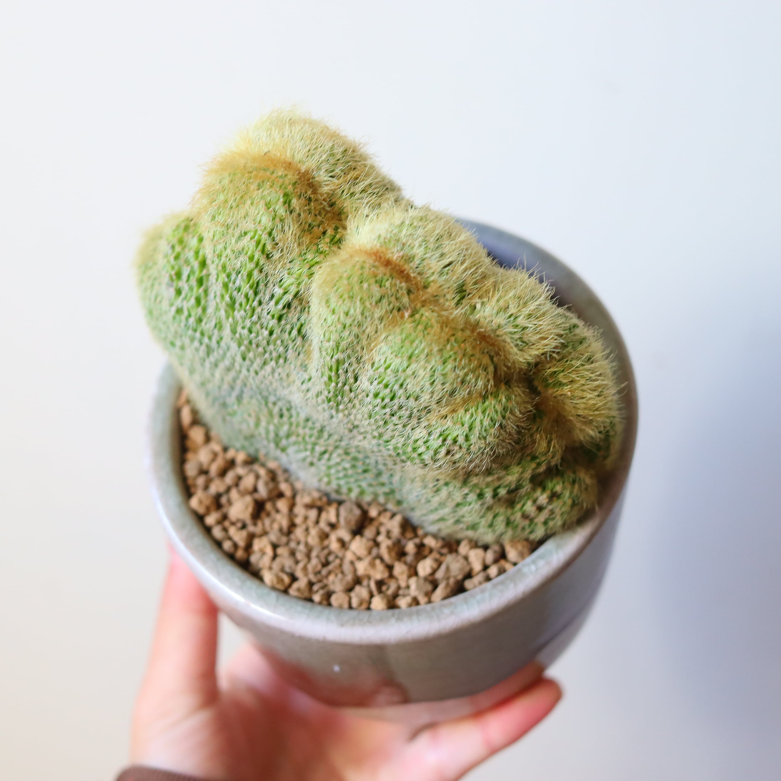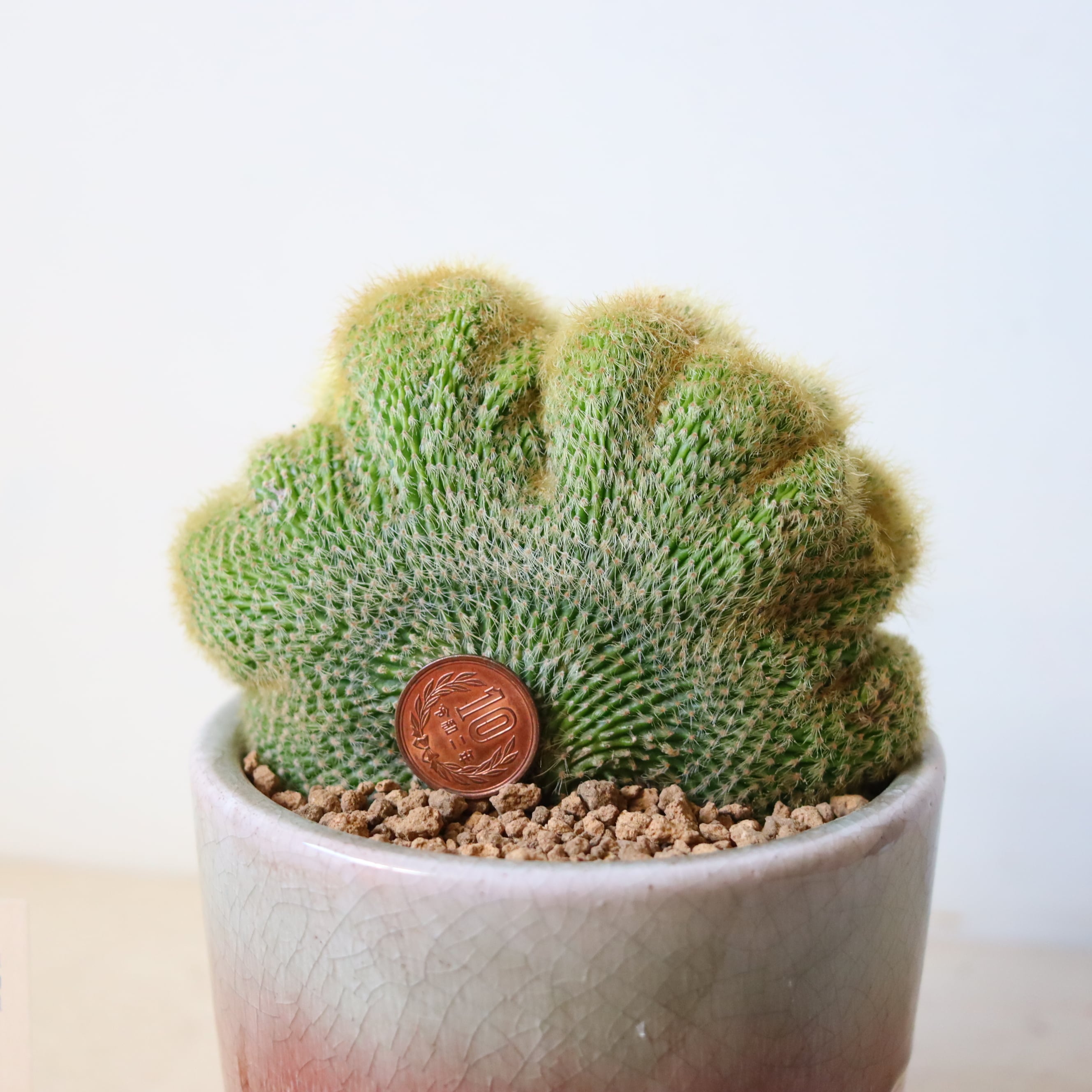とっても珍しい、金晃丸の綴化した姿です。けっこう大きいです。すごい、ぬいぐるみみたいな肉厚感。もふもふで重量感があって唯一無二のかわいらしさですね。お水もほとんどいらないのでお世話が簡単です。大きさは10円玉との比較でイメージしてください。