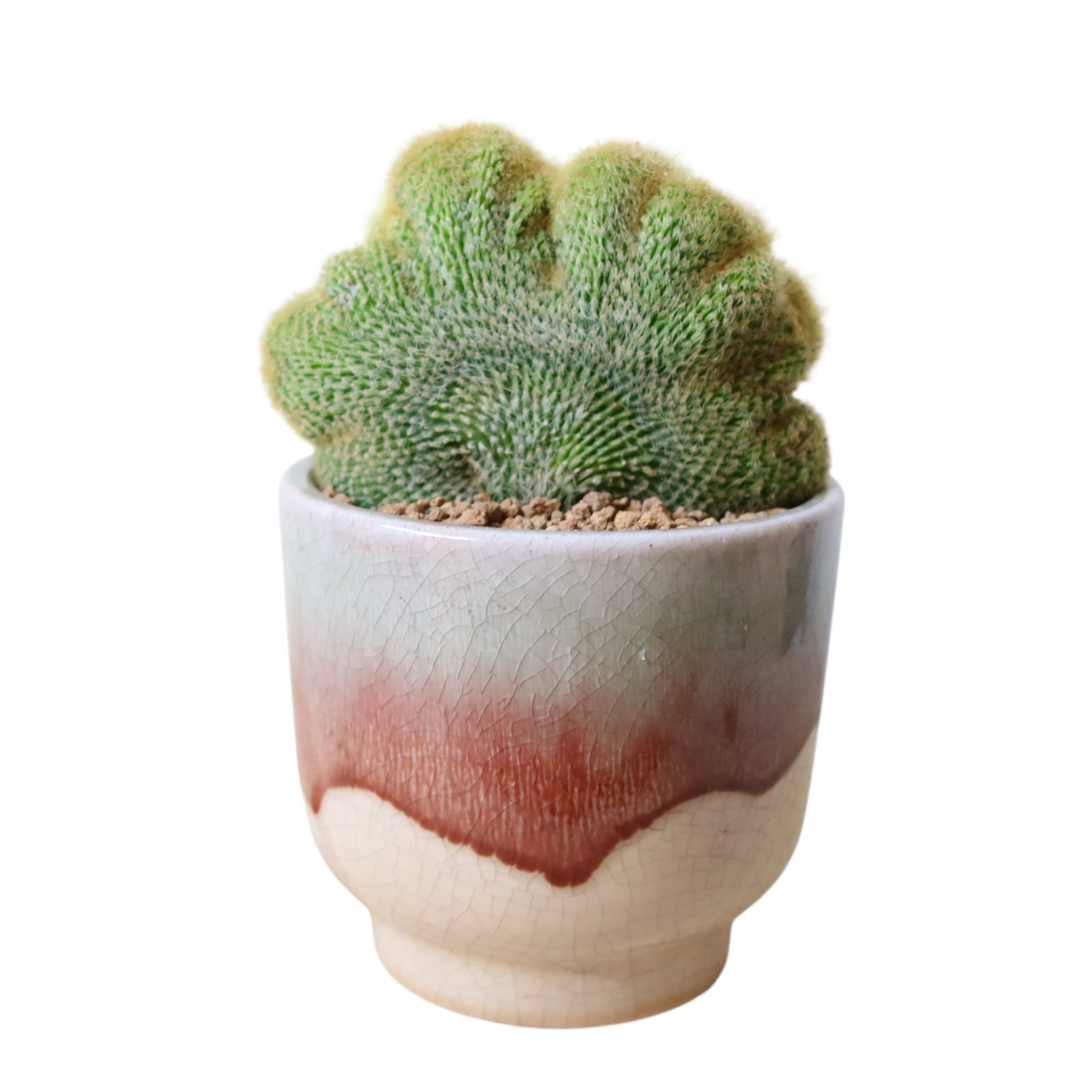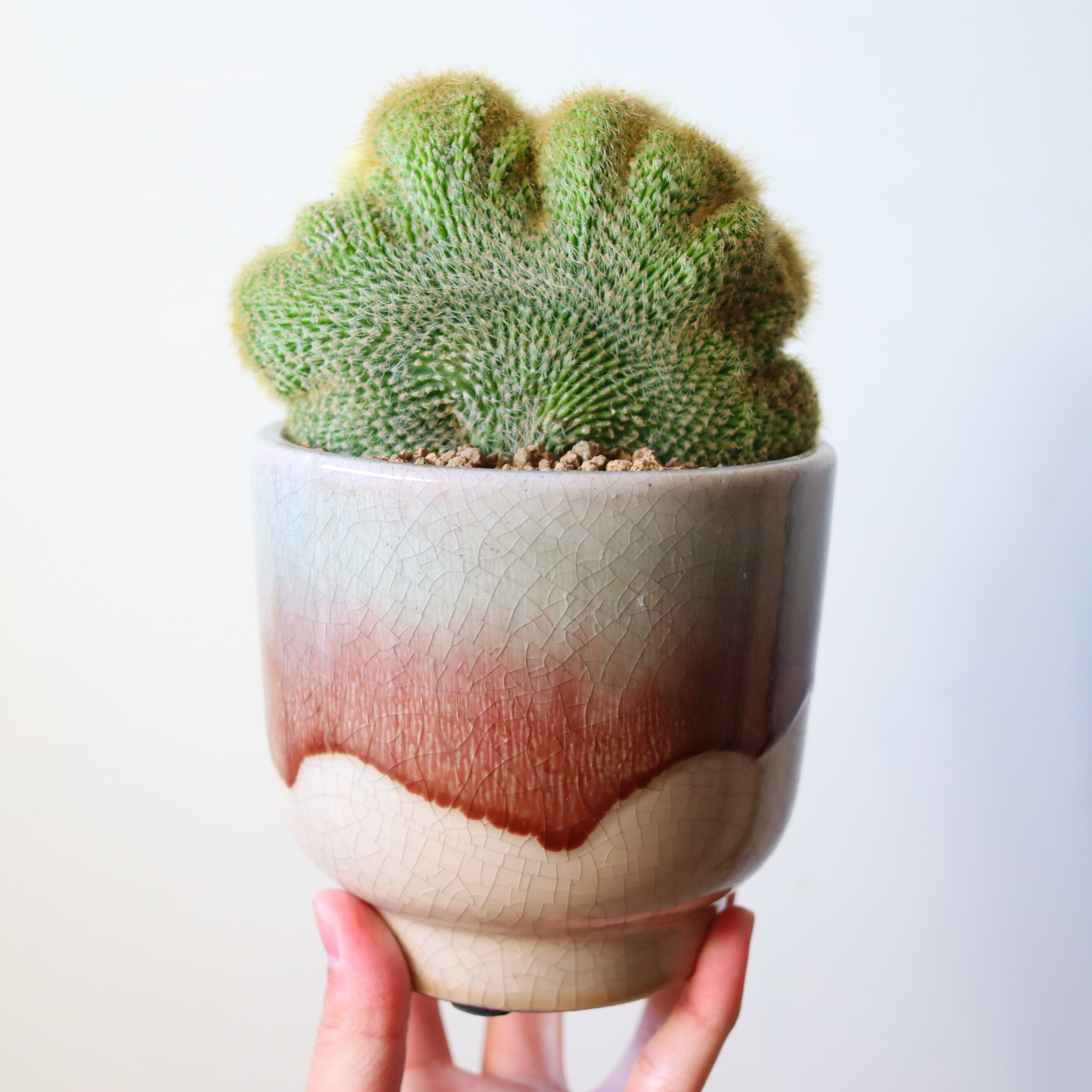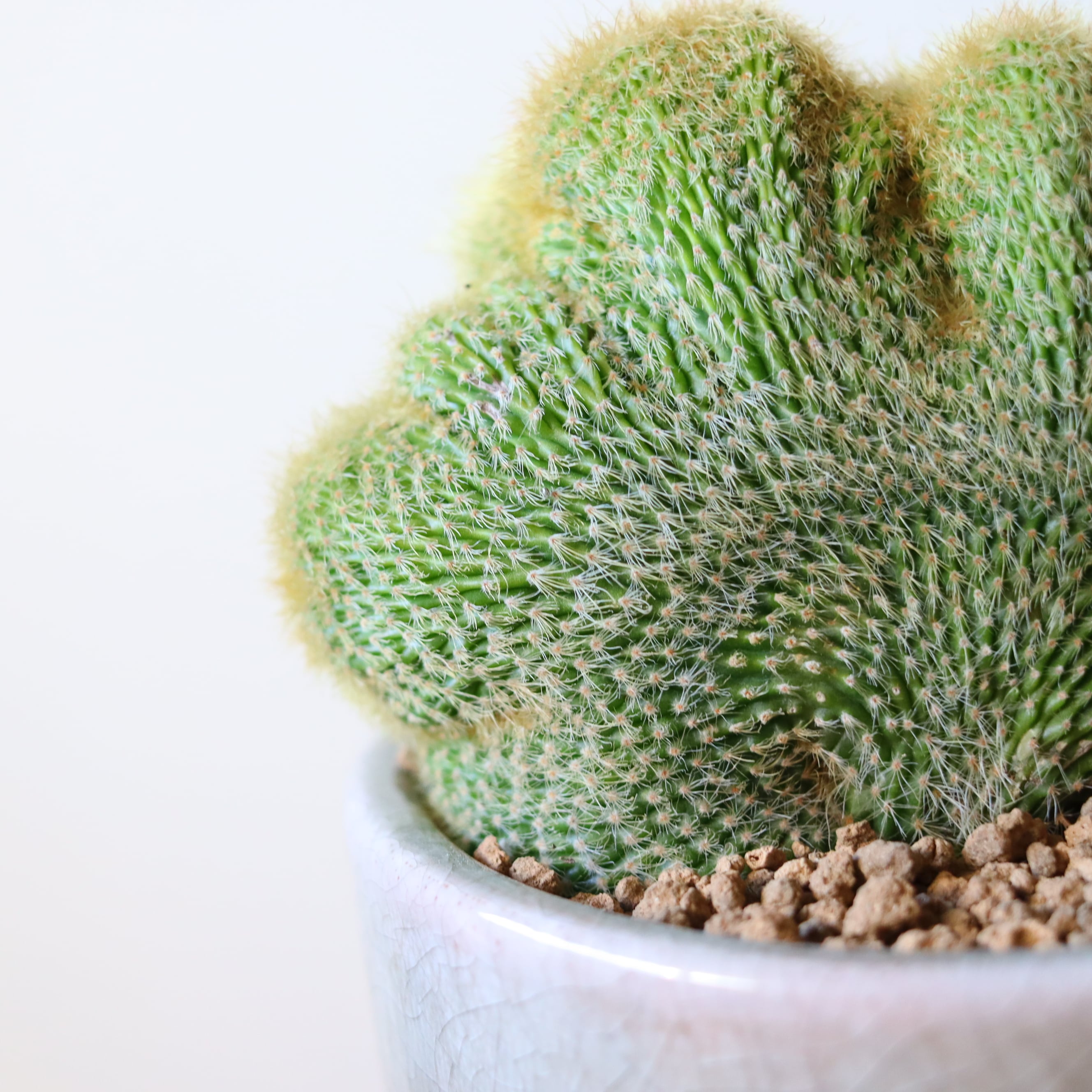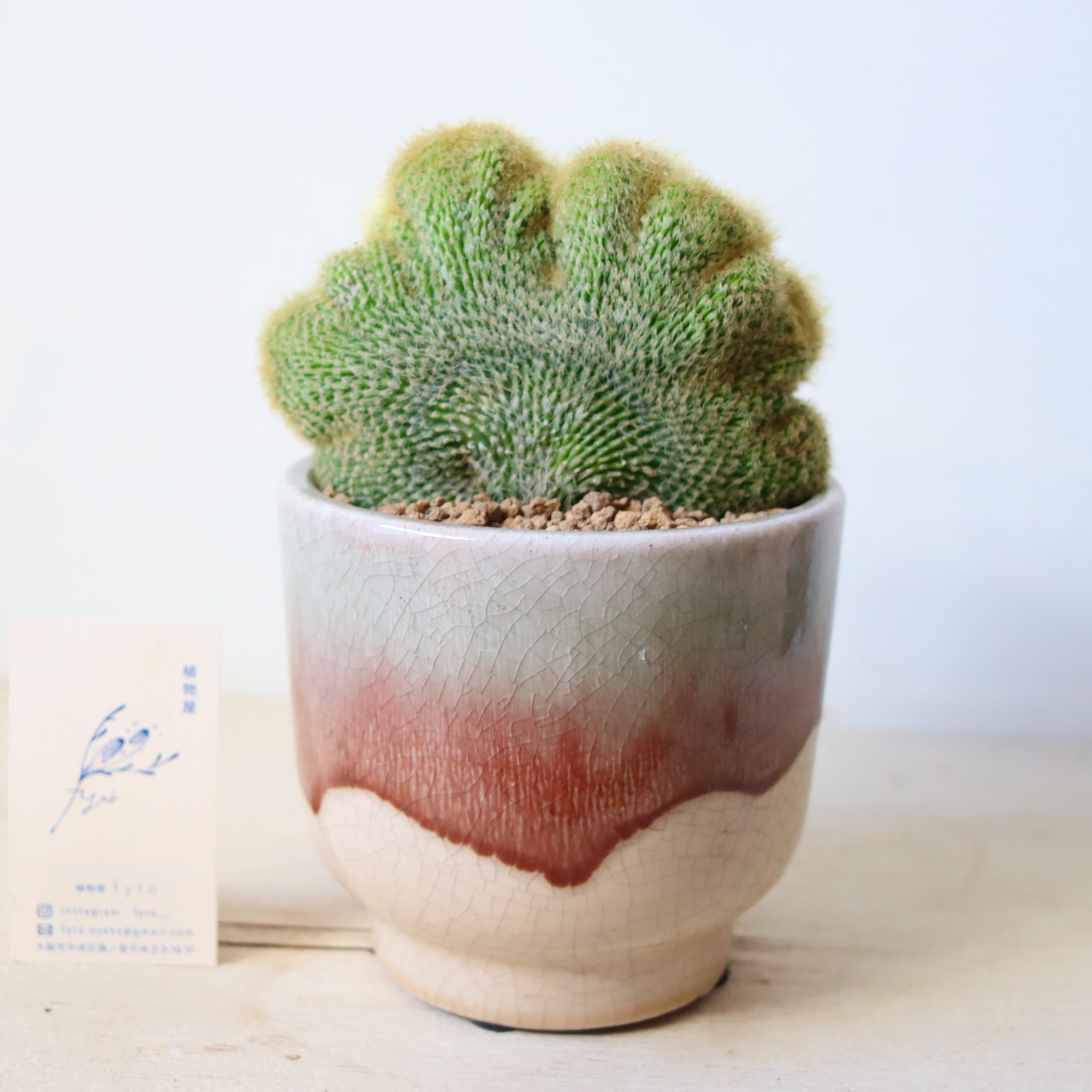 とっても珍しい、金晃丸の綴化した姿です。けっこう大きいです。すごい、ぬいぐるみみたいな肉厚感。もふもふで重量感があって唯一無二のかわいらしさですね。お水もほとんどいらないのでお世話が簡単です。大きさは10円玉との比較でイメージしてください。