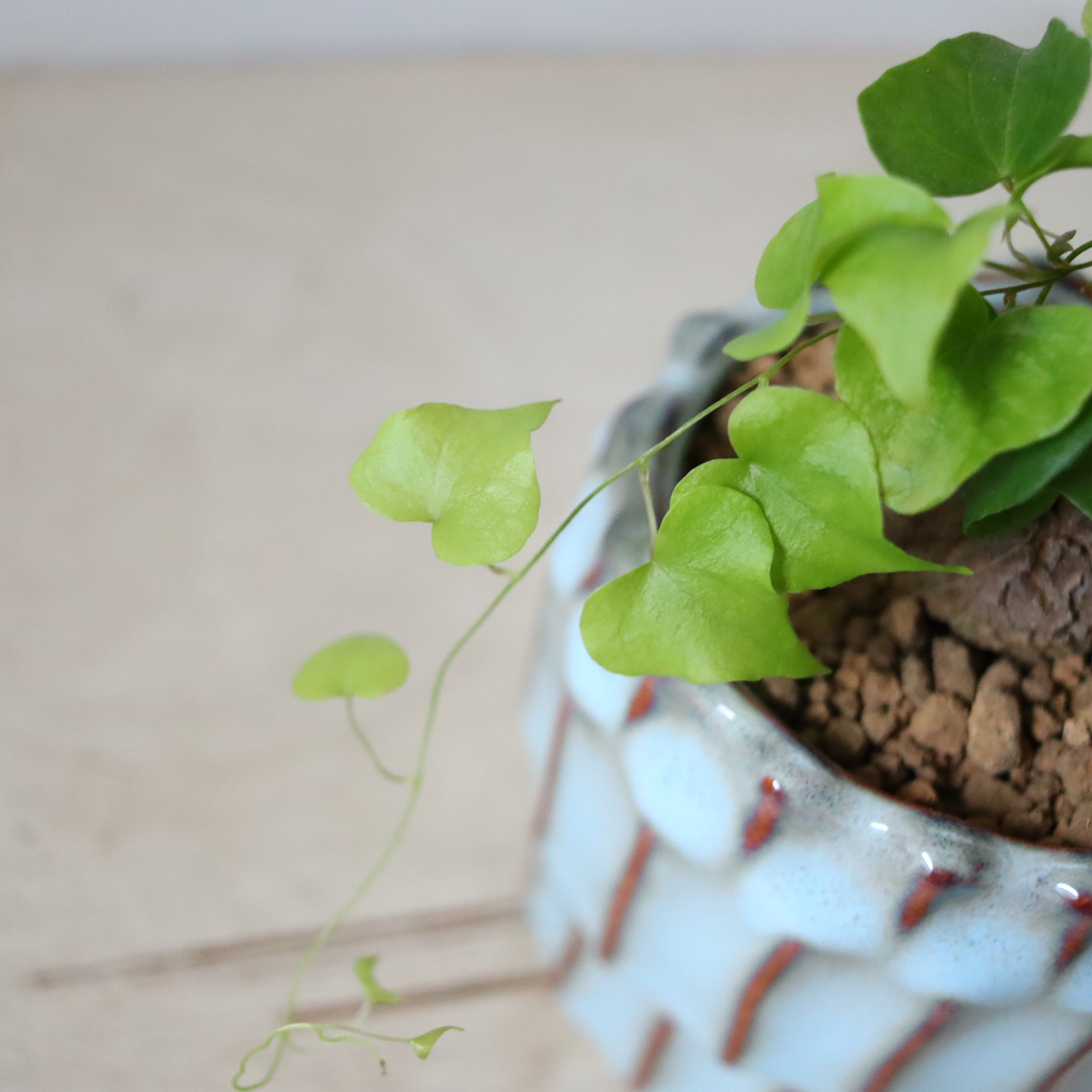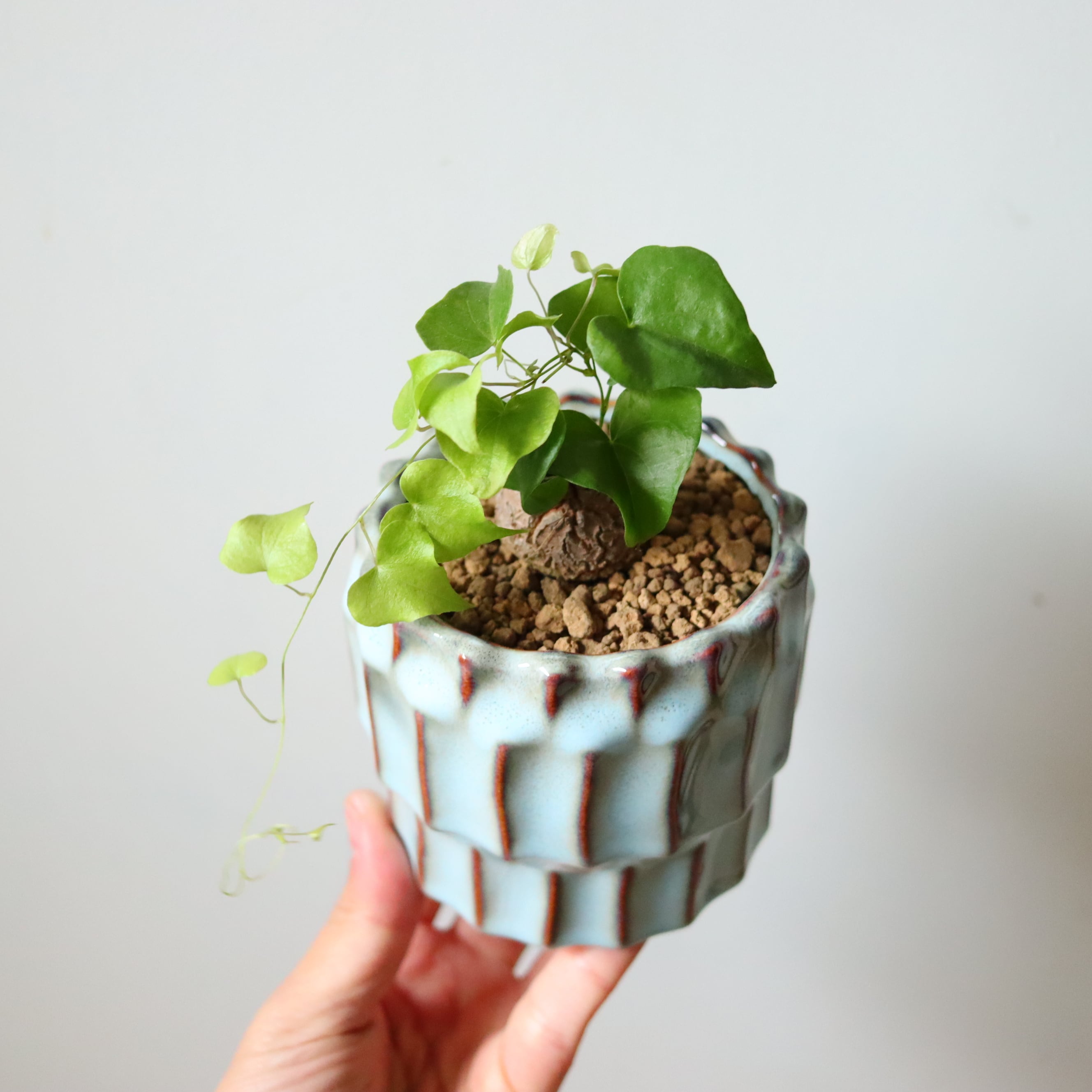 少しマニアックな植物が好きな方なら一度は憧れる塊根植物の亀甲竜です。成長すると塊根部分が亀の甲羅のようにバキバキに割れていくことからそのように名づけられました。この株はまだ子供なのでかっこいいというよりもかわいい感じです。