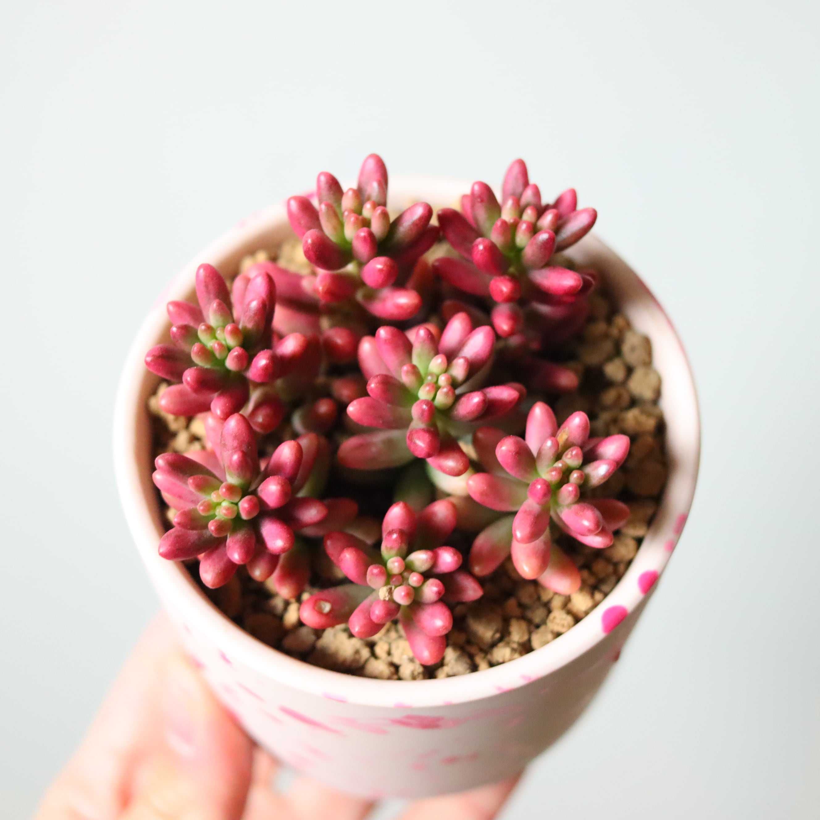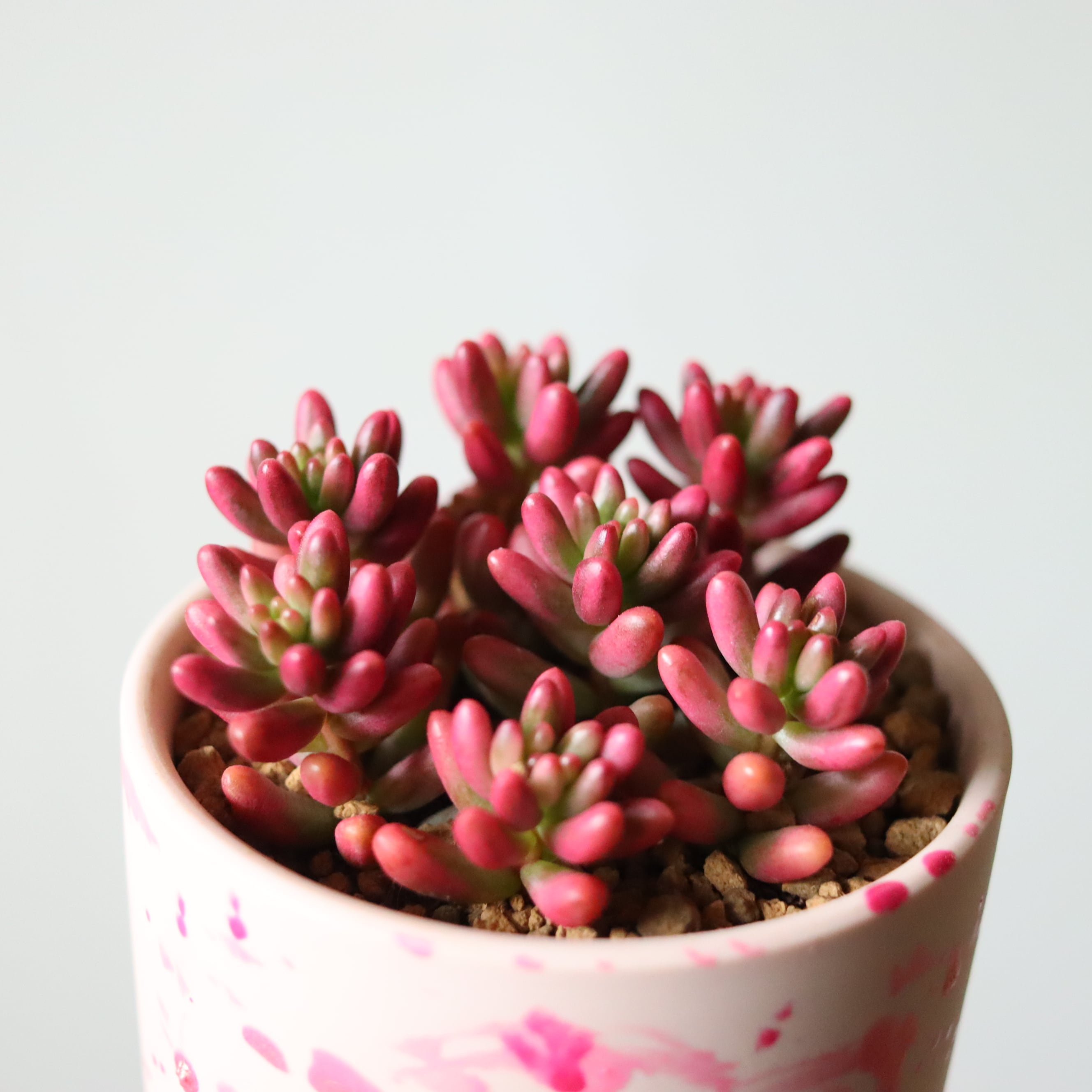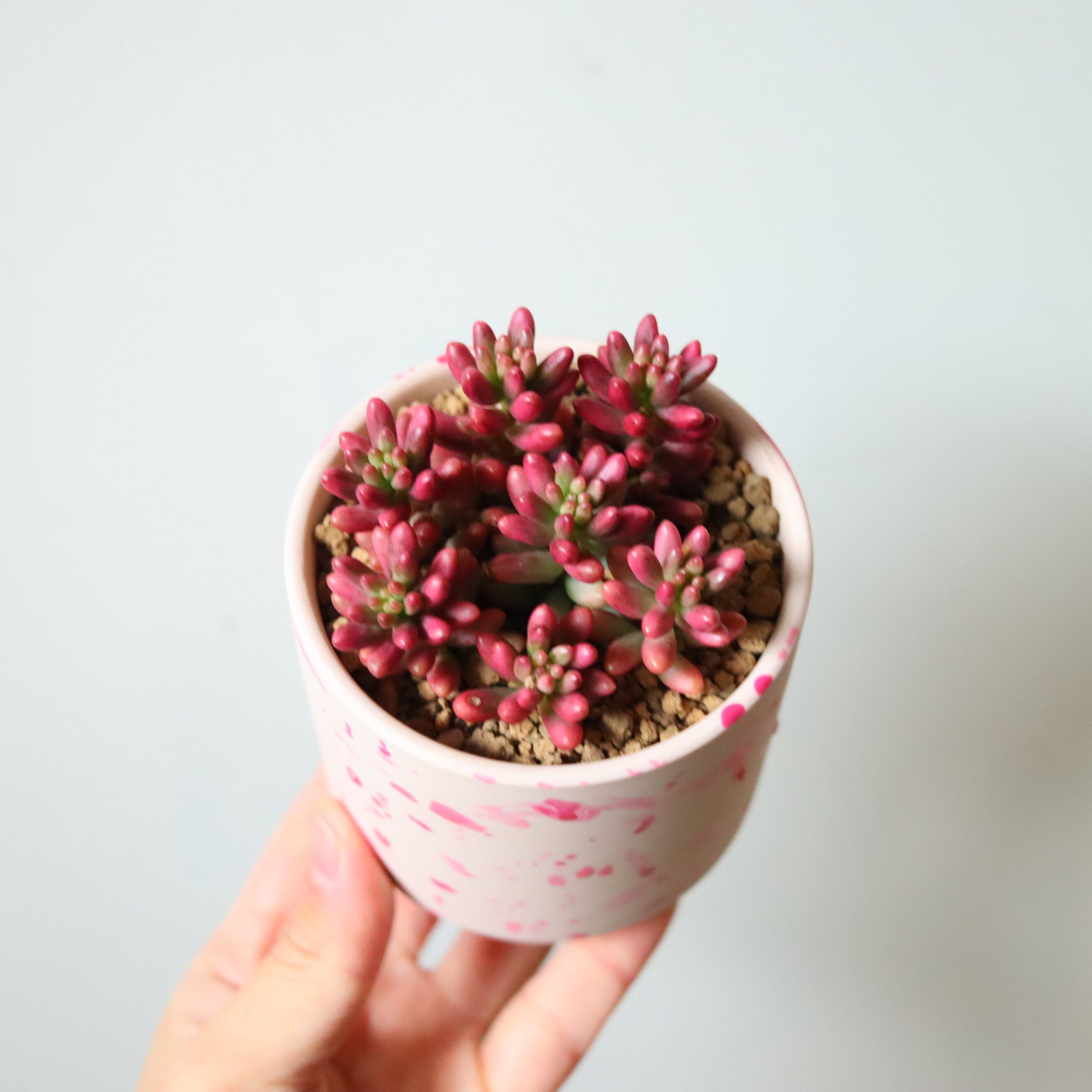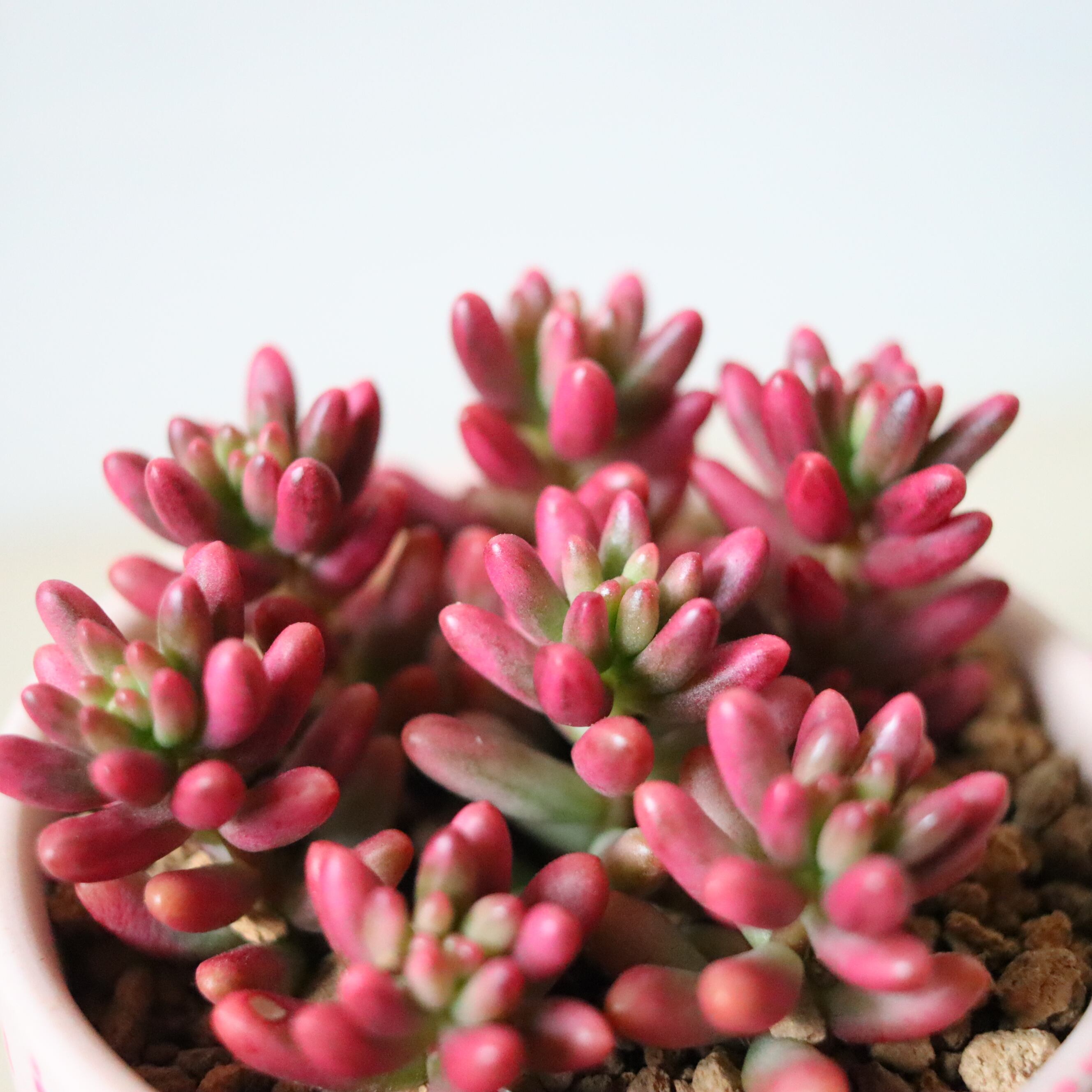 ぷりっぷりの多肉植物です。虹の玉の斑入り品種で、虹の玉よりもやわらかいピンク色をしています。ベリーっぽくて可愛い。暖かい季節は緑ですが、寒くなってくると紅葉してピンクになります。