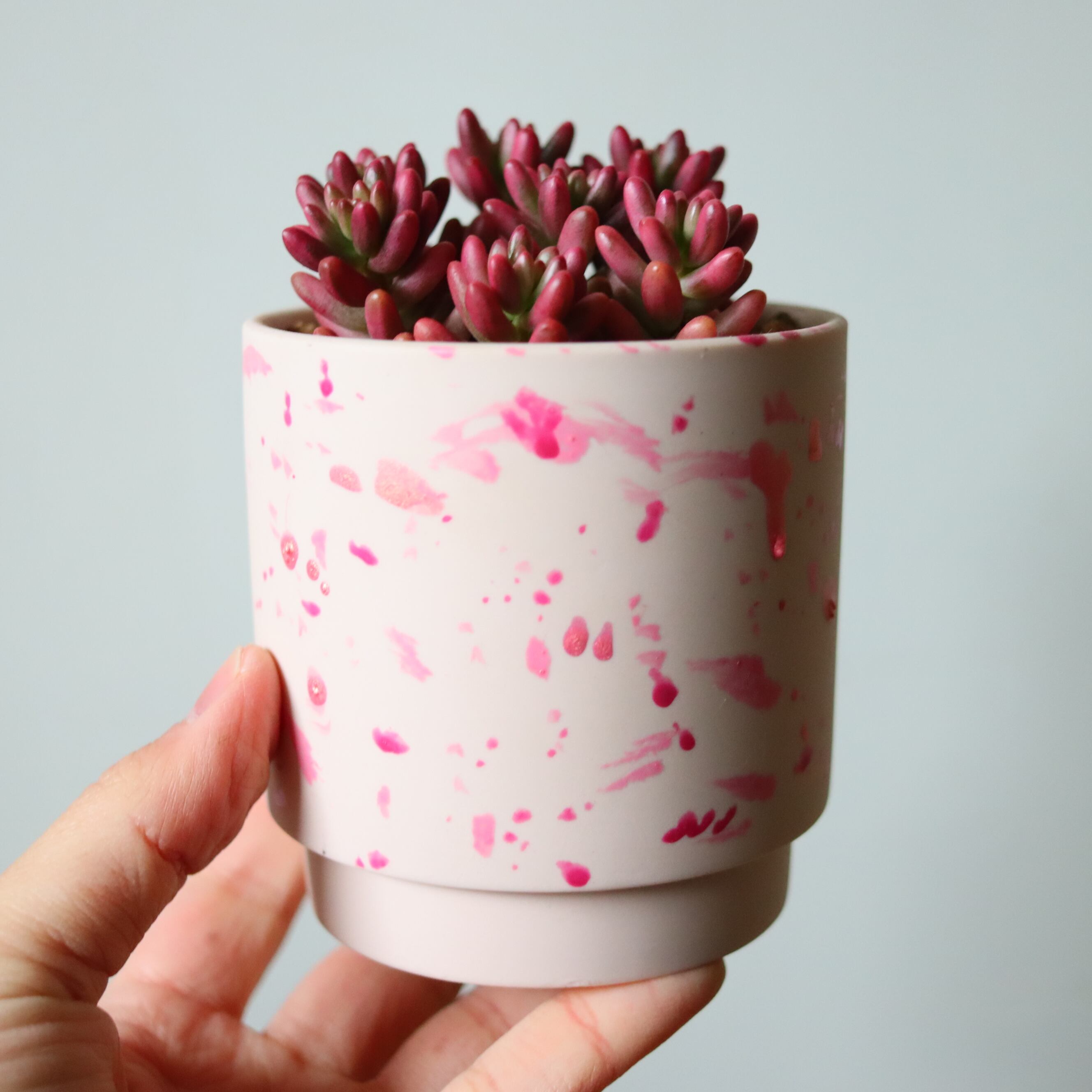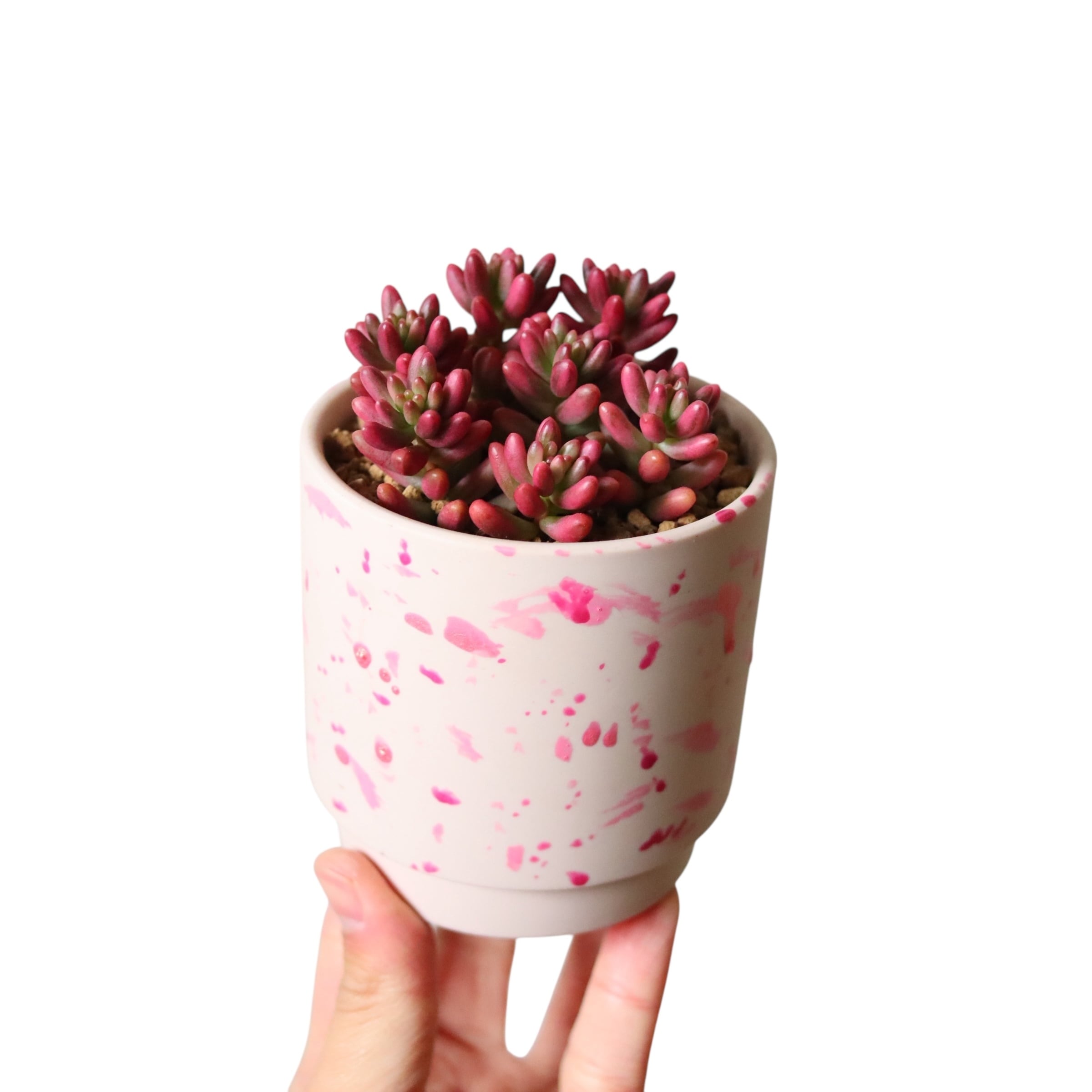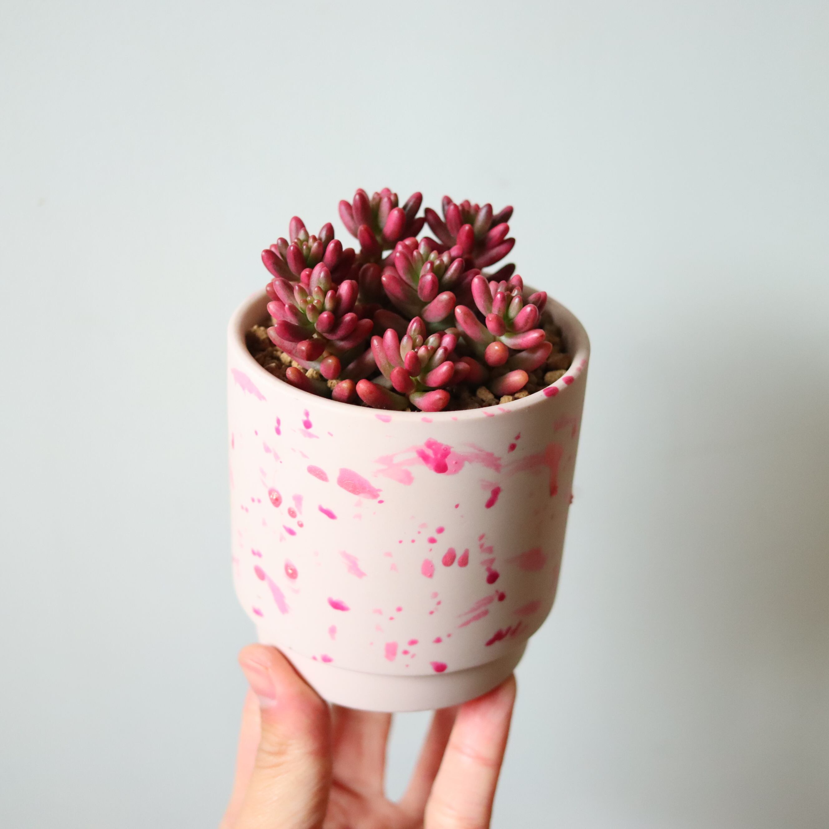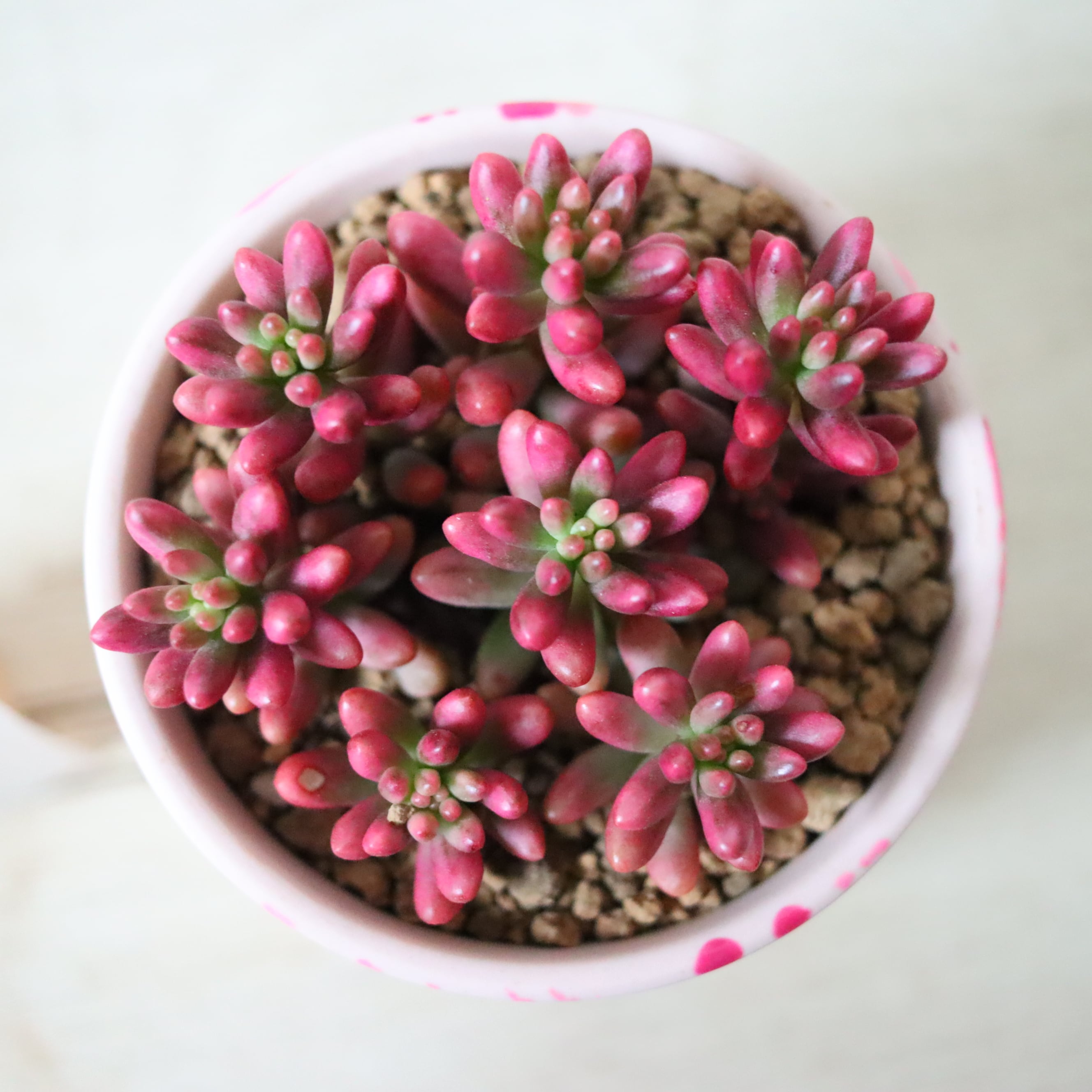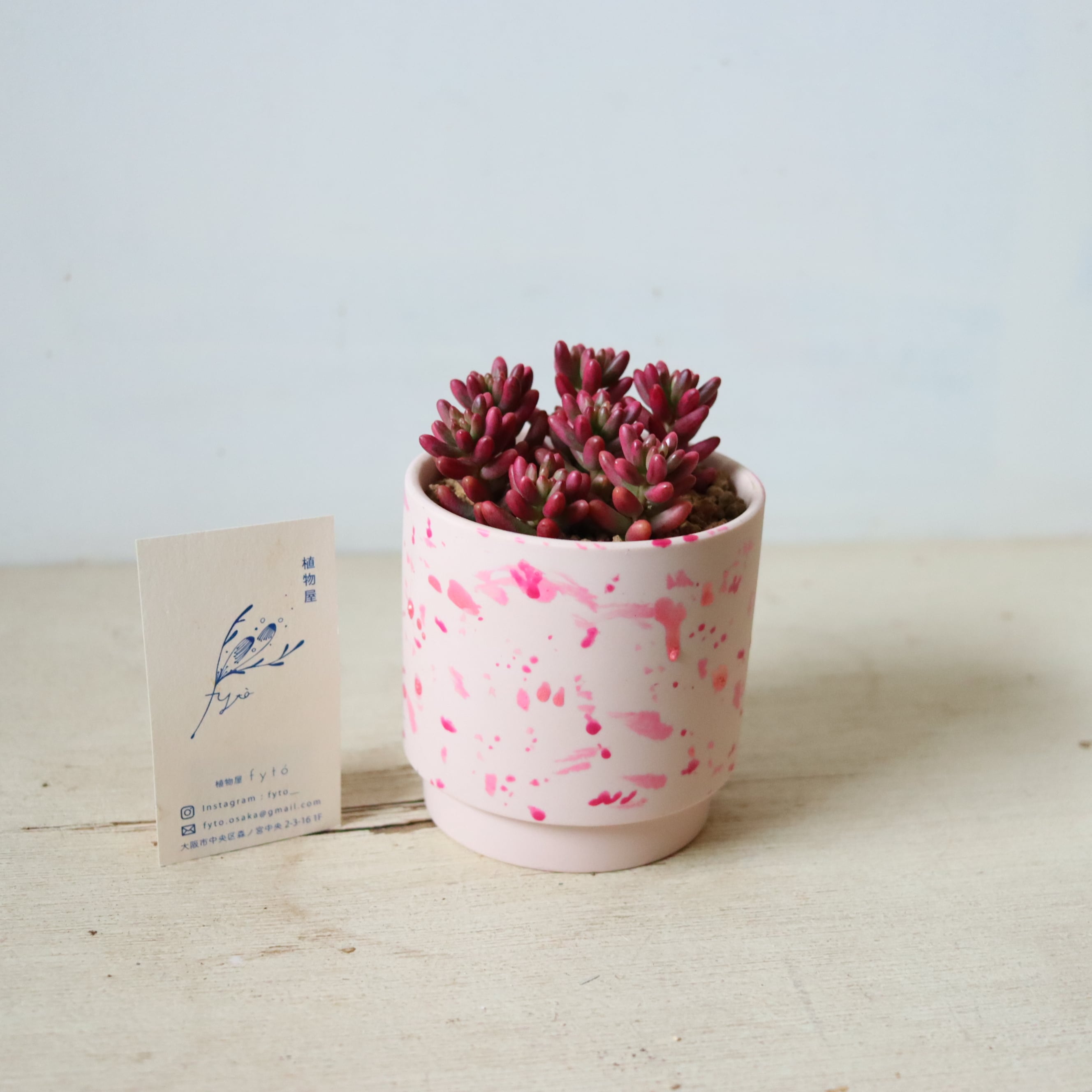 ぷりっぷりの多肉植物です。虹の玉の斑入り品種で、虹の玉よりもやわらかいピンク色をしています。ベリーっぽくて可愛い。暖かい季節は緑ですが、寒くなってくると紅葉してピンクになります。