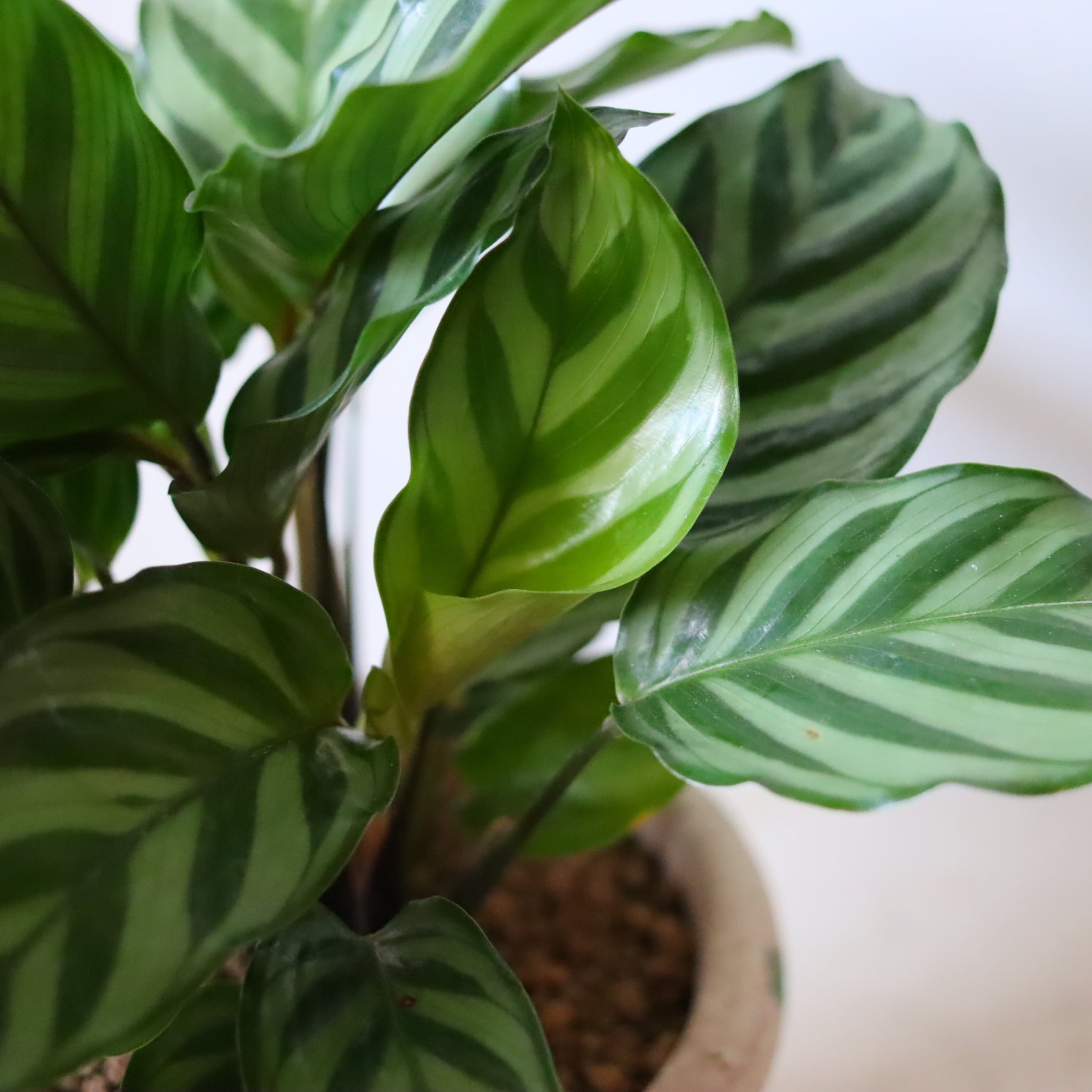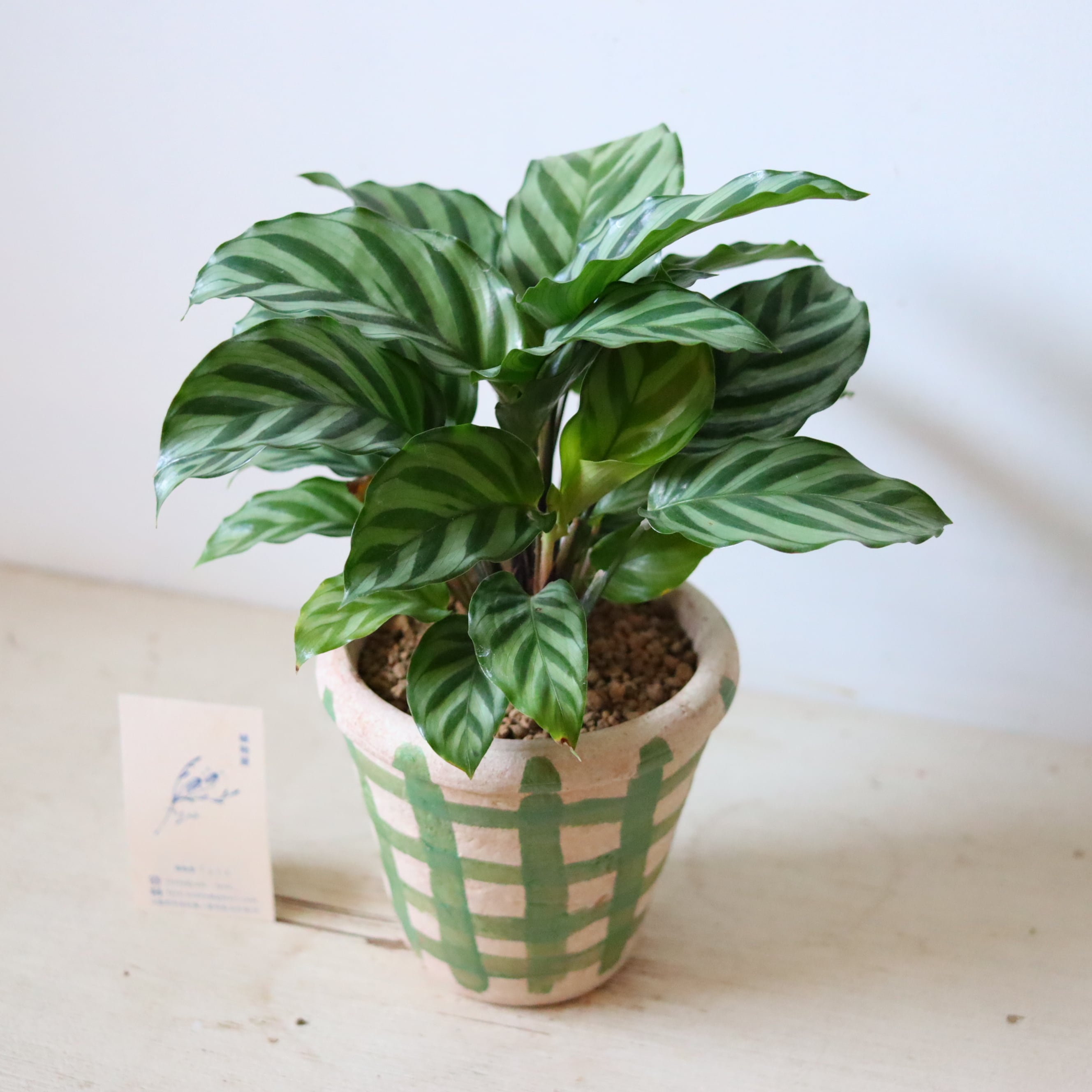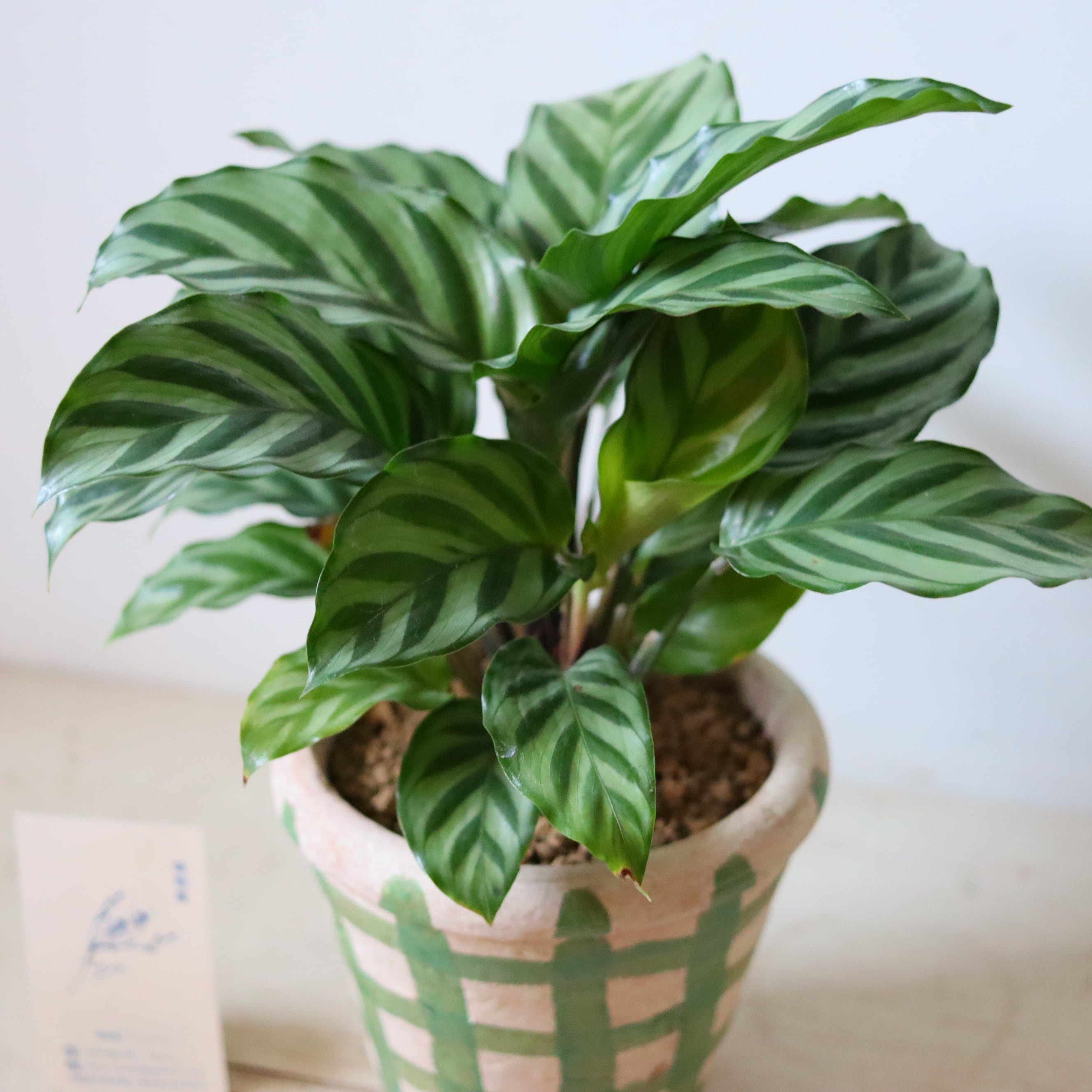 葉っぱの模様がユニークなカラテア。筆で描いたような葉っぱの模様、ほんとうに不思議です。お世話もしやすく、おすすめの植物です。