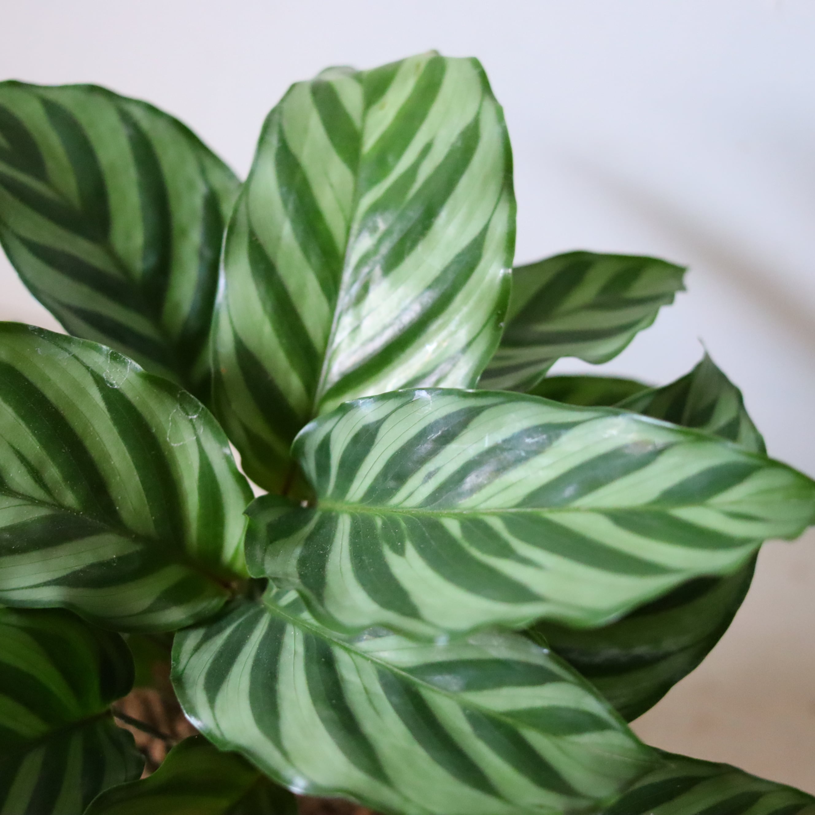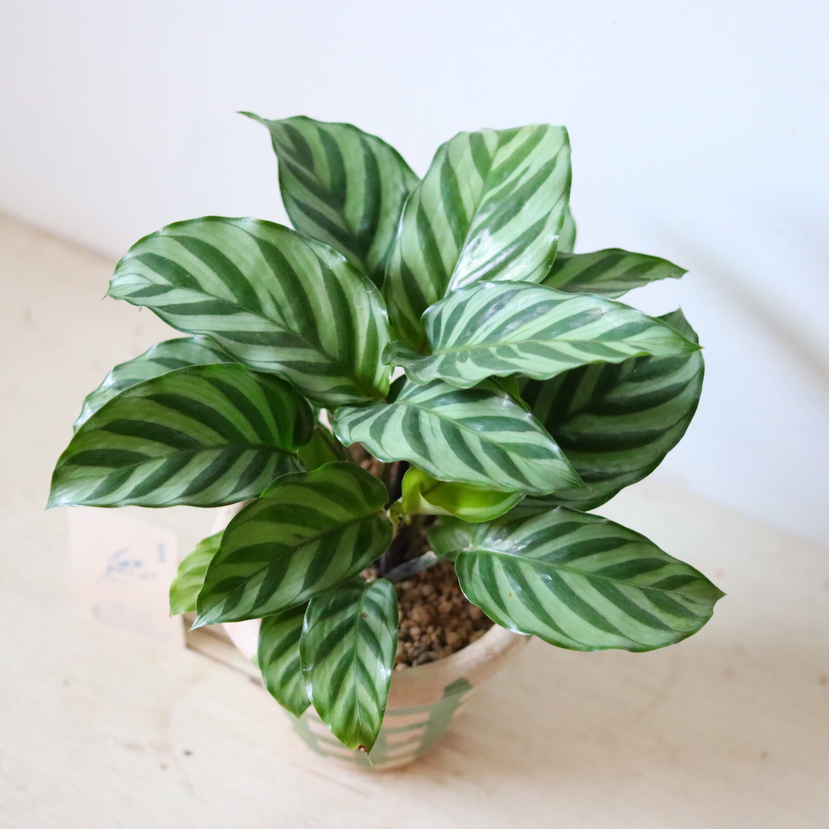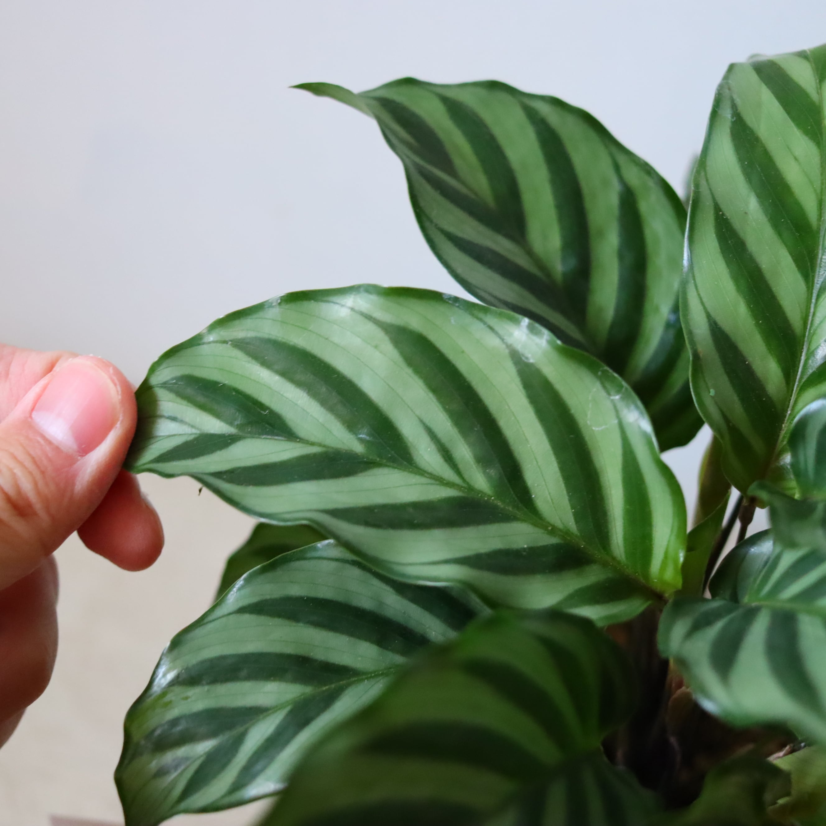 葉っぱの模様がユニークなカラテア。筆で描いたような葉っぱの模様、ほんとうに不思議です。お世話もしやすく、おすすめの植物です。
