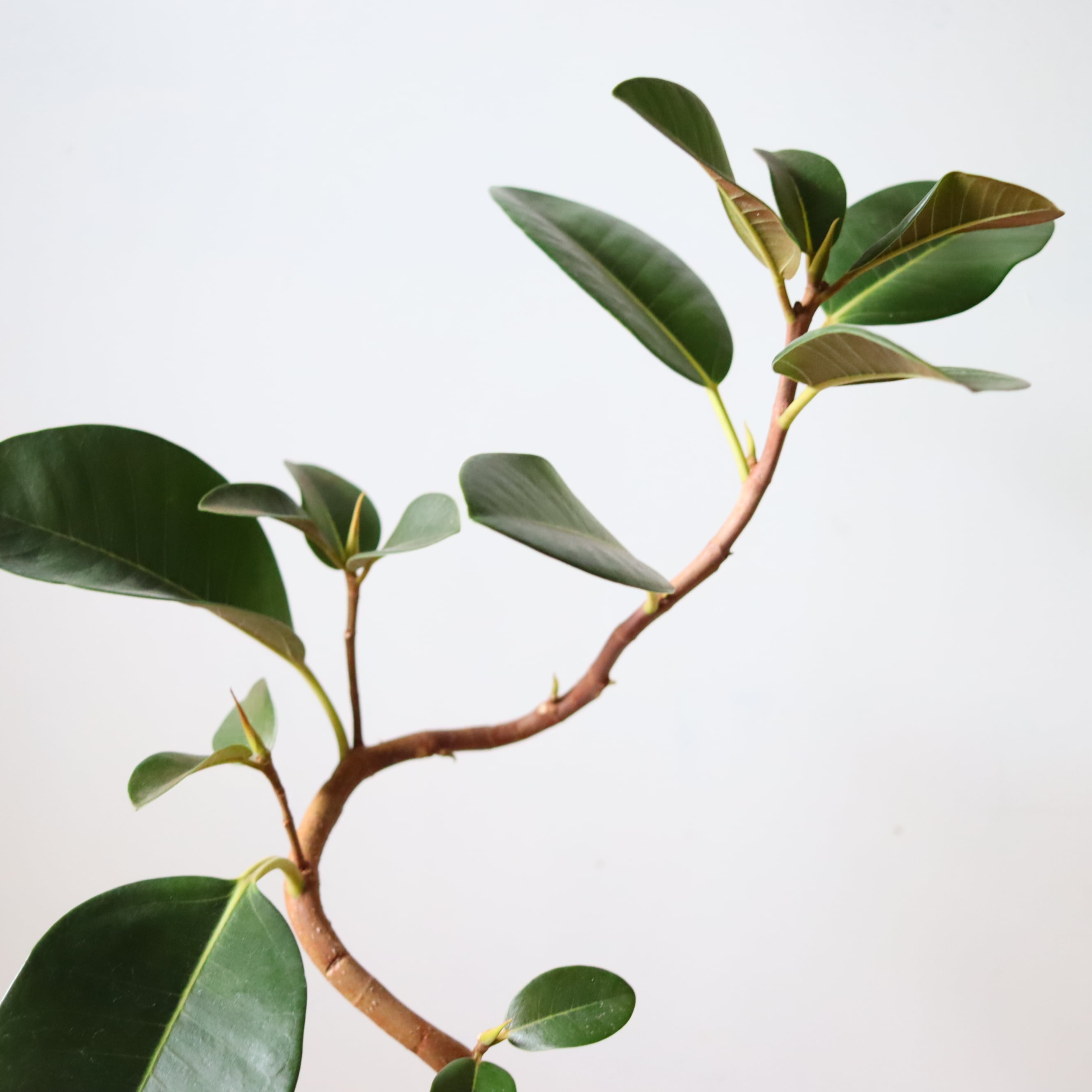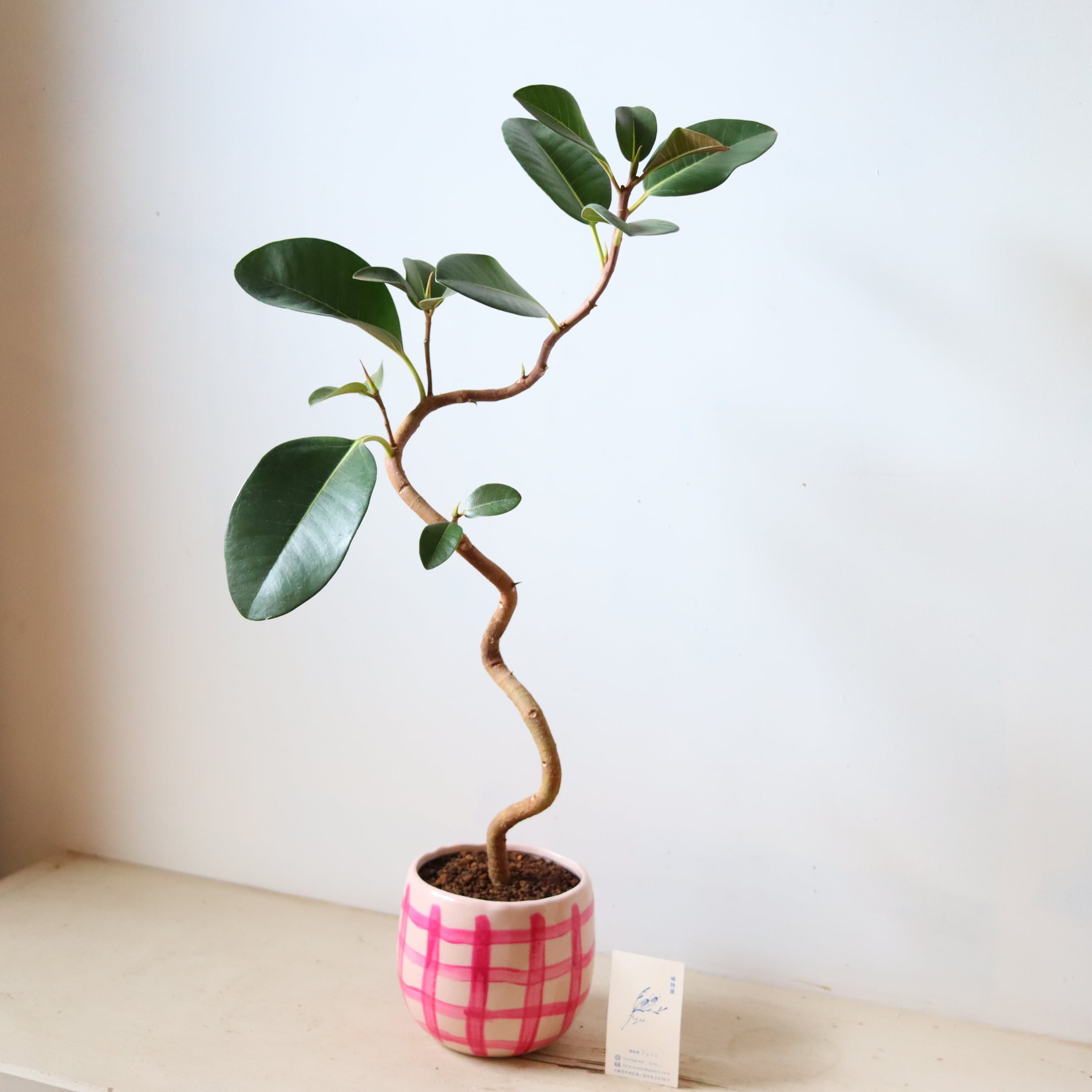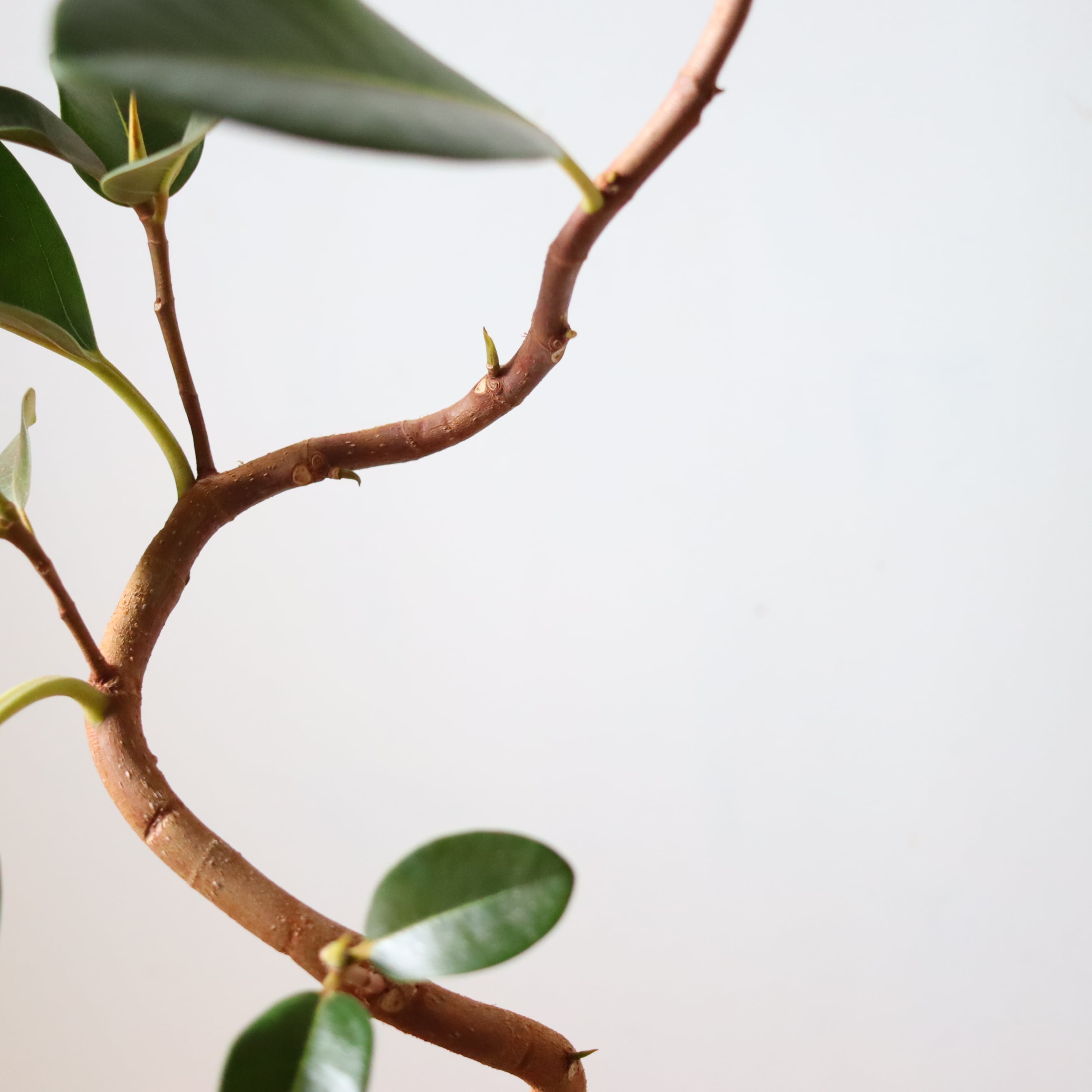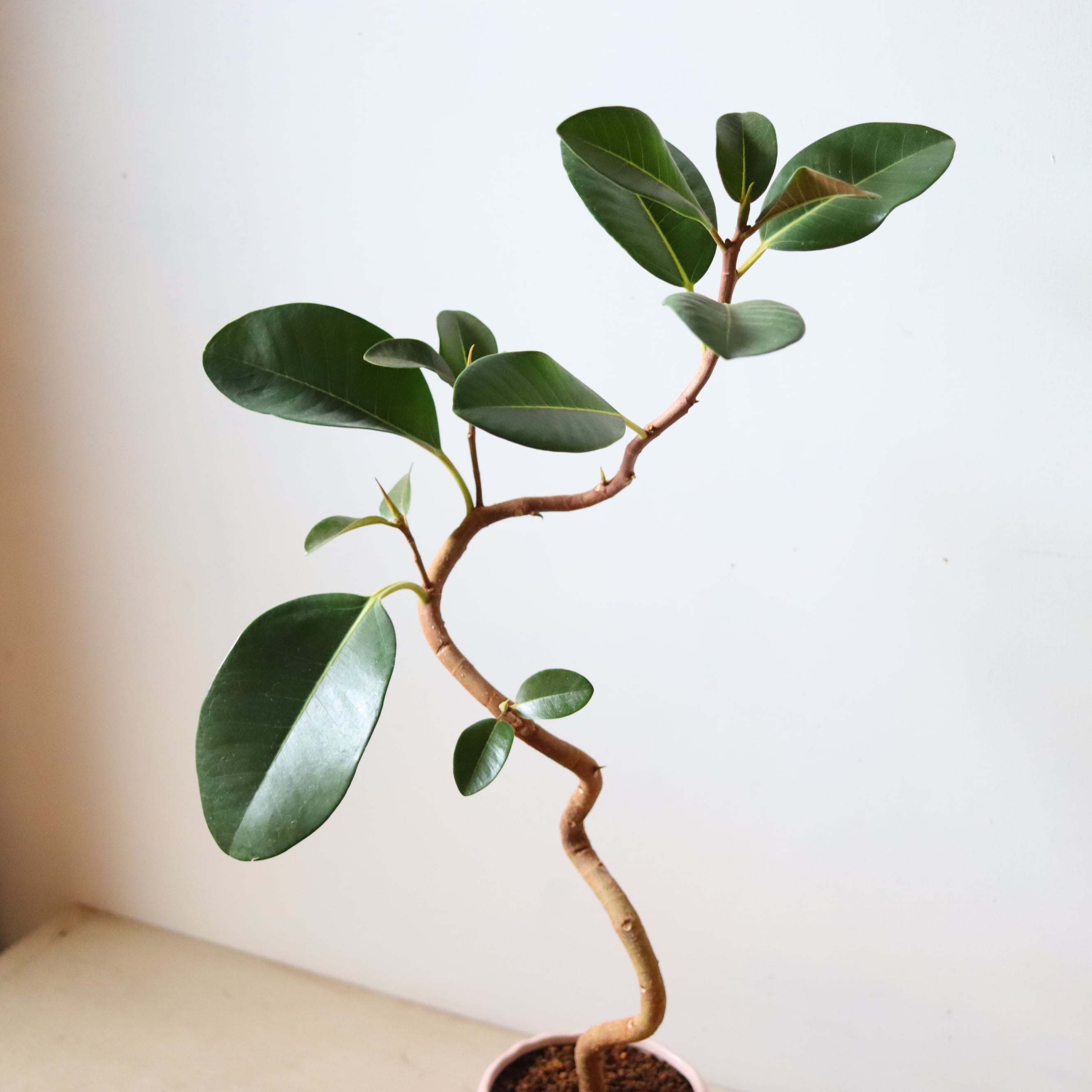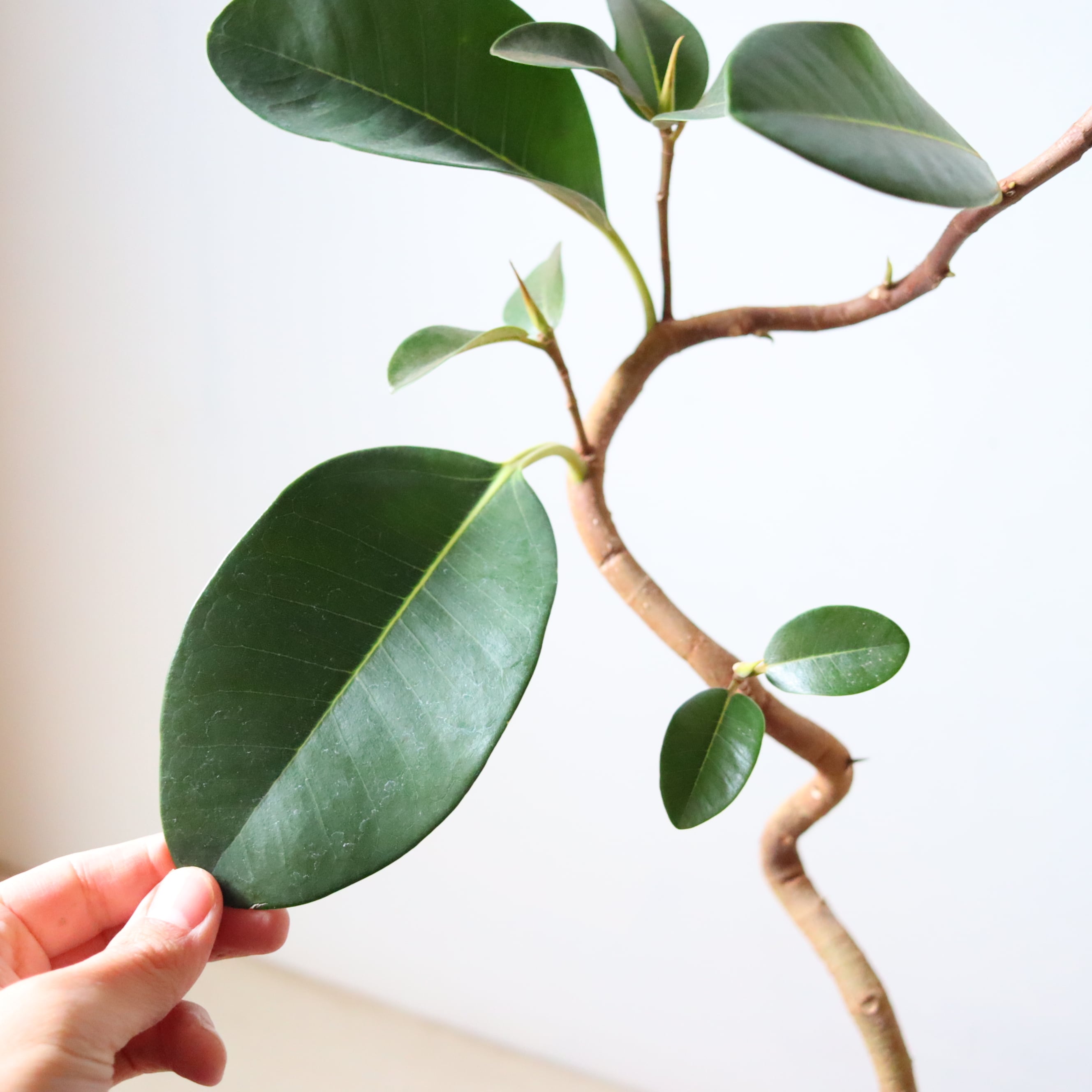 濃い緑の葉っぱがかわいい、ゴムの木です。しっかりと太い幹が曲がったシルエットが個性的でいい感じです。丈夫で育てやすく、お部屋のインテリアグリーンにおすすめの植物です。