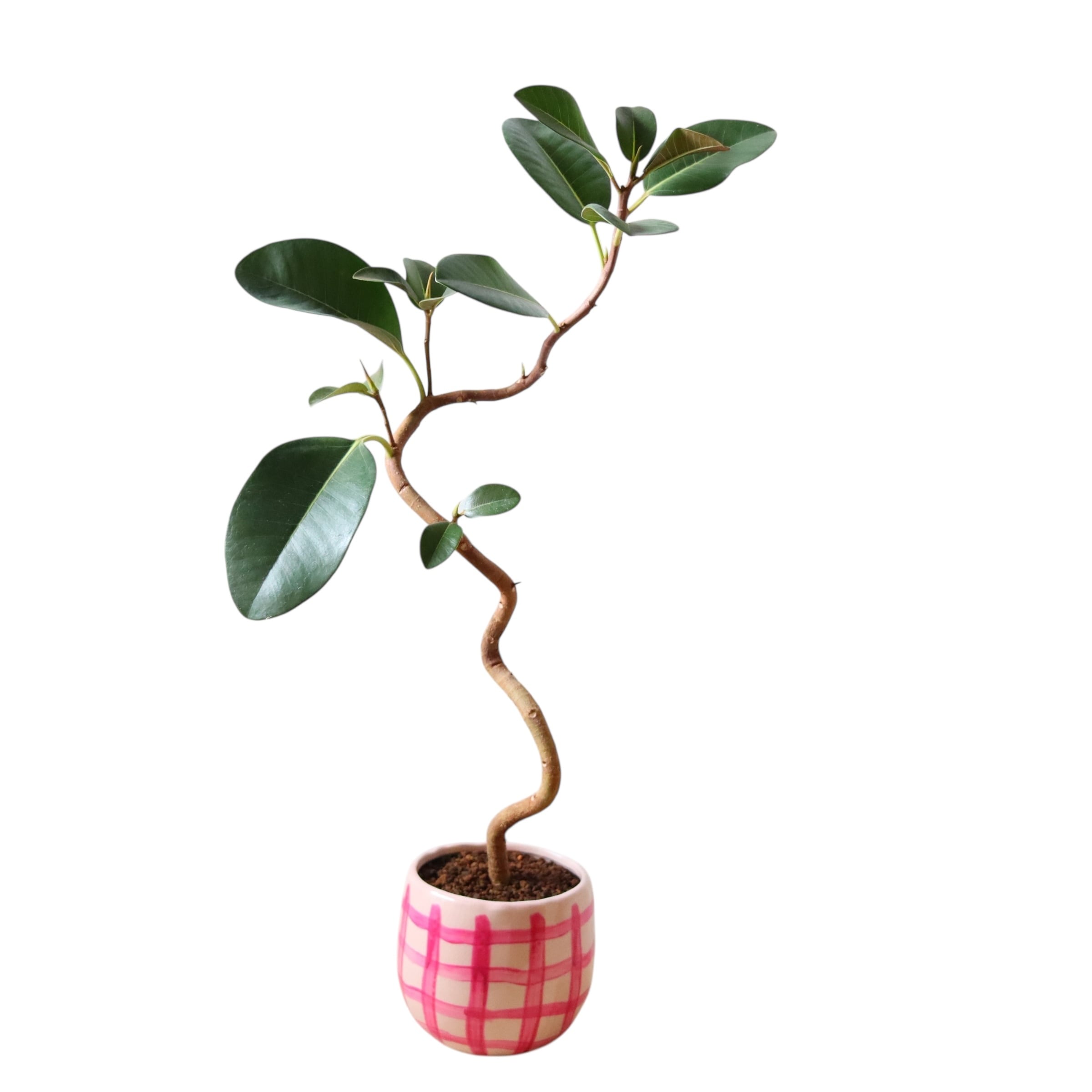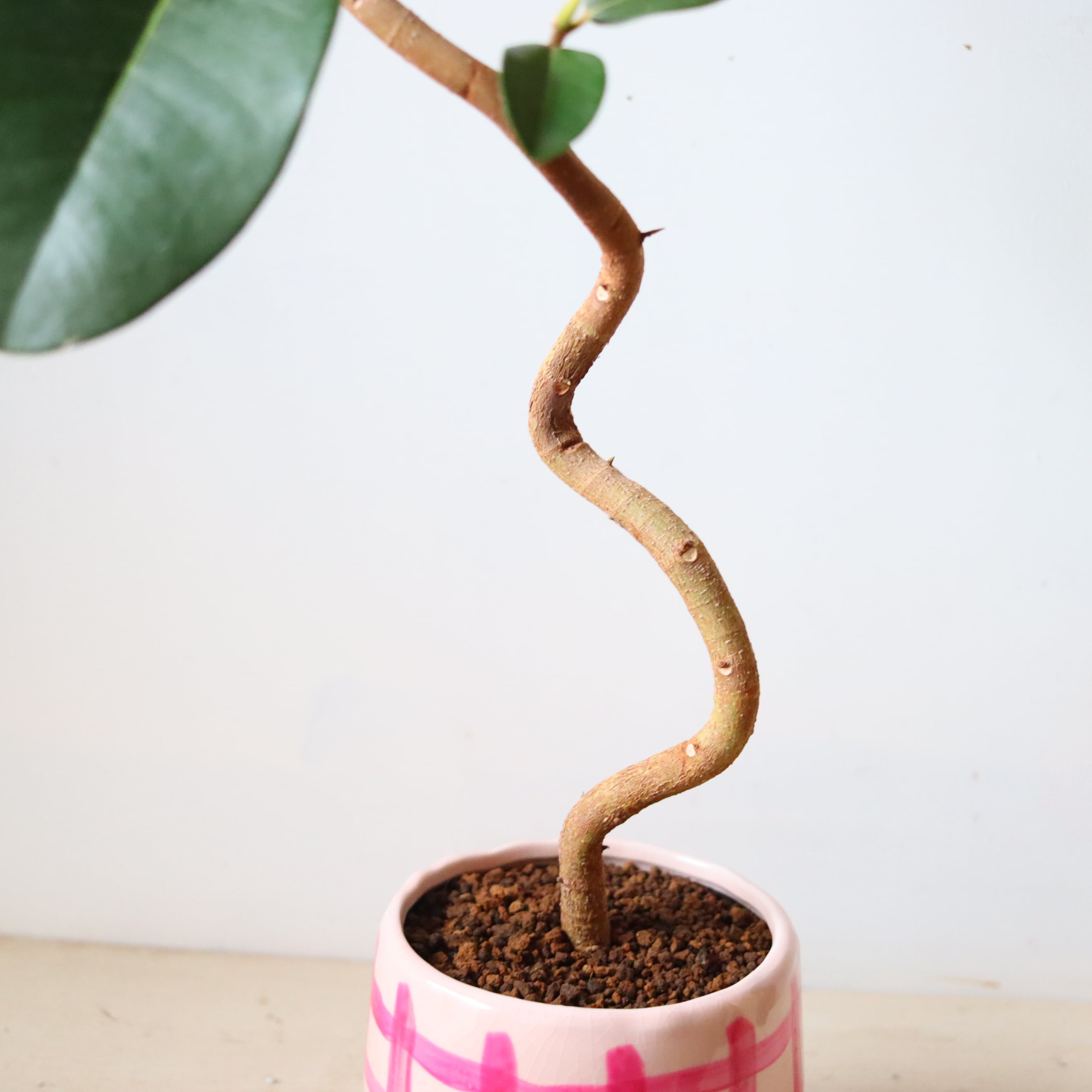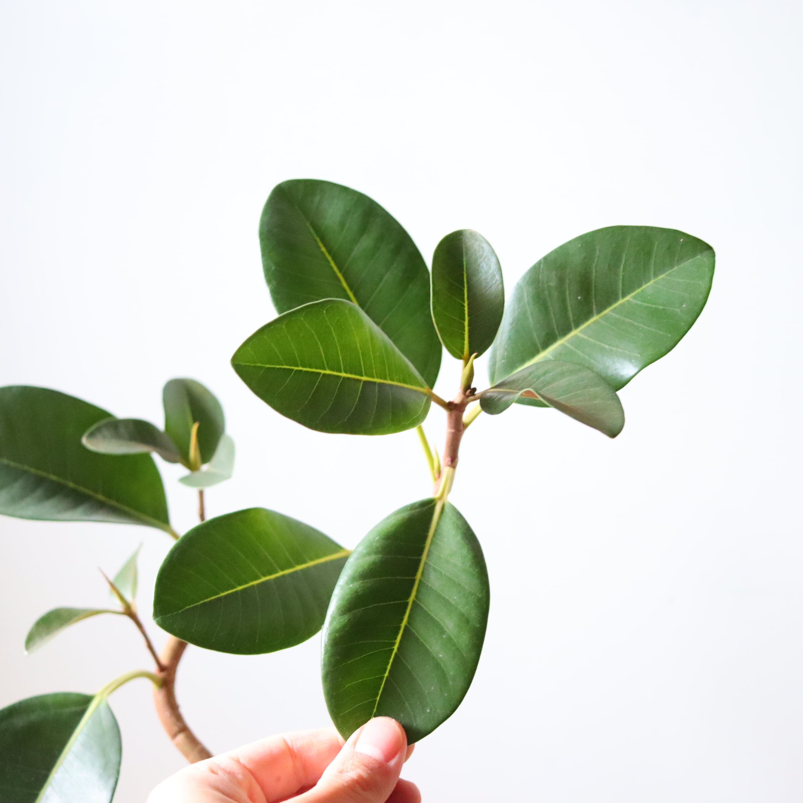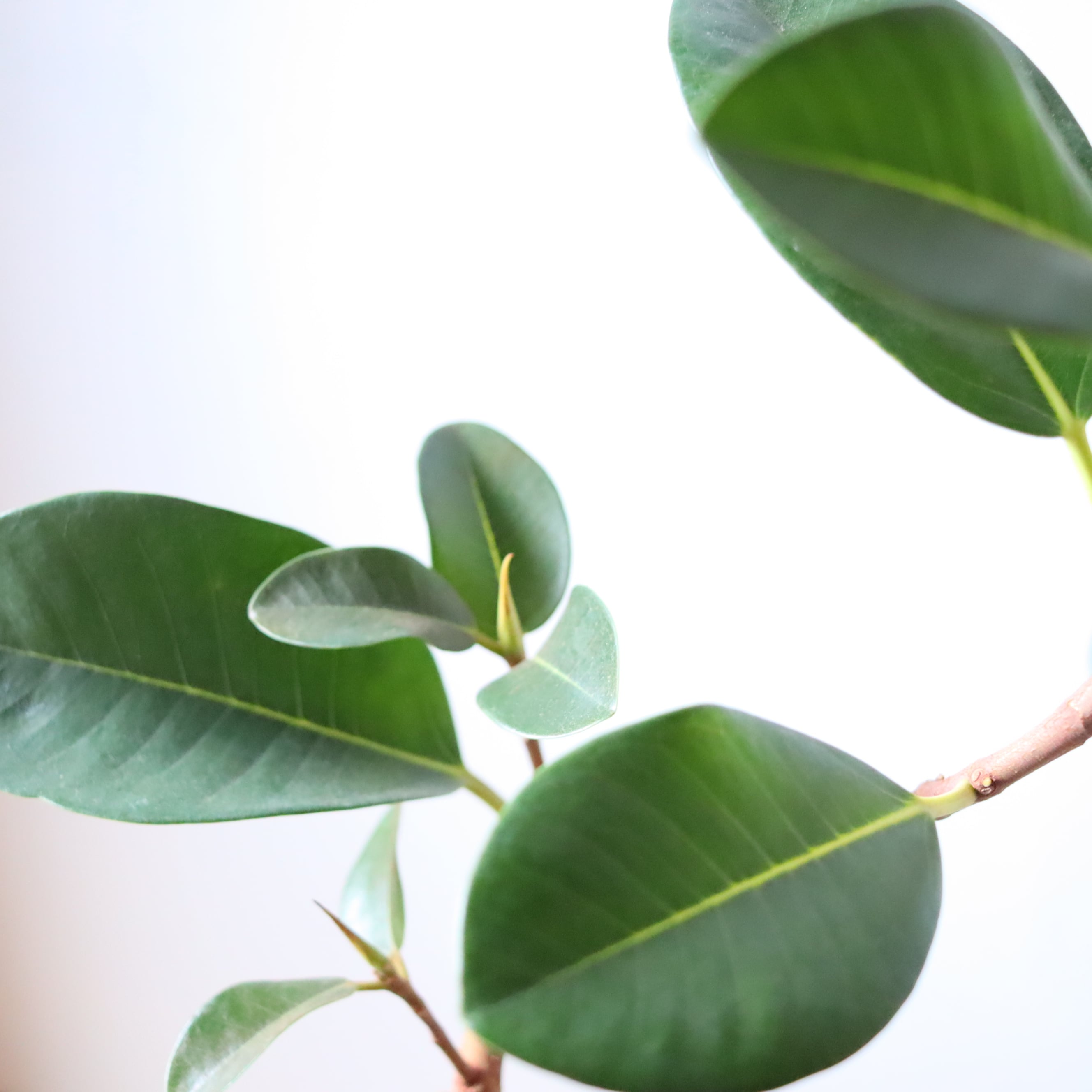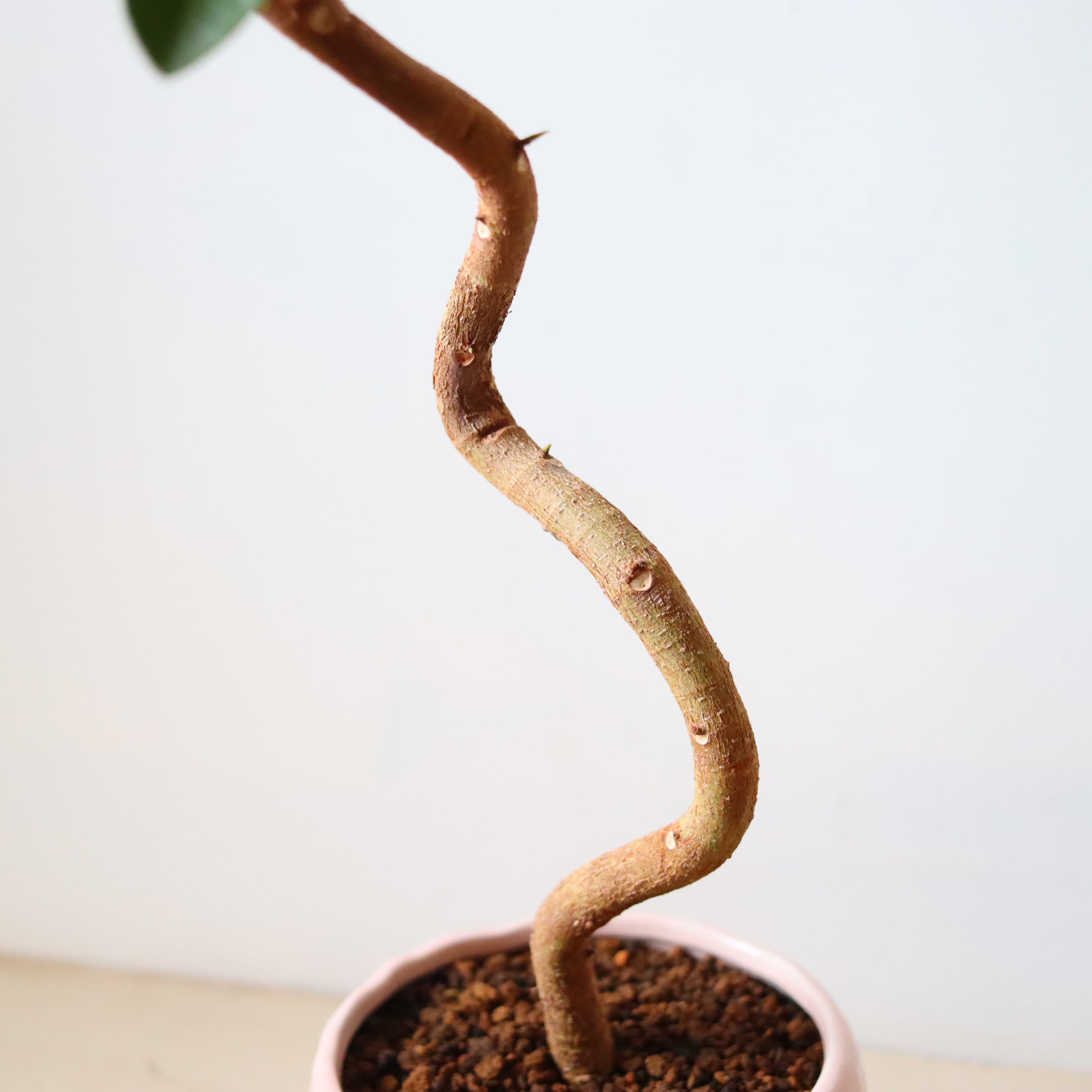 濃い緑の葉っぱがかわいい、ゴムの木です。しっかりと太い幹が曲がったシルエットが個性的でいい感じです。丈夫で育てやすく、お部屋のインテリアグリーンにおすすめの植物です。