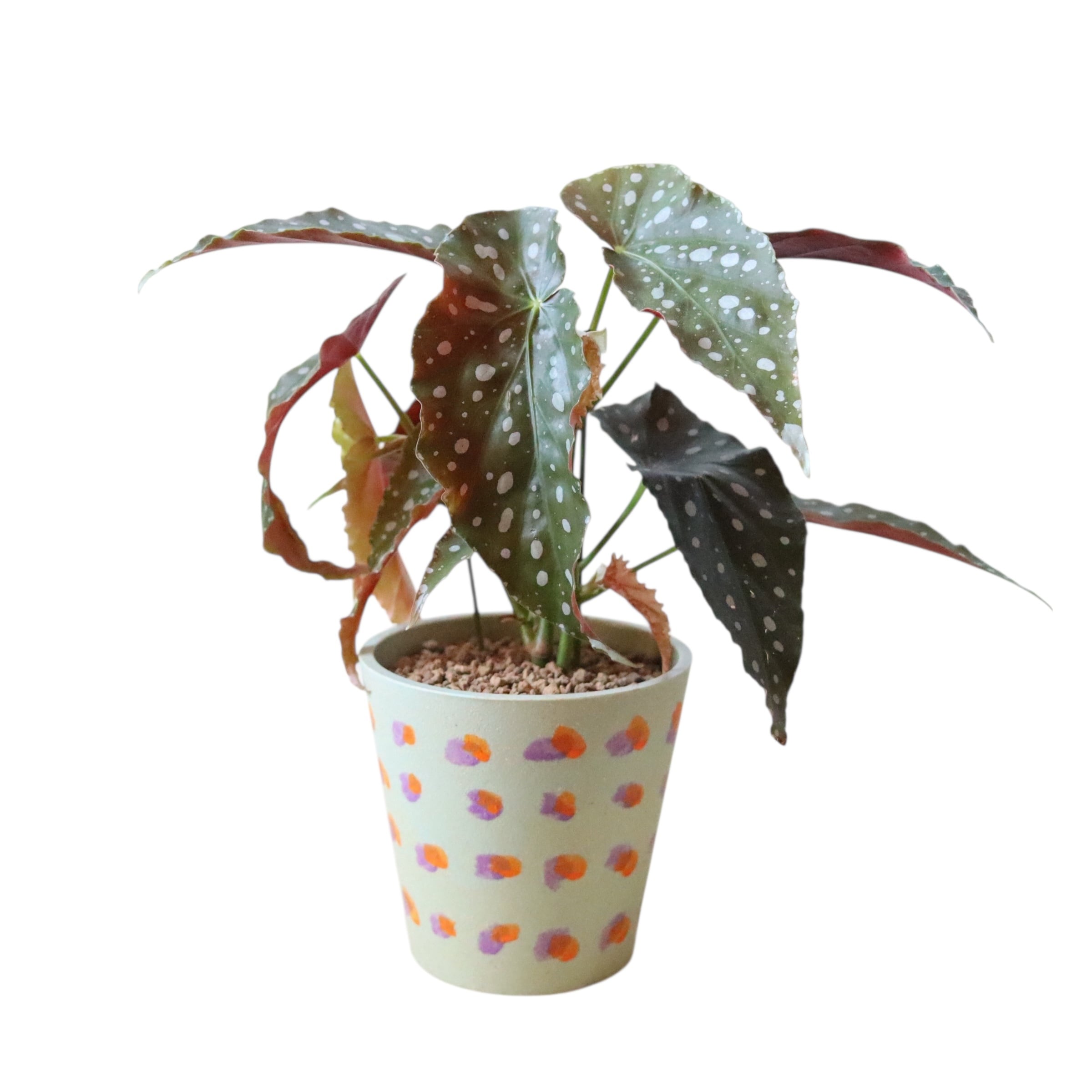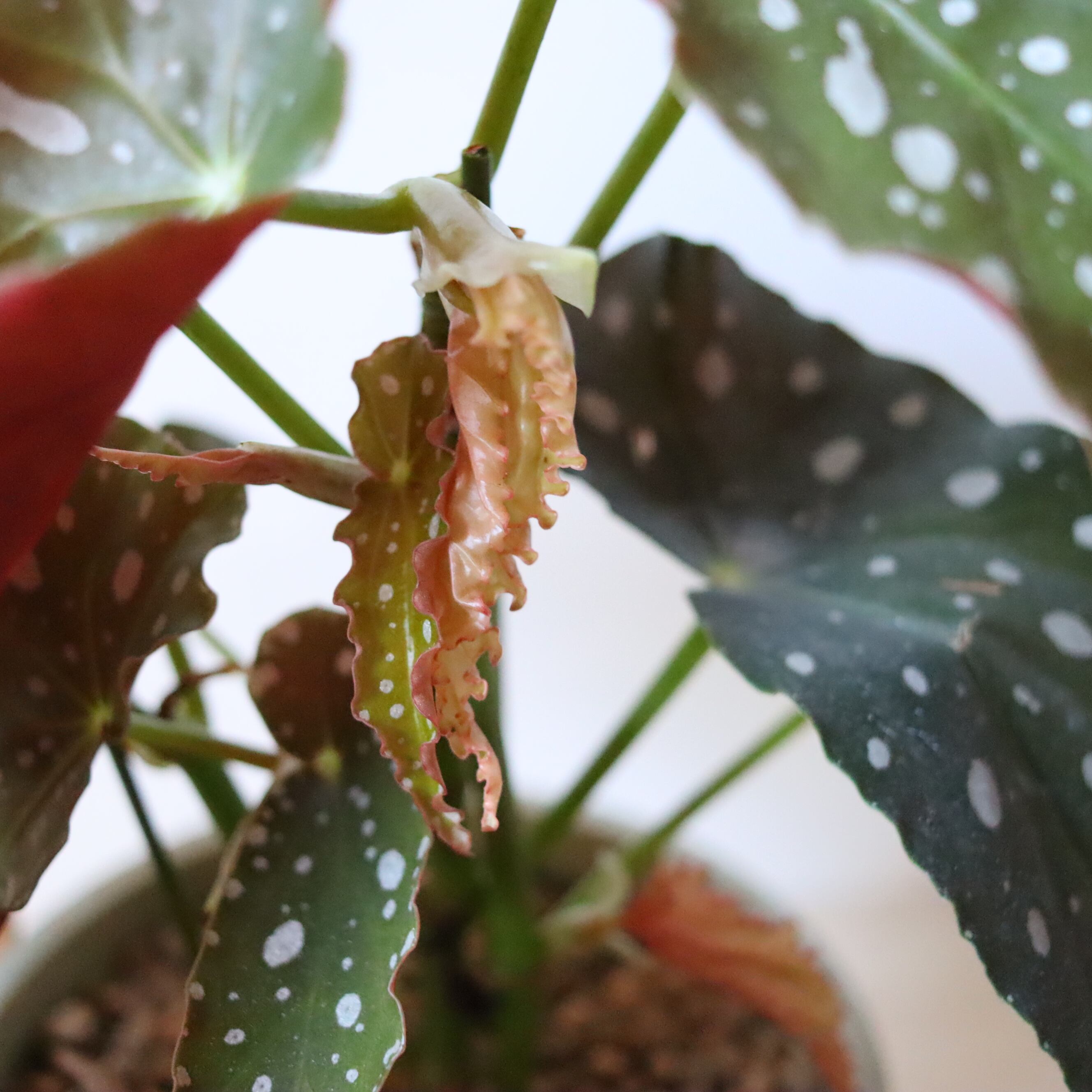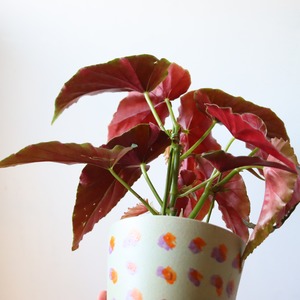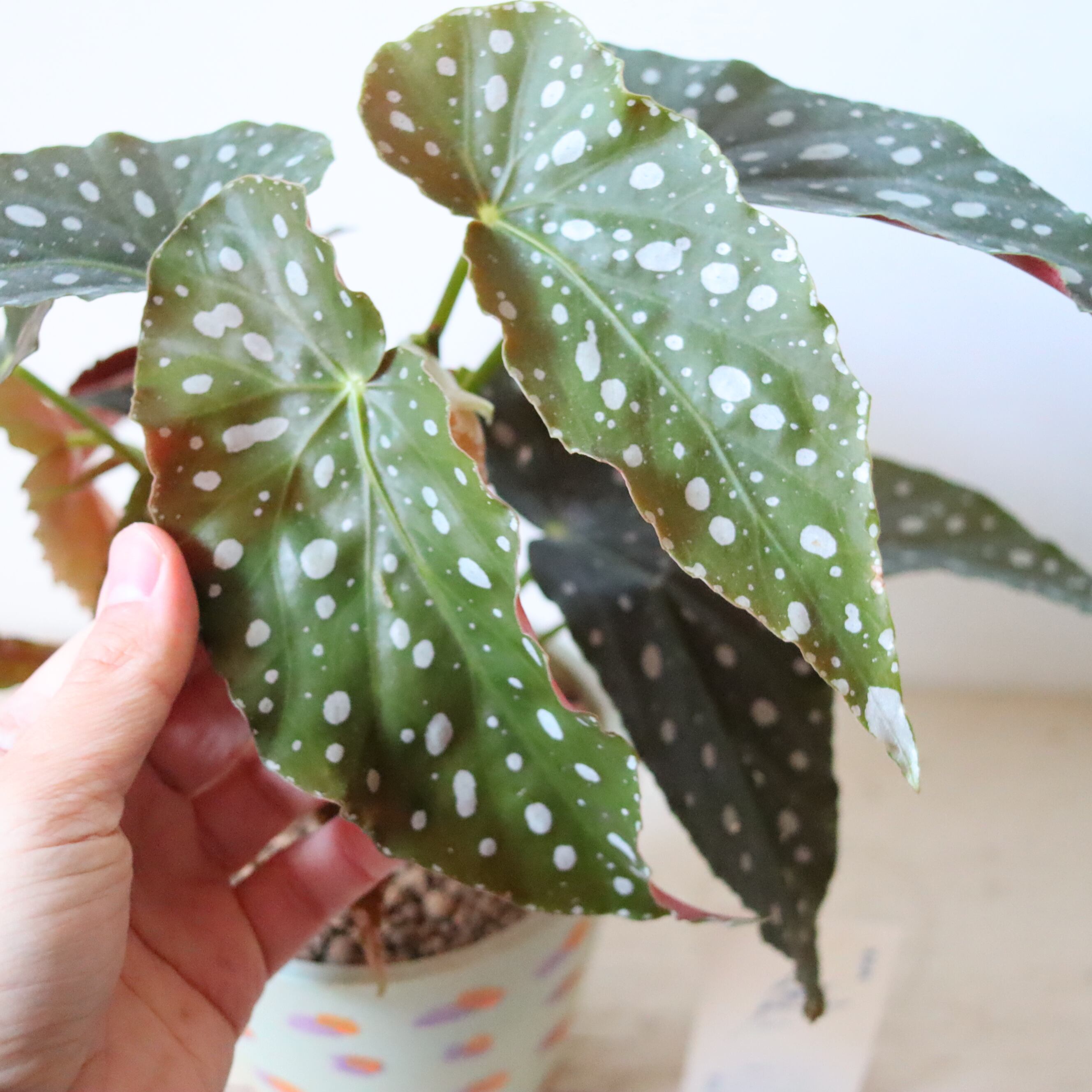 ドット柄の葉っぱ、裏側は真っ赤、なんだかヤバそうな植物です。大人気のベゴニア、存在感のあるインテリアグリーンにいかがでしょうか?白くてかわいいお花も咲かせます。すごく丈夫で育てやすくおすすめの植物です。