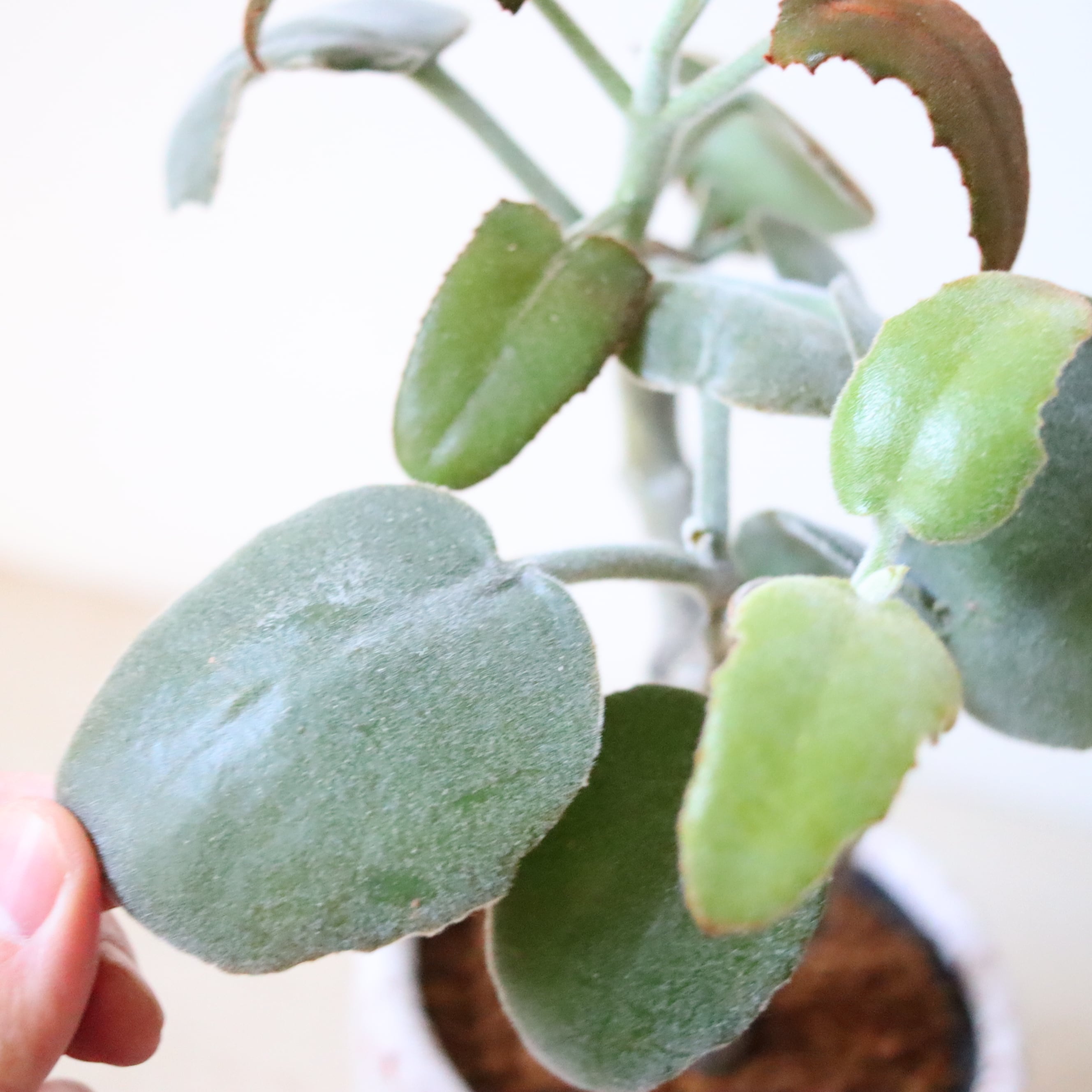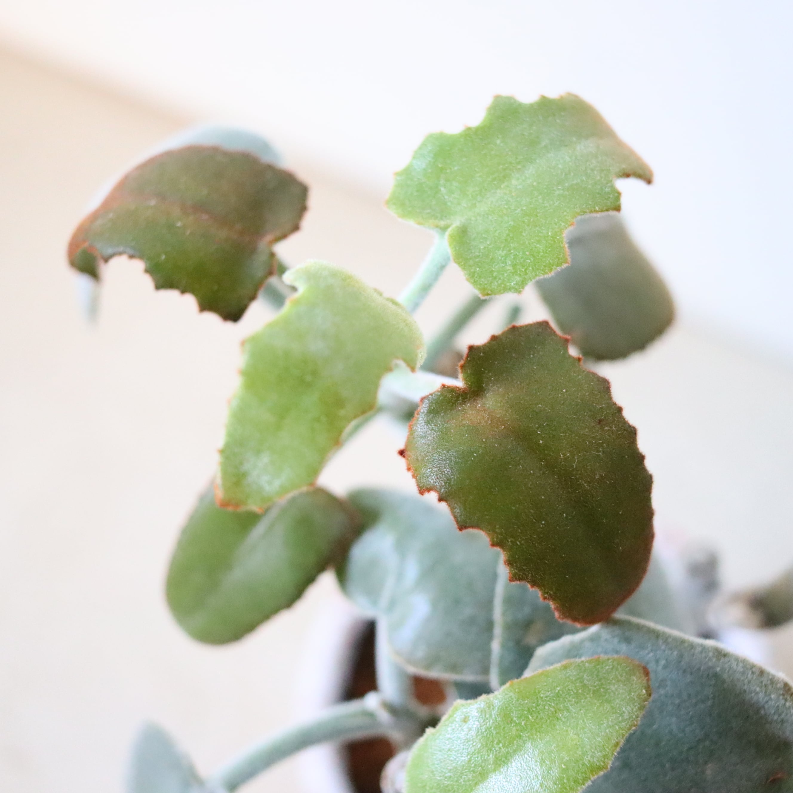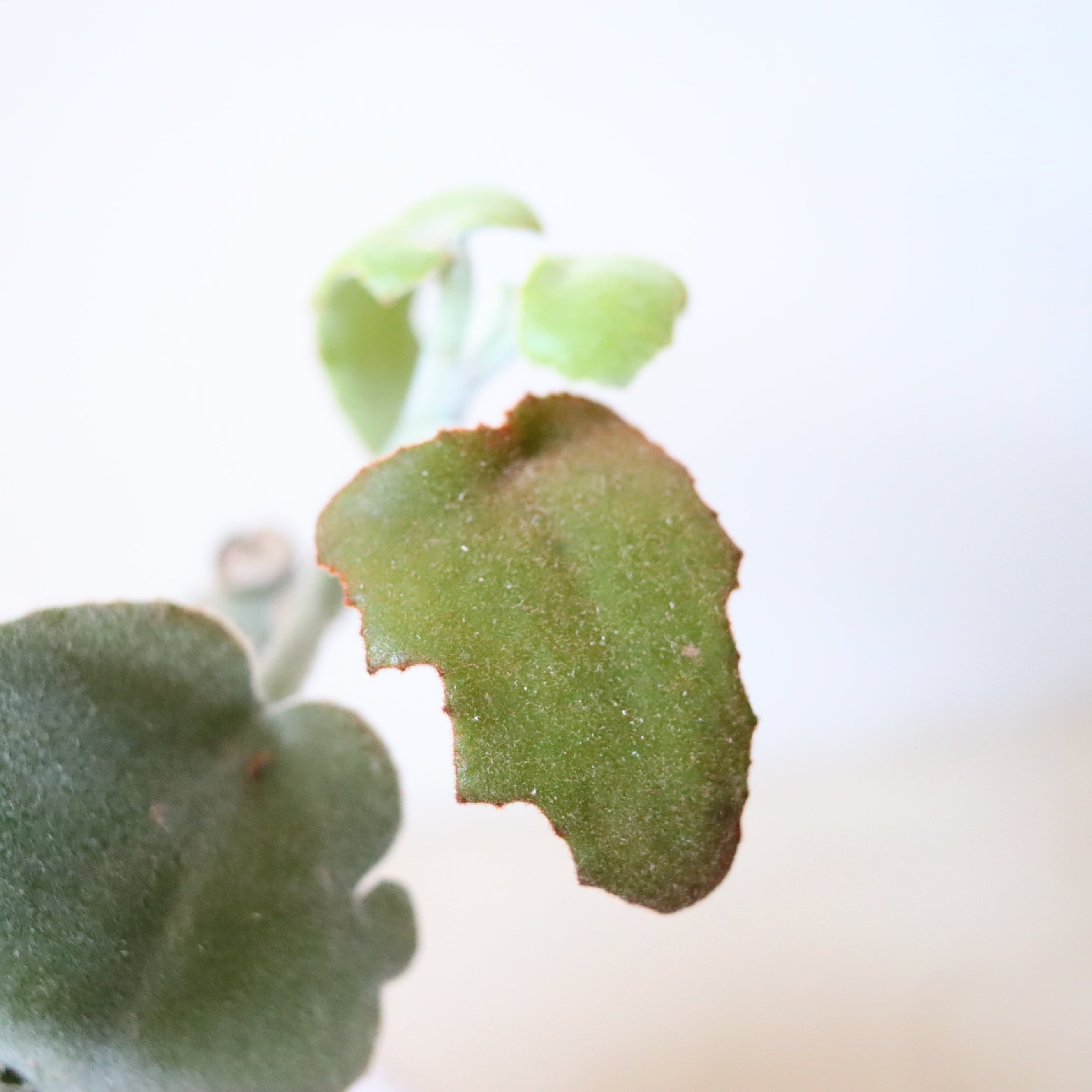 かっこいいカランコエ。しっかりと幹立ちするシルエット、葉っぱの形、厚み、毛がびっしり生えた質感。個性的で素晴らしいデザインの多肉植物です。“葉挿し”という方法で簡単に増やしていくこともできます。