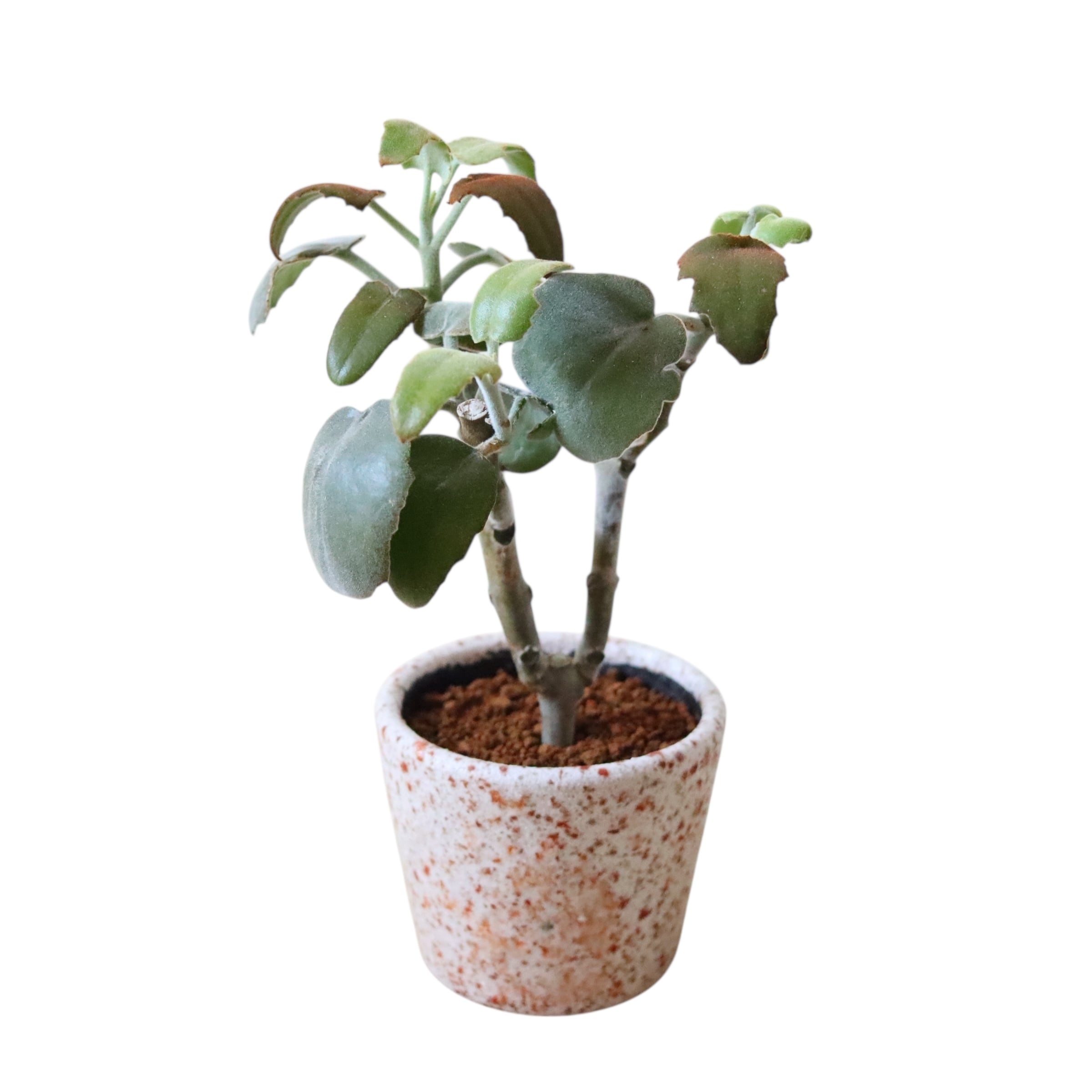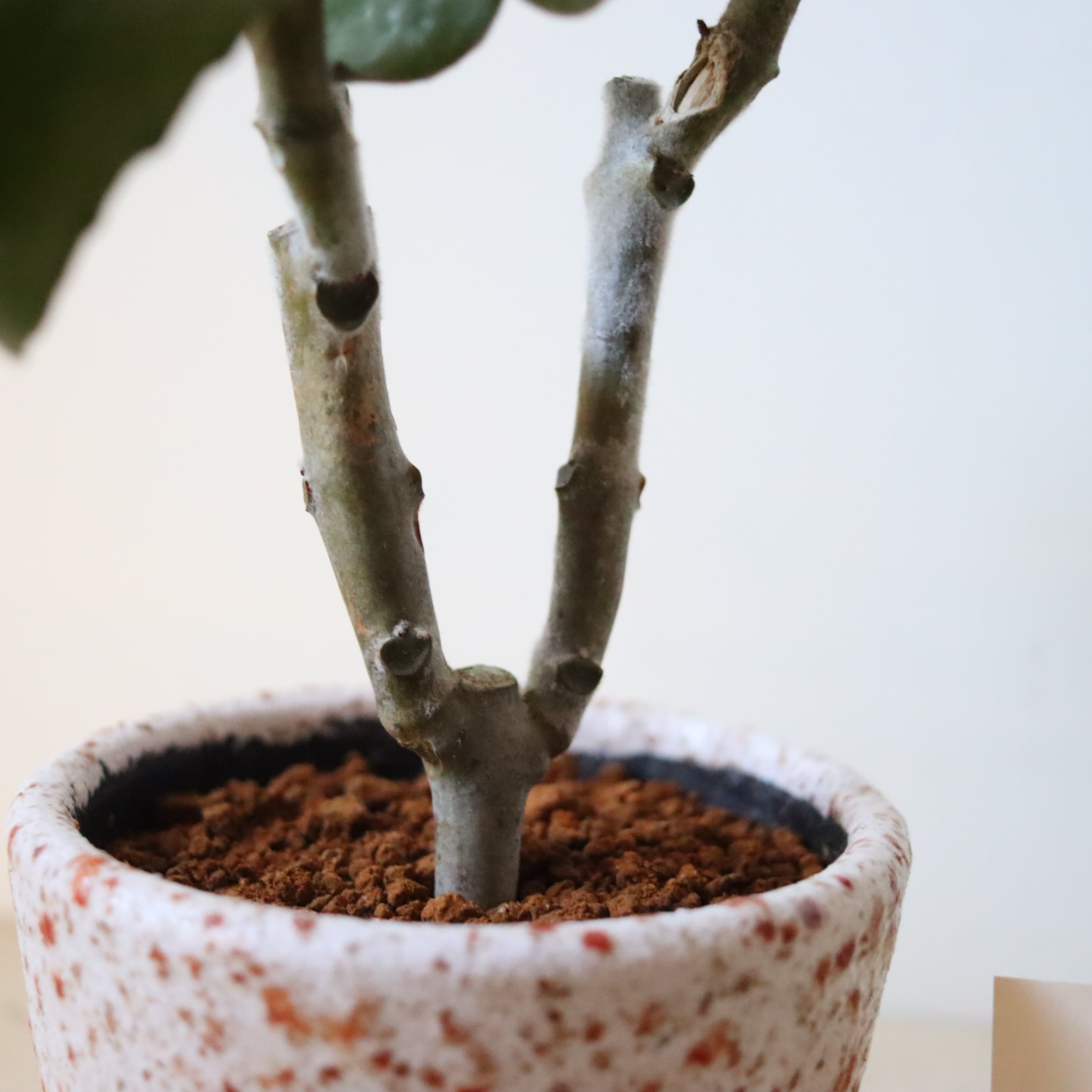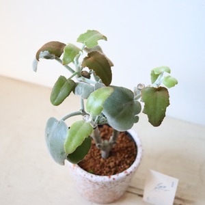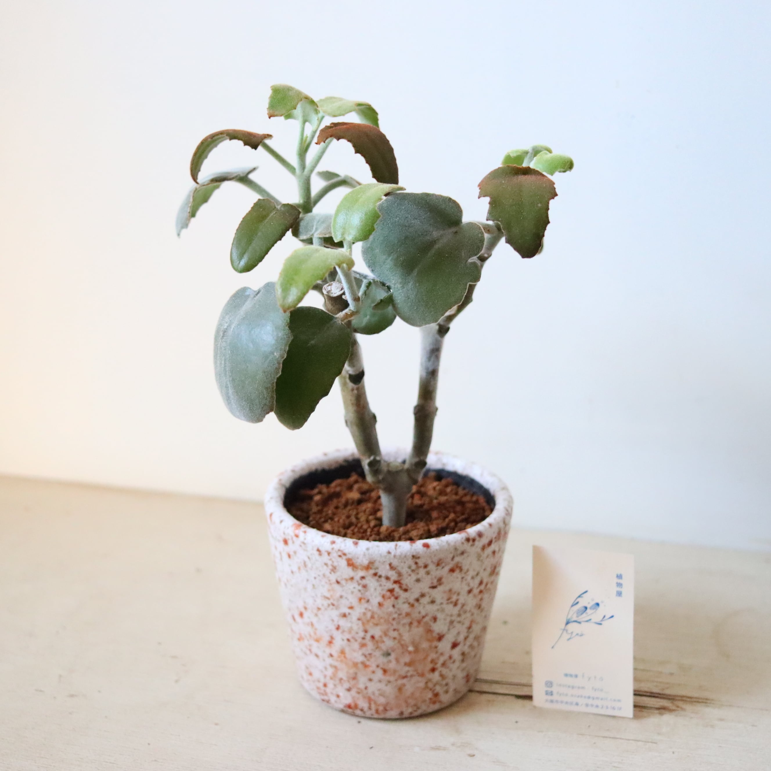 かっこいいカランコエ。しっかりと幹立ちするシルエット、葉っぱの形、厚み、毛がびっしり生えた質感。個性的で素晴らしいデザインの多肉植物です。“葉挿し”という方法で簡単に増やしていくこともできます。