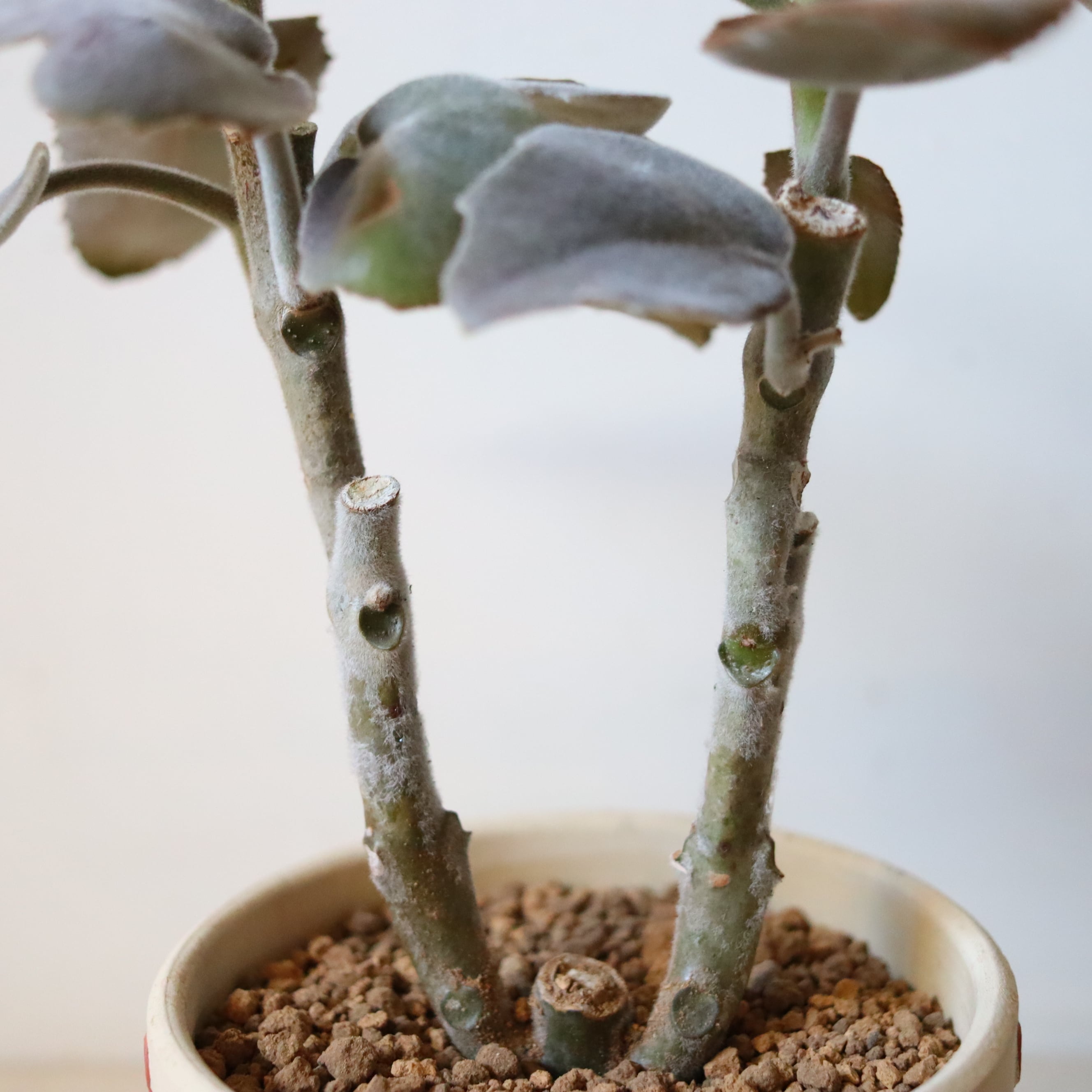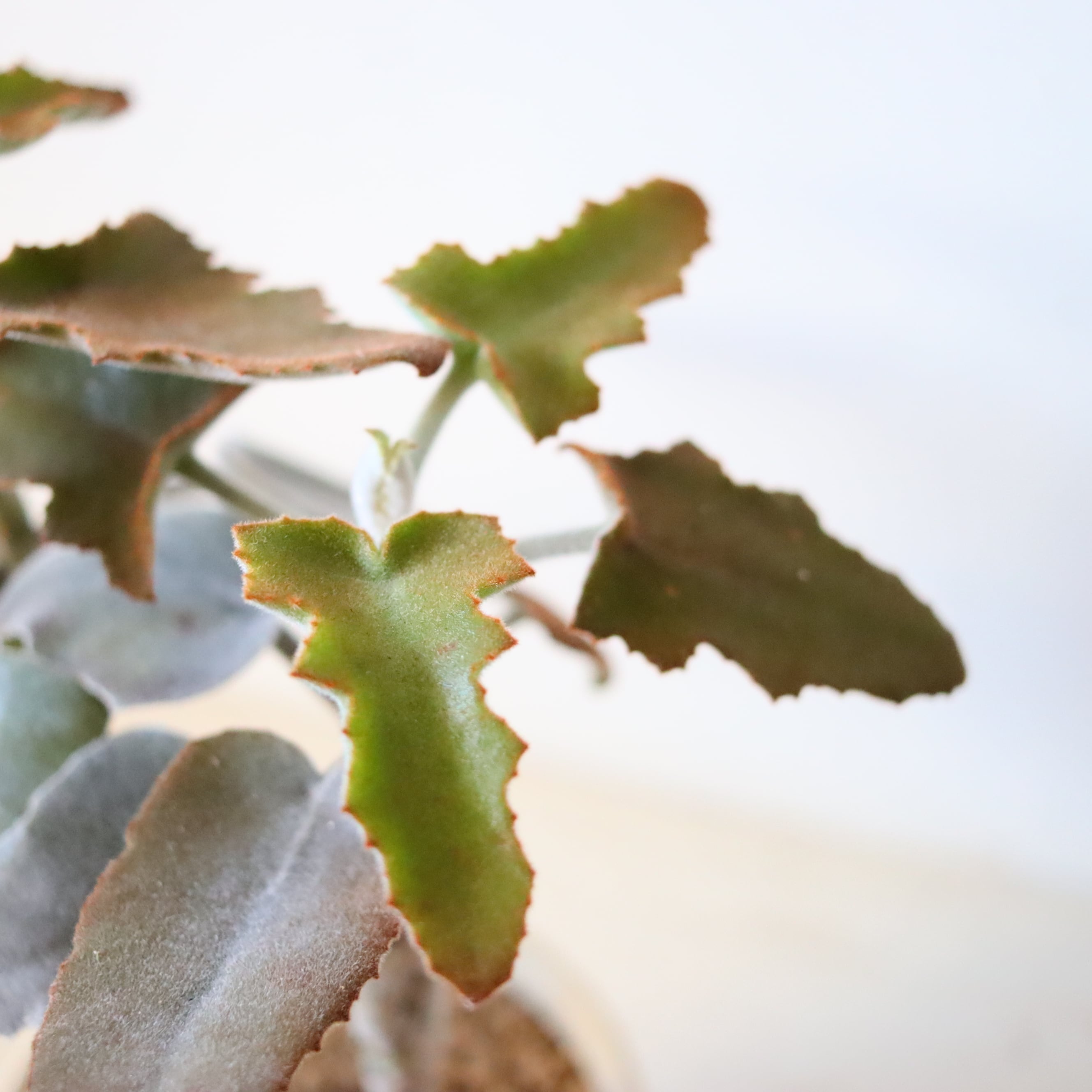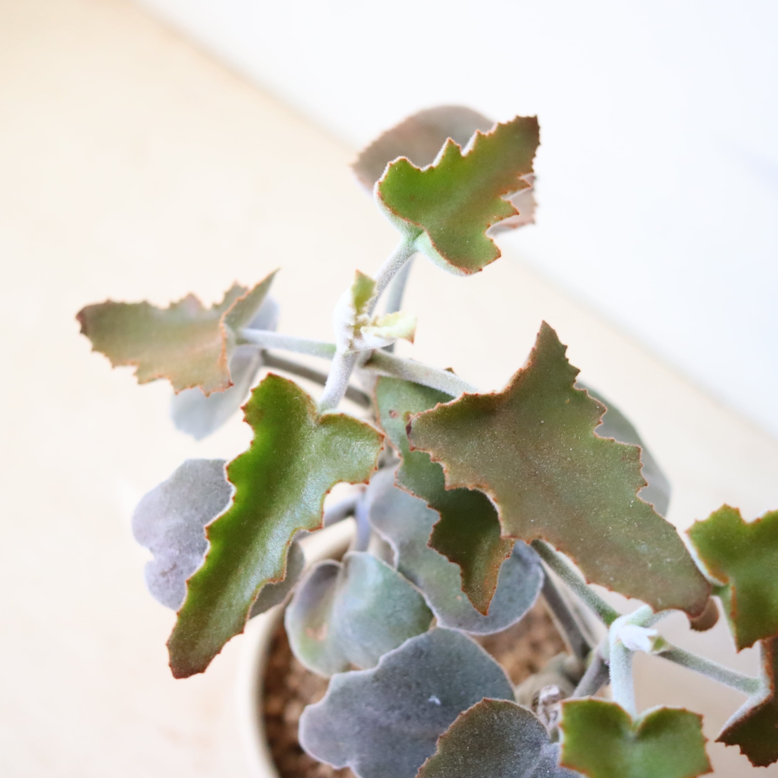 かっこいいカランコエ。しっかりと幹立ちするシルエット、葉っぱの形、厚み、毛がびっしり生えた質感。個性的で素晴らしいデザインの多肉植物です。“葉挿し”という方法で簡単に増やしていくこともできます。