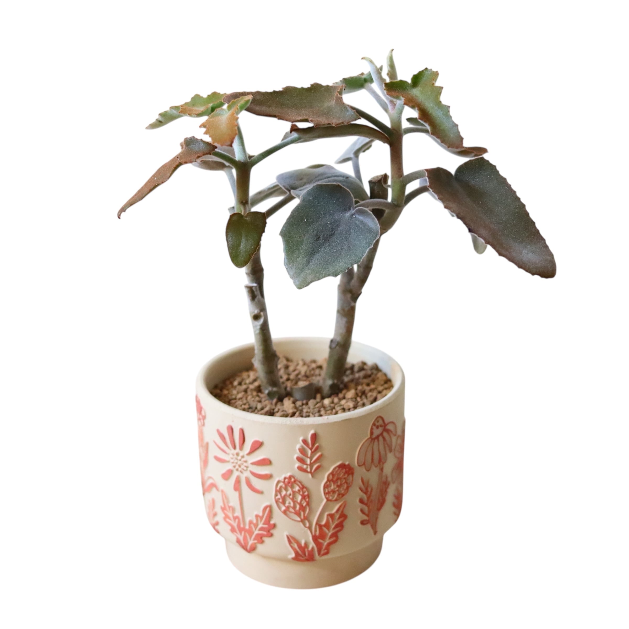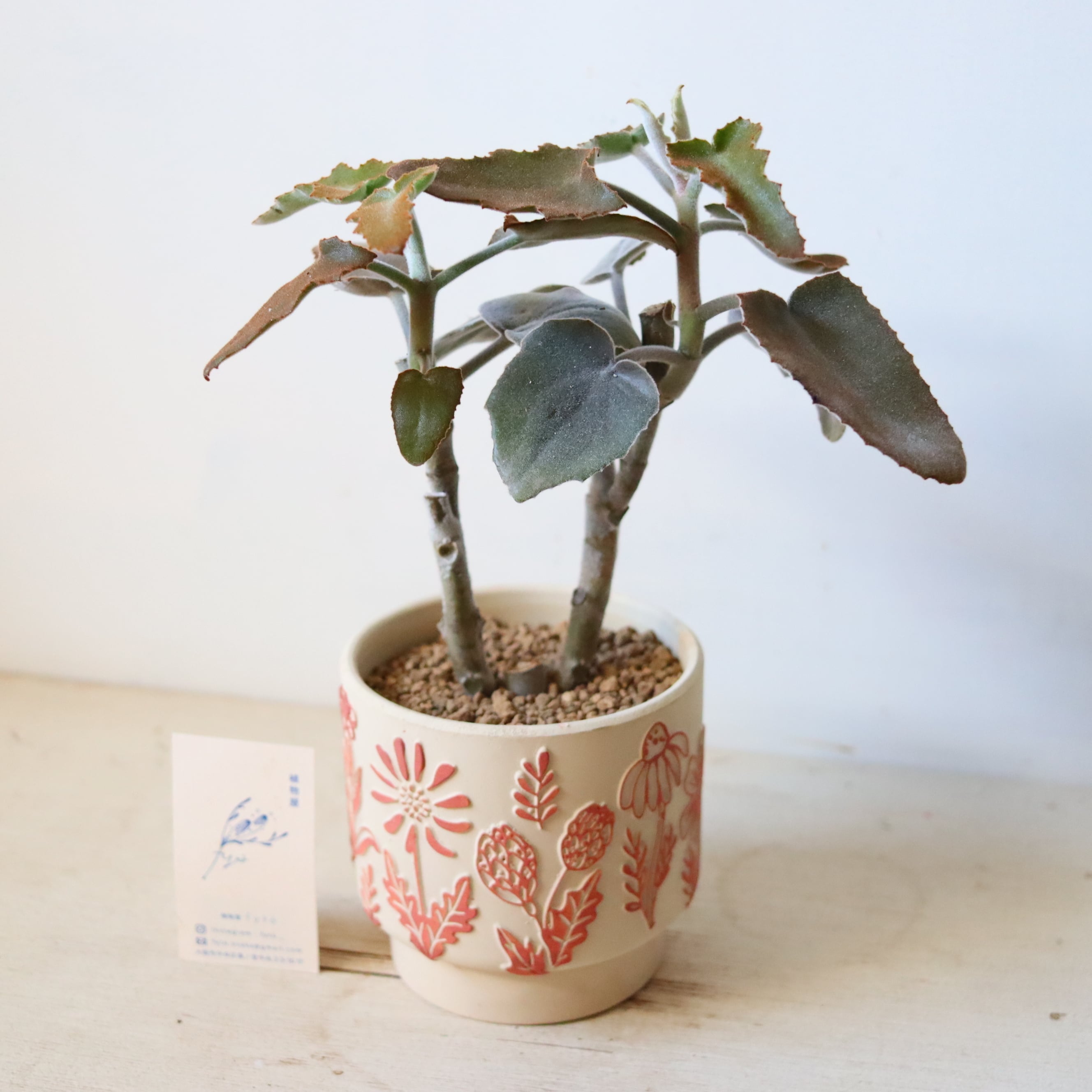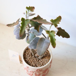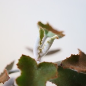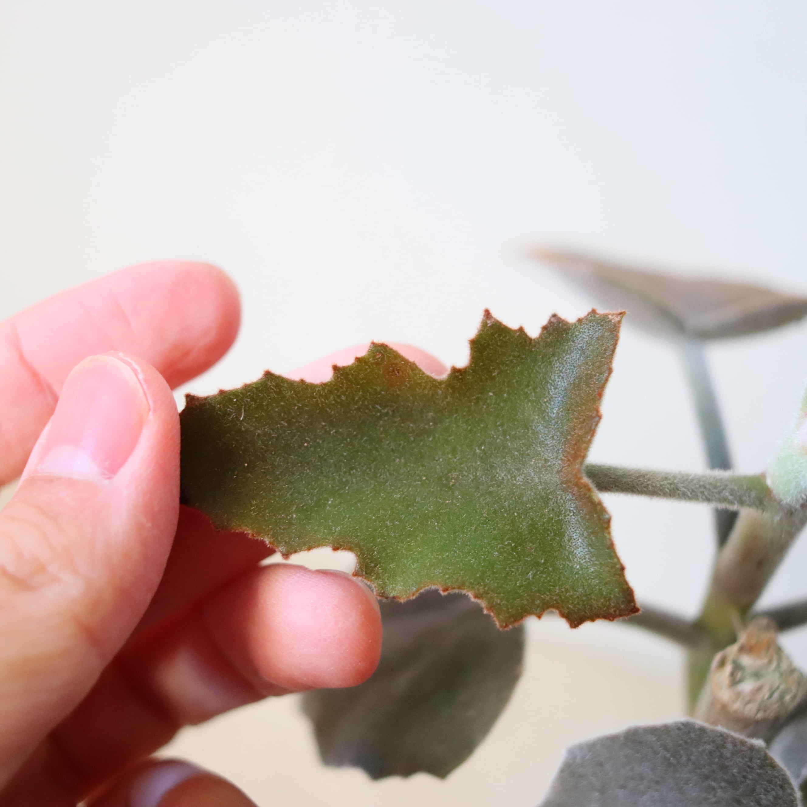かっこいいカランコエ。しっかりと幹立ちするシルエット、葉っぱの形、厚み、毛がびっしり生えた質感。個性的で素晴らしいデザインの多肉植物です。“葉挿し”という方法で簡単に増やしていくこともできます。