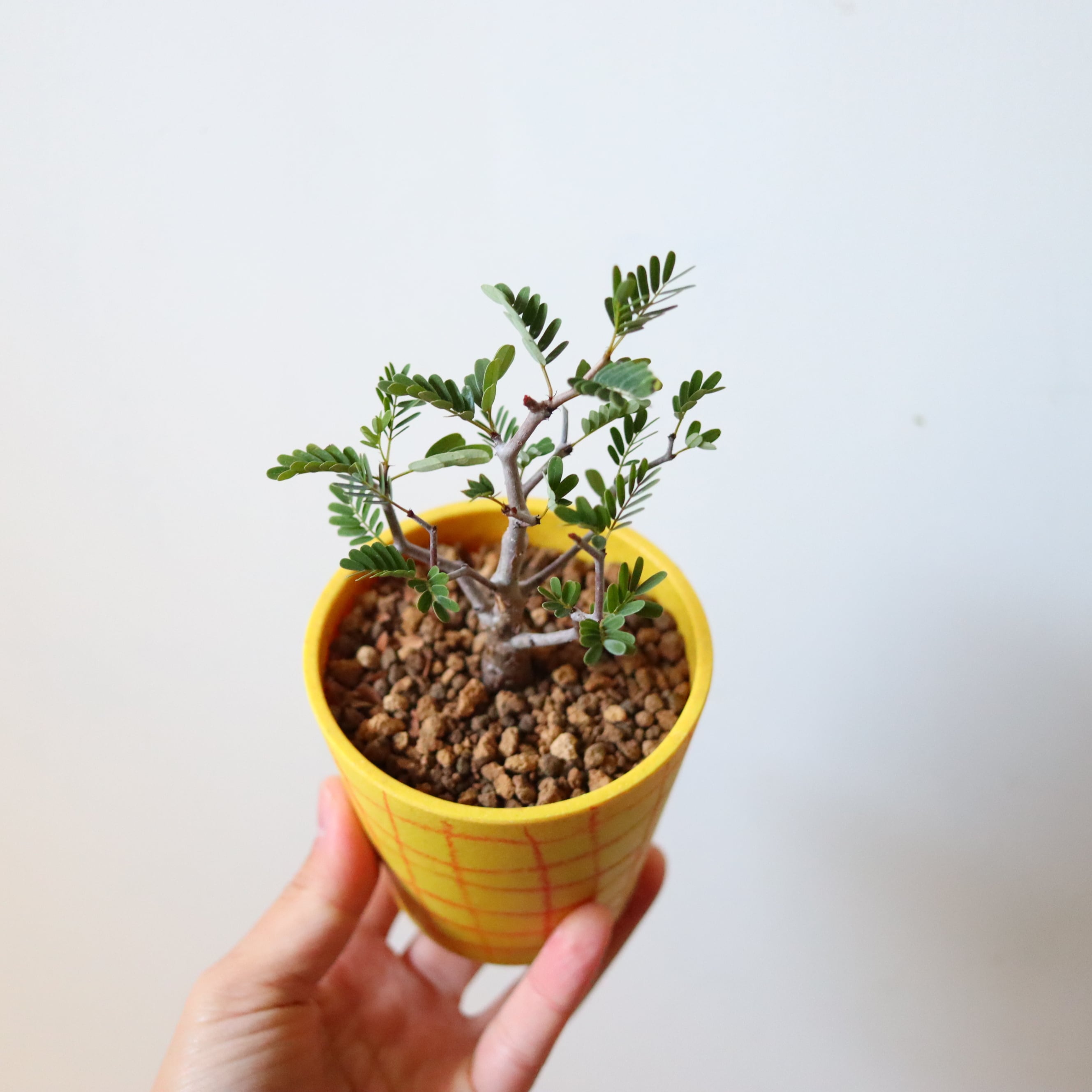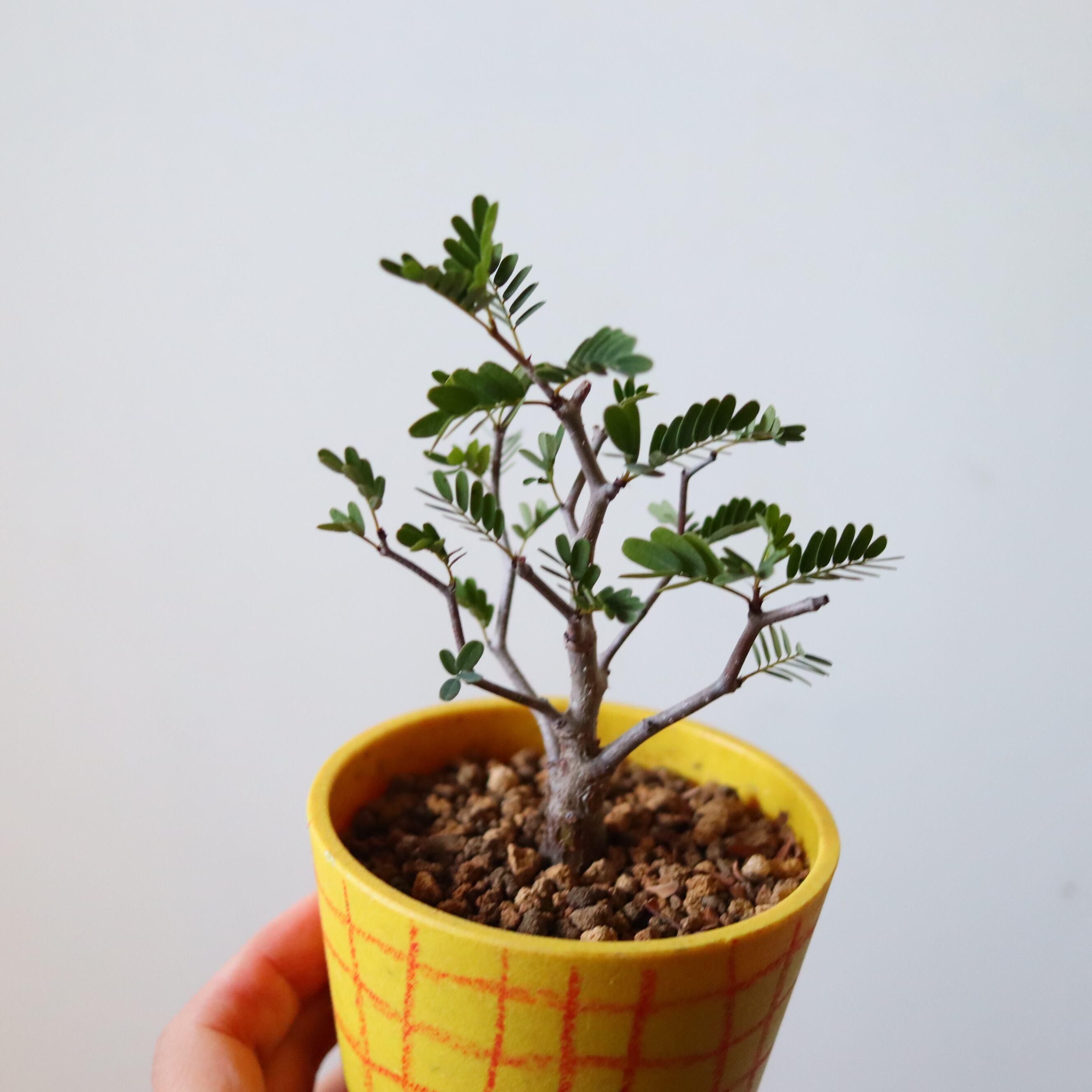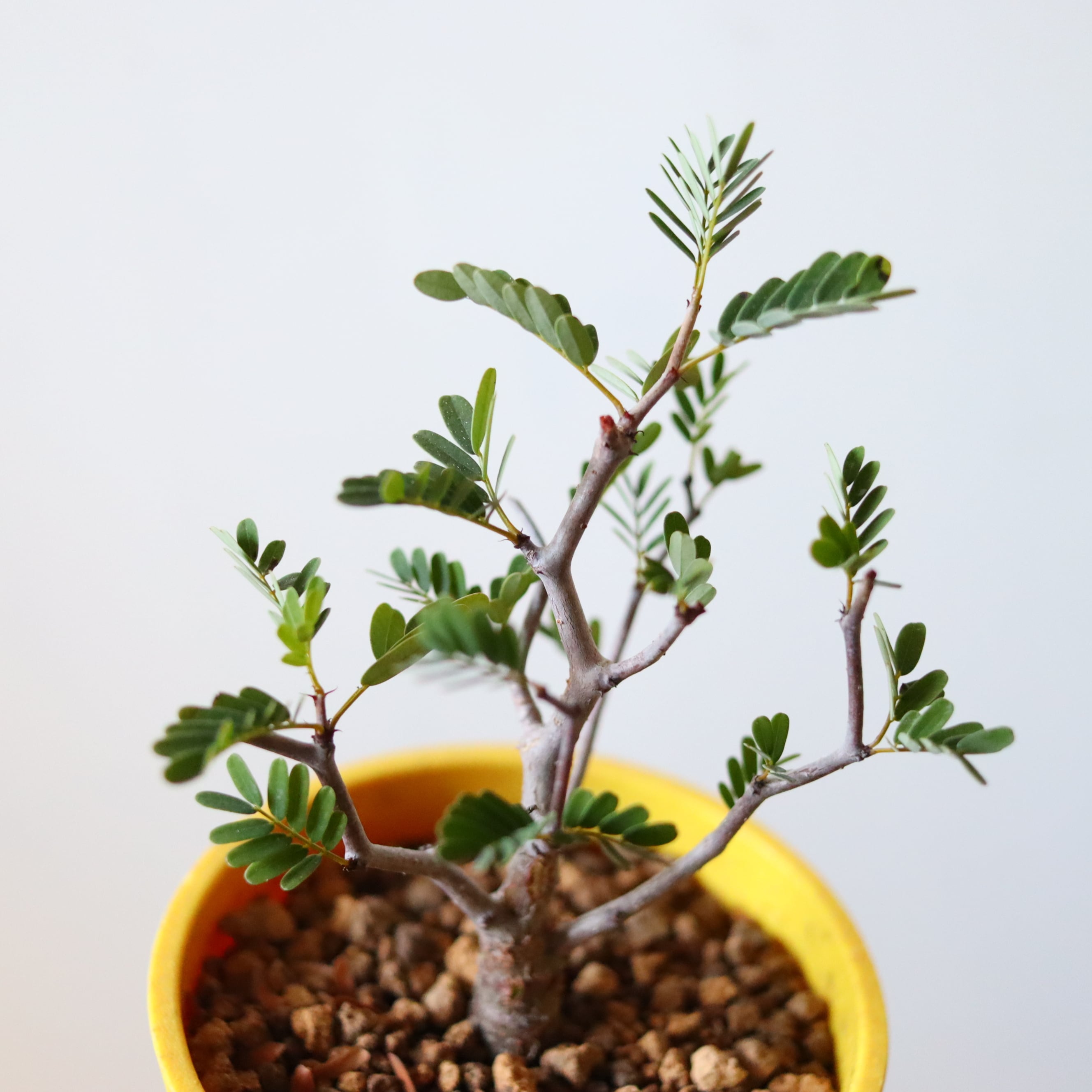 渋くてゴツゴツした塊根からかわいい葉っぱを生やしている塊根植物、メリディオナリス。こちらはその赤ちゃん株です。ベビーでかわいい。豆科の葉っぱなので、夜になると葉っぱをぱたんと閉じます。それもすごく可愛らしいです。ゆっくり大きく育ててあげてください。