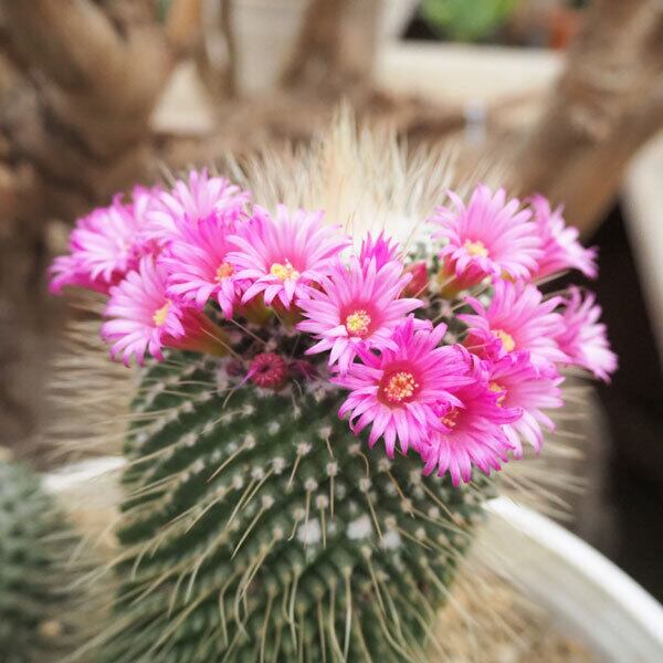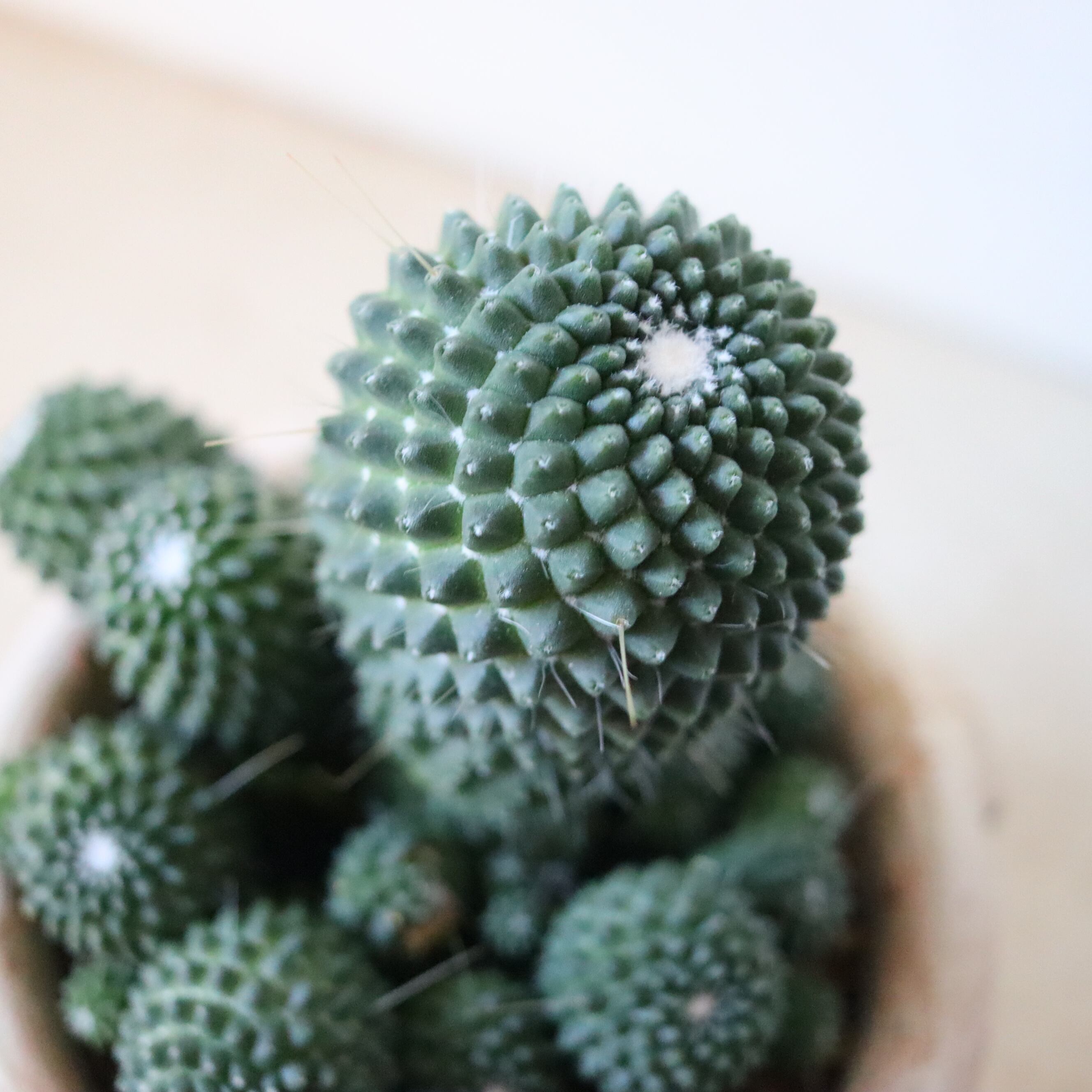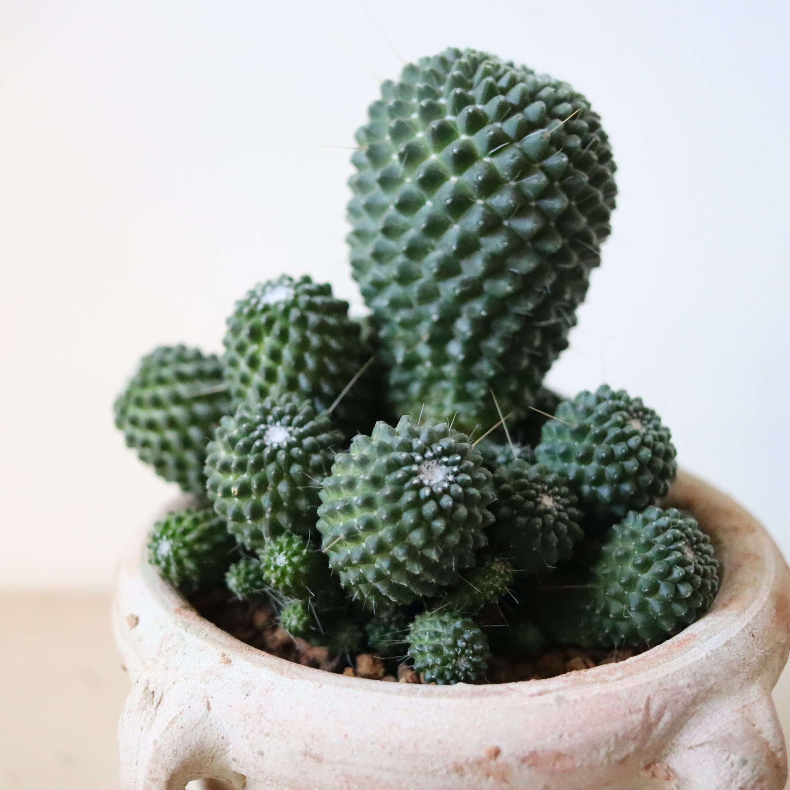 ドリアンみたいなサボテン、ピコの群生株です。ちょろっと生えたトゲがなんだか間抜けでかわいらしいですね。よく日に当ててあげると春から夏の間にピンクの可愛いお花がたくさん咲きます。
