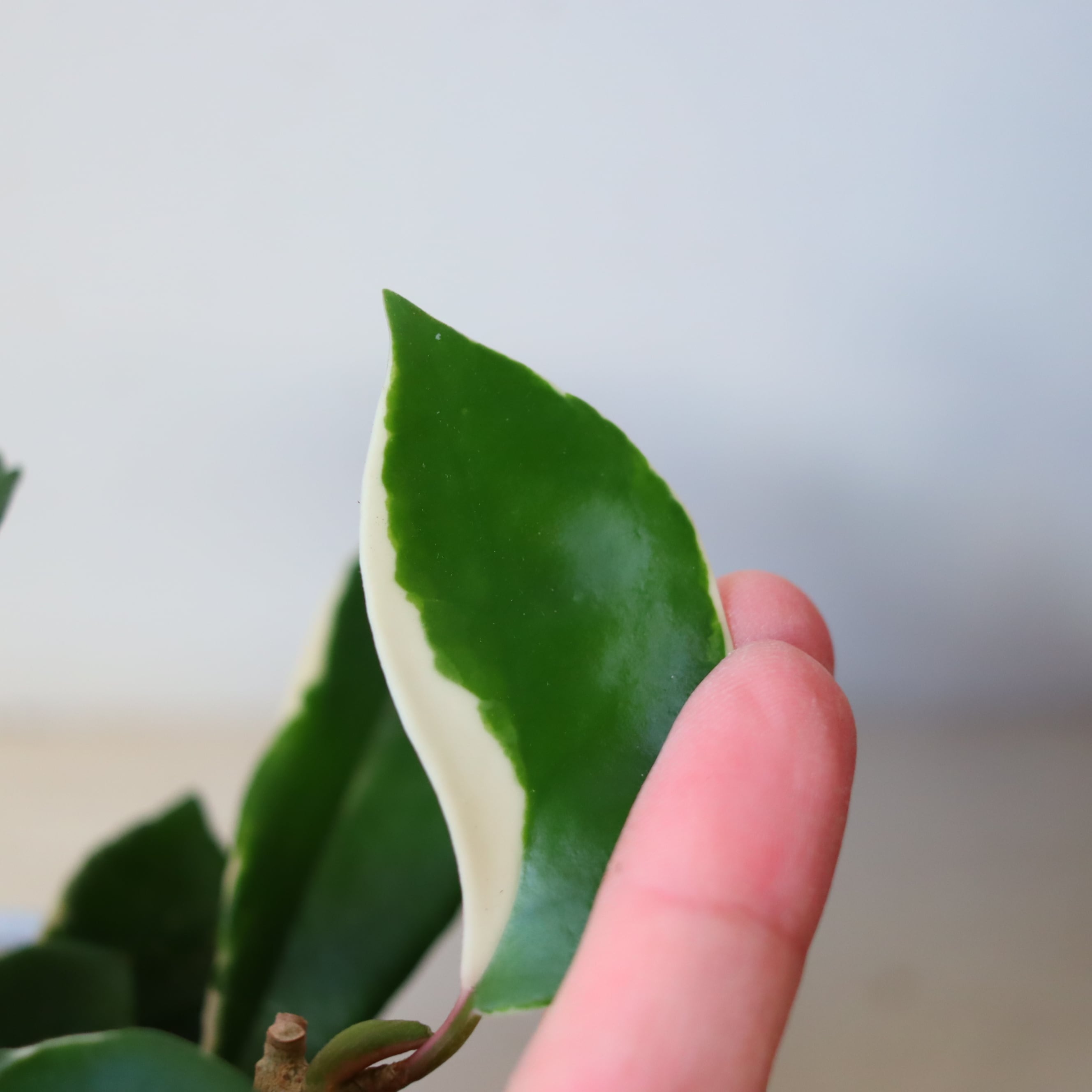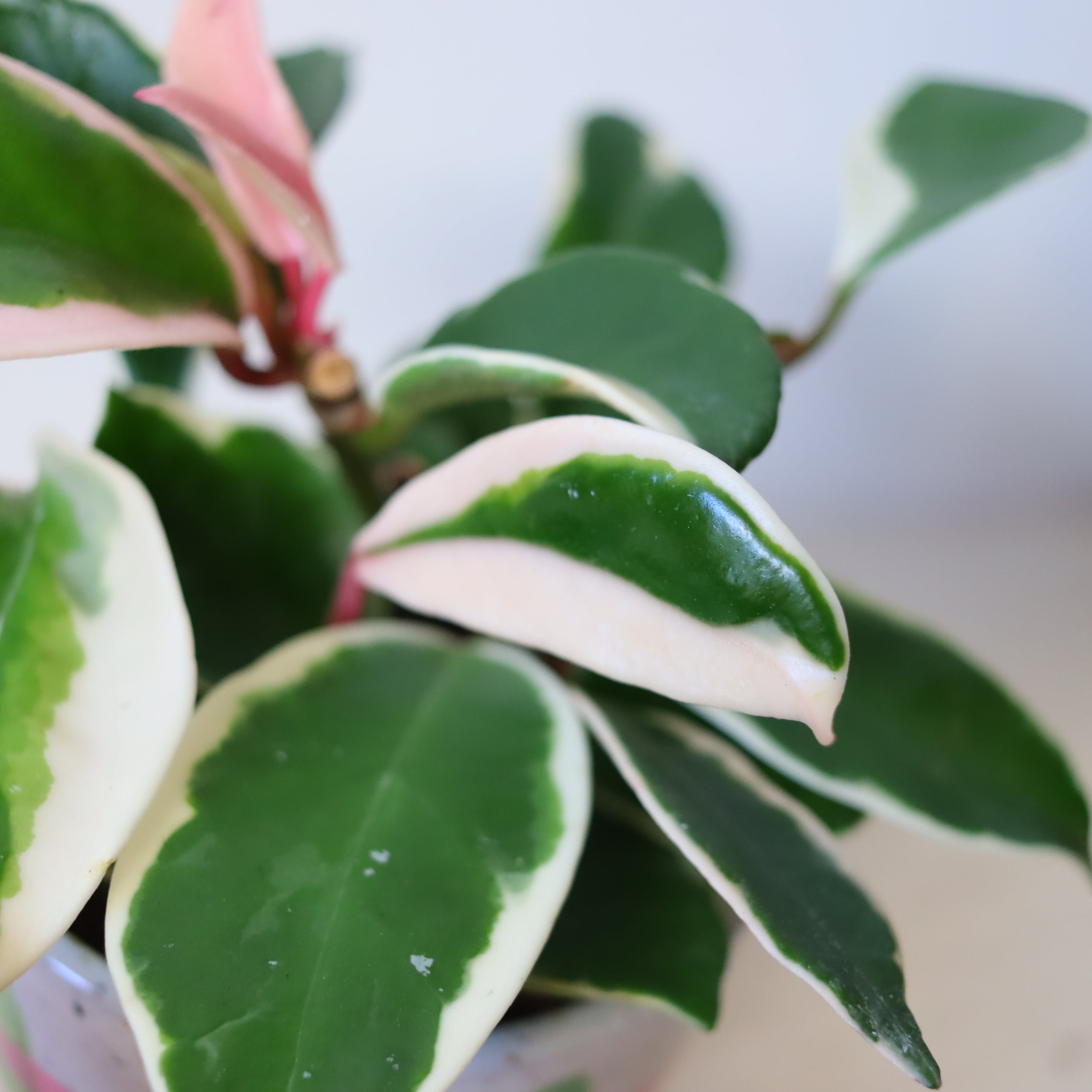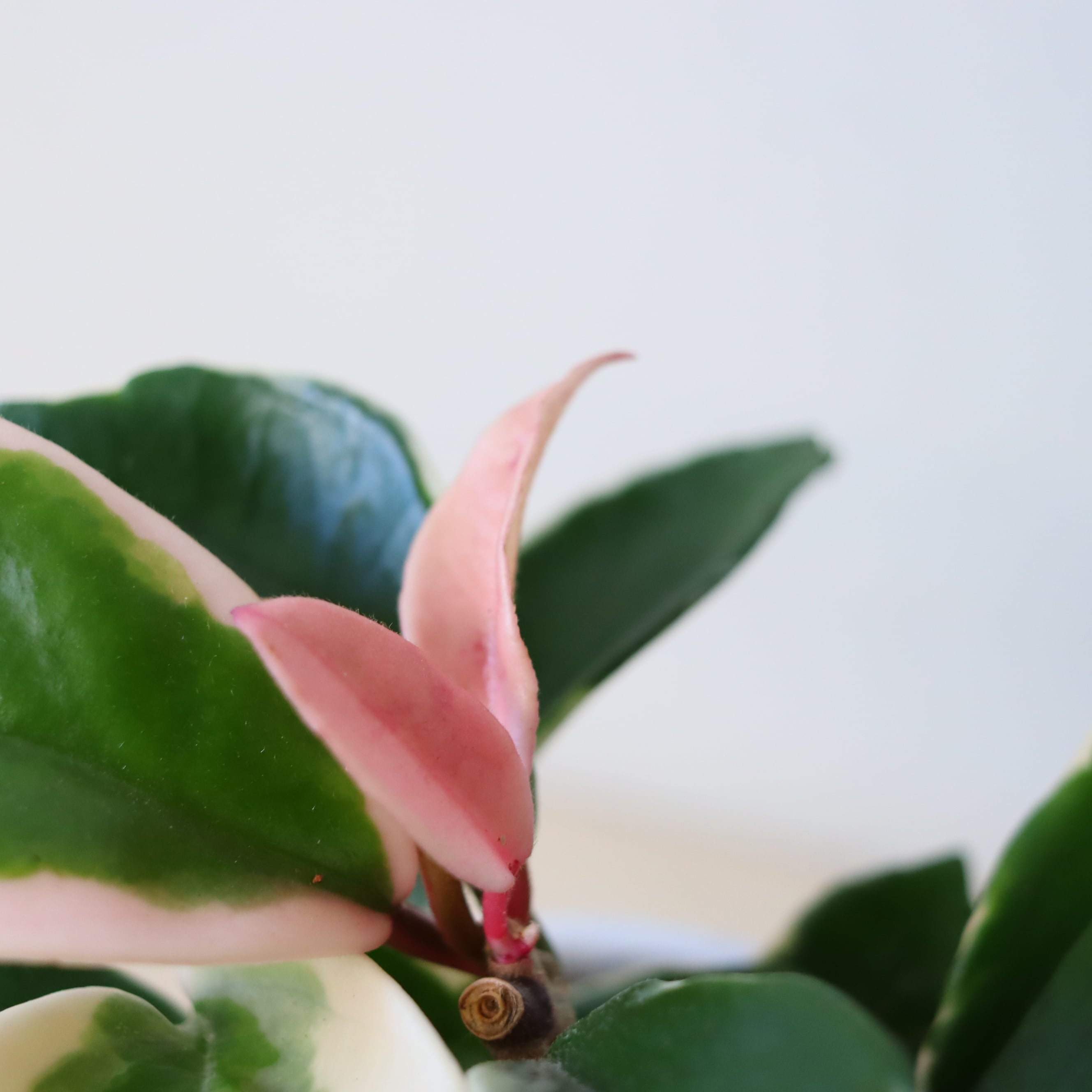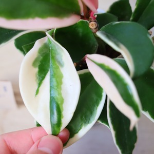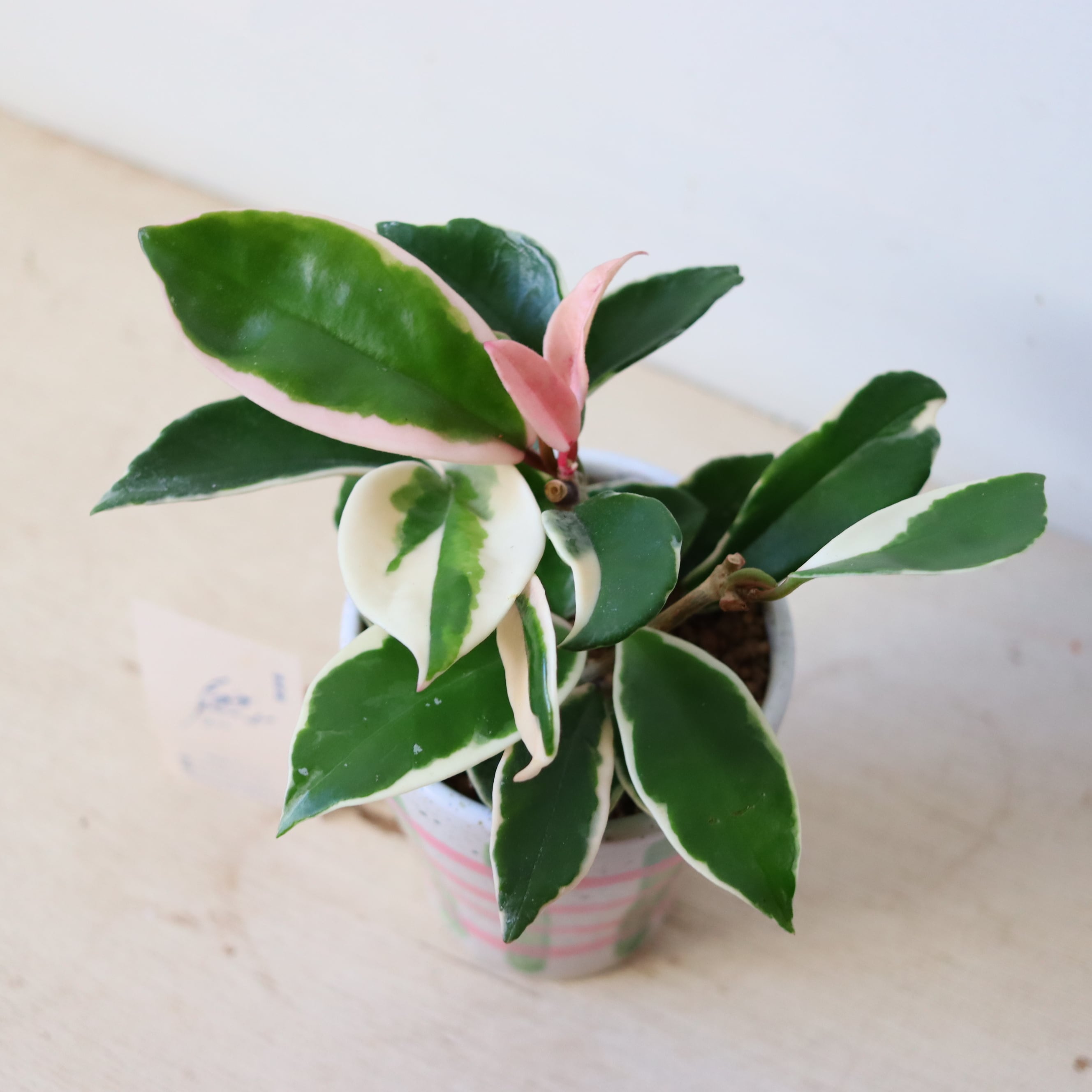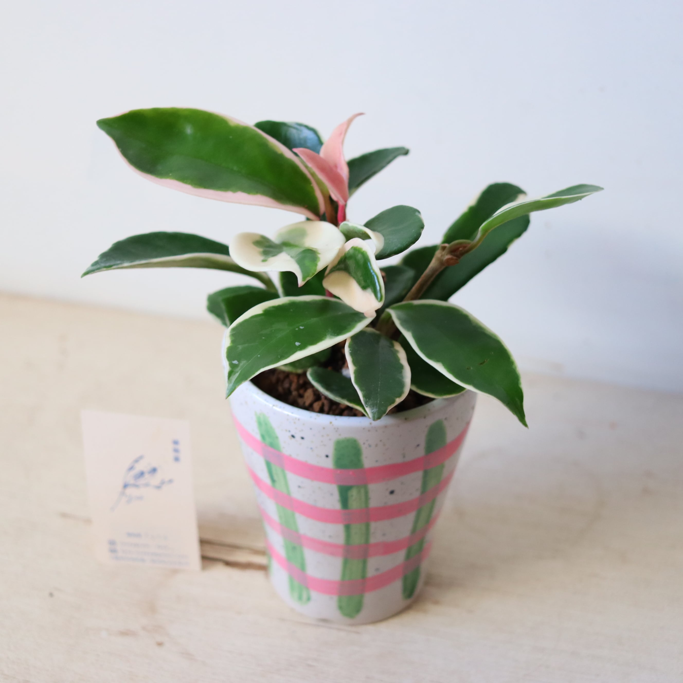 肉厚の葉っぱにクリーム色やピンクの斑がはいった植物です。よく日に当ててあげると、アポロチョコレートのような手毬型のお花が咲きます。