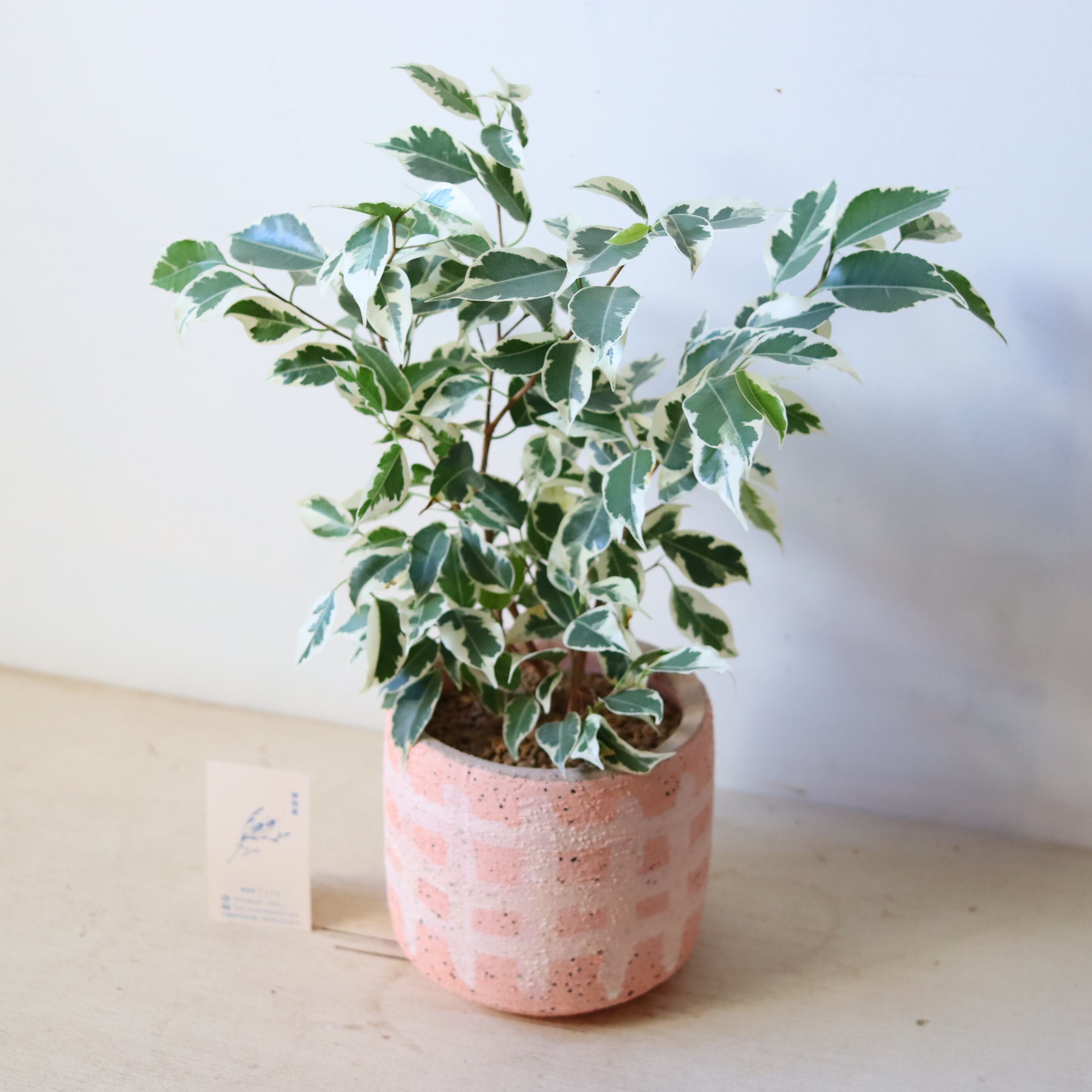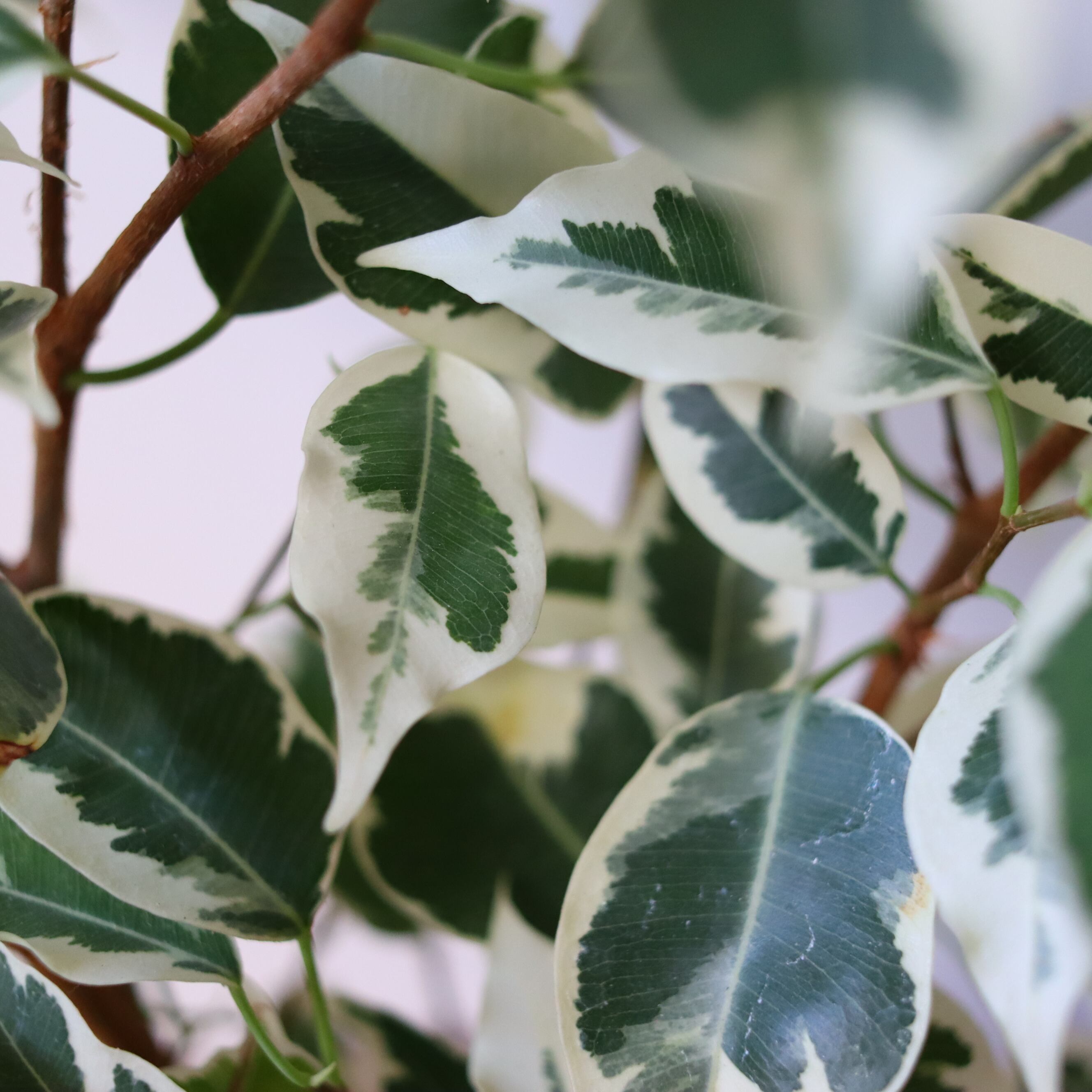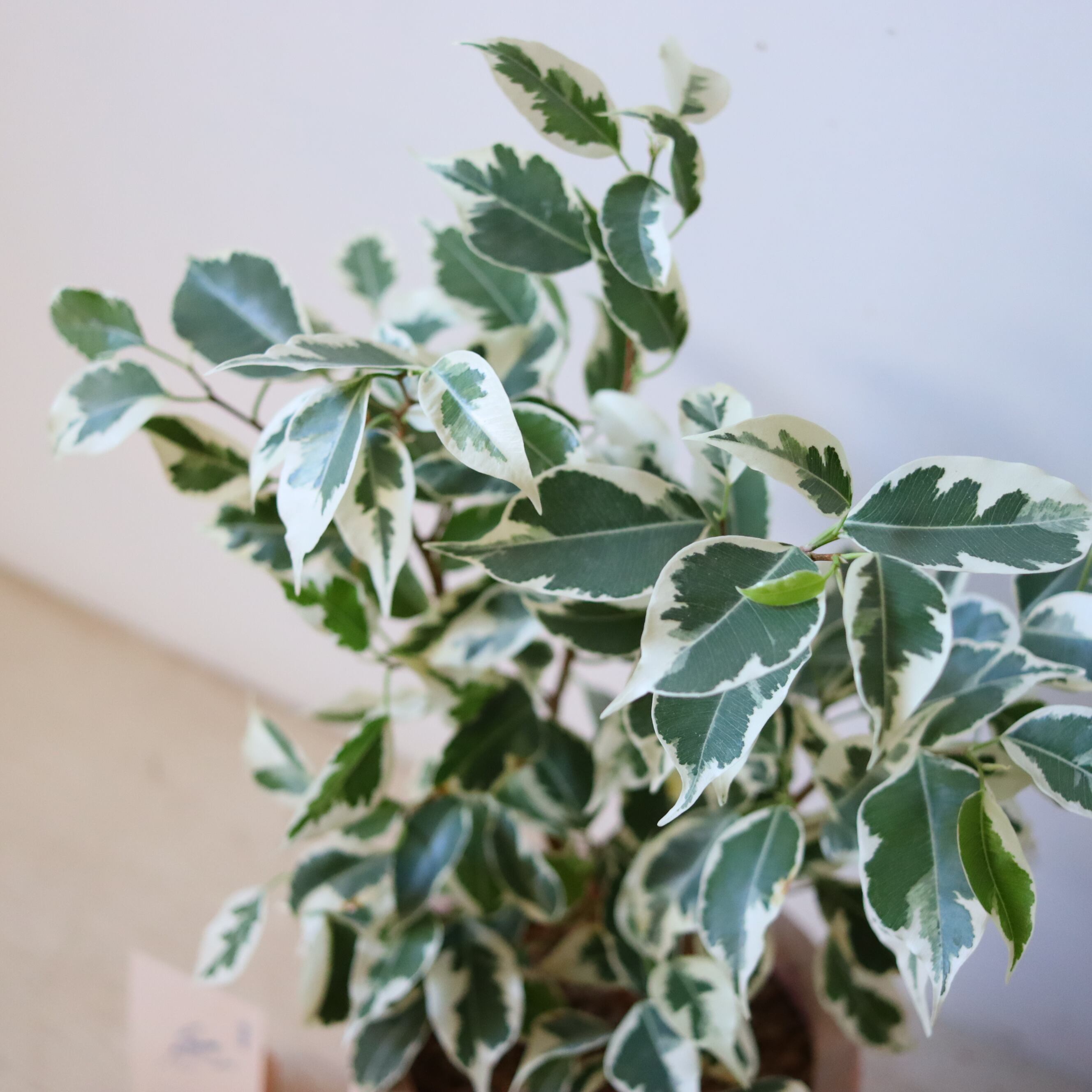 絵の具で模様をつけたような斑入りのクリーム色の葉っぱがかわいいベンジャミンです。いい雰囲気。丈夫で育てやすいので、お世話が苦手な方にもおすすめです。