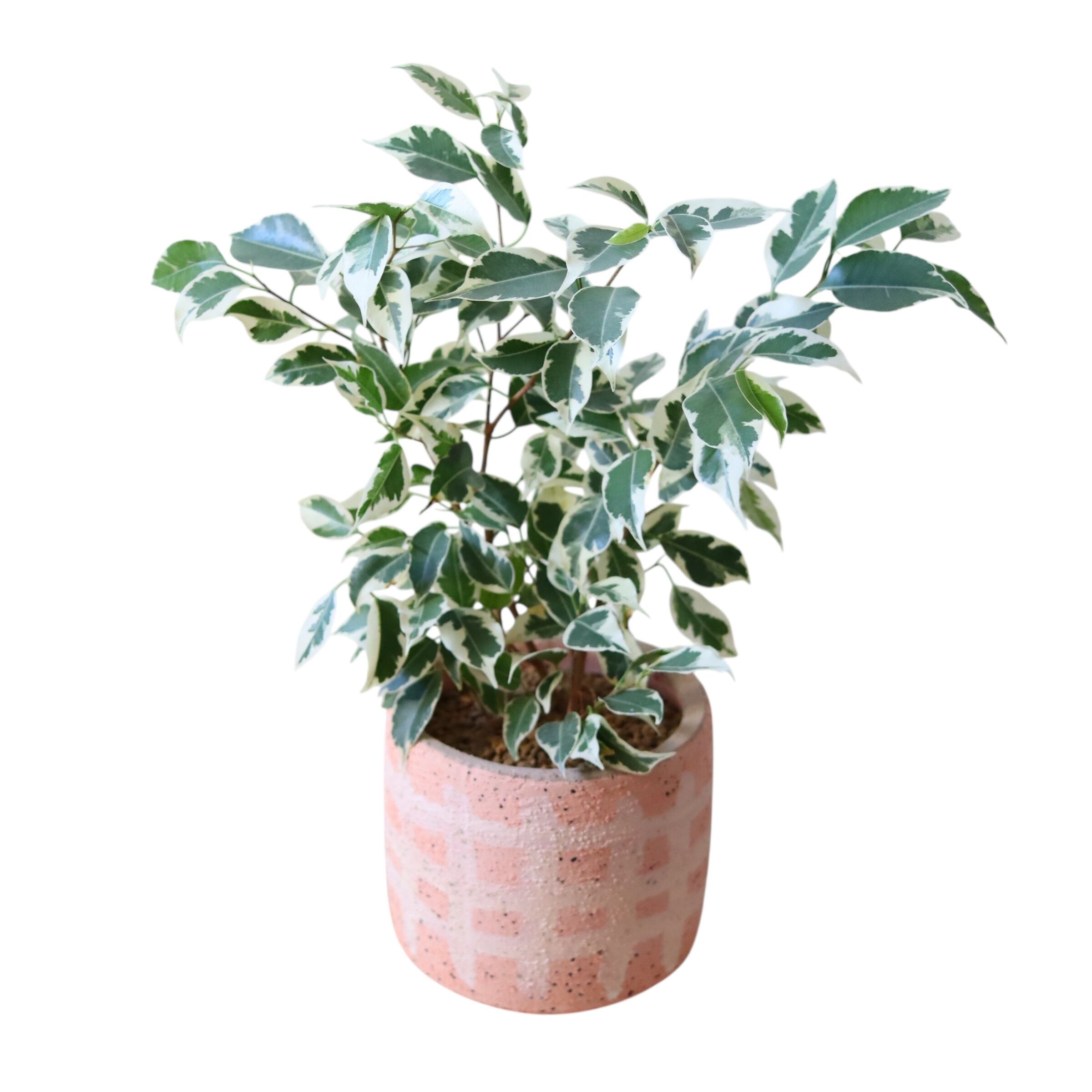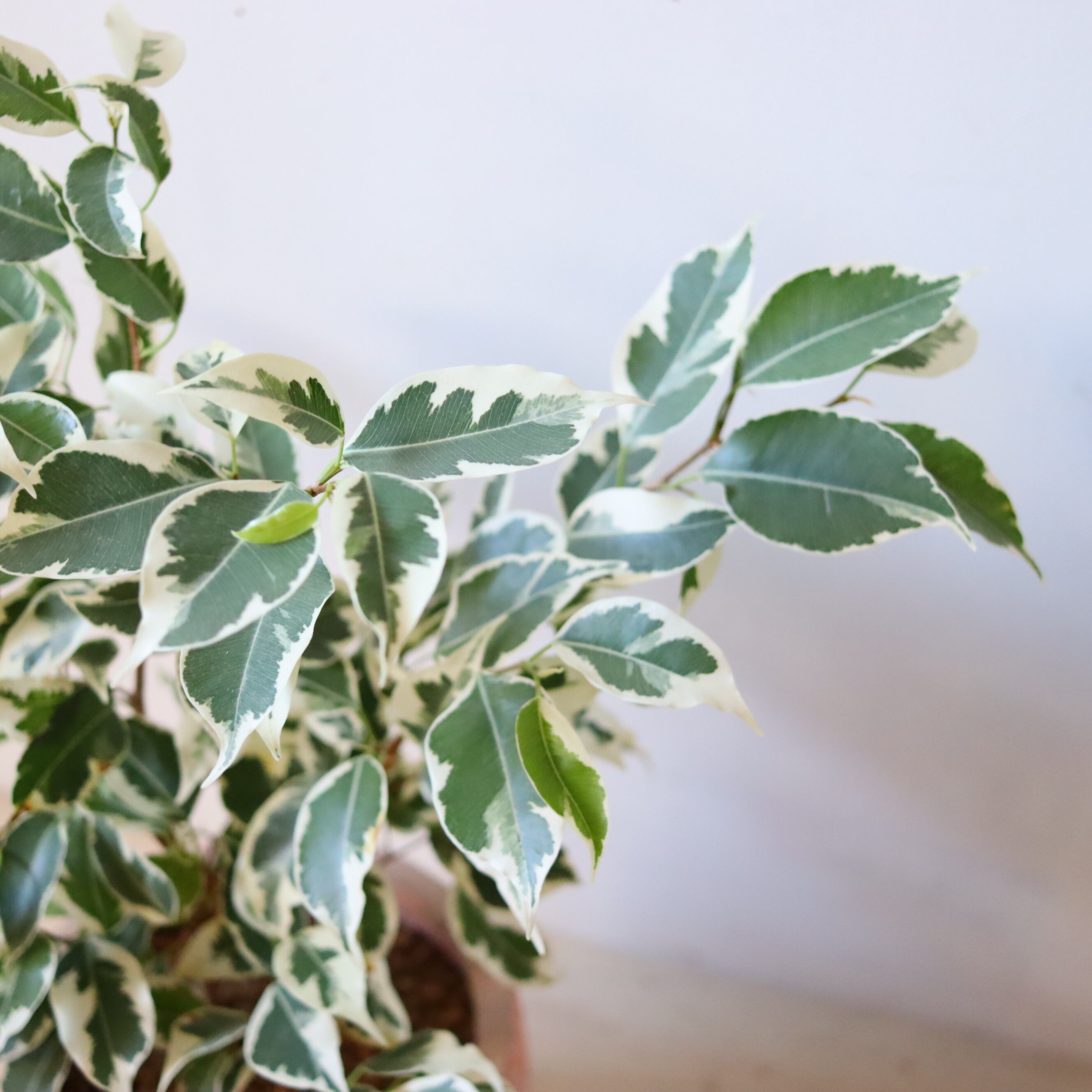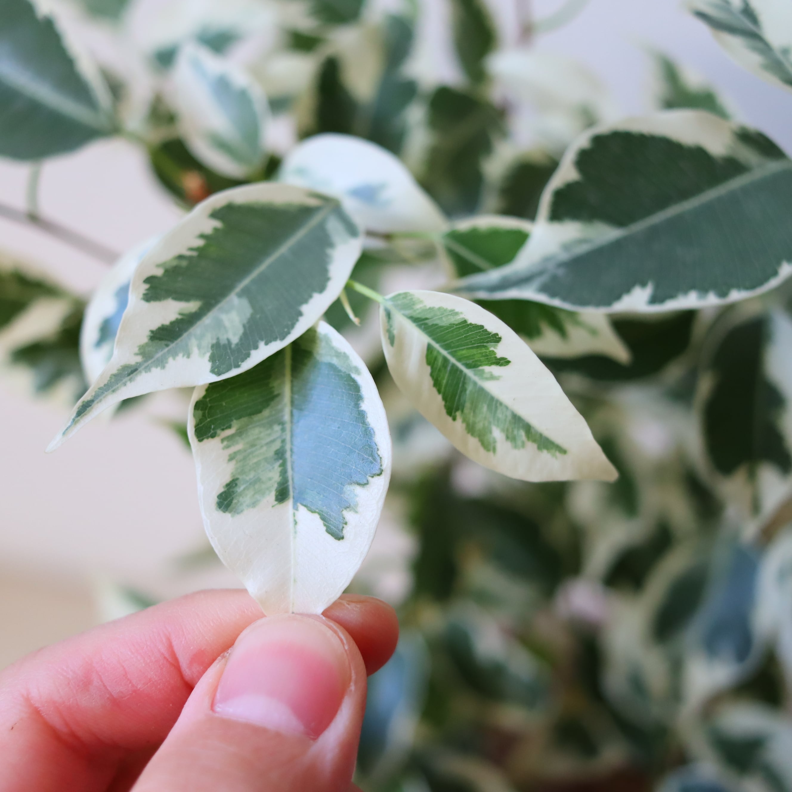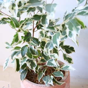 絵の具で模様をつけたような斑入りのクリーム色の葉っぱがかわいいベンジャミンです。いい雰囲気。丈夫で育てやすいので、お世話が苦手な方にもおすすめです。