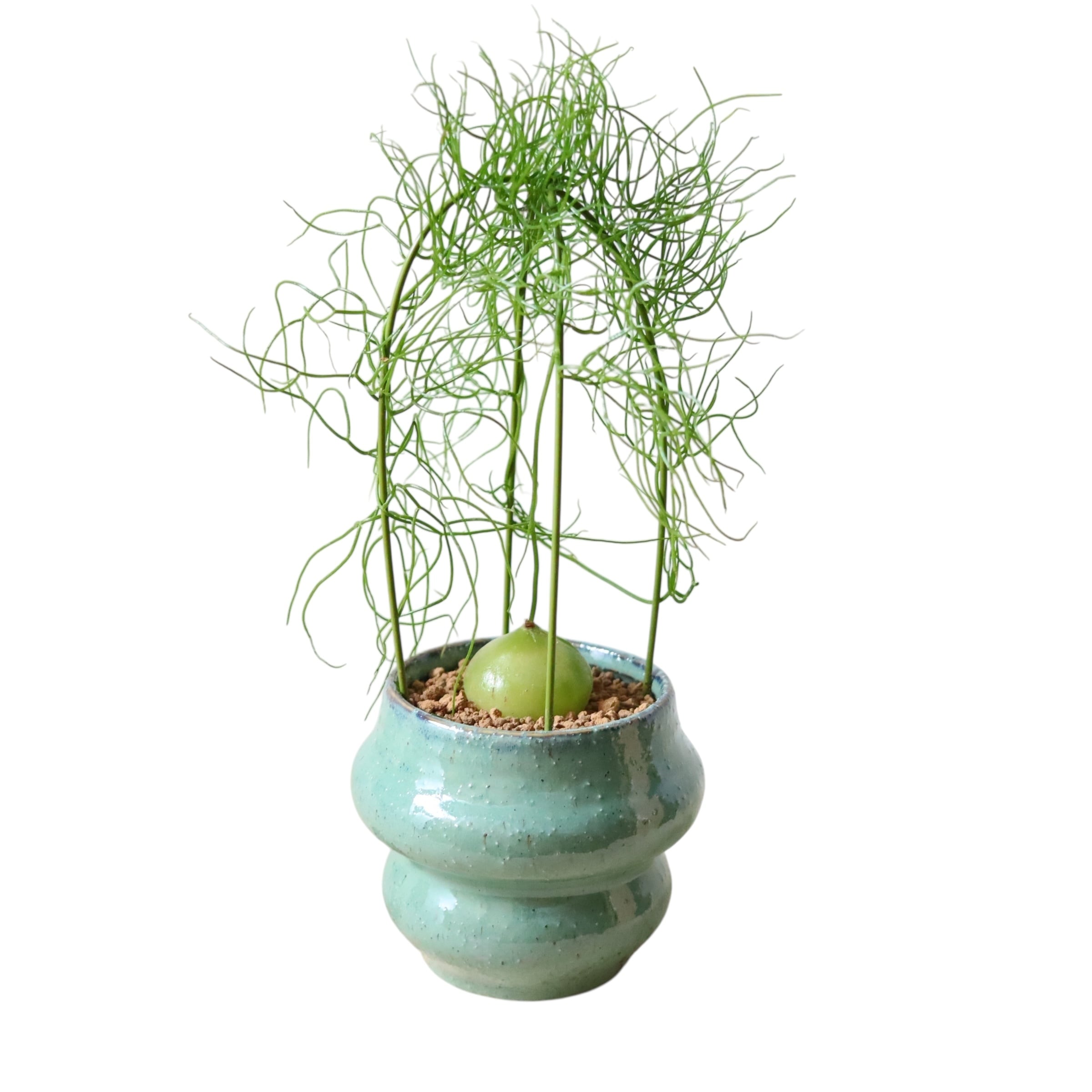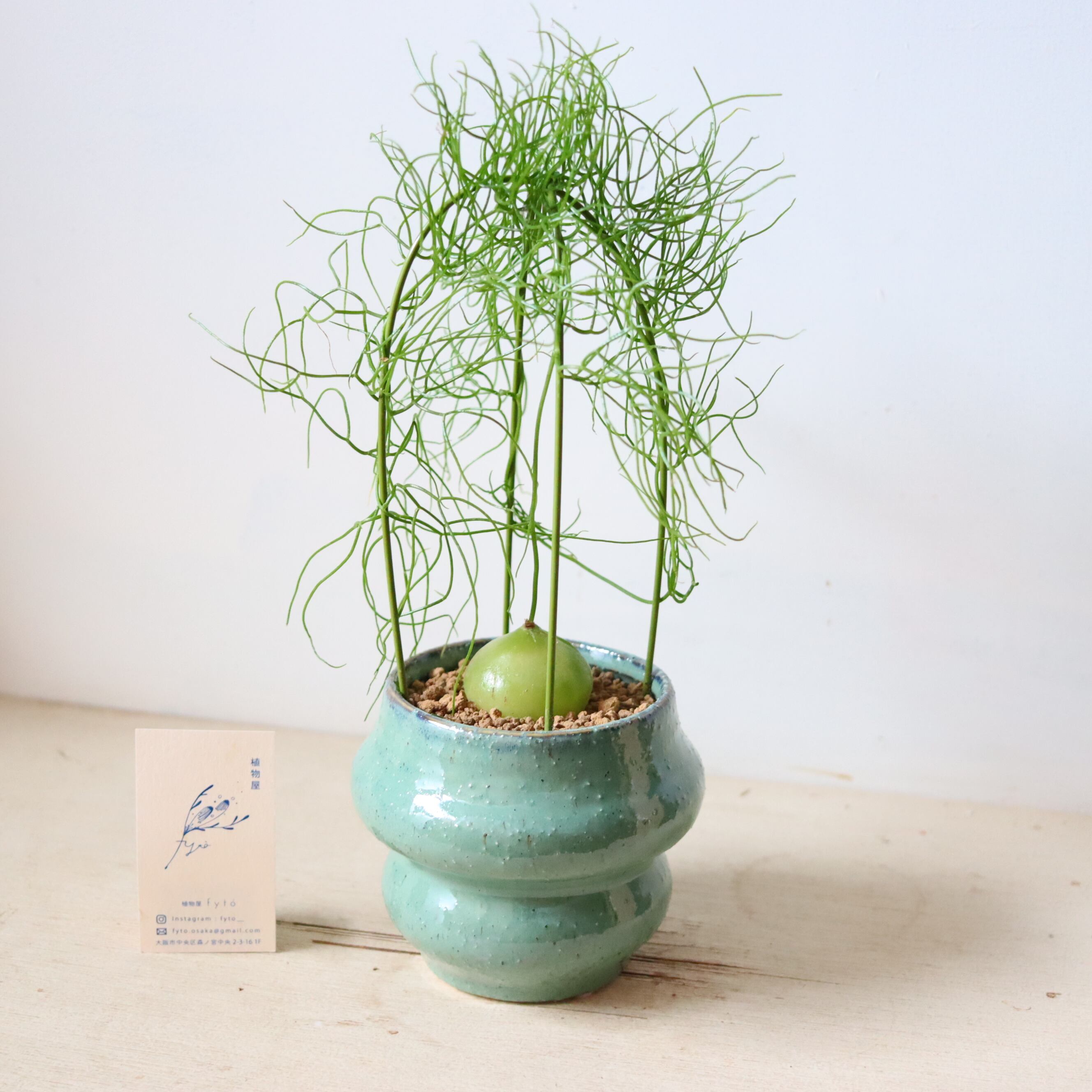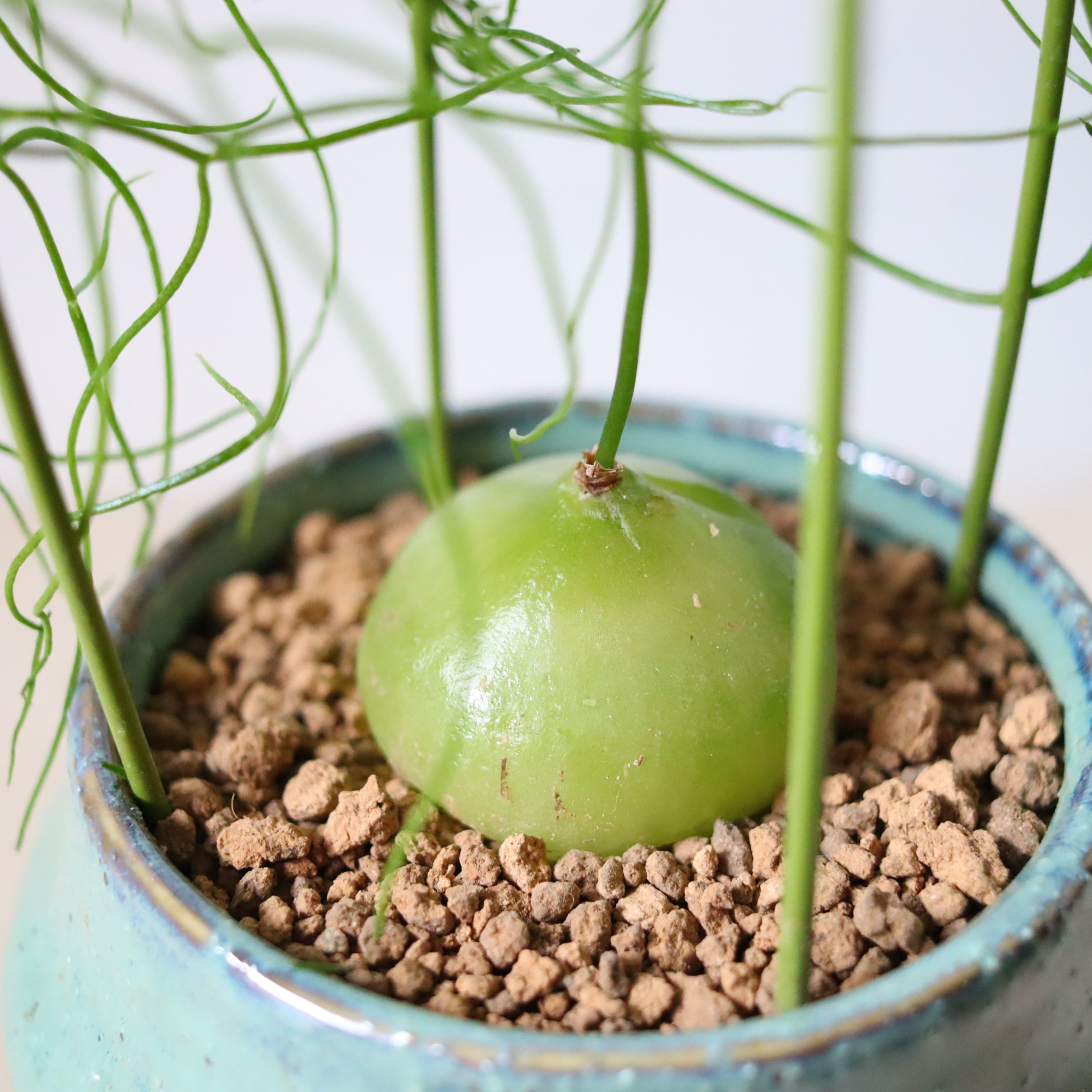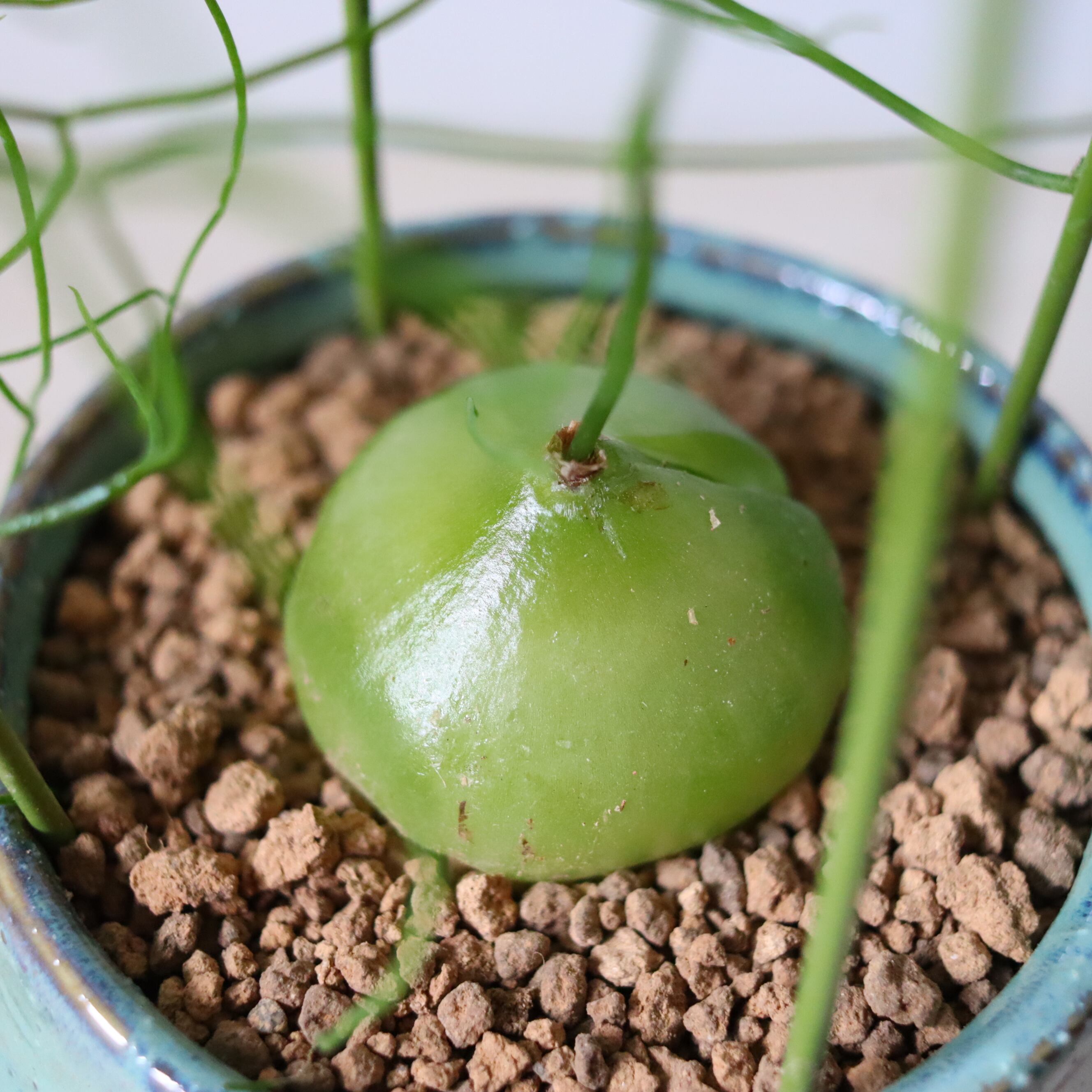 美しい翡翠色の球根植物です。ツヤツヤとした蔓を上へ上へと旺盛に伸ばしていく、かなり個性的な植物です。こう見えて丈夫でお世話も簡単なので変わった植物が欲しい方におすすめです。