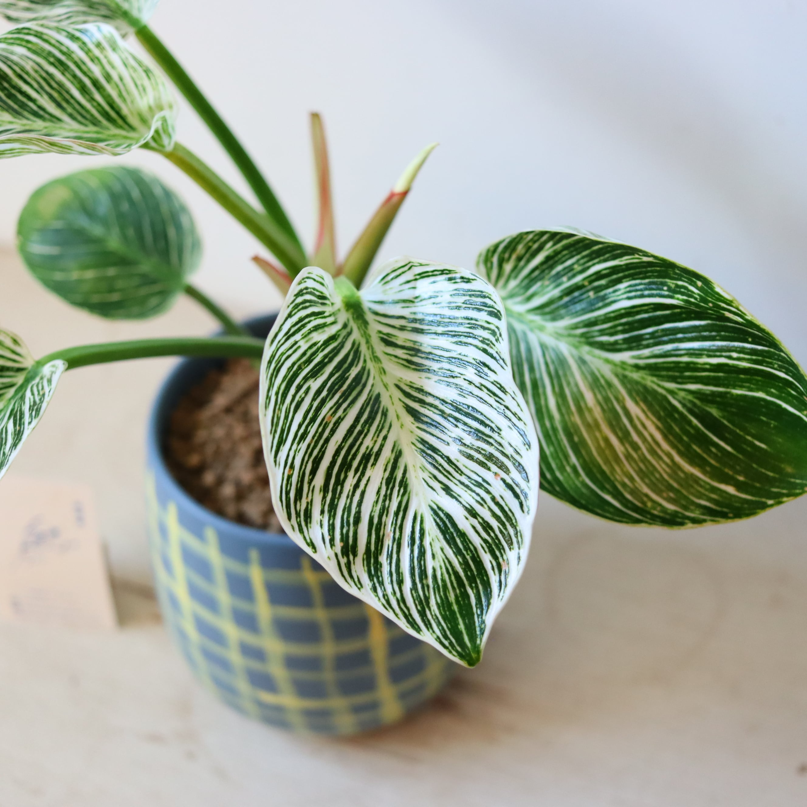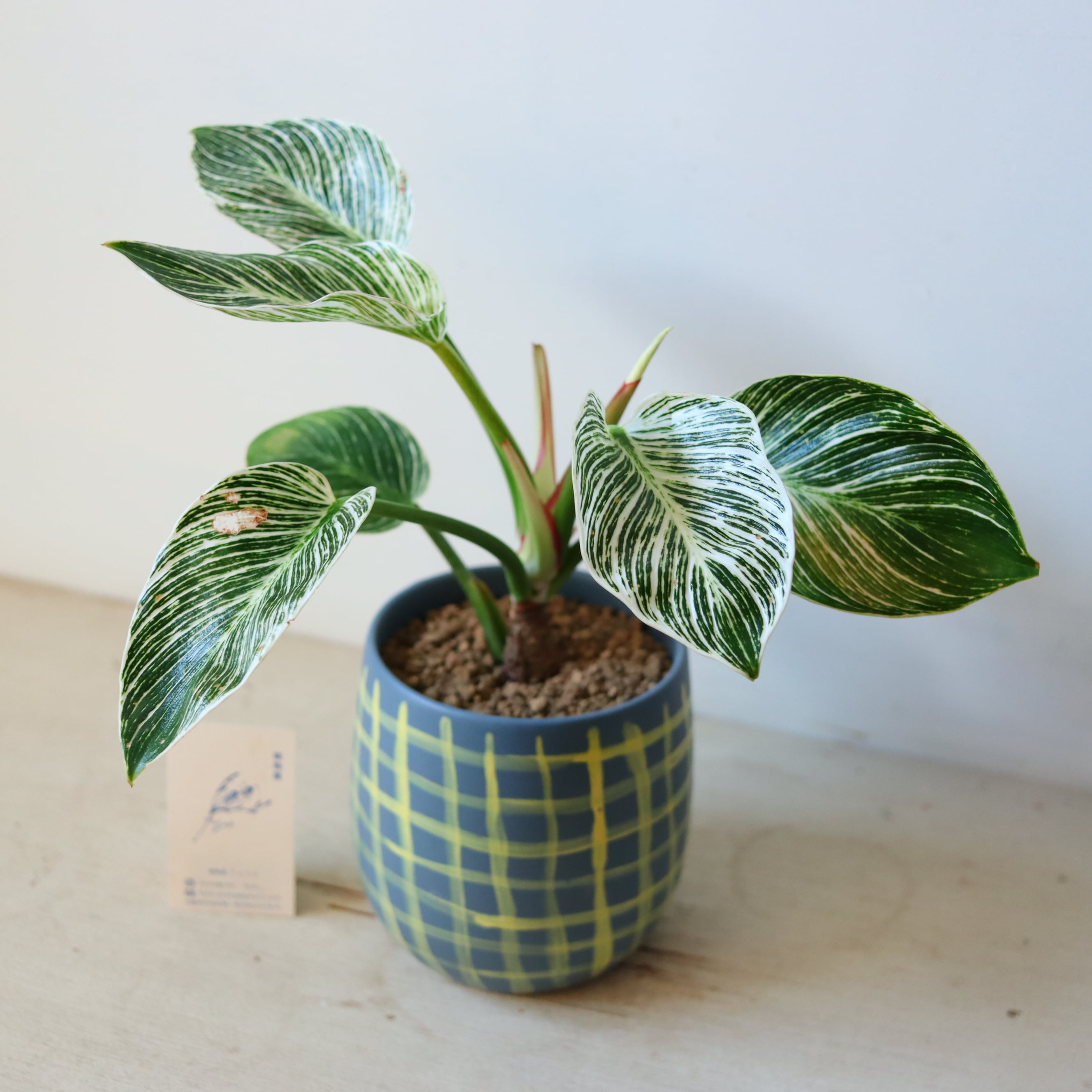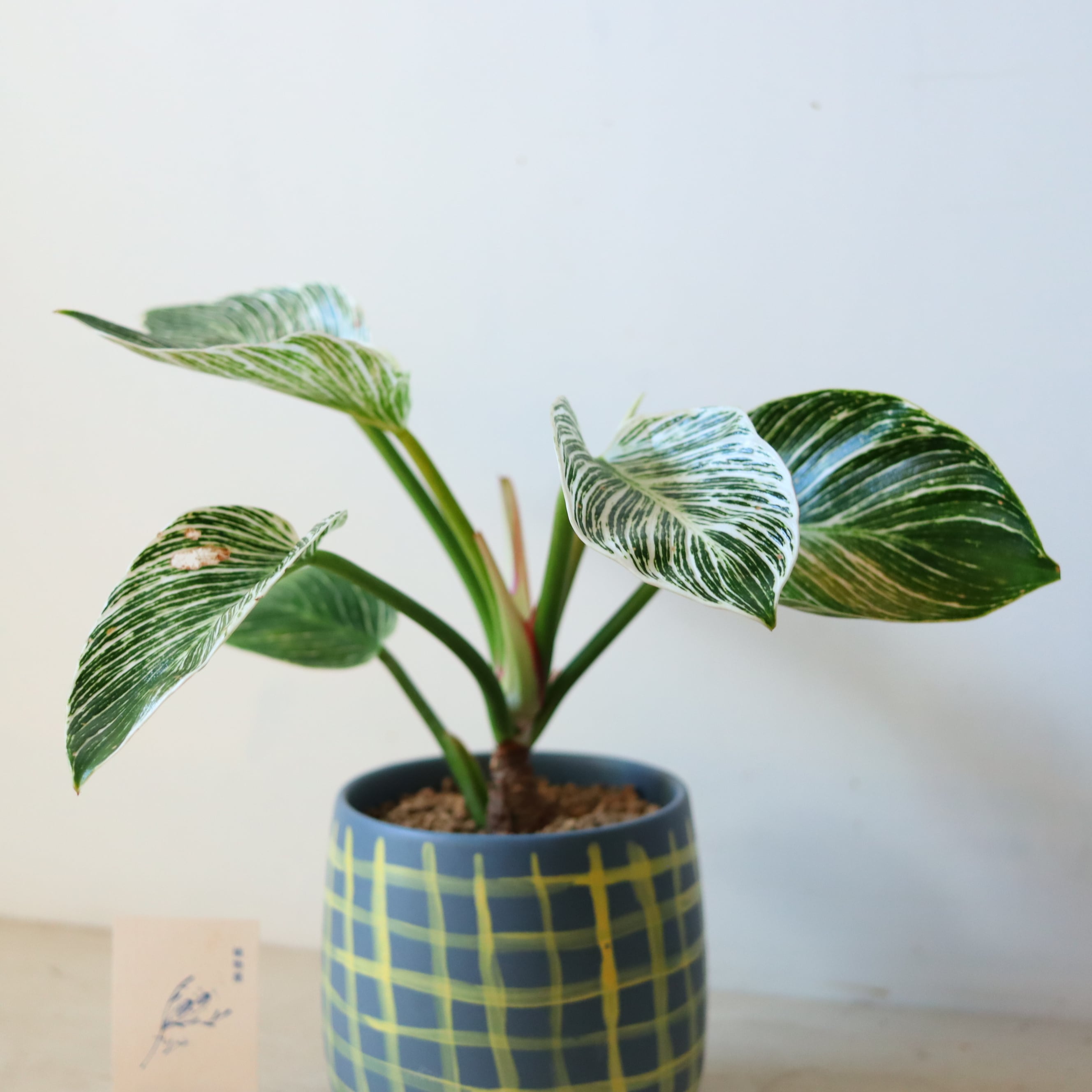 人気のお洒落な子、バーキンです。新芽は白く、徐々にゼブラ模様になっていき、その後緑の葉っぱのなるという、ユニークな植物です。丈夫で育てやすく、お世話が苦手な方にもおすすめです。