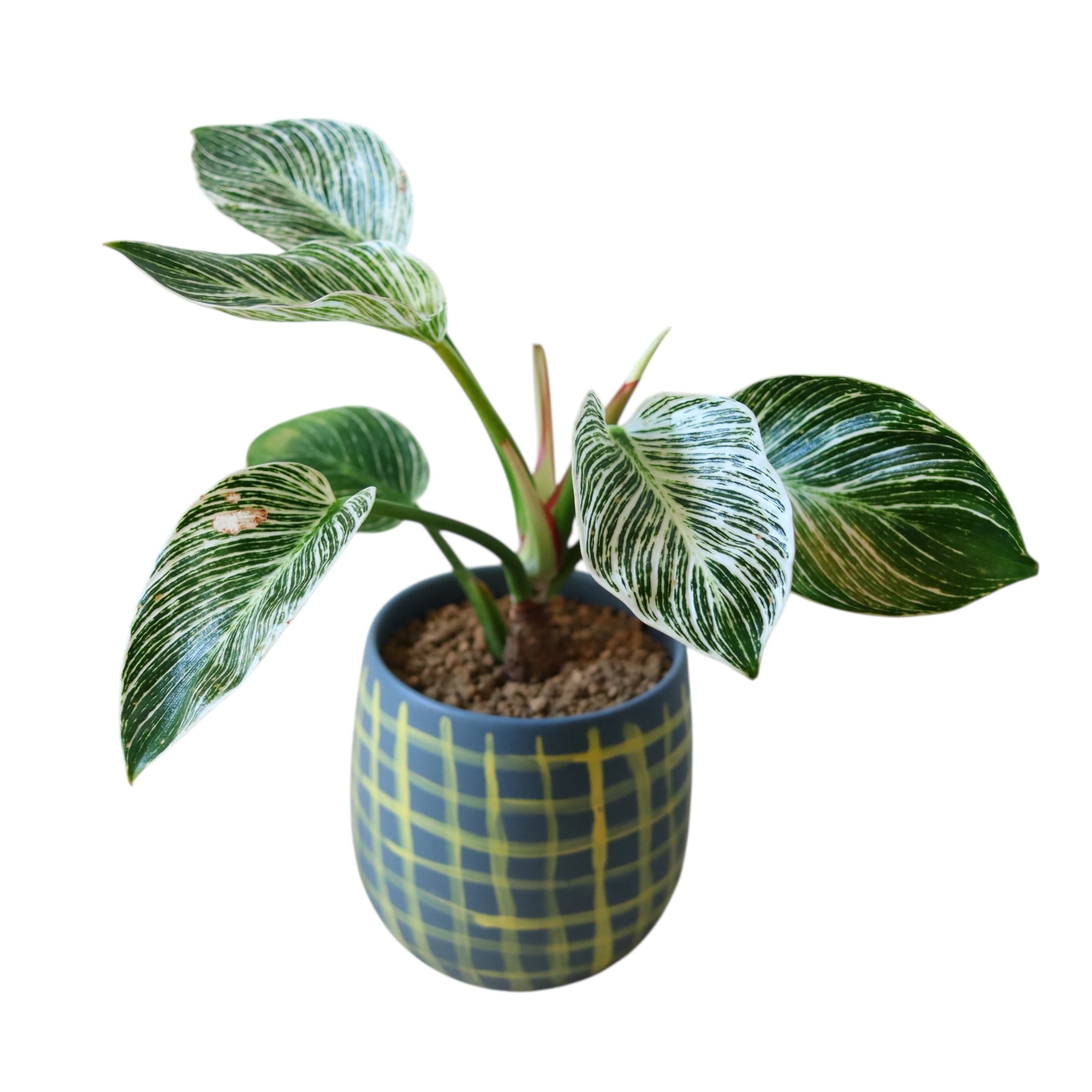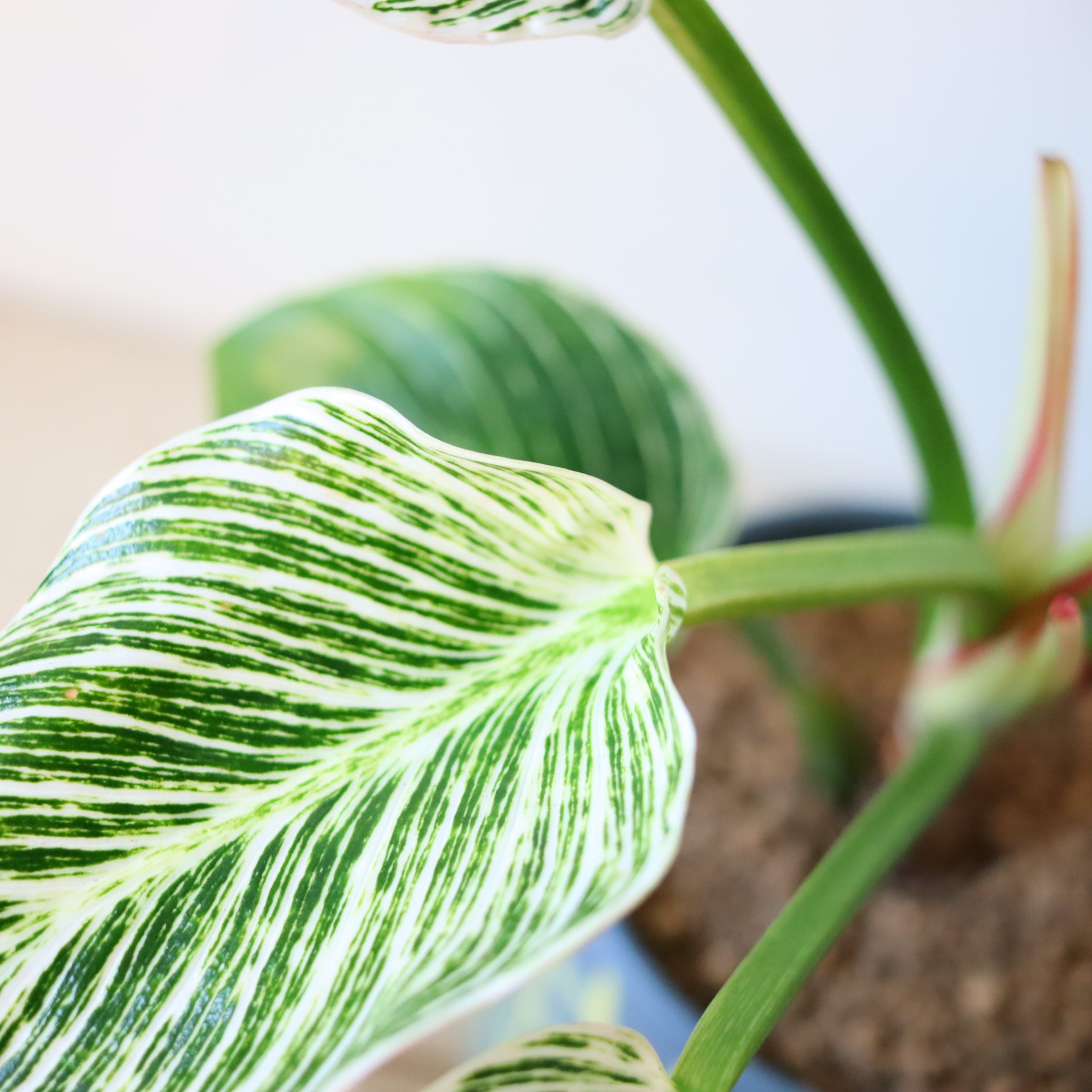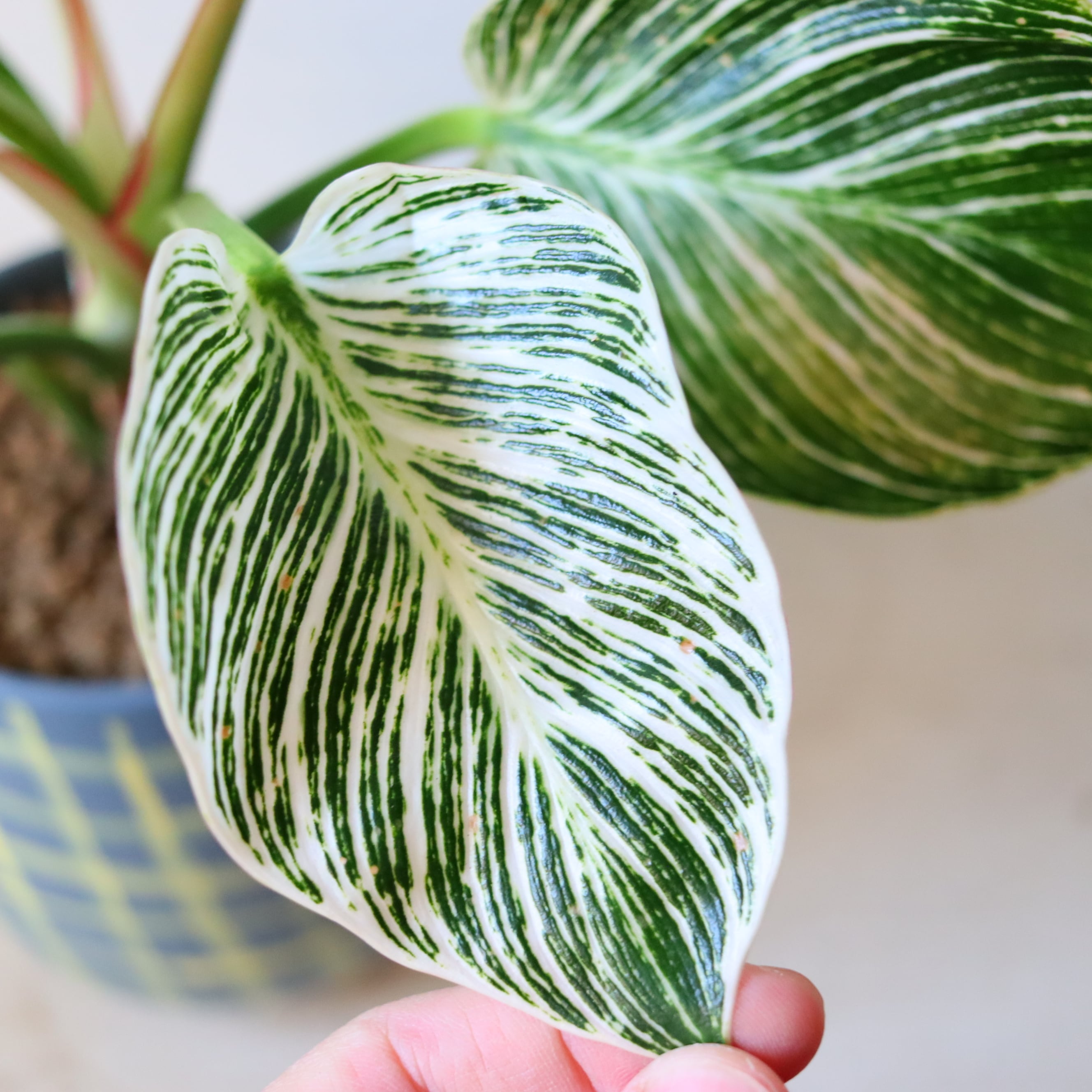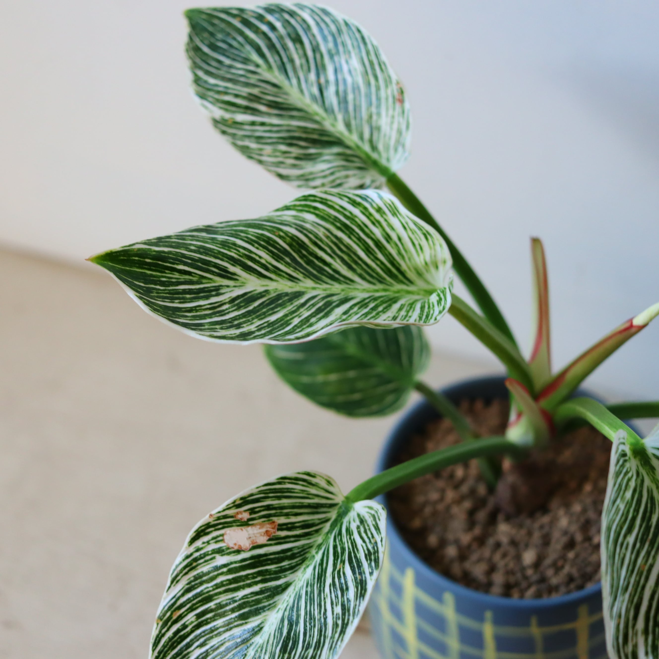 人気のお洒落な子、バーキンです。新芽は白く、徐々にゼブラ模様になっていき、その後緑の葉っぱのなるという、ユニークな植物です。丈夫で育てやすく、お世話が苦手な方にもおすすめです。