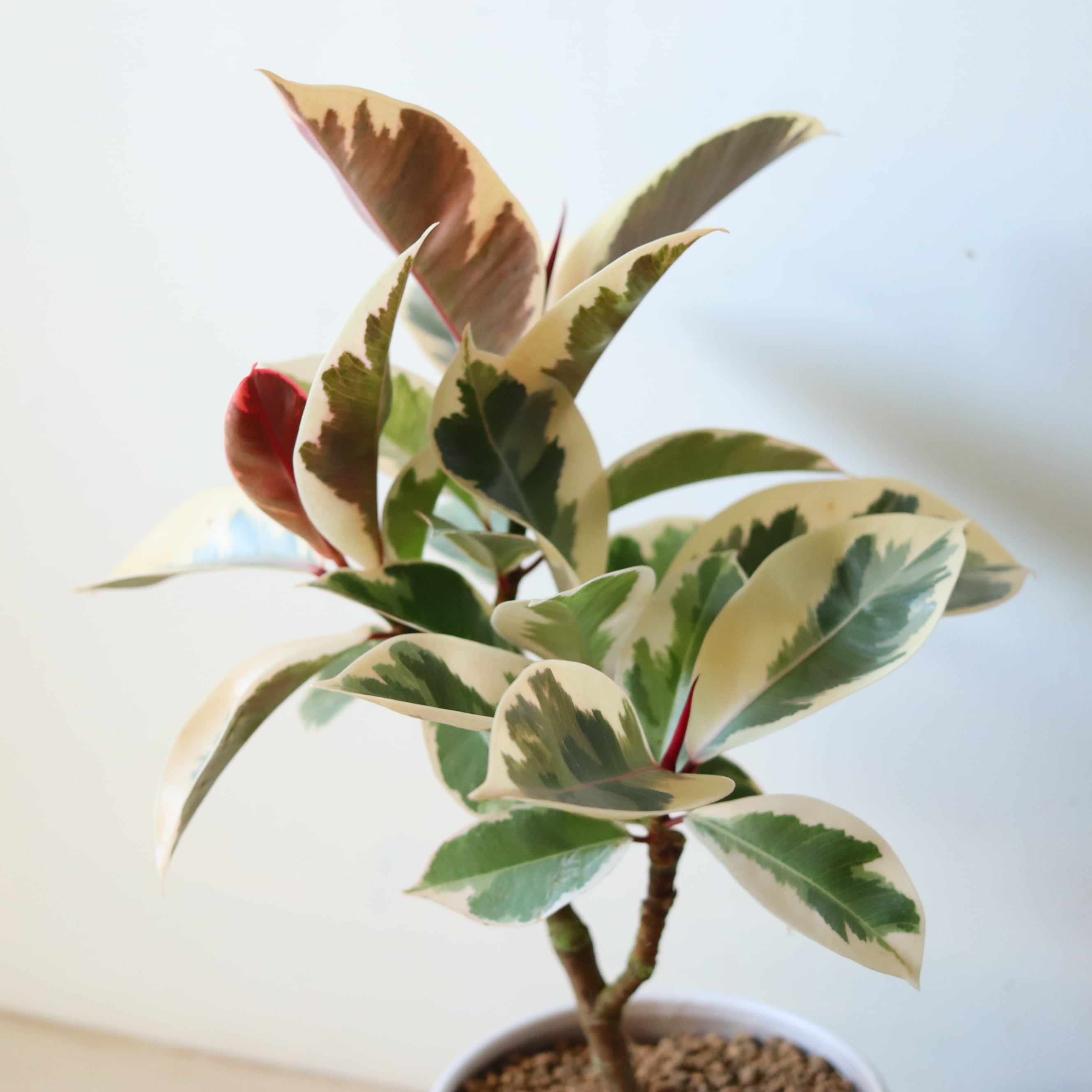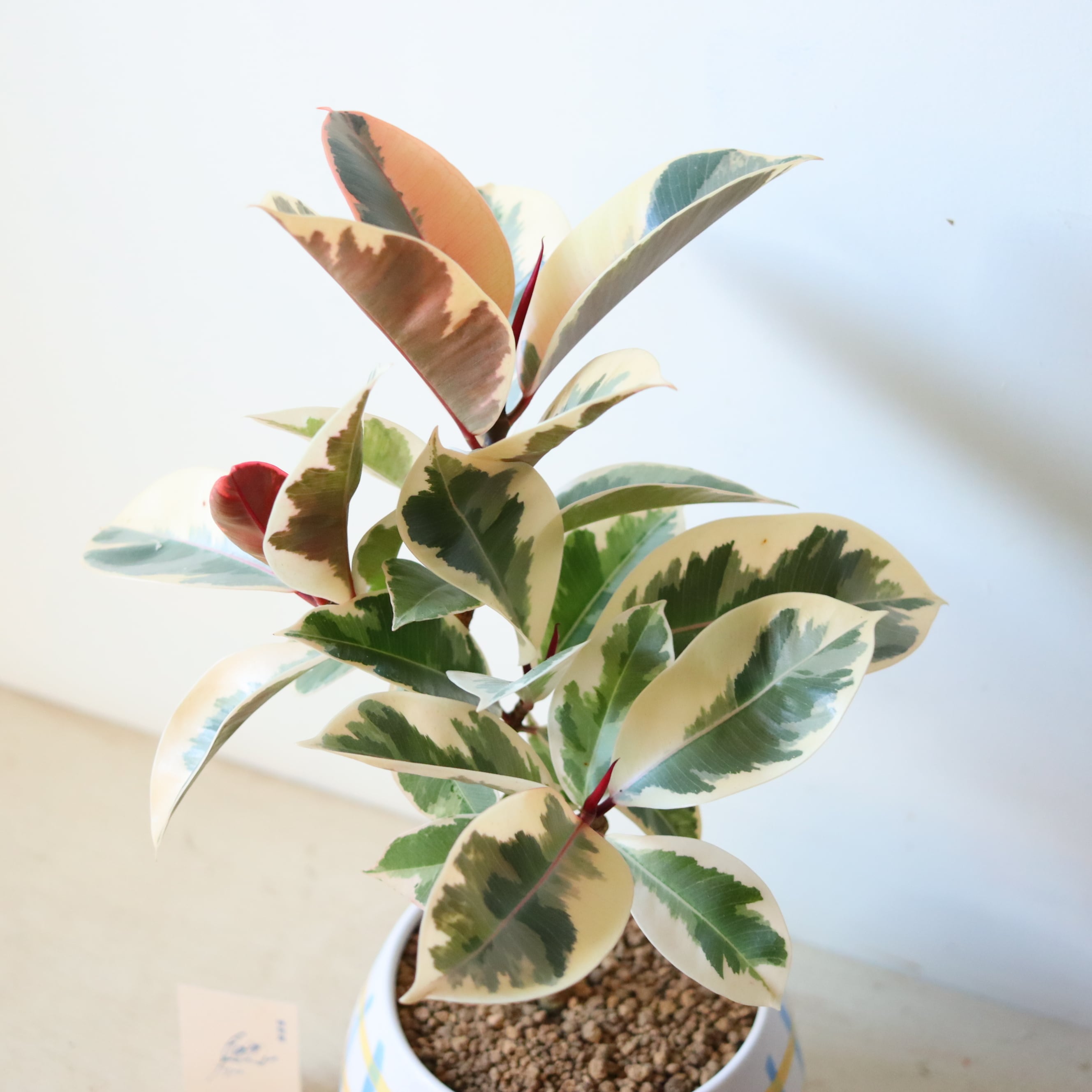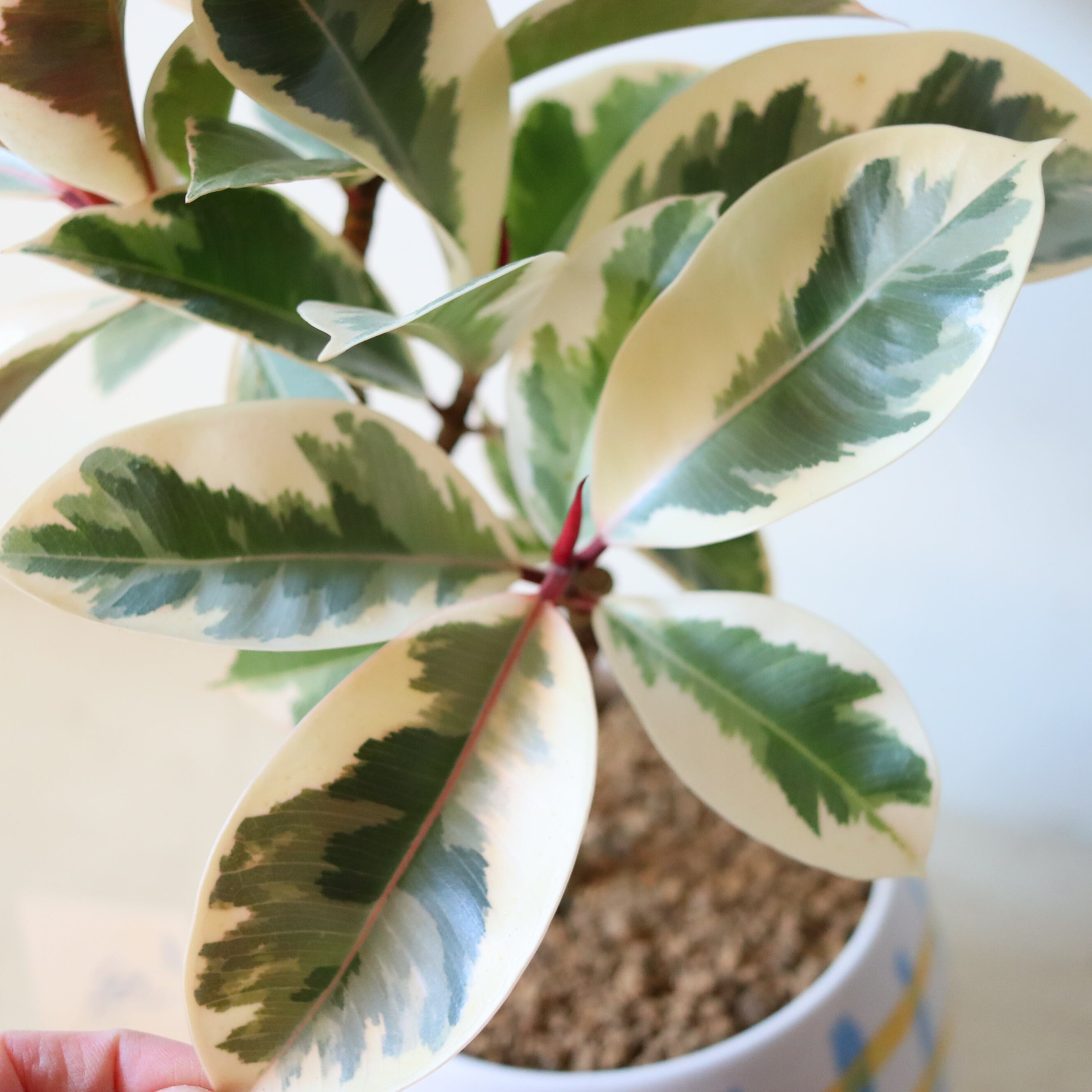 大きな葉っぱにクリーム色の斑入りが可愛らしい、ゴムの木の一種です。新芽が出てきた時のピンク色はほんとうに胸がくすぐられる可愛さです。淡い迷彩柄、しっかりとした樹形で雰囲気があり、お部屋のシンボルツリーになってくれます。