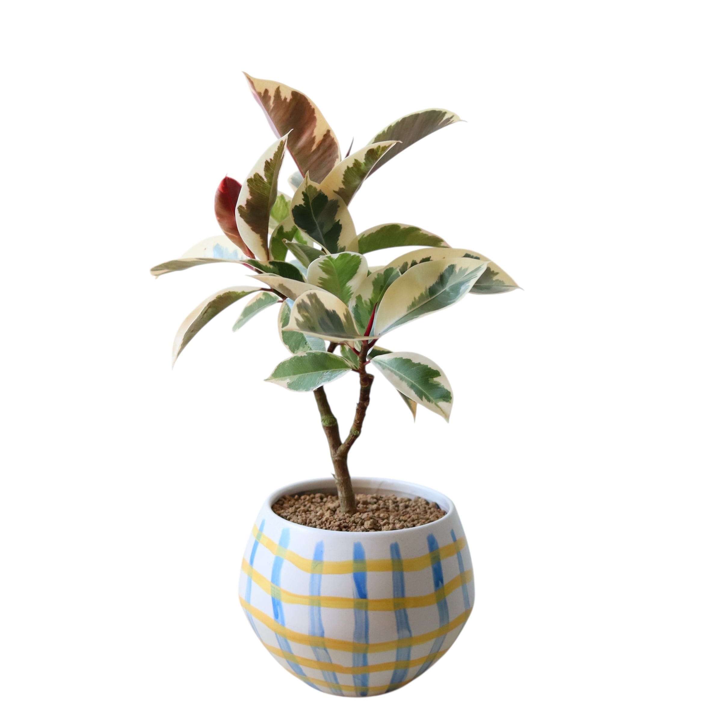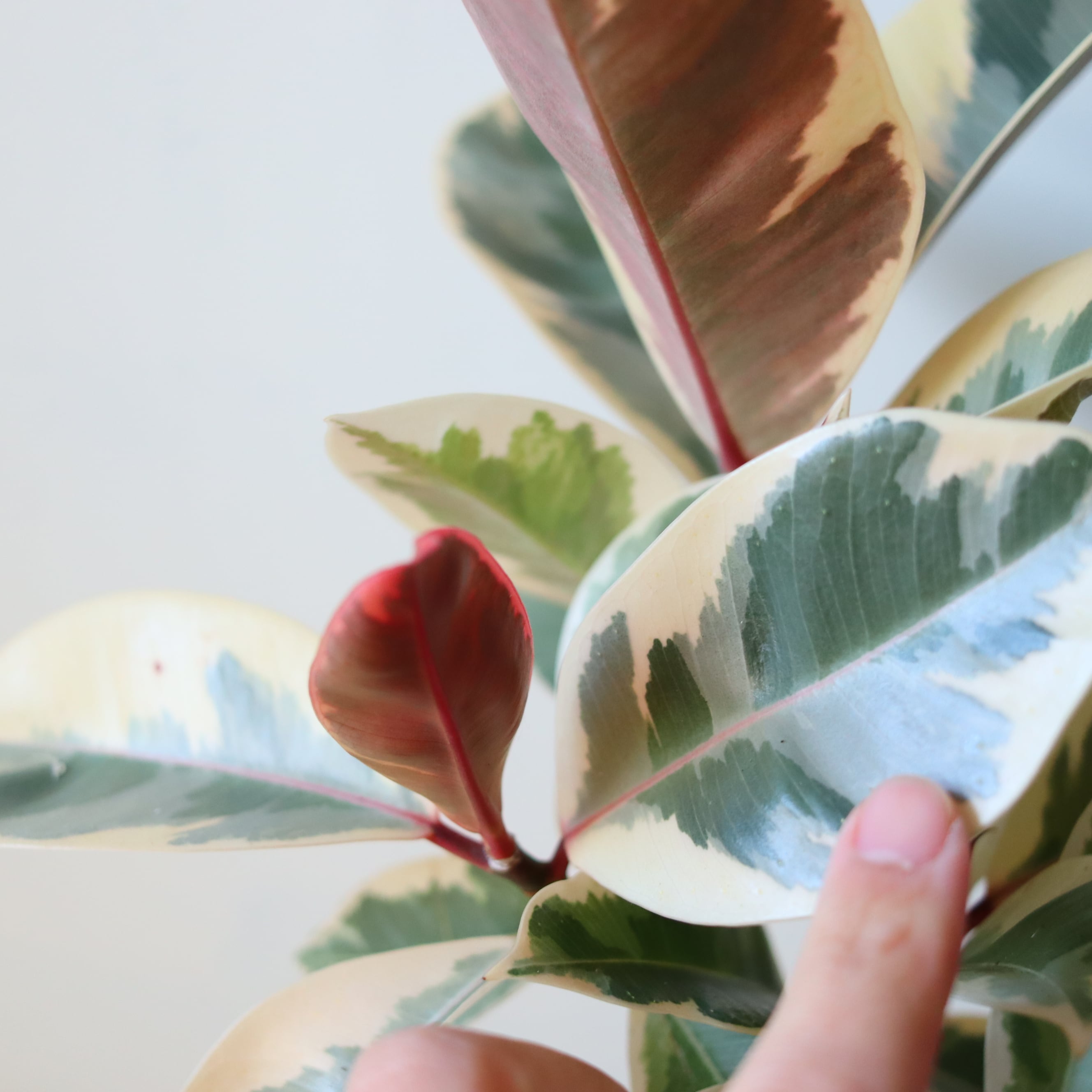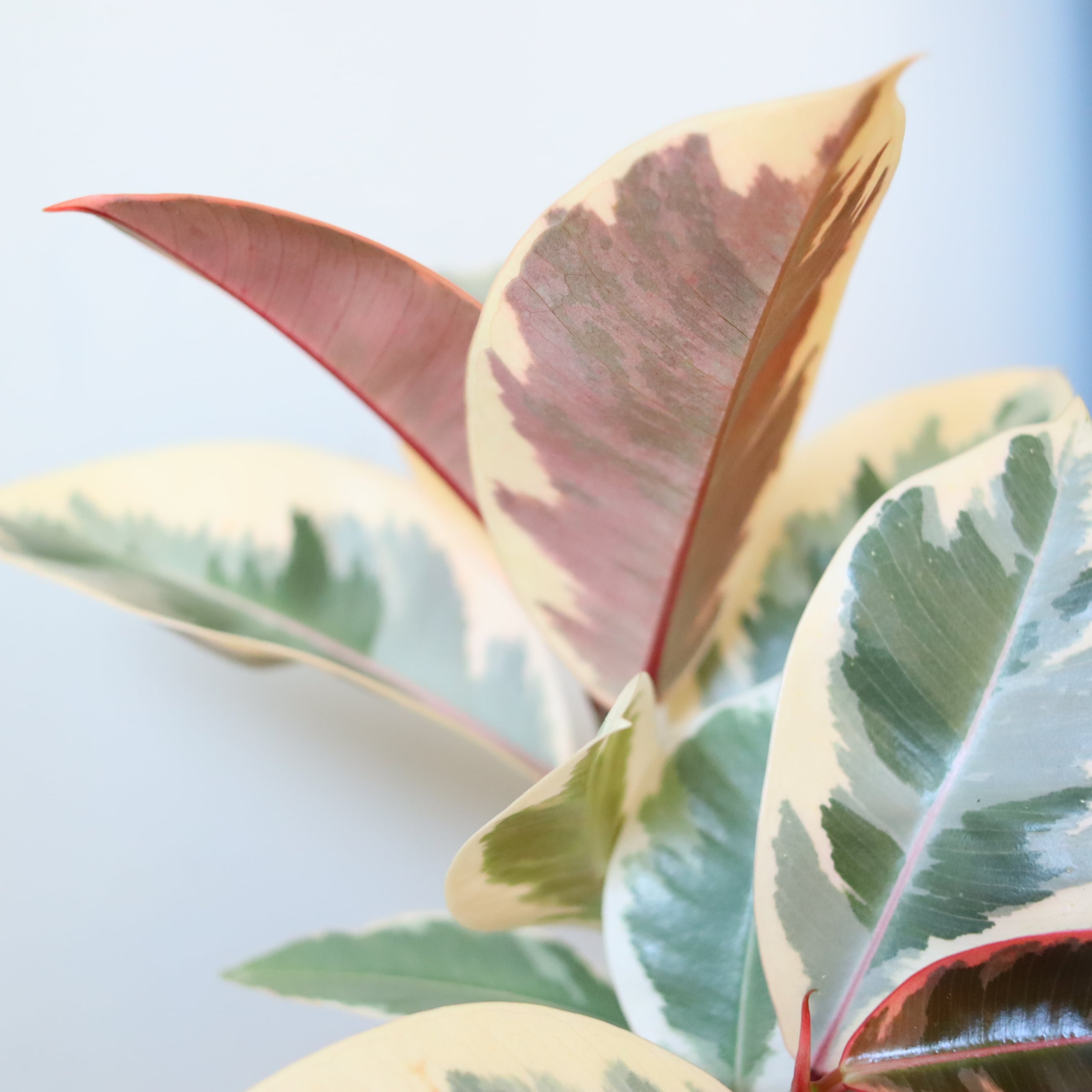 大きな葉っぱにクリーム色の斑入りが可愛らしい、ゴムの木の一種です。新芽が出てきた時のピンク色はほんとうに胸がくすぐられる可愛さです。淡い迷彩柄、しっかりとした樹形で雰囲気があり、お部屋のシンボルツリーになってくれます。