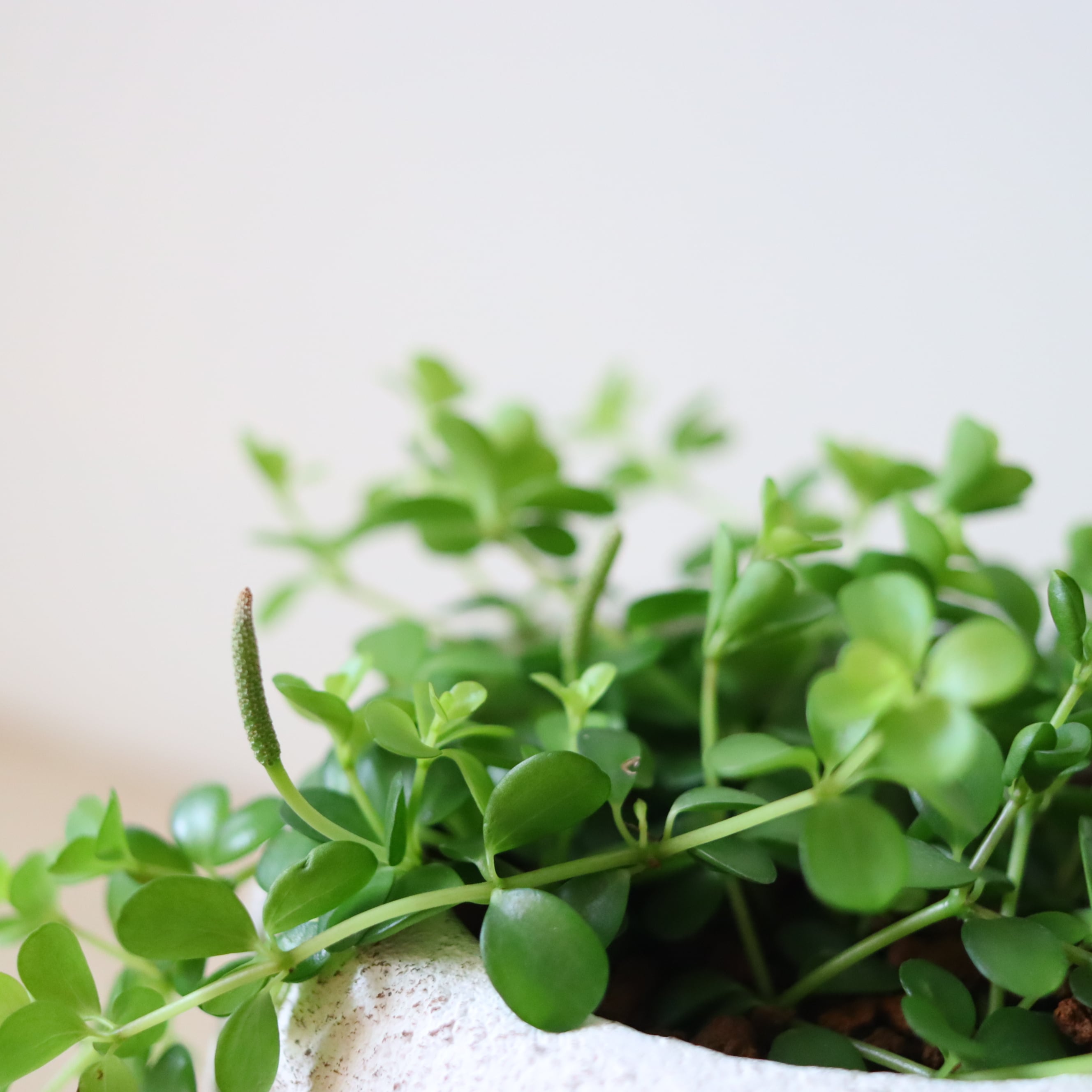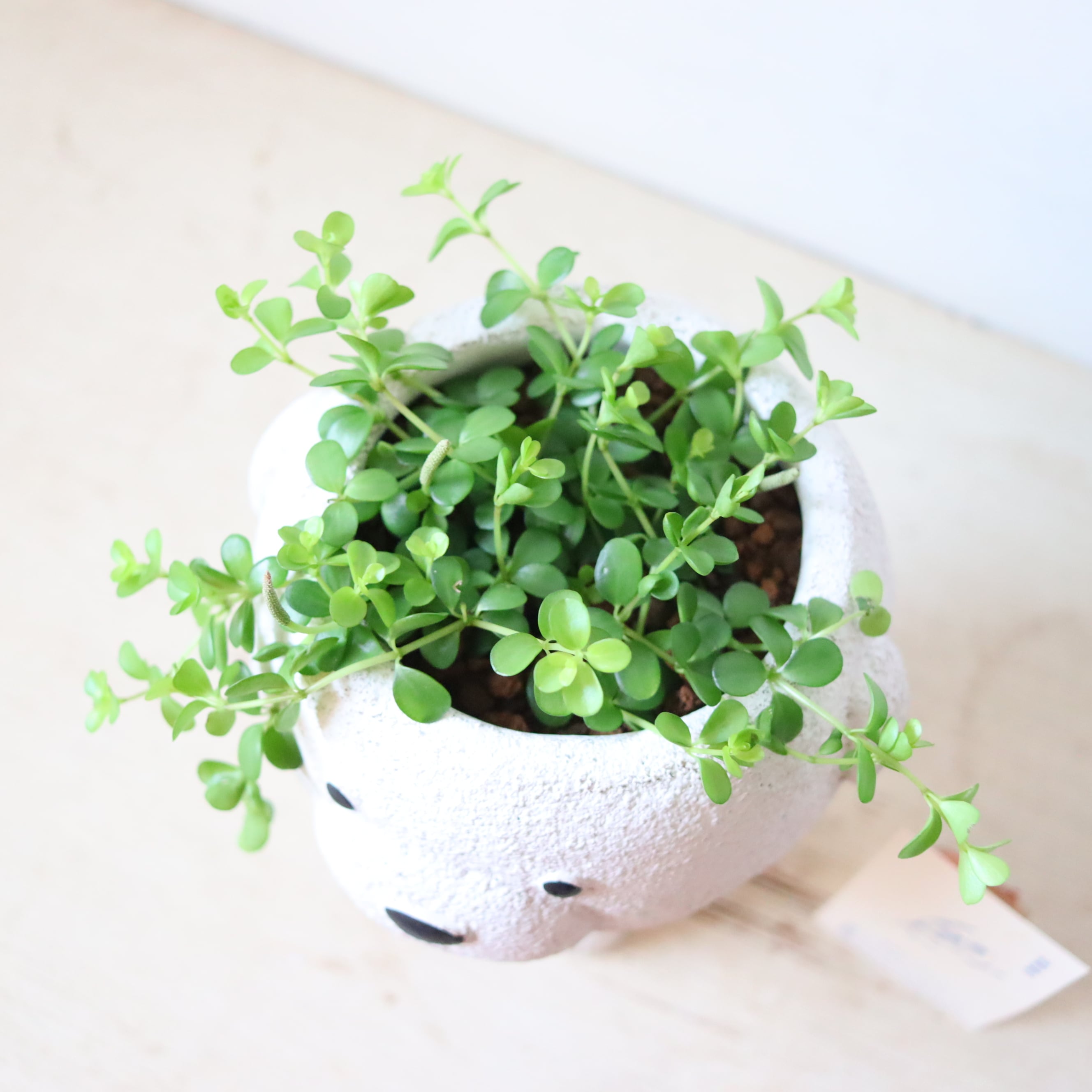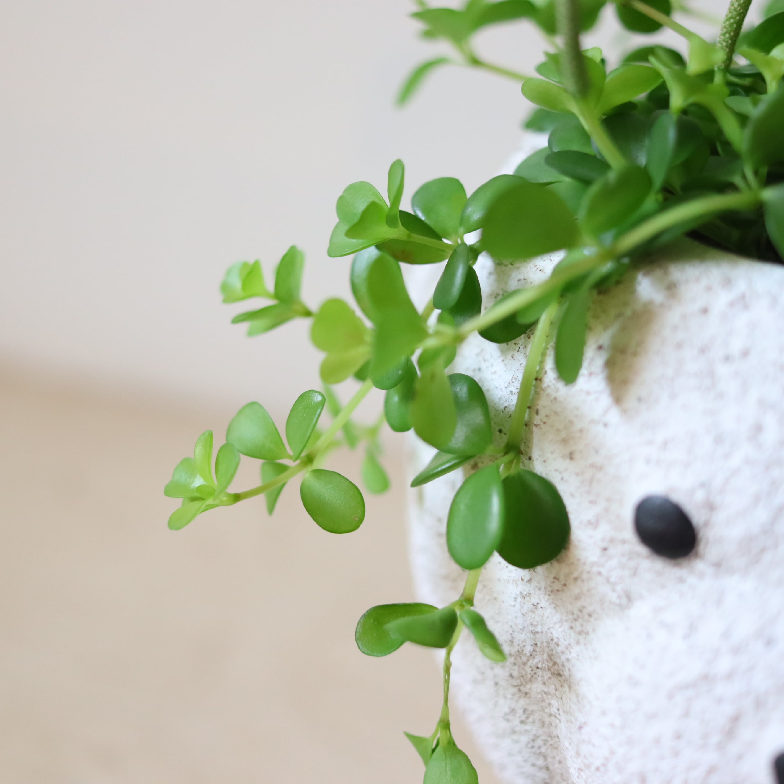 まるっとした小さな葉っぱがかわいい植物です。伸びていくと下に垂れ下がっていくので、高さのある鉢に植えてみました。