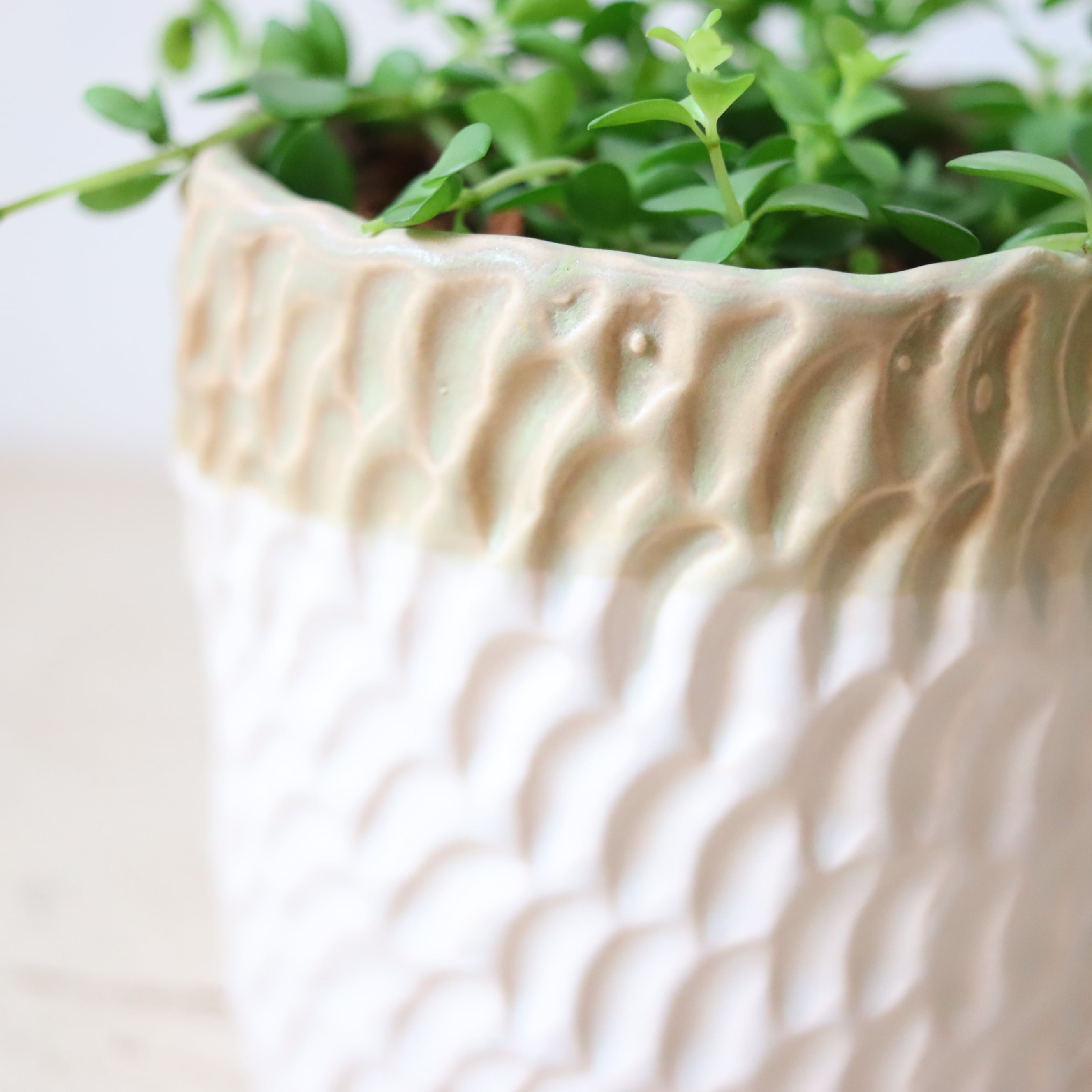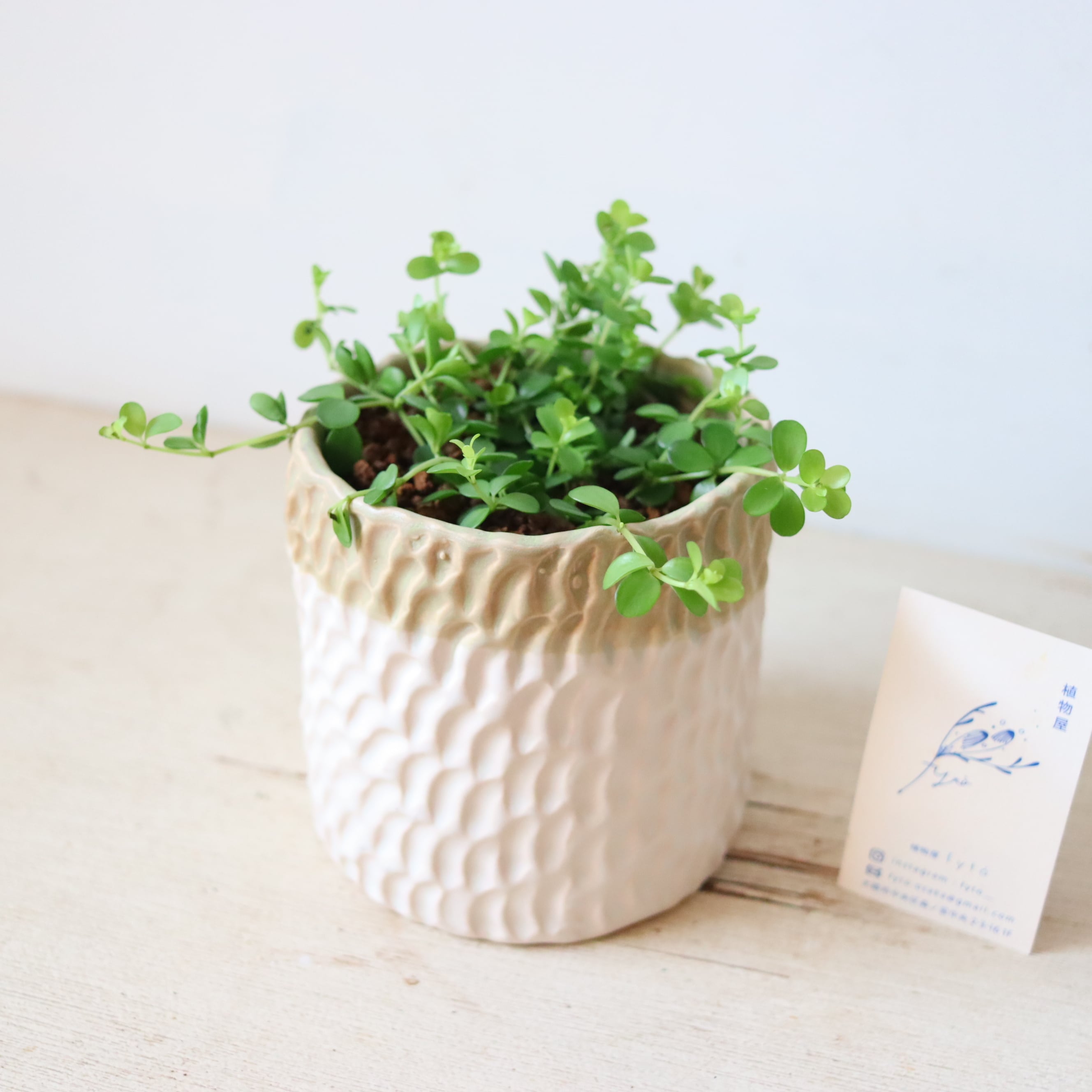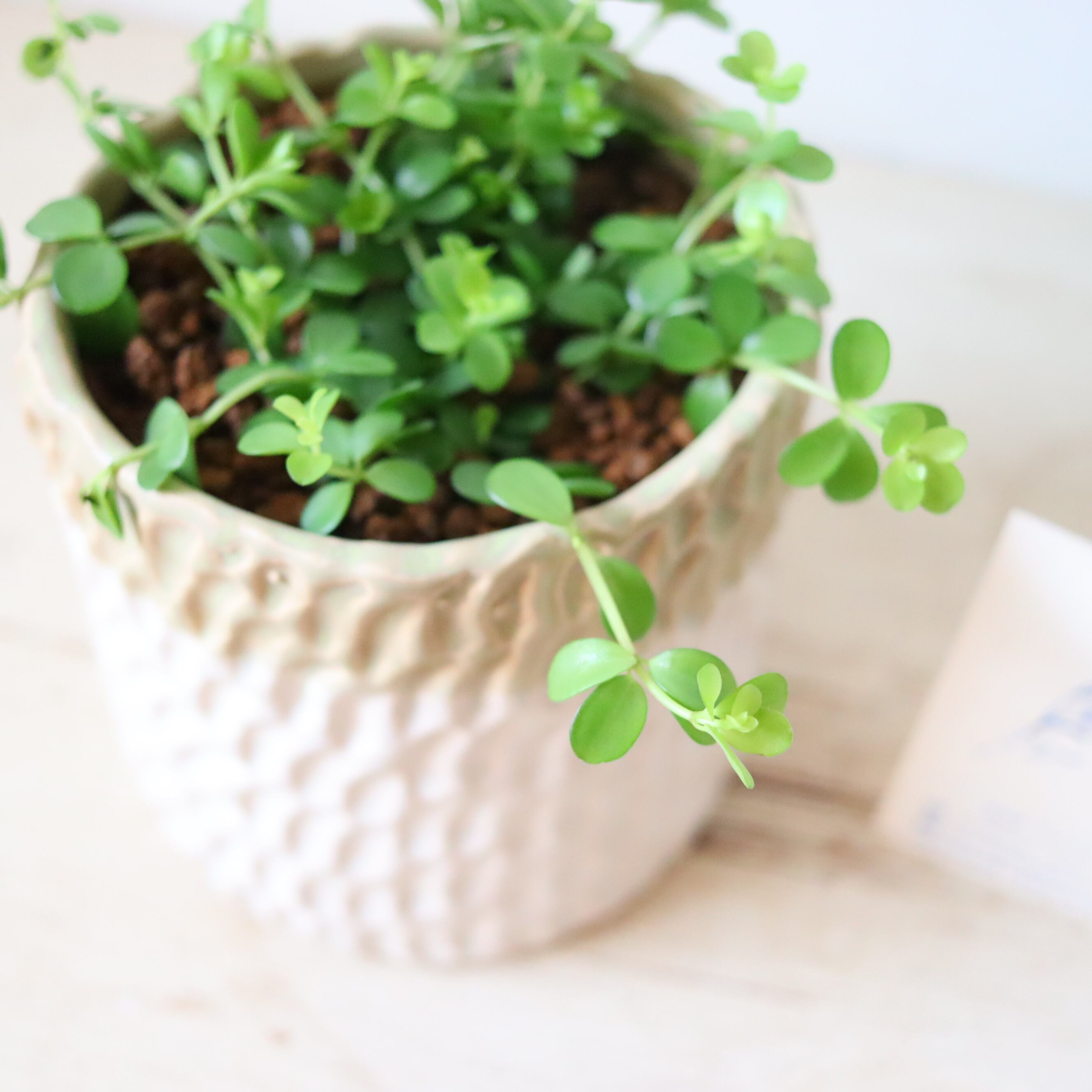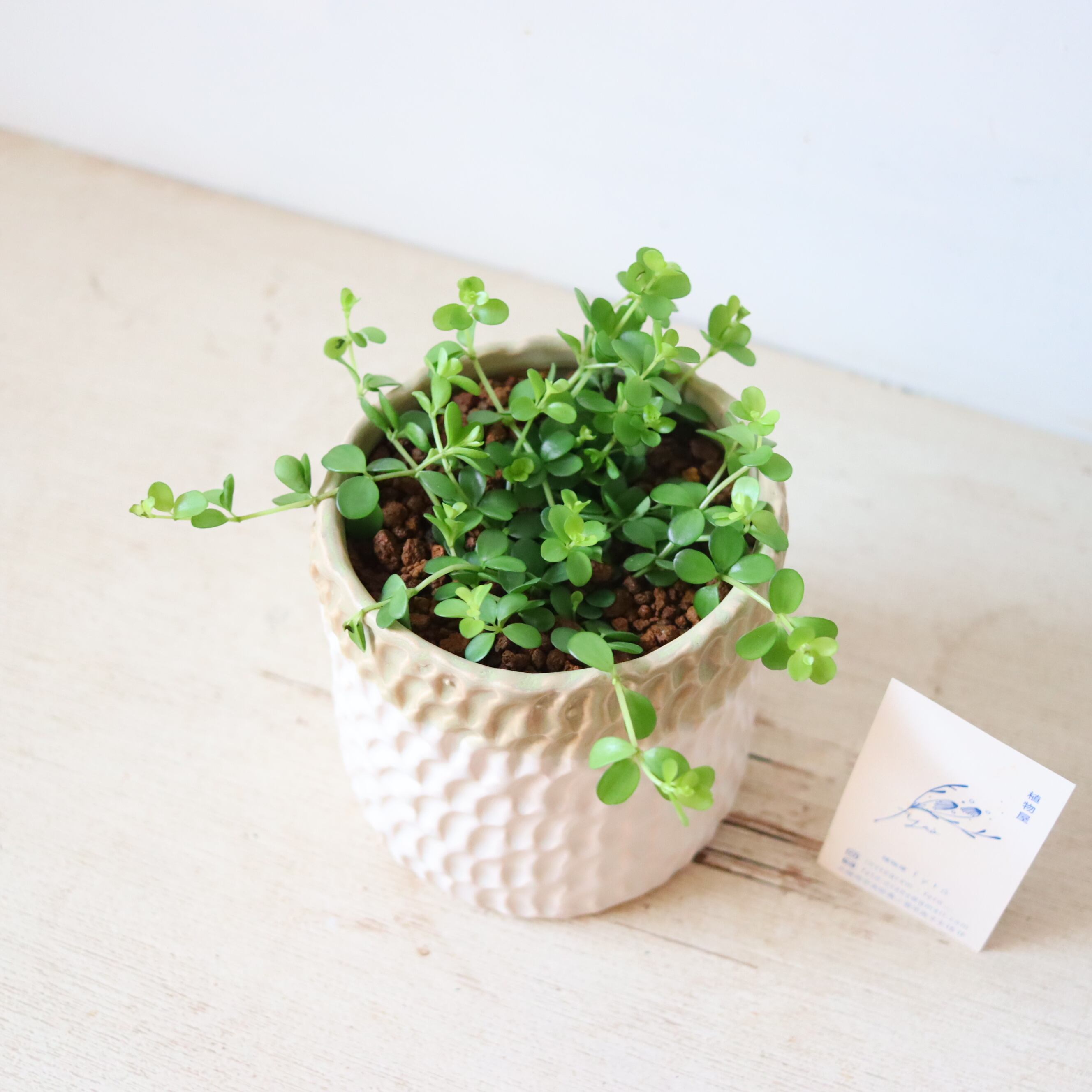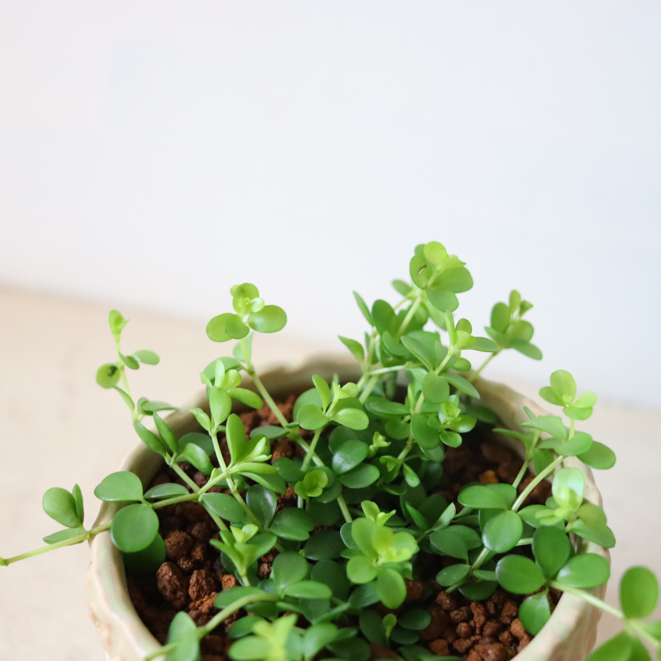 まるっとした小さな葉っぱがかわいい植物です。伸びていくと下に垂れ下がっていくので、高さのある鉢に植えてみました。