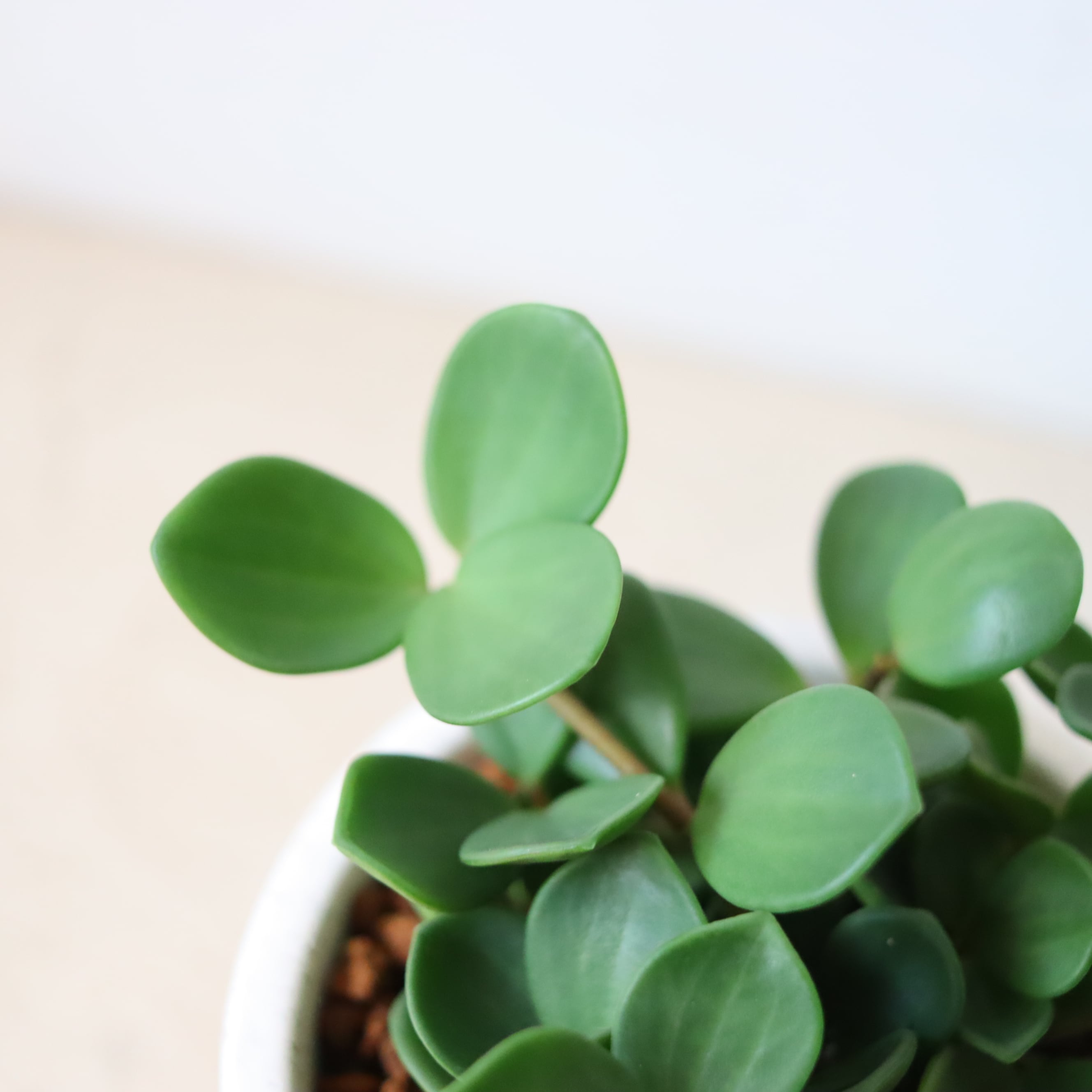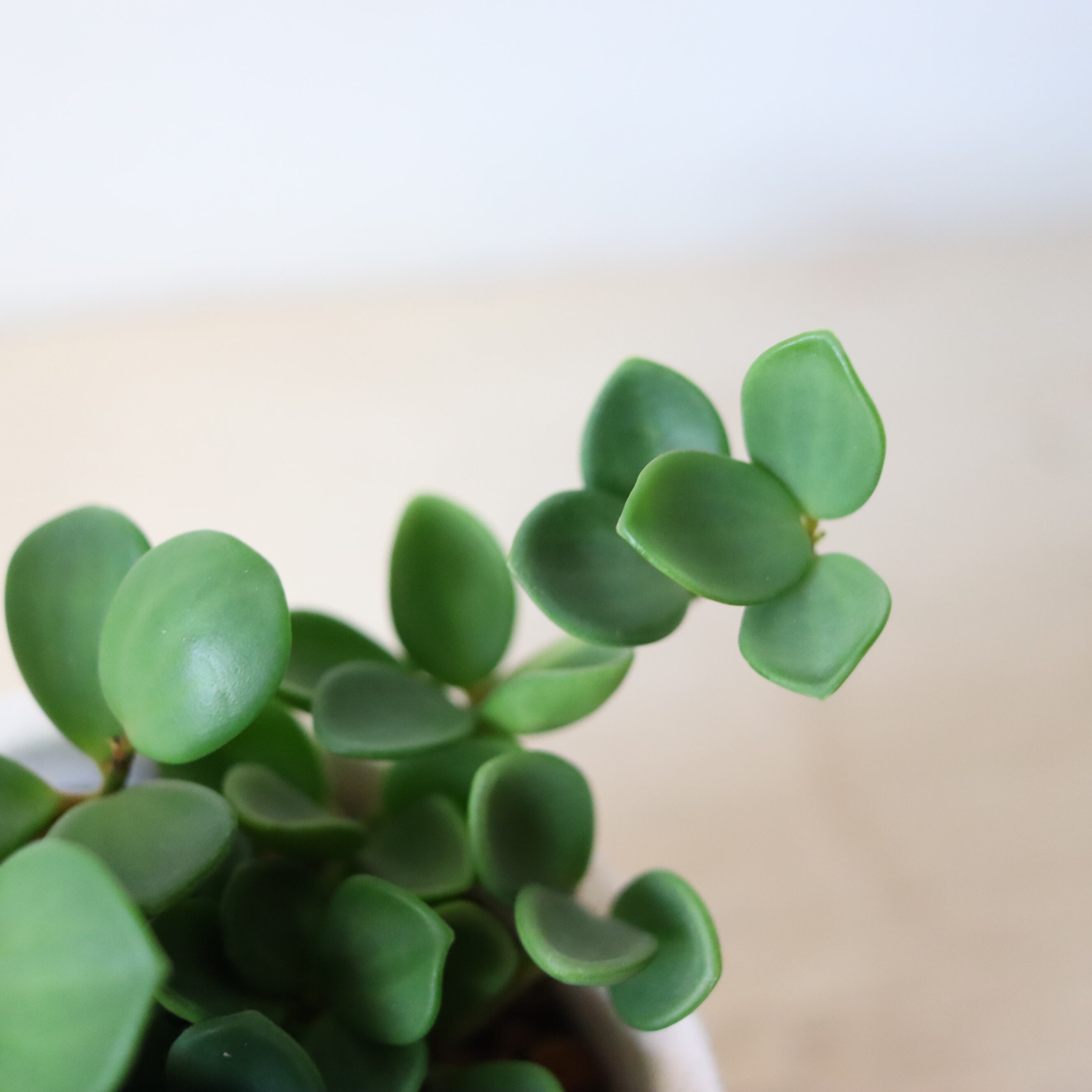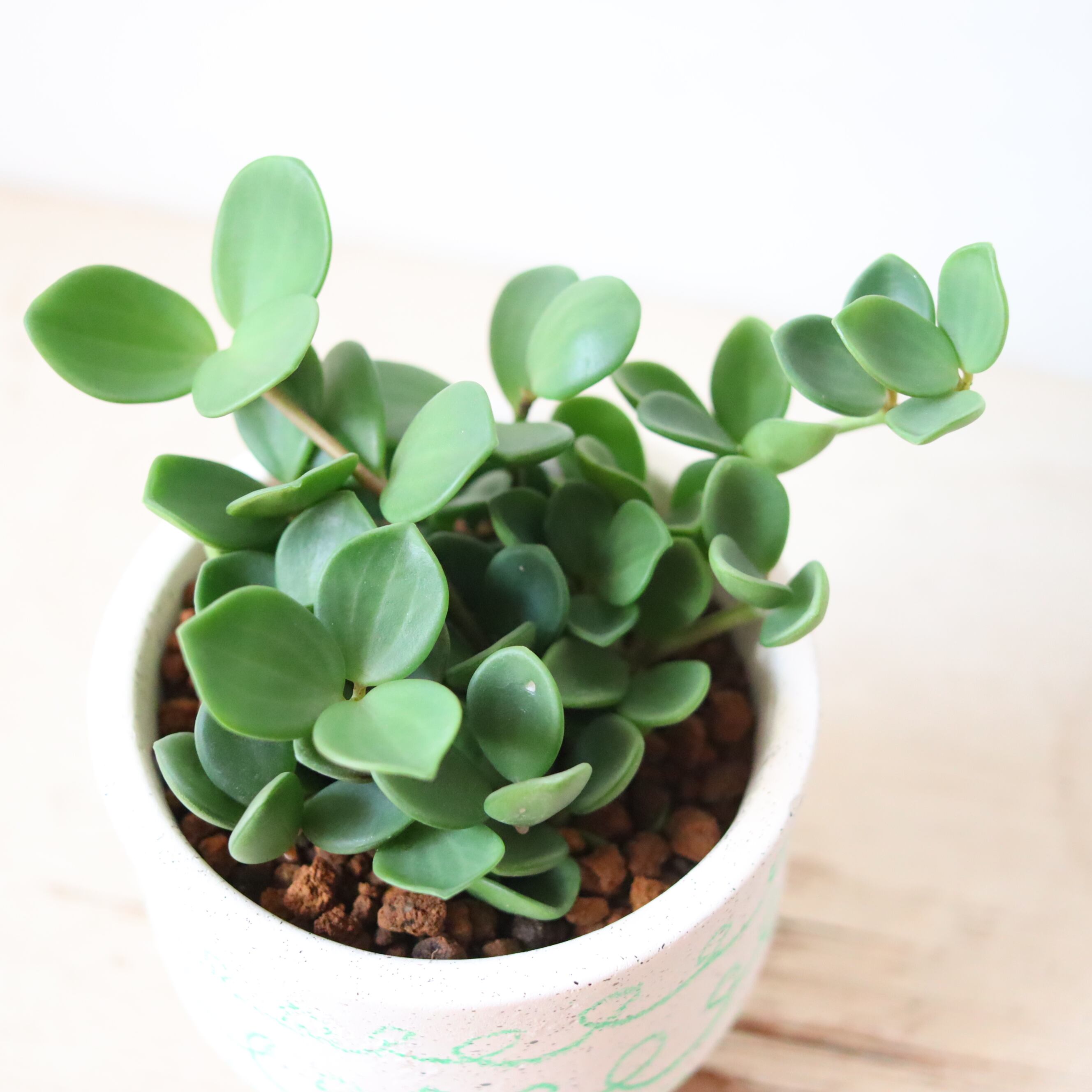 まるっとした葉っぱがかわいい植物です。伸びていくと重みで下に垂れ下がっていく姿がかわいいです。もうこれ以上伸びてほしくない時は切ってあげて大丈夫です。