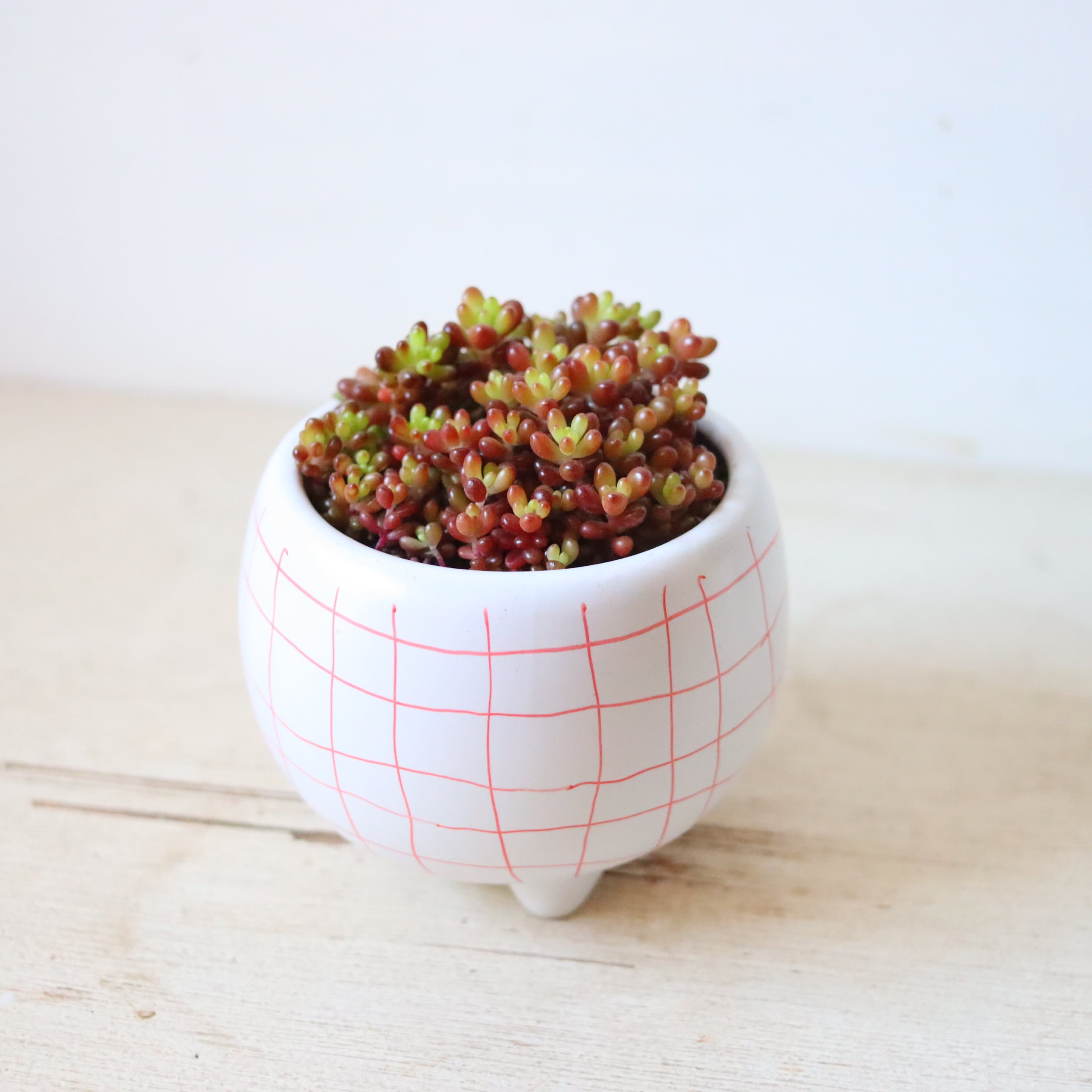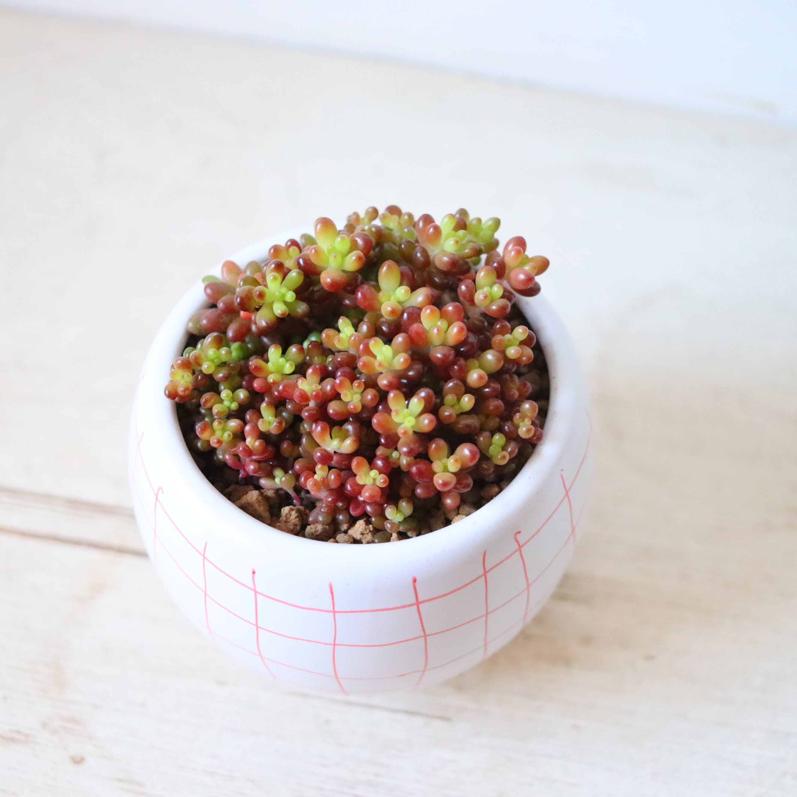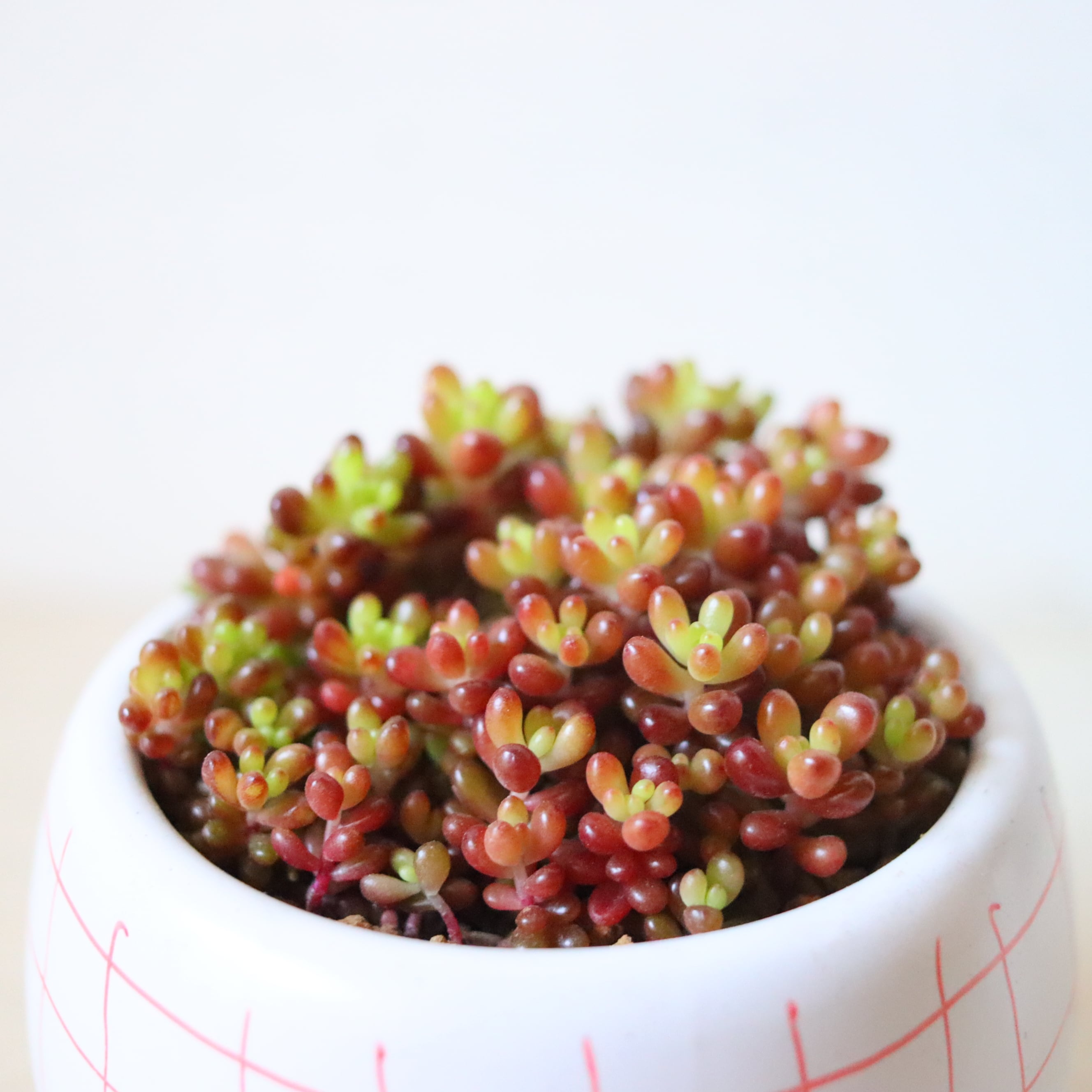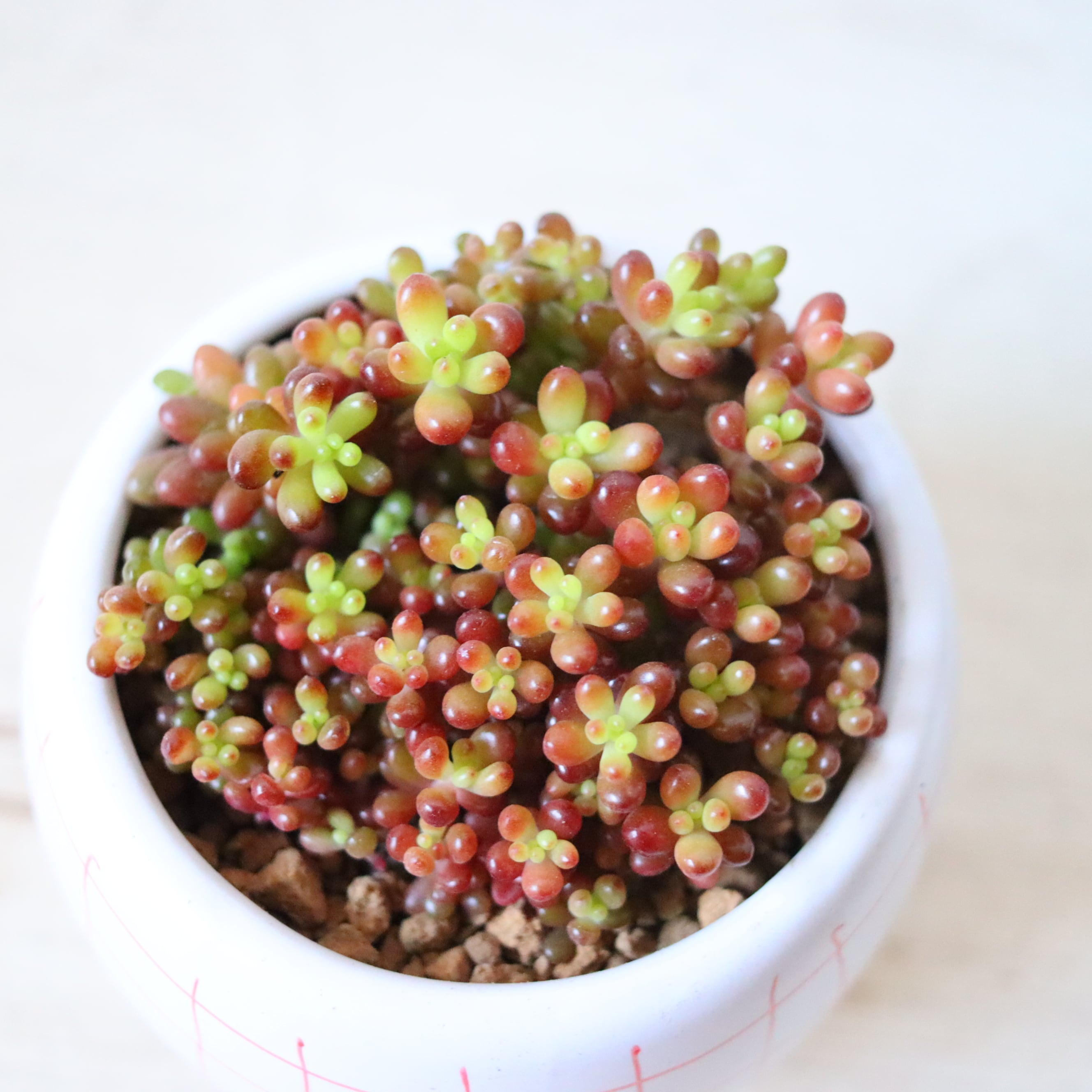 ぷりっぷりの多肉植物です。虹の玉の一粒一粒をさらに小さくしたプチプチの姿がかわいい。暖かい季節は緑ですが、寒さにあてると紅葉して真っ赤になります。