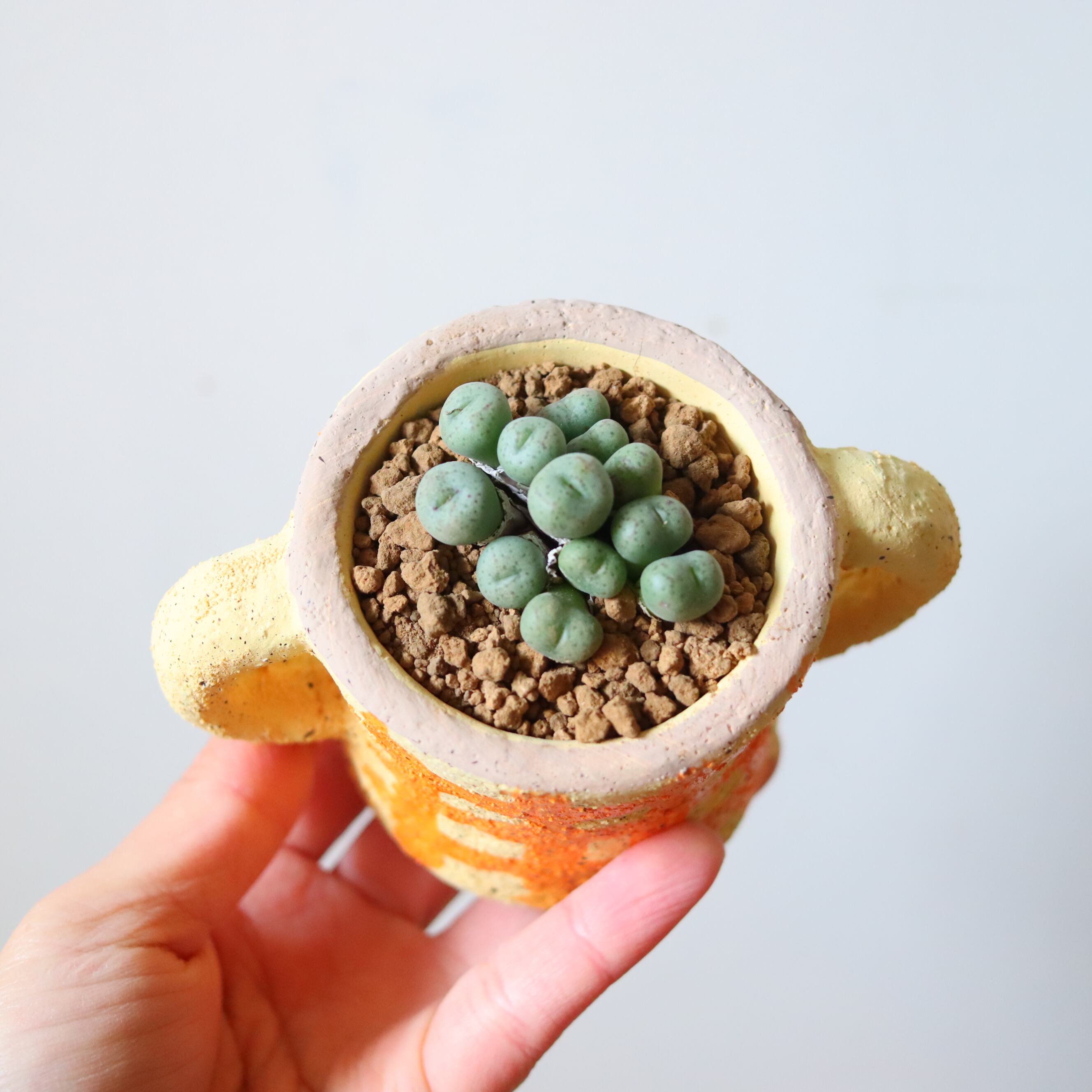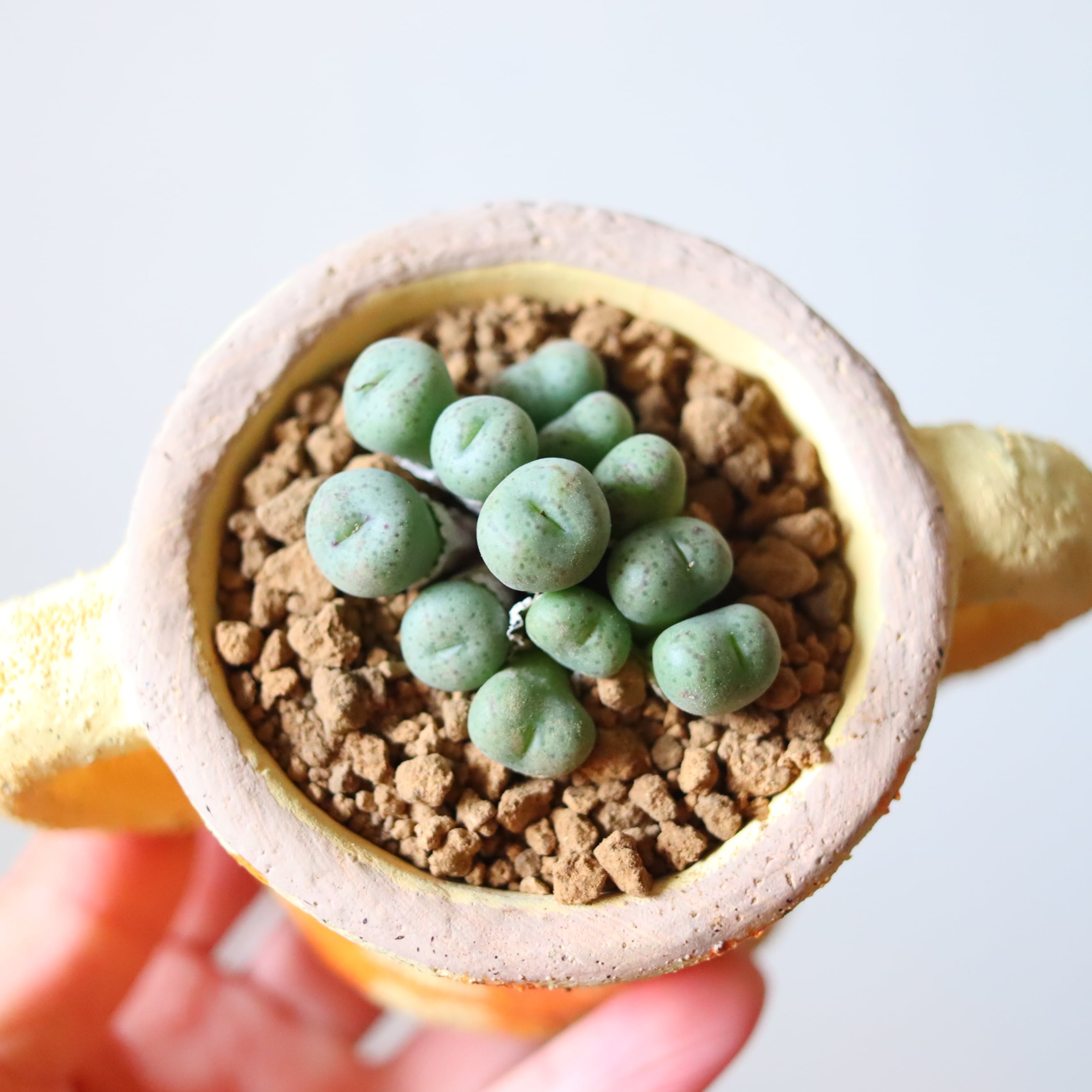 豆みたいなかわいい植物です。不思議ですね。よく日に当ててあげると花を咲かせます。