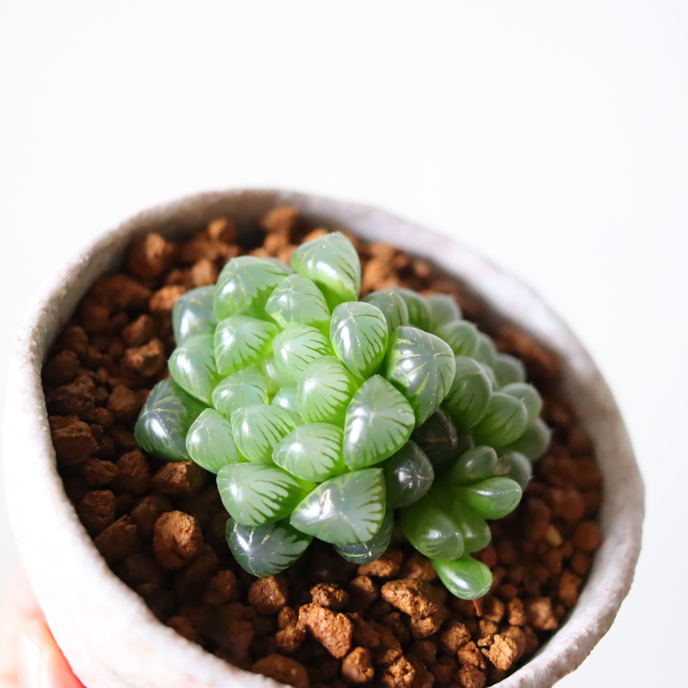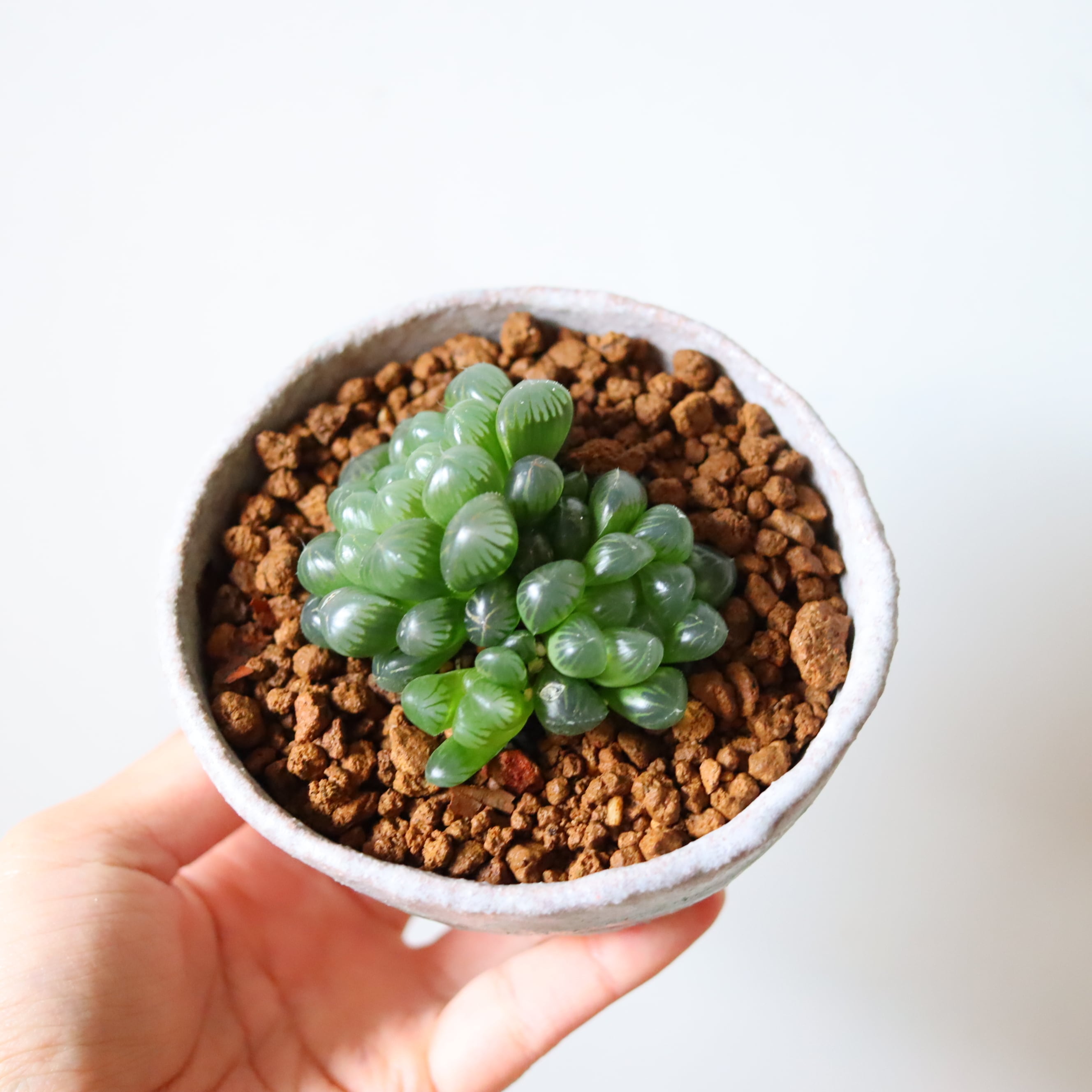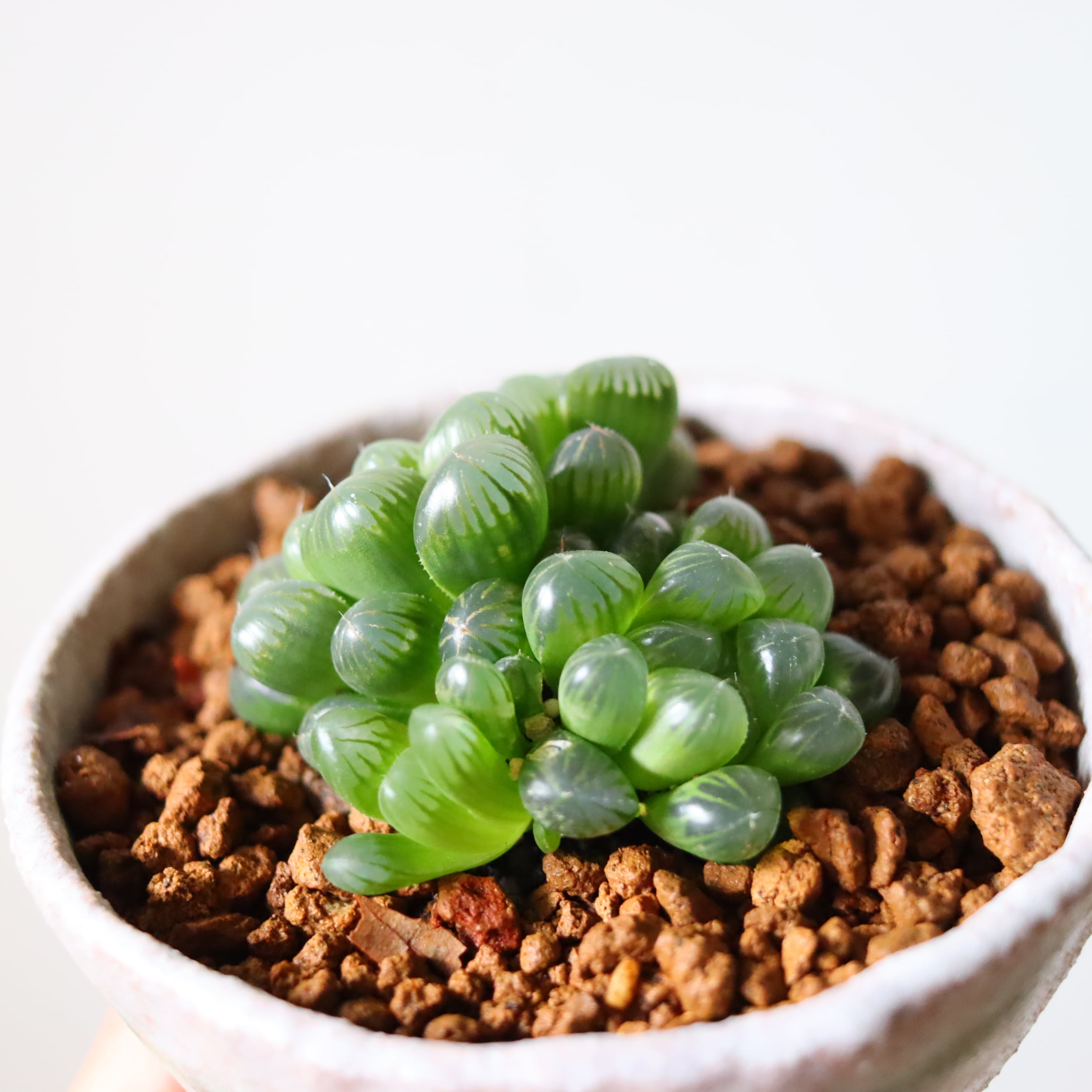 水晶のようでほんとうに綺麗な植物です。自然の光、特に朝日を透かして見ると息を飲むような美しさで、癒されます。サボテンの仲間なので非常に丈夫で育てやすく、お世話が苦手な方にもおすすめです。