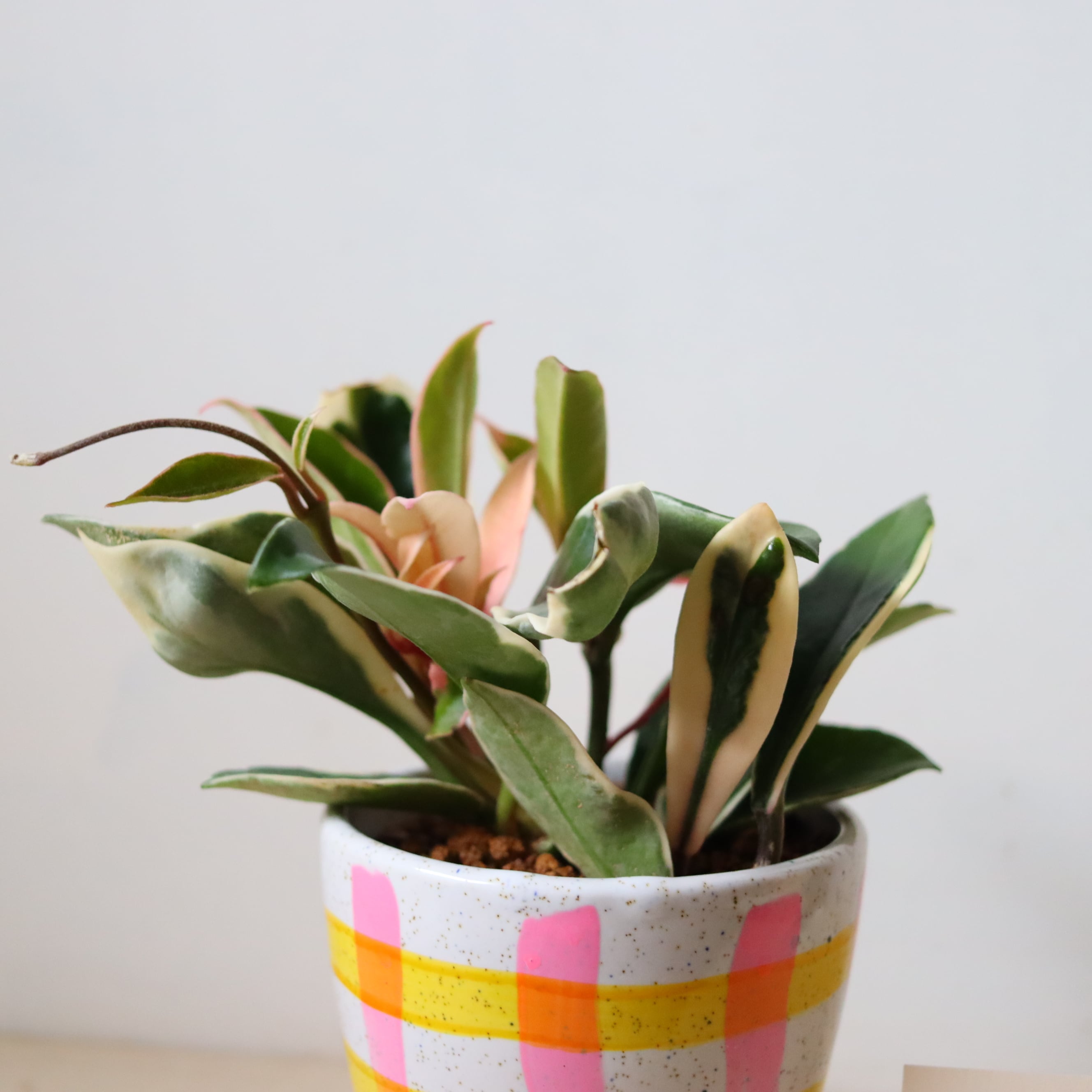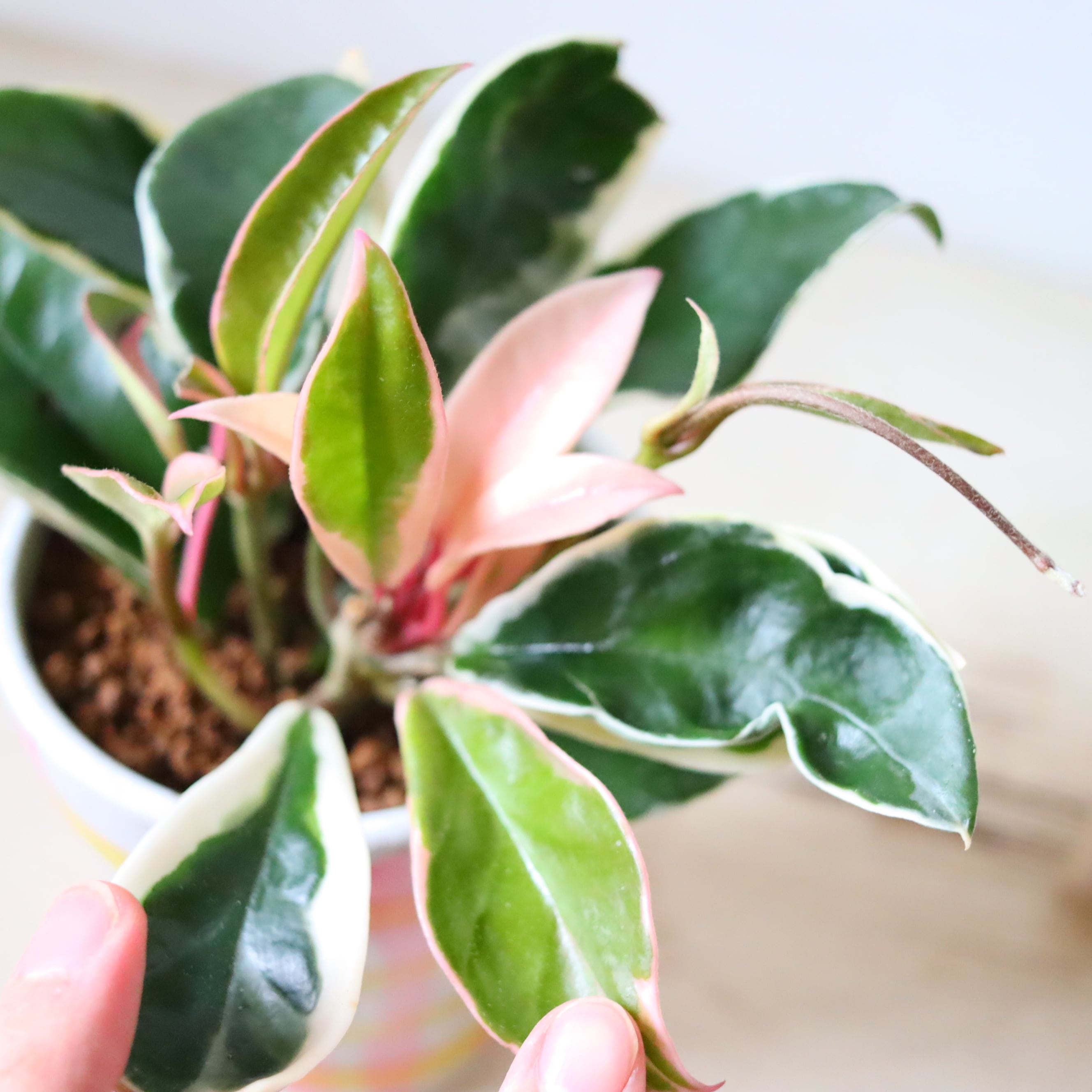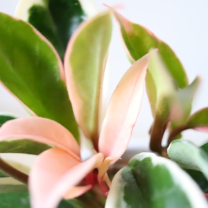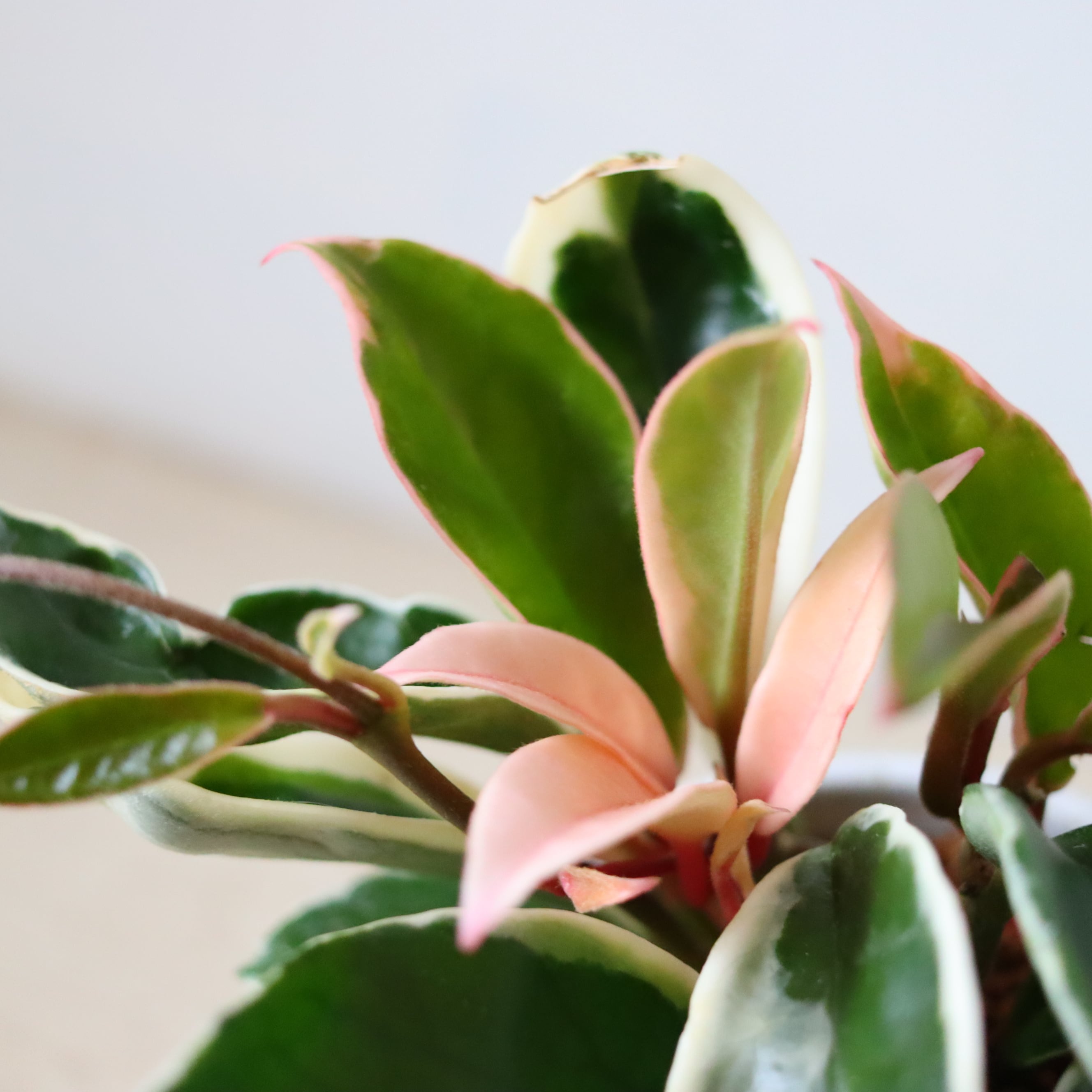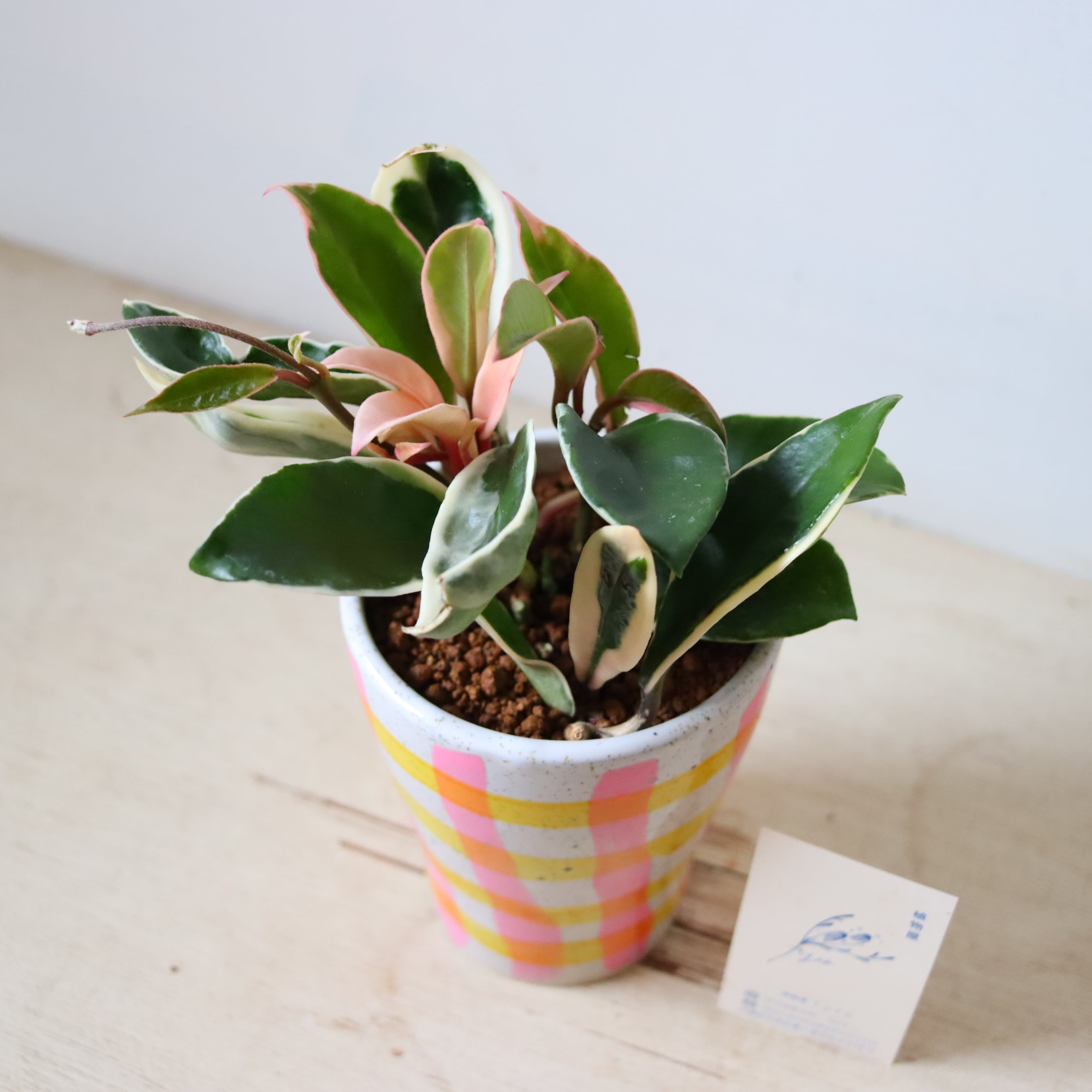 肉厚の葉っぱにクリーム色やピンクの斑がはいった植物です。よく日に当ててあげると、アポロチョコレートのような手毬型のお花が咲きます。