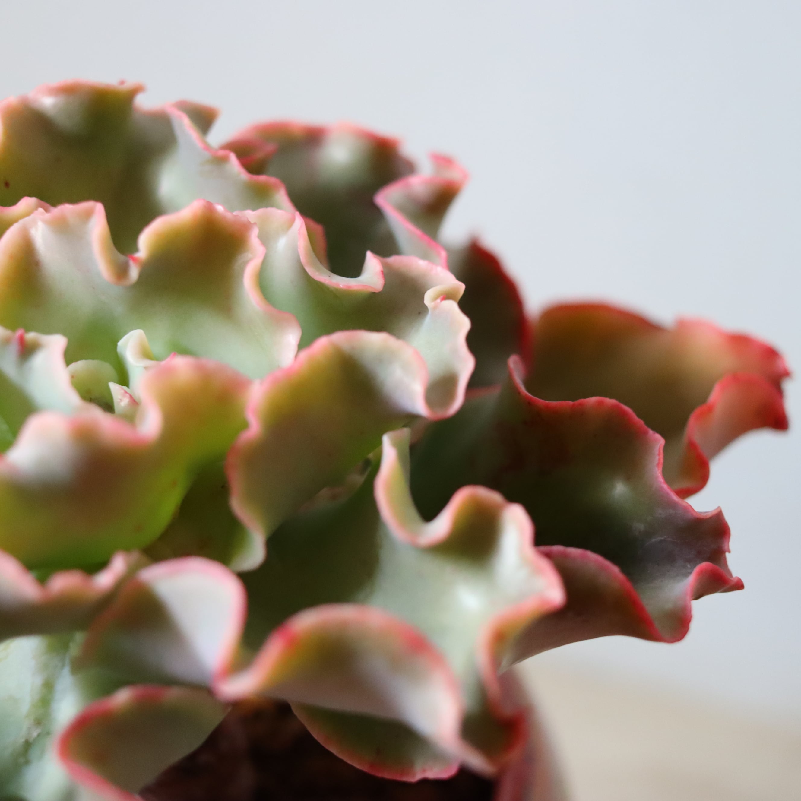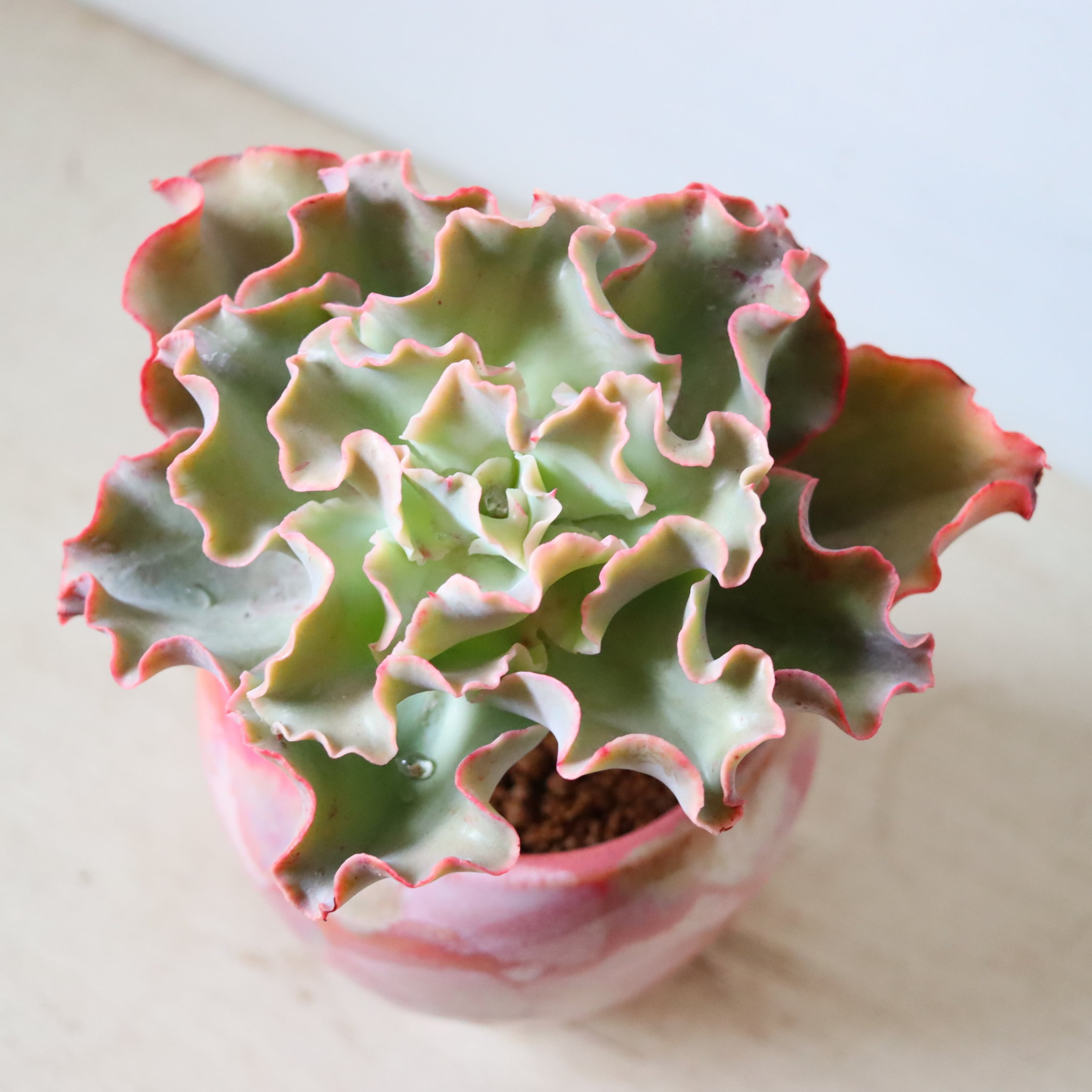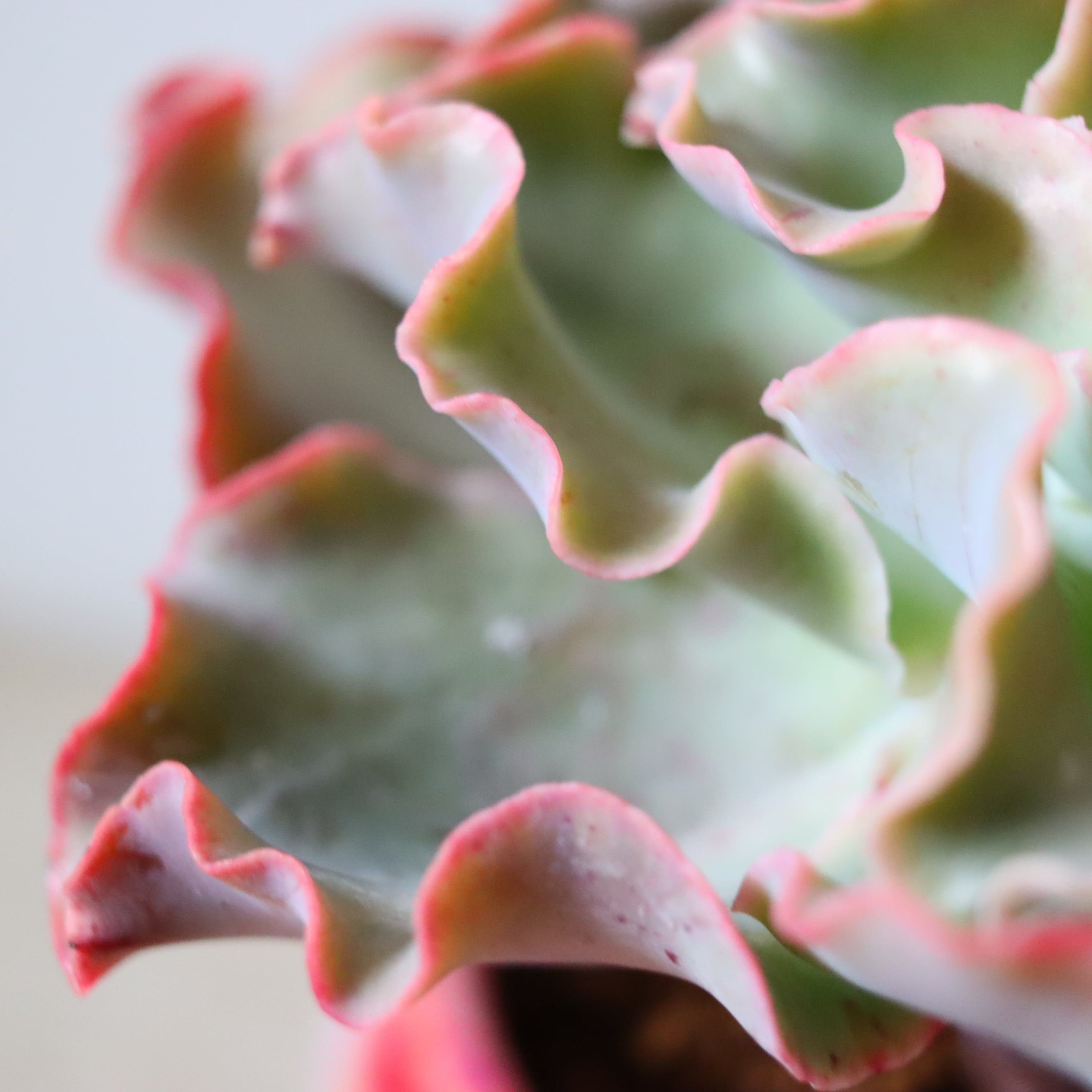 大胆なフリルとボリュームが美しい、エケベリアの一種です。結構大きくて存在感がすごいです。エケベリアは幾何学的なロゼットと紅葉した葉っぱが美しい多肉植物です。綺麗なお花を咲かせます。