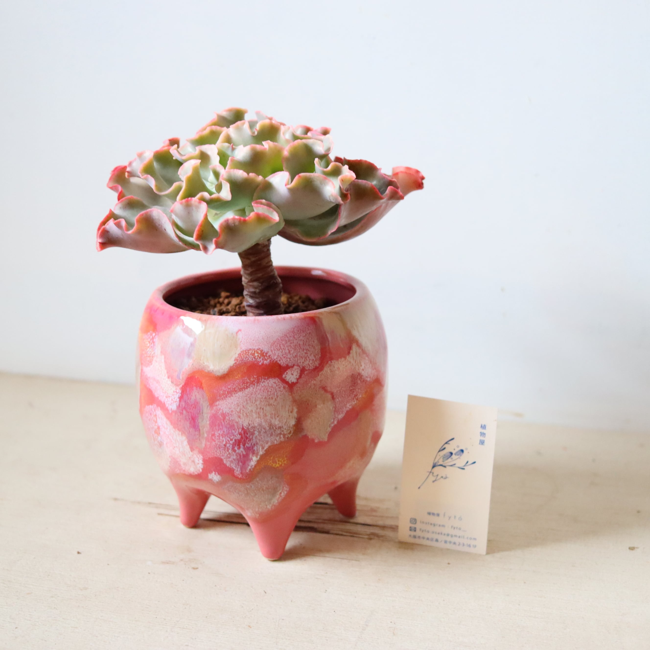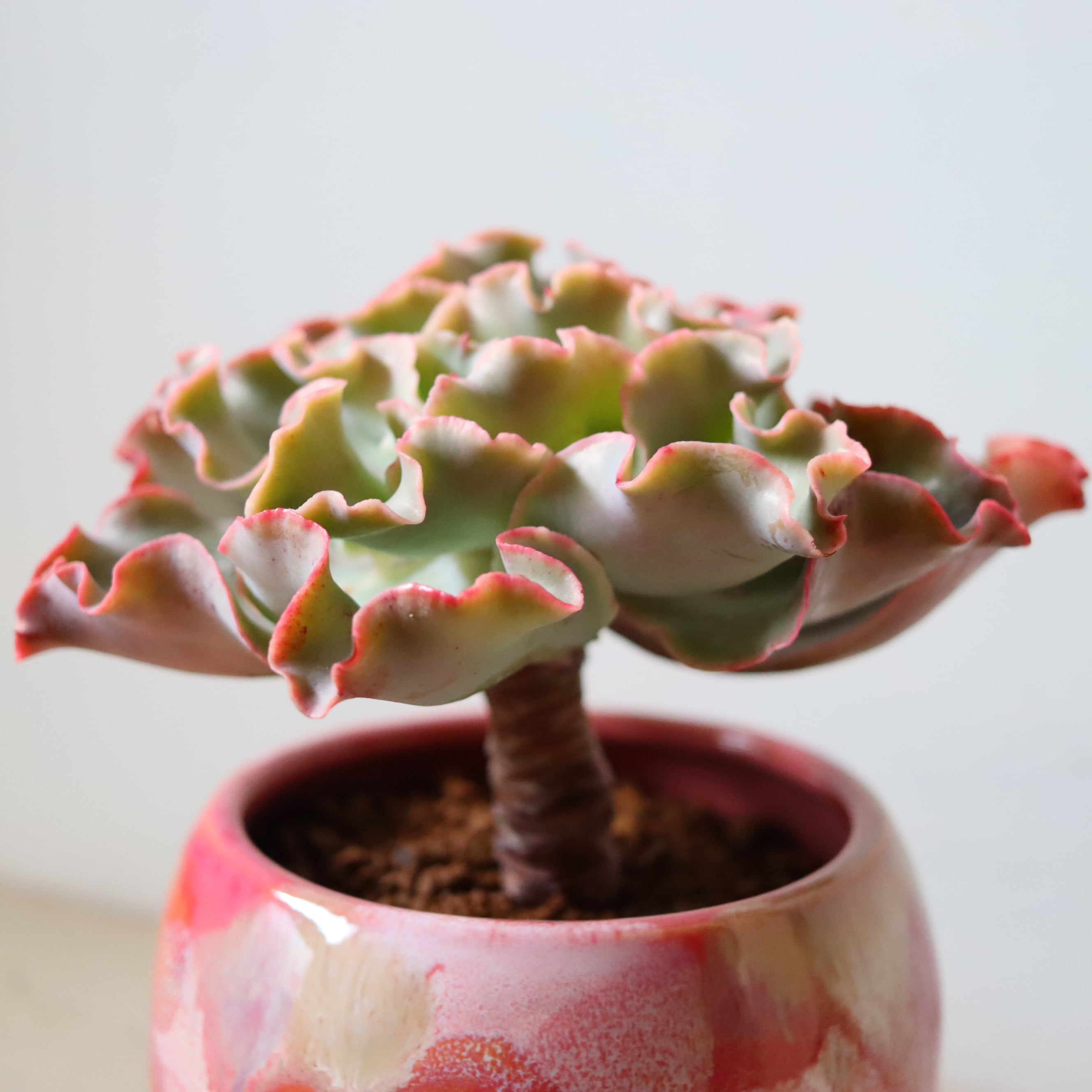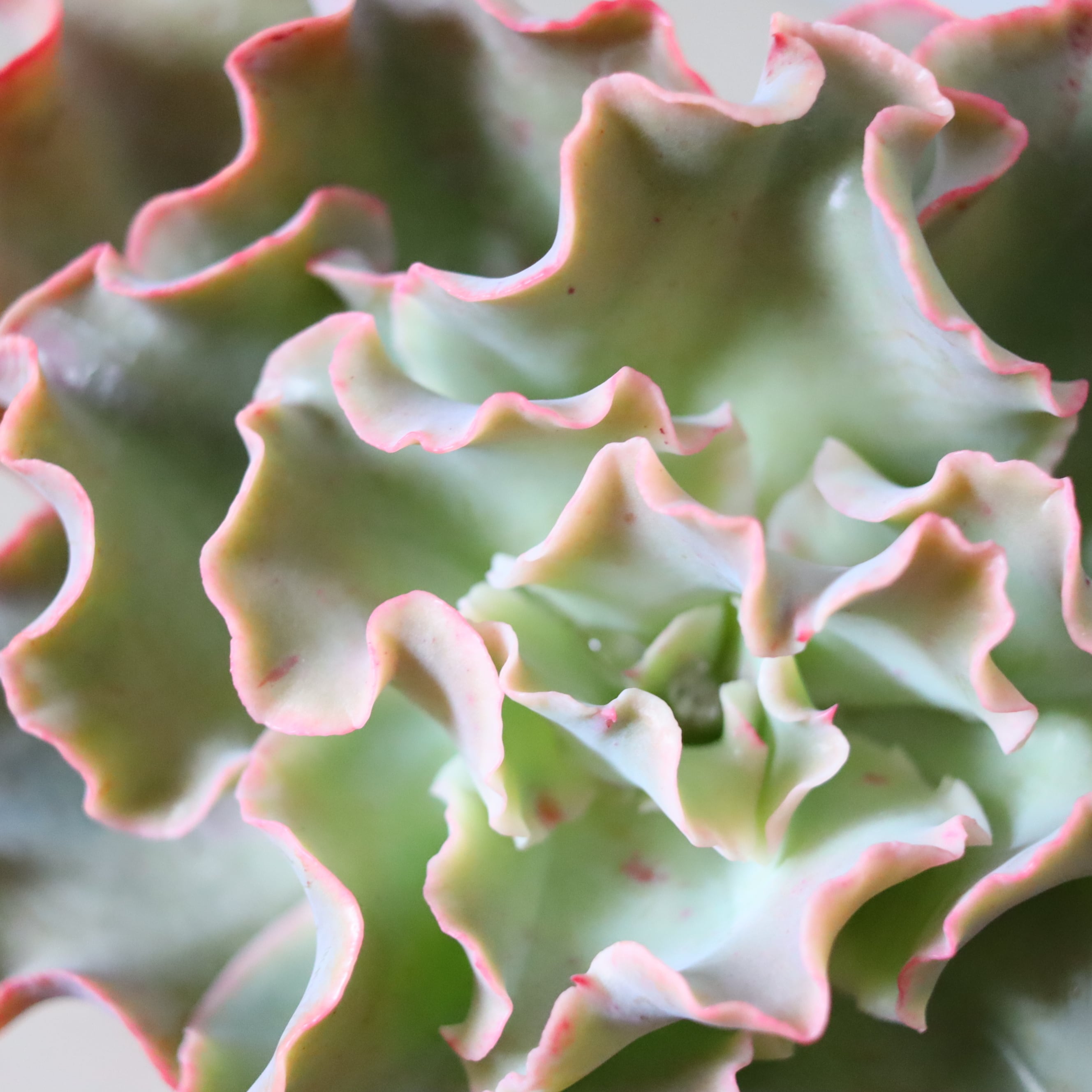 大胆なフリルとボリュームが美しい、エケベリアの一種です。結構大きくて存在感がすごいです。エケベリアは幾何学的なロゼットと紅葉した葉っぱが美しい多肉植物です。綺麗なお花を咲かせます。