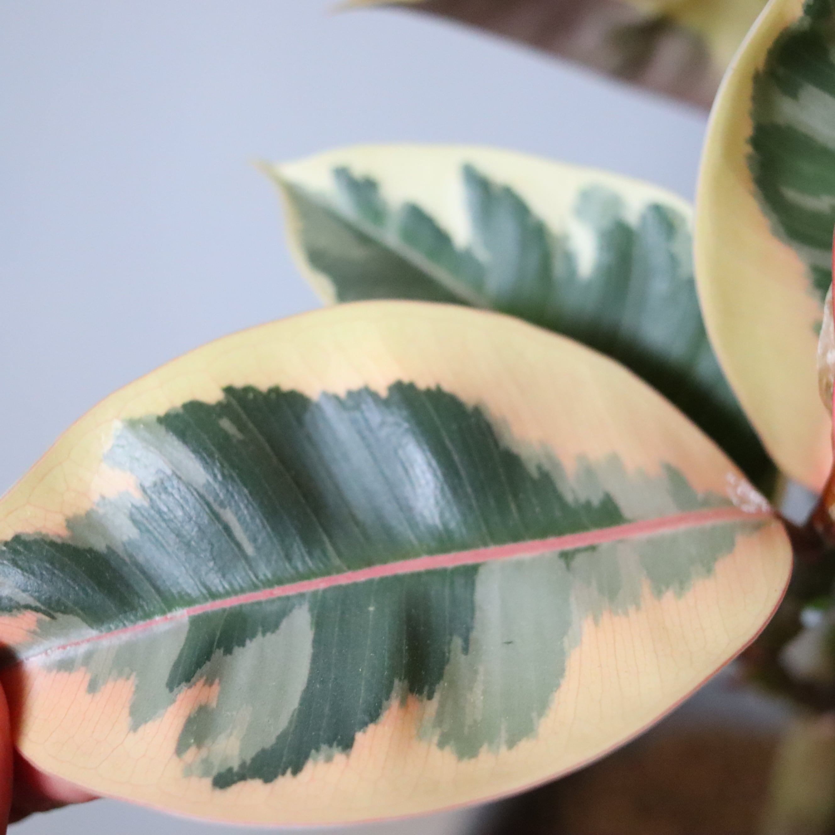 大きな葉っぱにクリーム色の斑入りが可愛らしい、ゴムの木の一種です。新芽が出てきた時のピンク色はほんとうに胸がくすぐられる可愛さです。淡い迷彩柄、しっかりとした樹形で雰囲気があり、お部屋のシンボルツリーになってくれます。