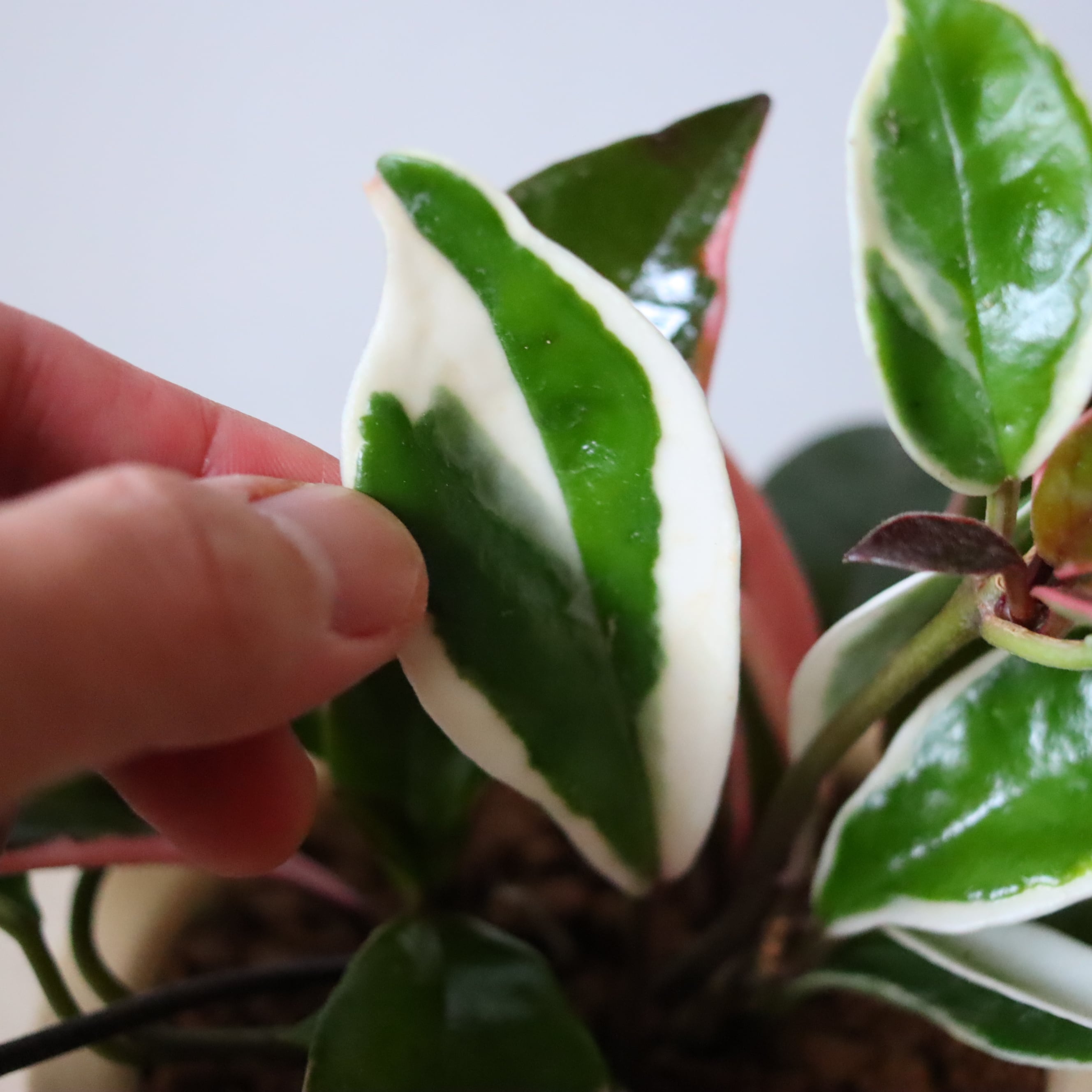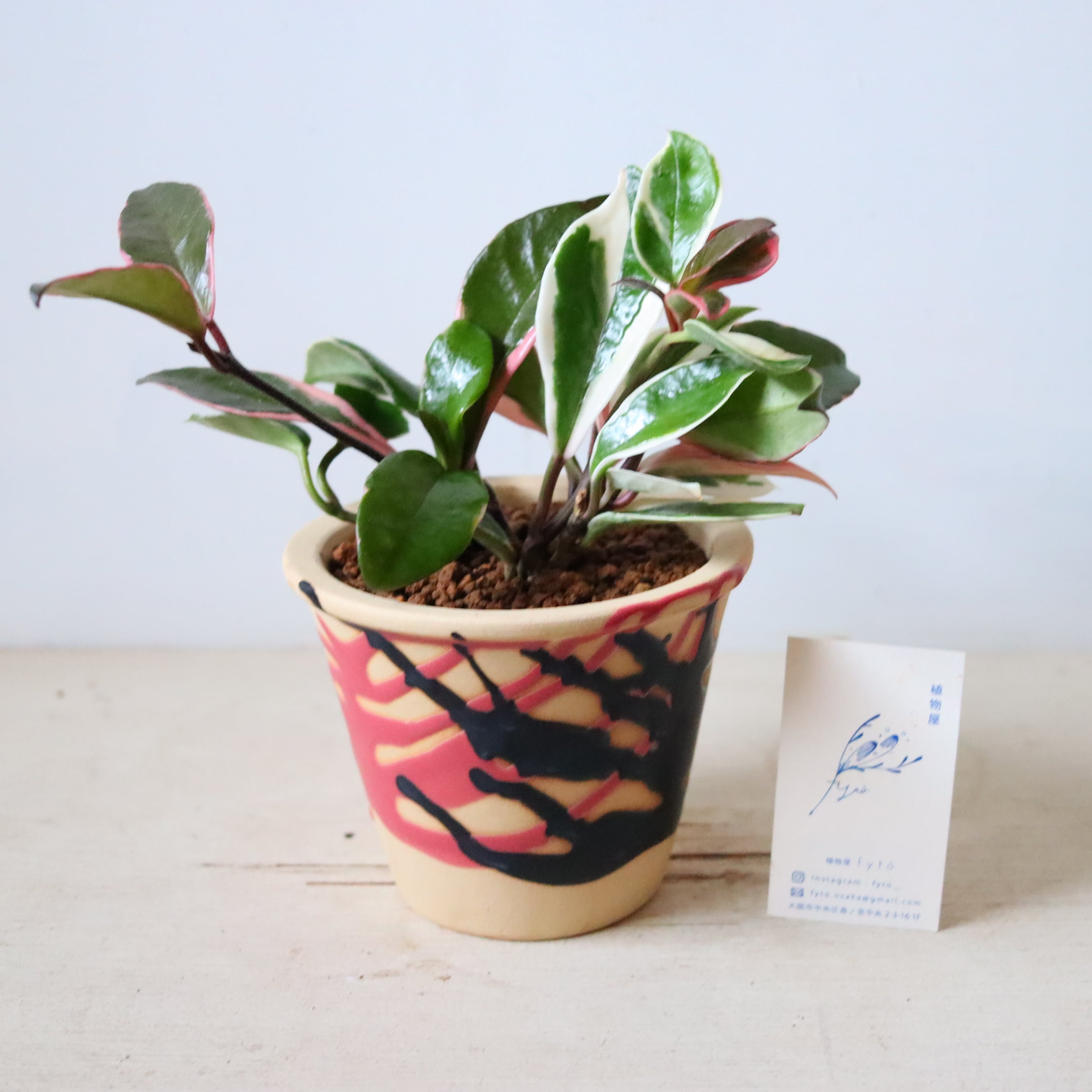 肉厚の葉っぱにクリーム色やピンクの斑がはいった植物です。よく日に当ててあげると、アポロチョコレートのような手毬型のお花が咲きます。